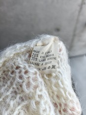 イタリア製のキッドモヘヤニット。人気の抽象的な、ほっこり系のデザインです。全体的な色味も最高。アーム極太で短丈シルエットです。キッドモヘヤなのでチクチクも感じないです。
