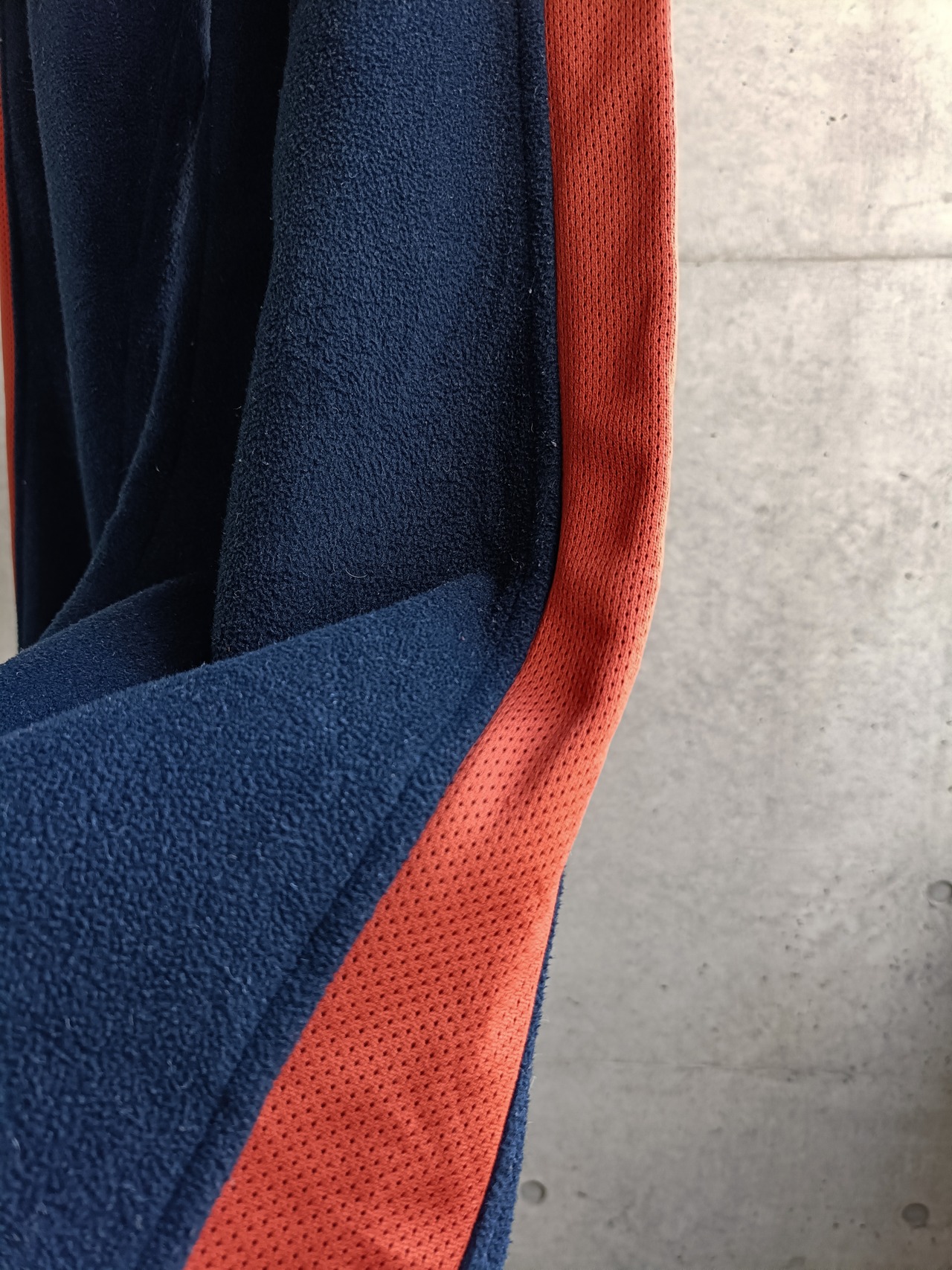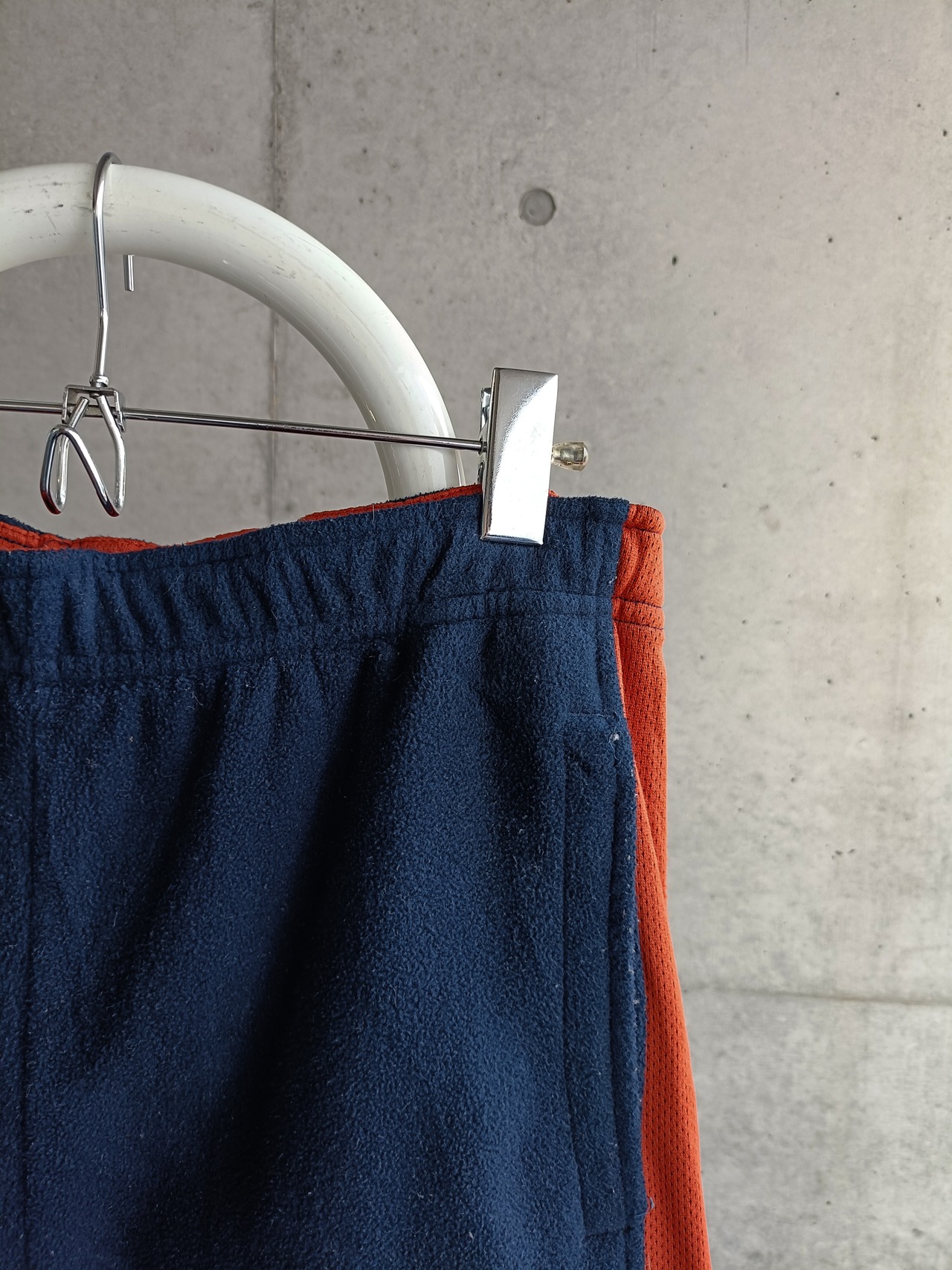 ネイビーのフリースにオレンジのメッシュラインが入ったパンツ。ストンと落ちるワイドストレートシルエット。細身のメンズ、レディース向けサイズです。しっかりポケット付き。