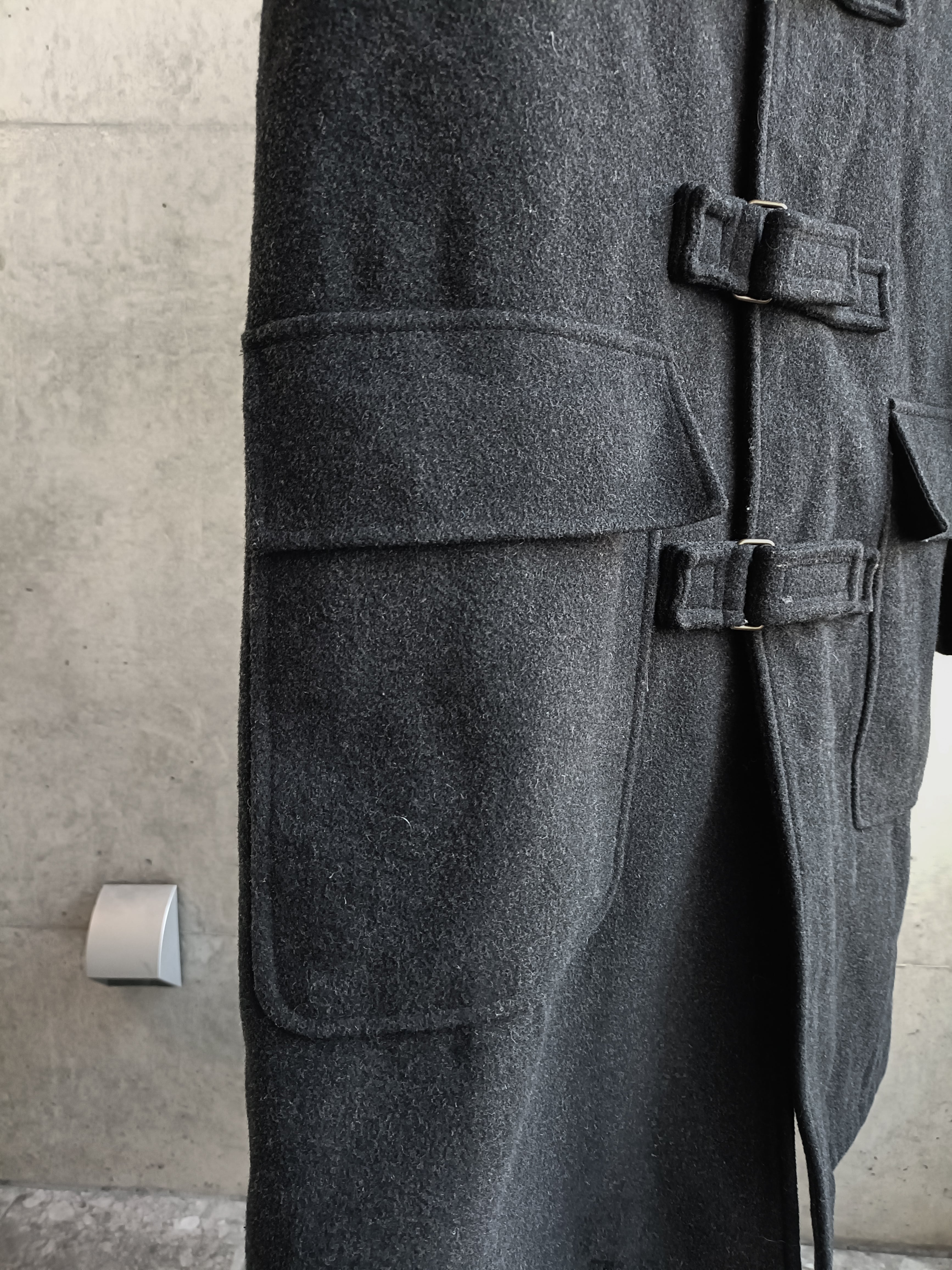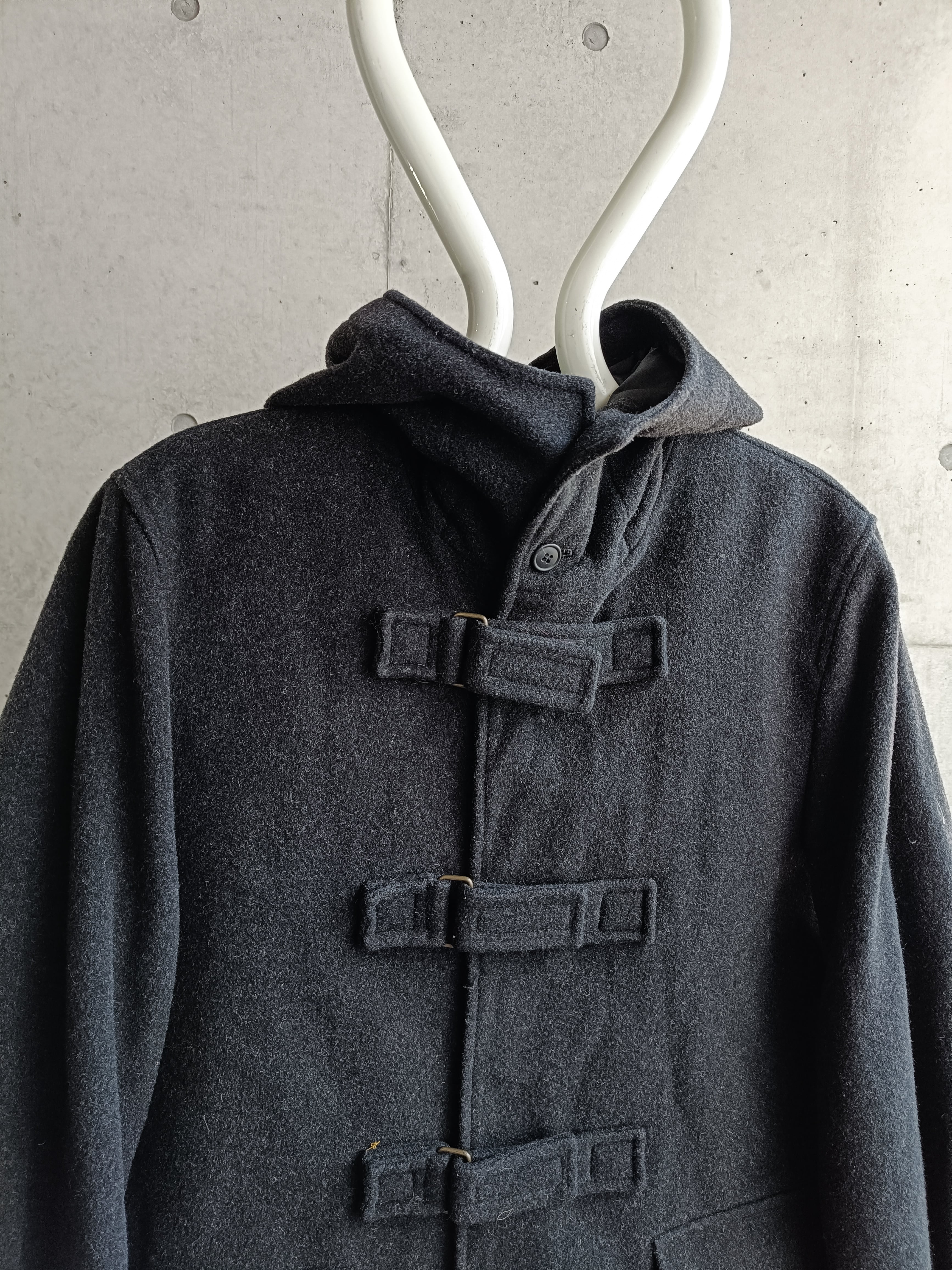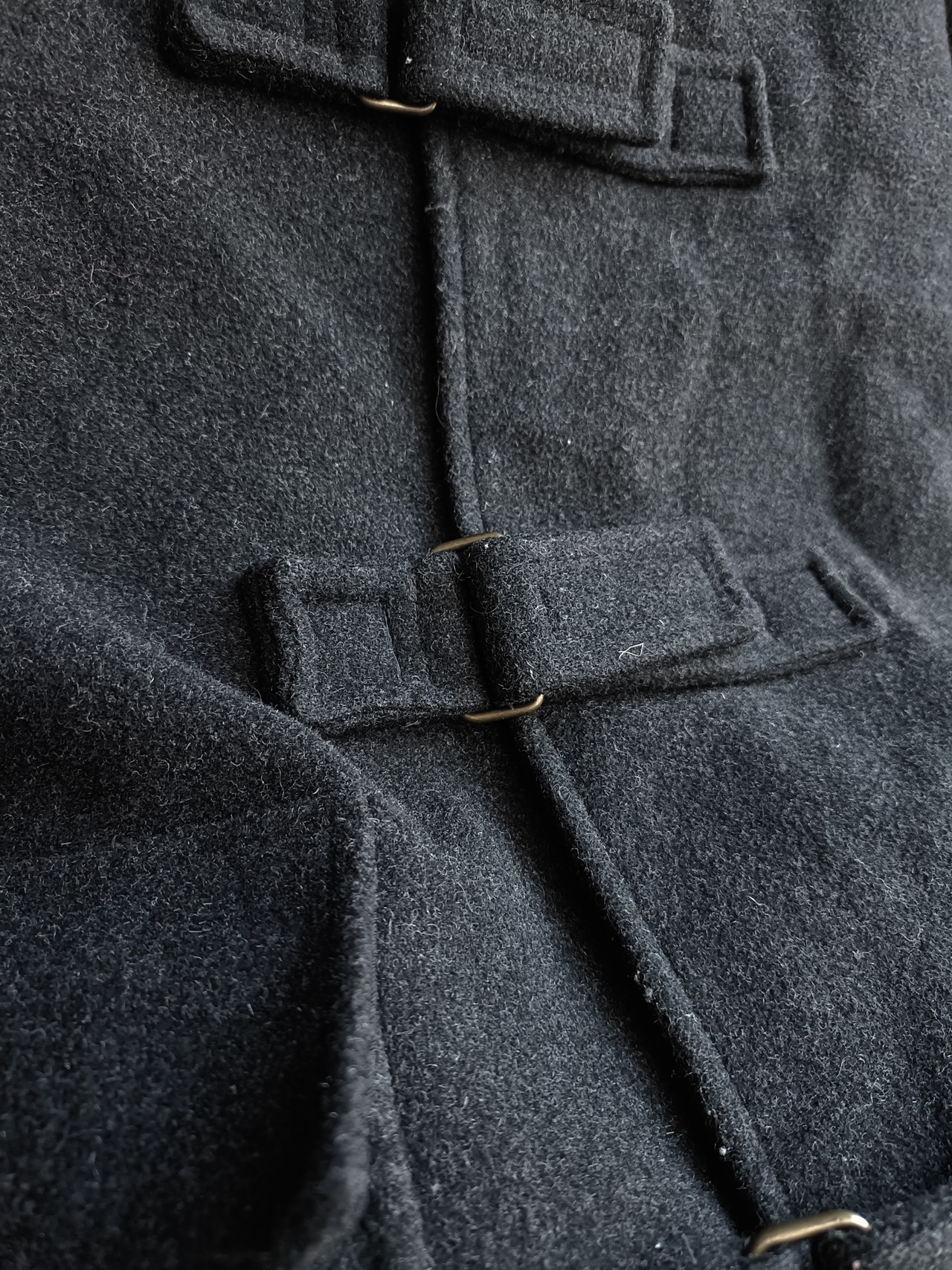 スペシャル。アーカイブのウールダッフルコート。アーカイブのHELMUT LANGでも似たデザインがあった、ベルトタイプのダッフルです。袖もベルト仕様。ネックも留めると高くして着れます。希少なデザイン効いたダッフルコートです。