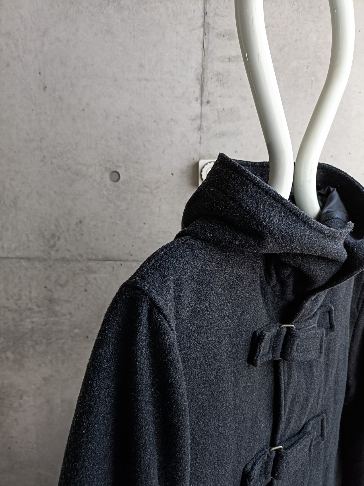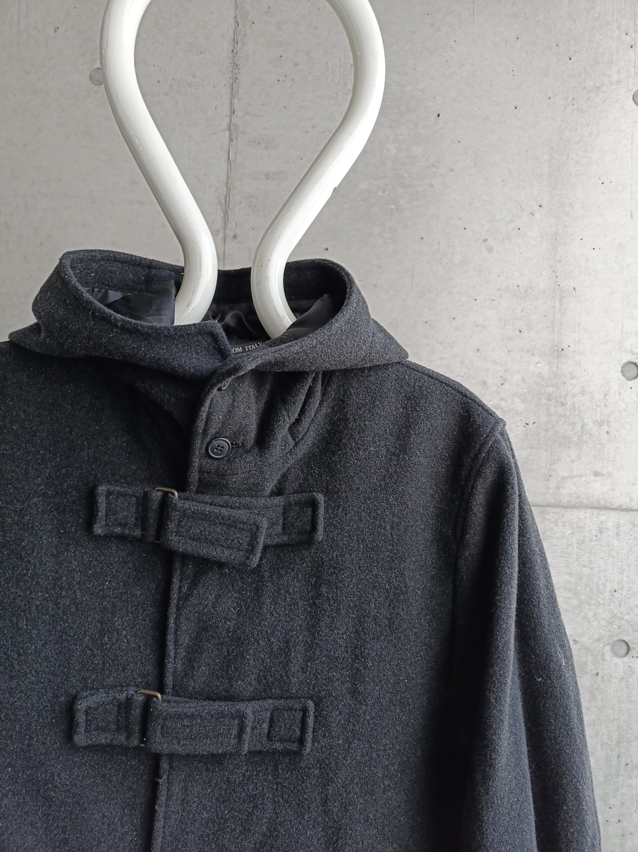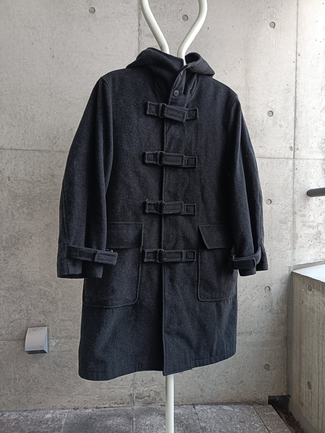 スペシャル。アーカイブのウールダッフルコート。アーカイブのHELMUT LANGでも似たデザインがあった、ベルトタイプのダッフルです。袖もベルト仕様。ネックも留めると高くして着れます。希少なデザイン効いたダッフルコートです。