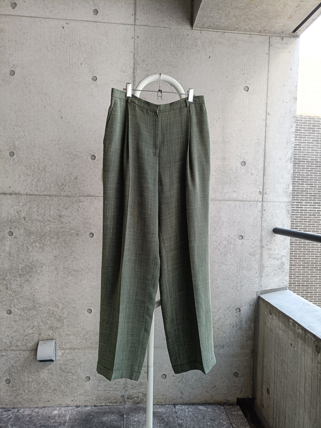 ピスタチオカラーのヘリンボーンスラックス。よく見ると赤系のラインが入った生地。なんと言ってもシルエットが極上。ストンと落ちるワイドシルエットのドレープ生地です。裏地付きで着心地も抜群です。
