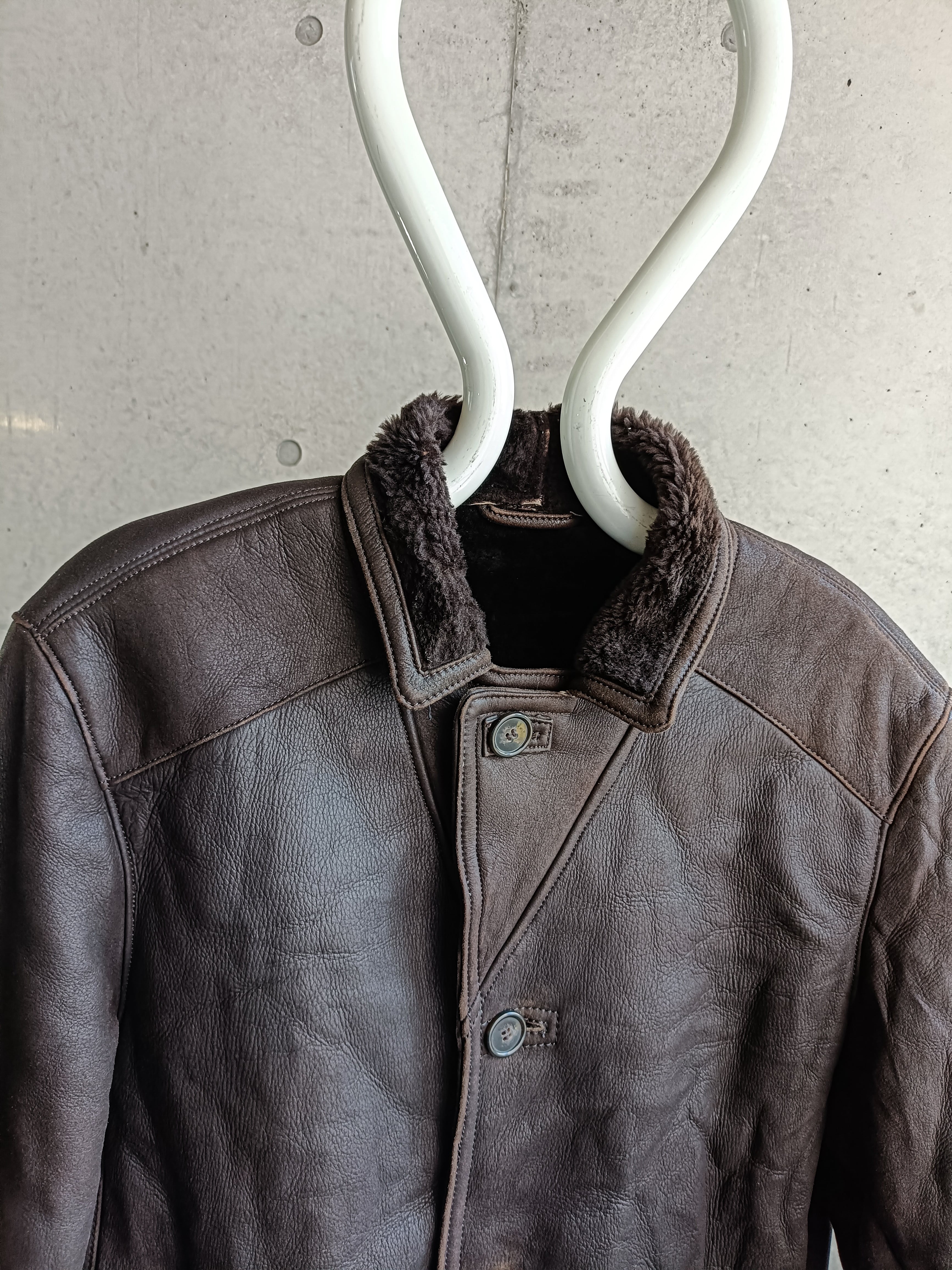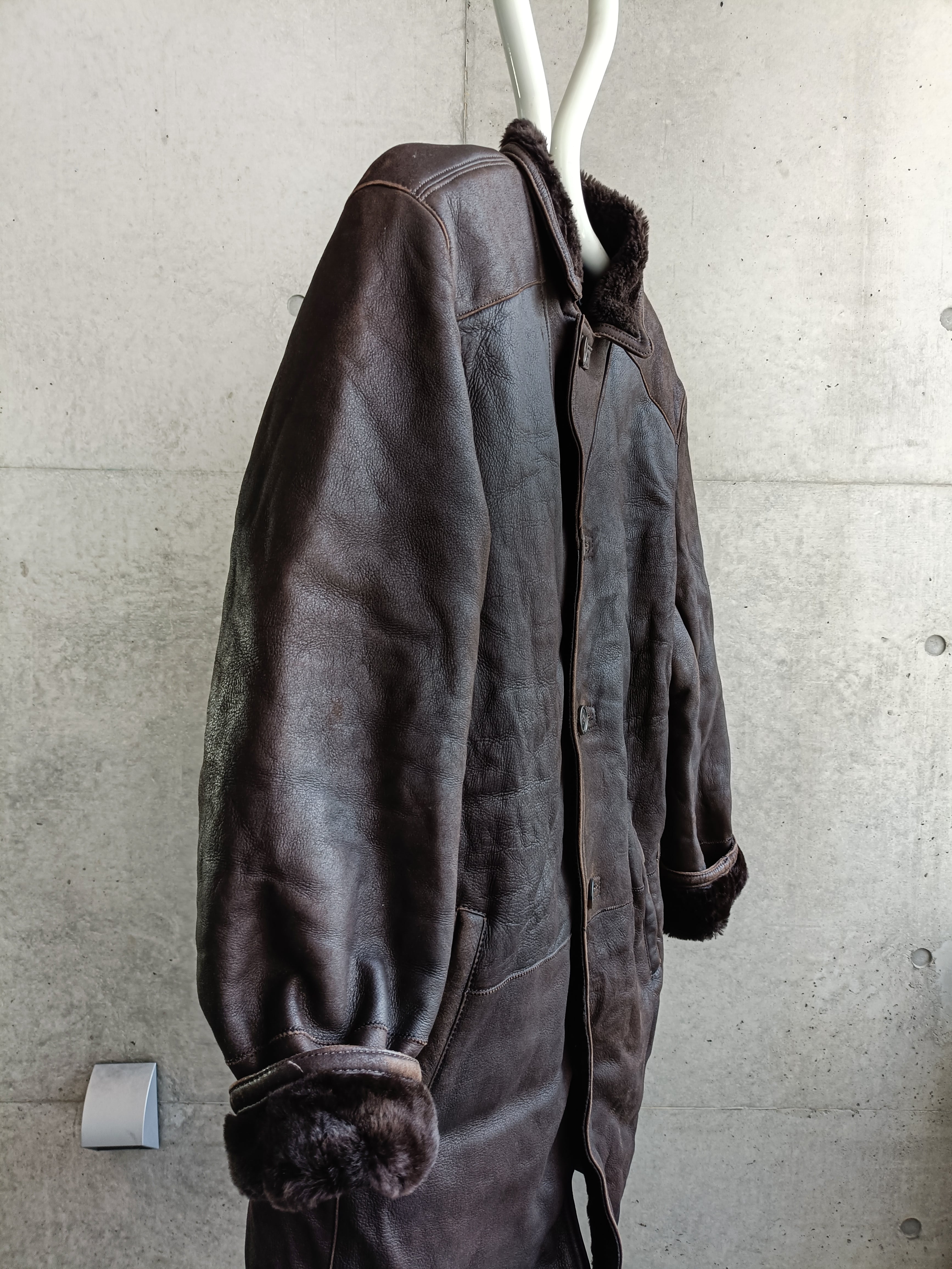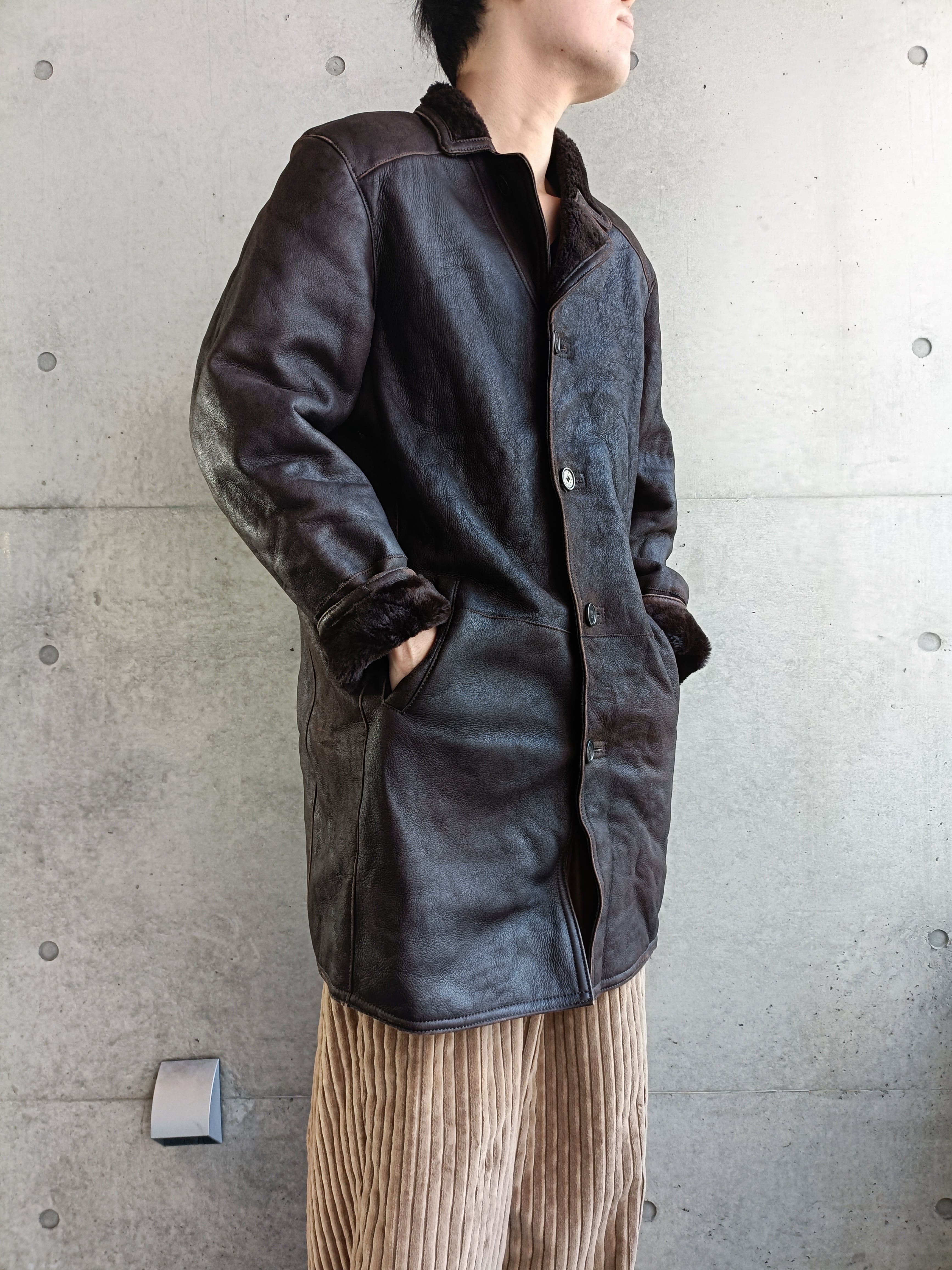 タバコブラウン色のムートンコート。トップボタンを留めてもシルエットが綺麗な物のみ厳選してます。しっかり肩も落ちます。革が柔らかく、レザー特有の重さも感じないです。