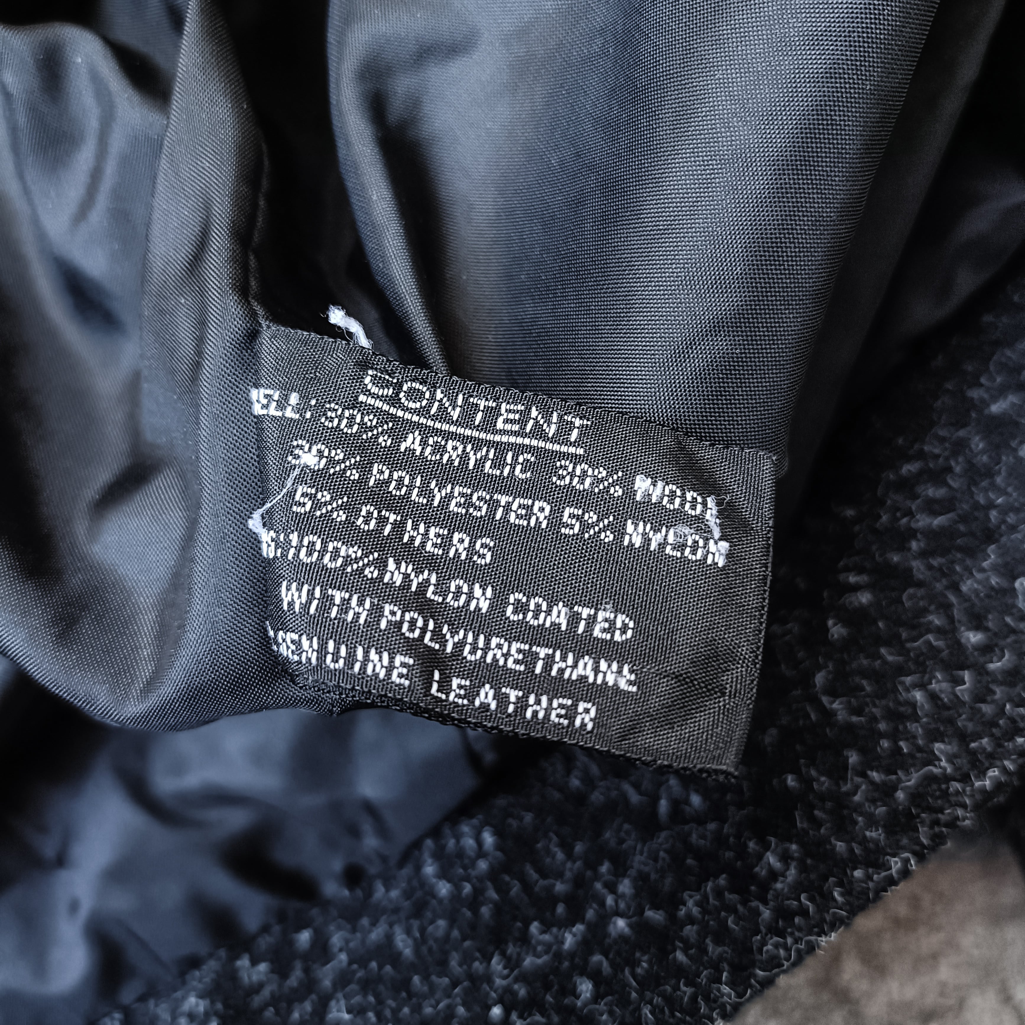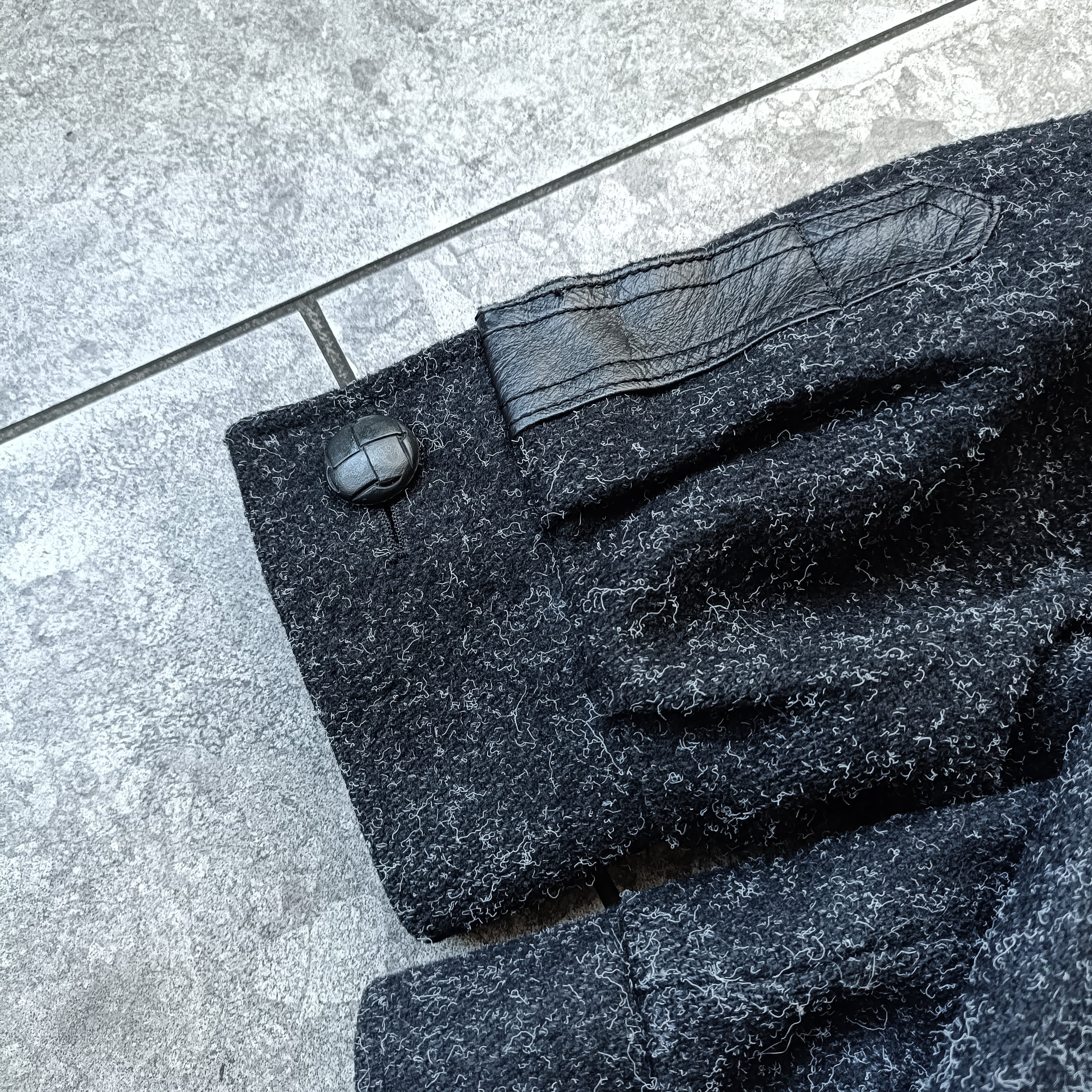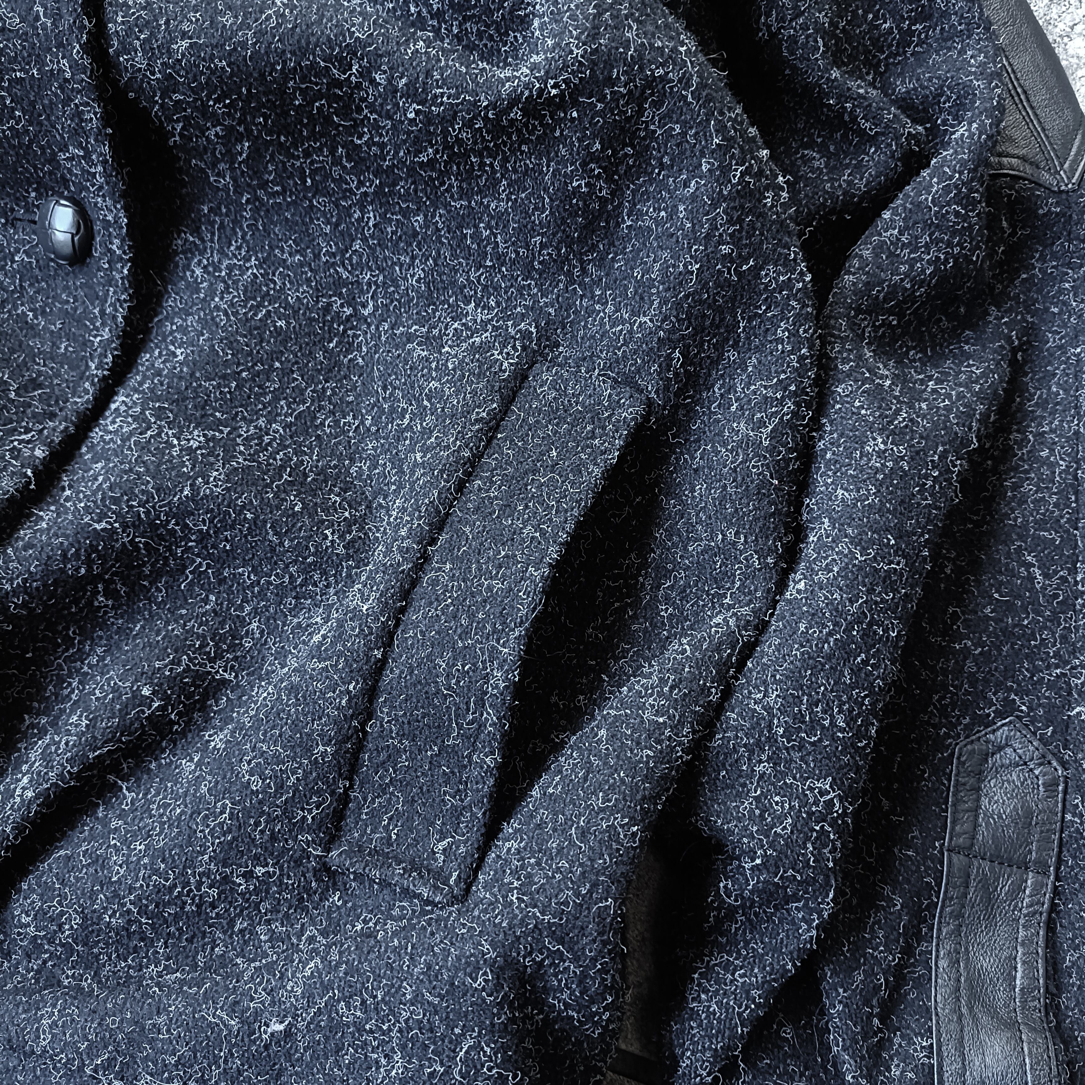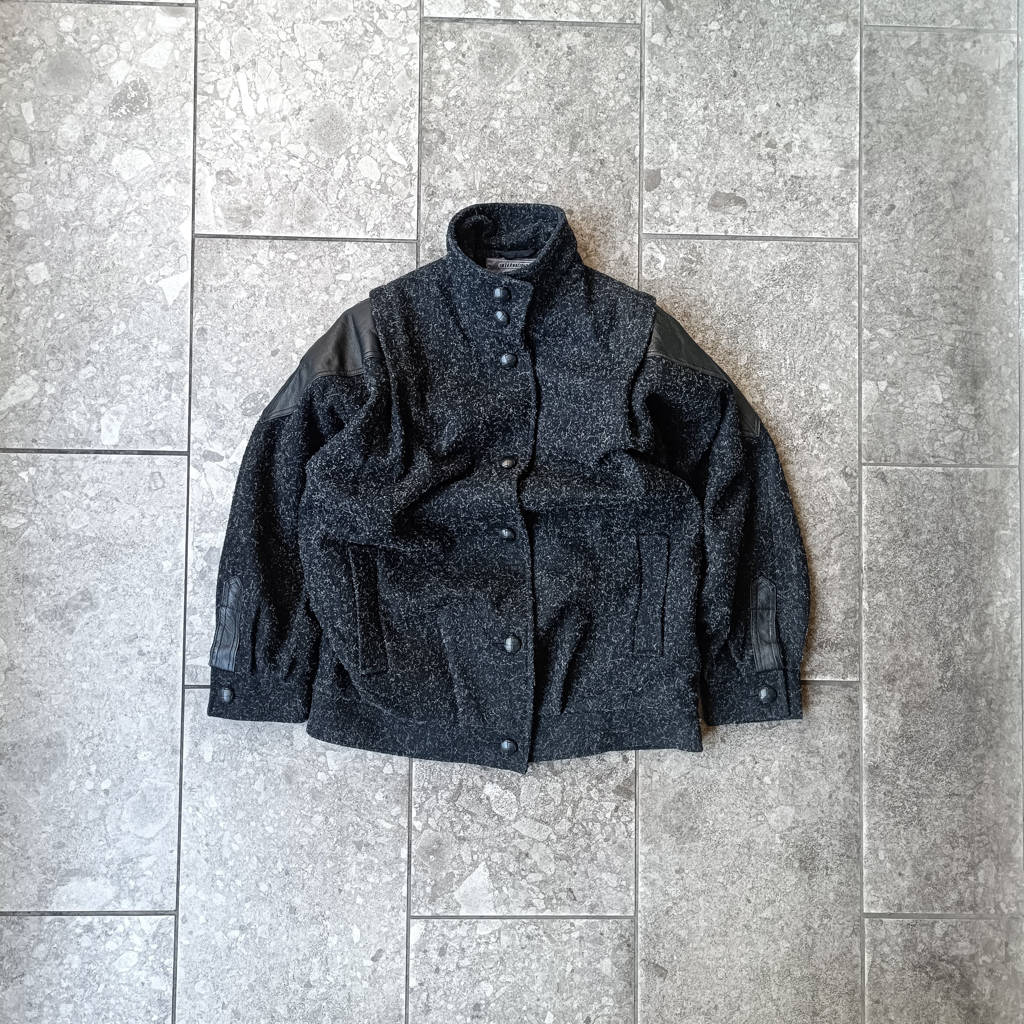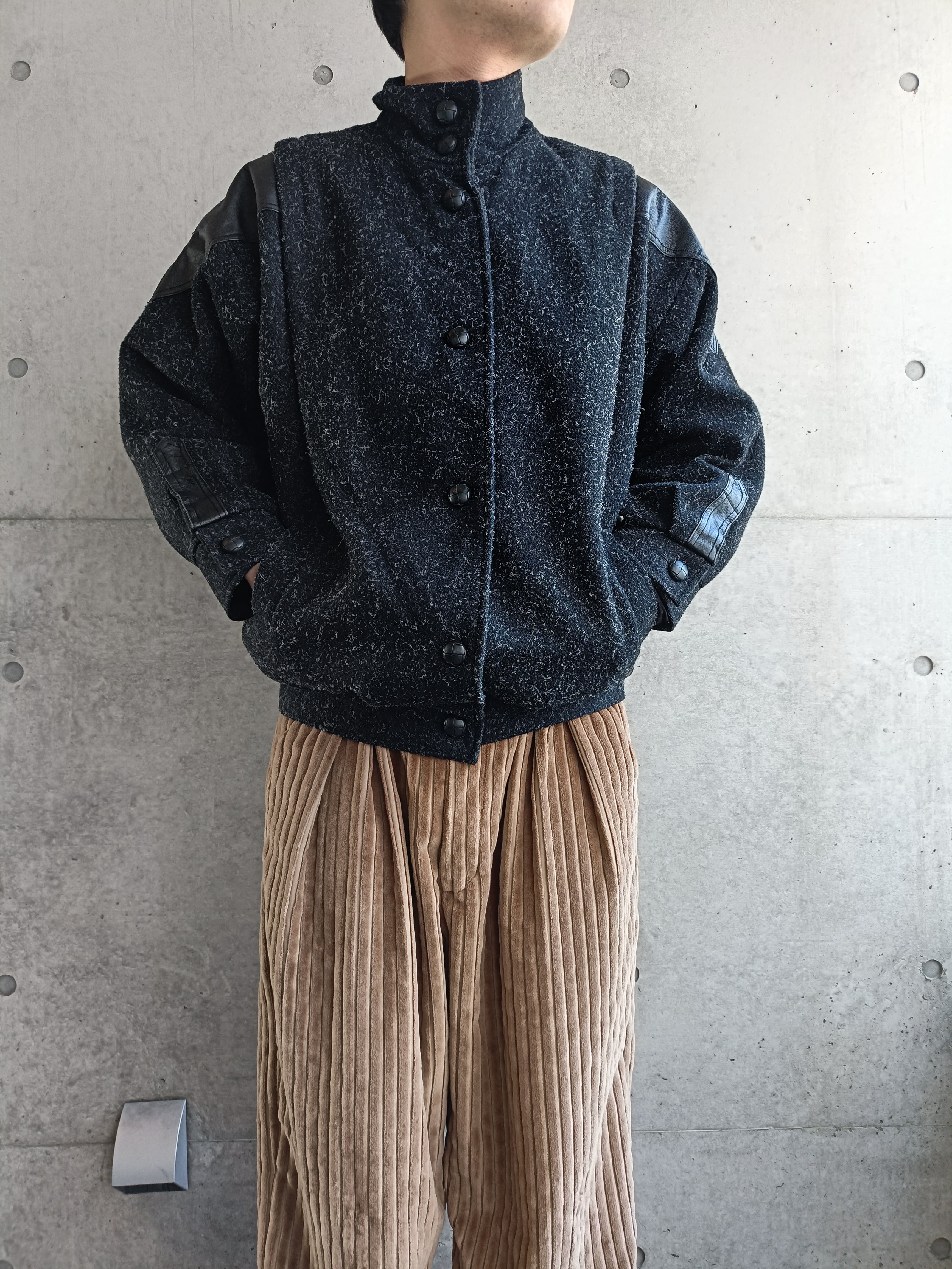 ブラックのウールレザー切替ブルゾン。肩や袖などが本革切替。身頃裾や袖にタック入りで立体的なシルエットです。裾も狭めなので好きな丈感で着用可能。丸い綺麗なシルエットです。