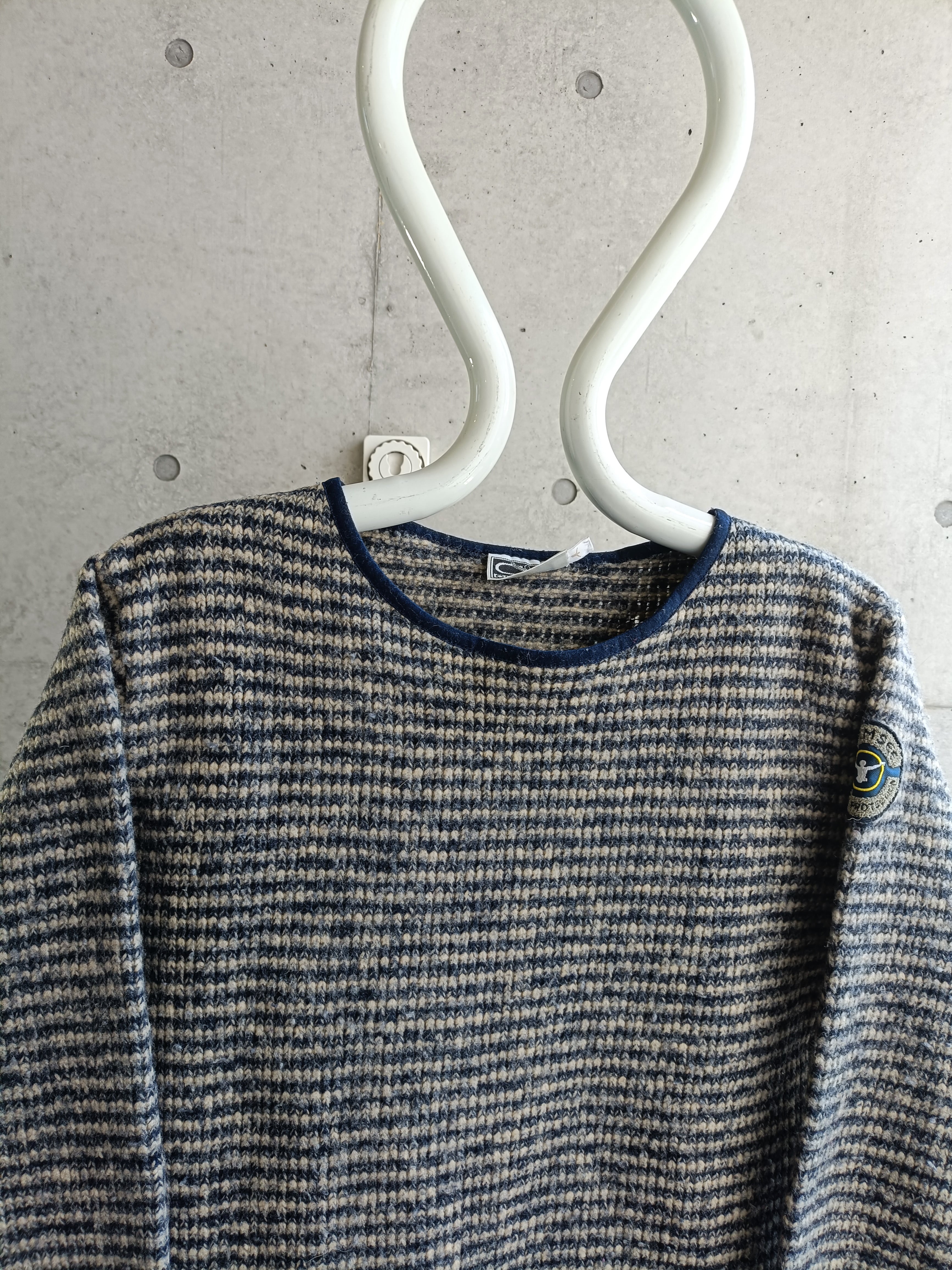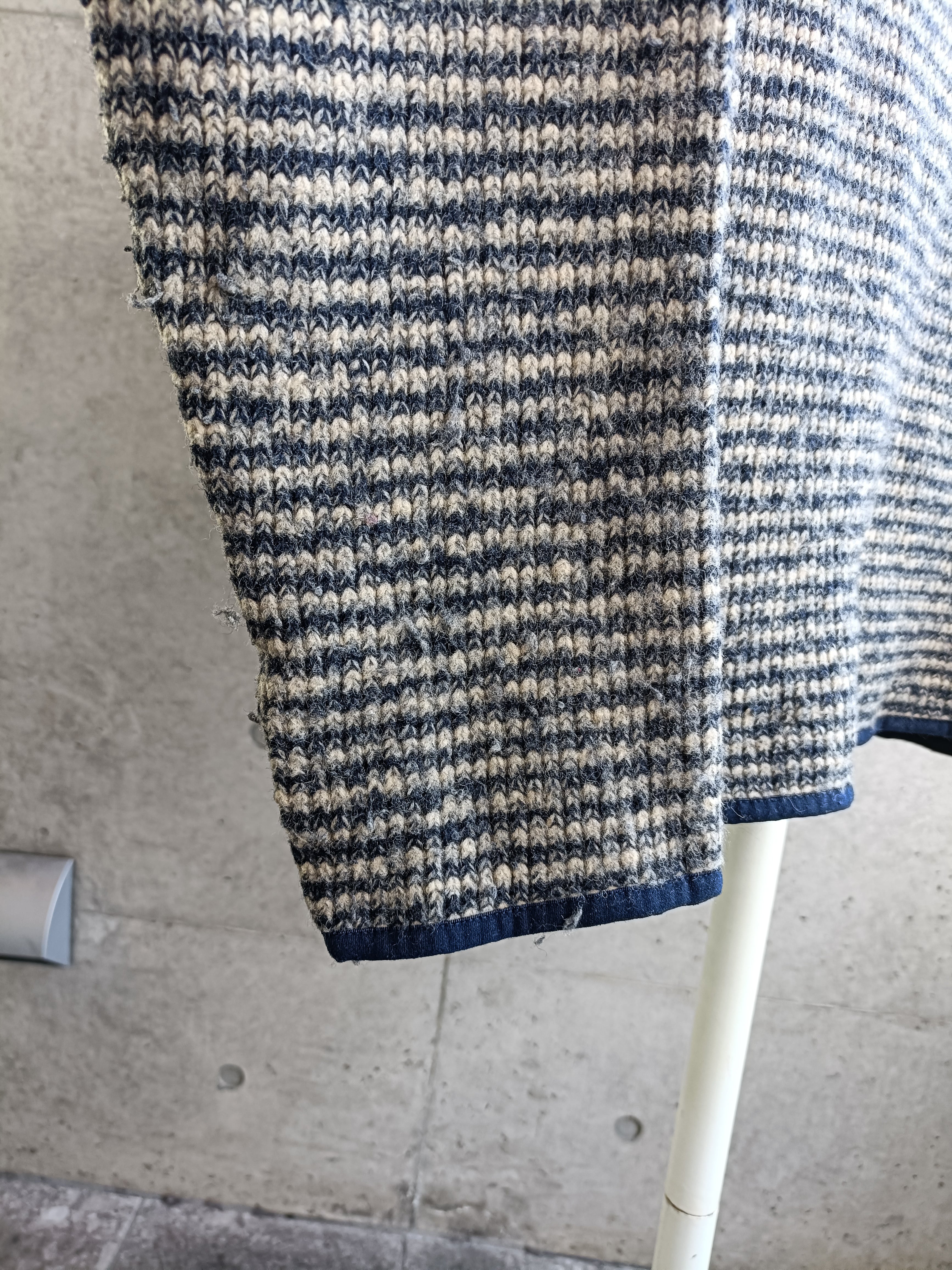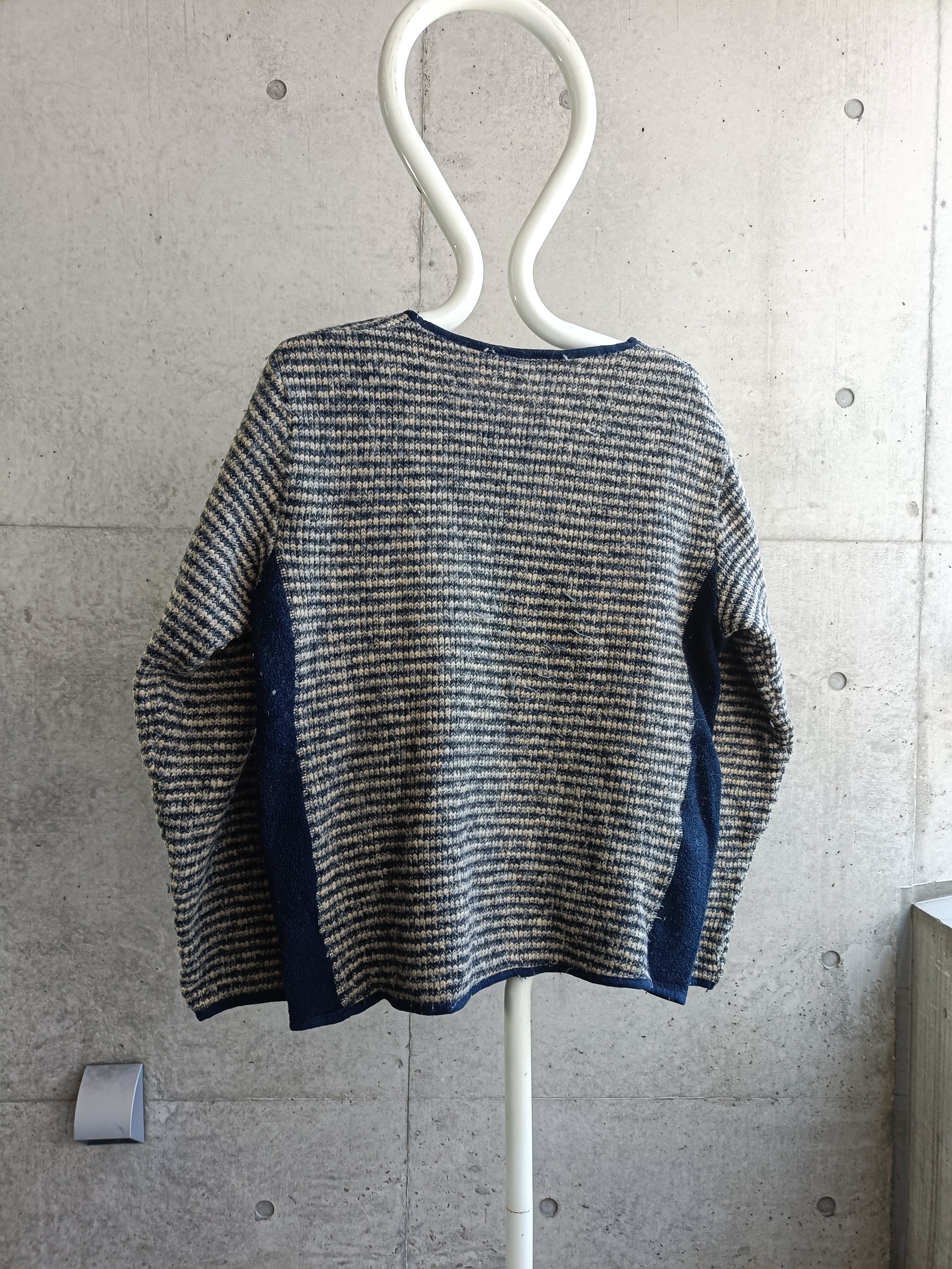 ネイビー、白のミックスウールニット。首元のパイピングやサイドがネイビーのフリース生地切替です。ニットとフリース切替という珍しいディテール。短丈で着やすいシルエットです。