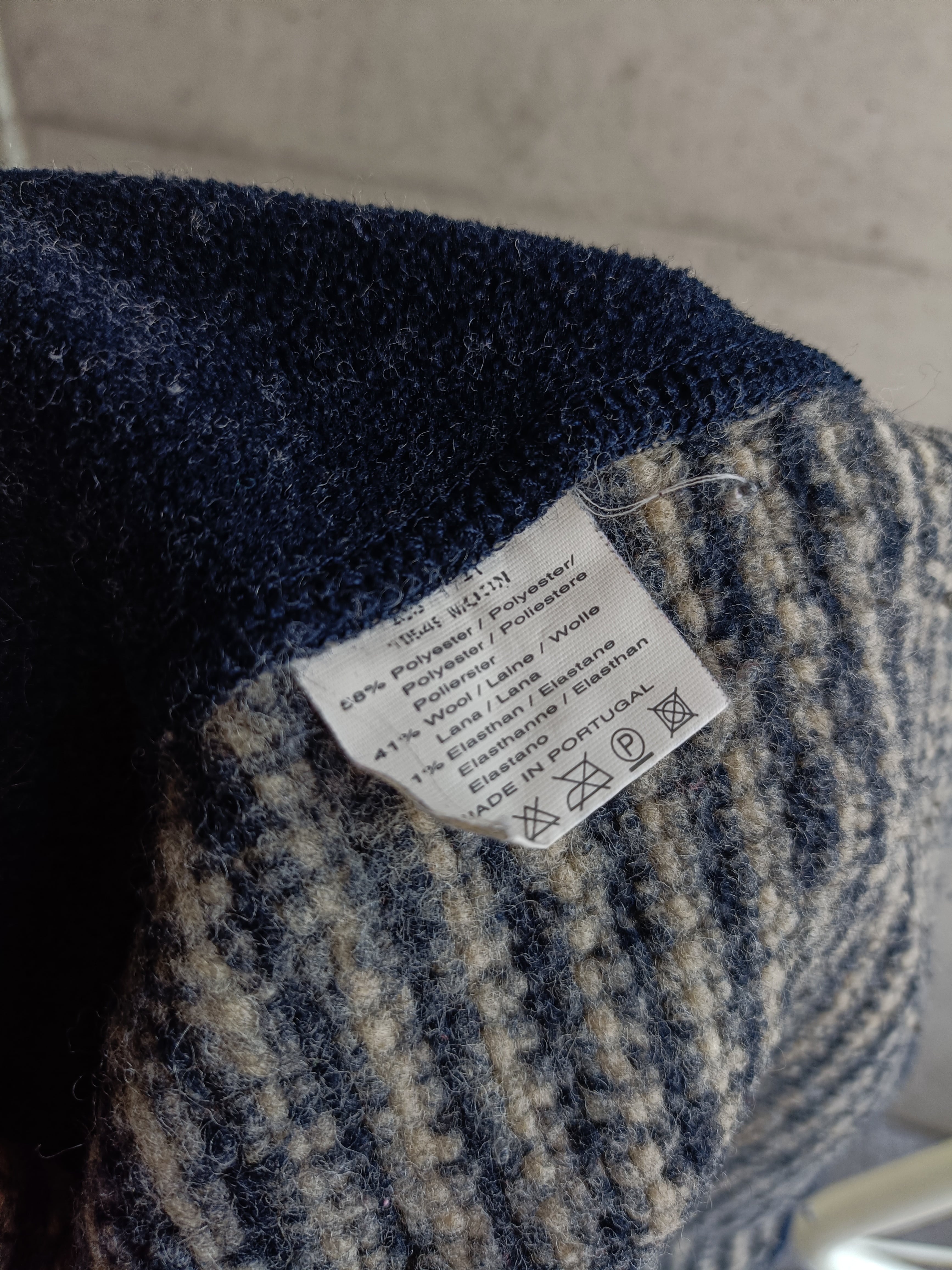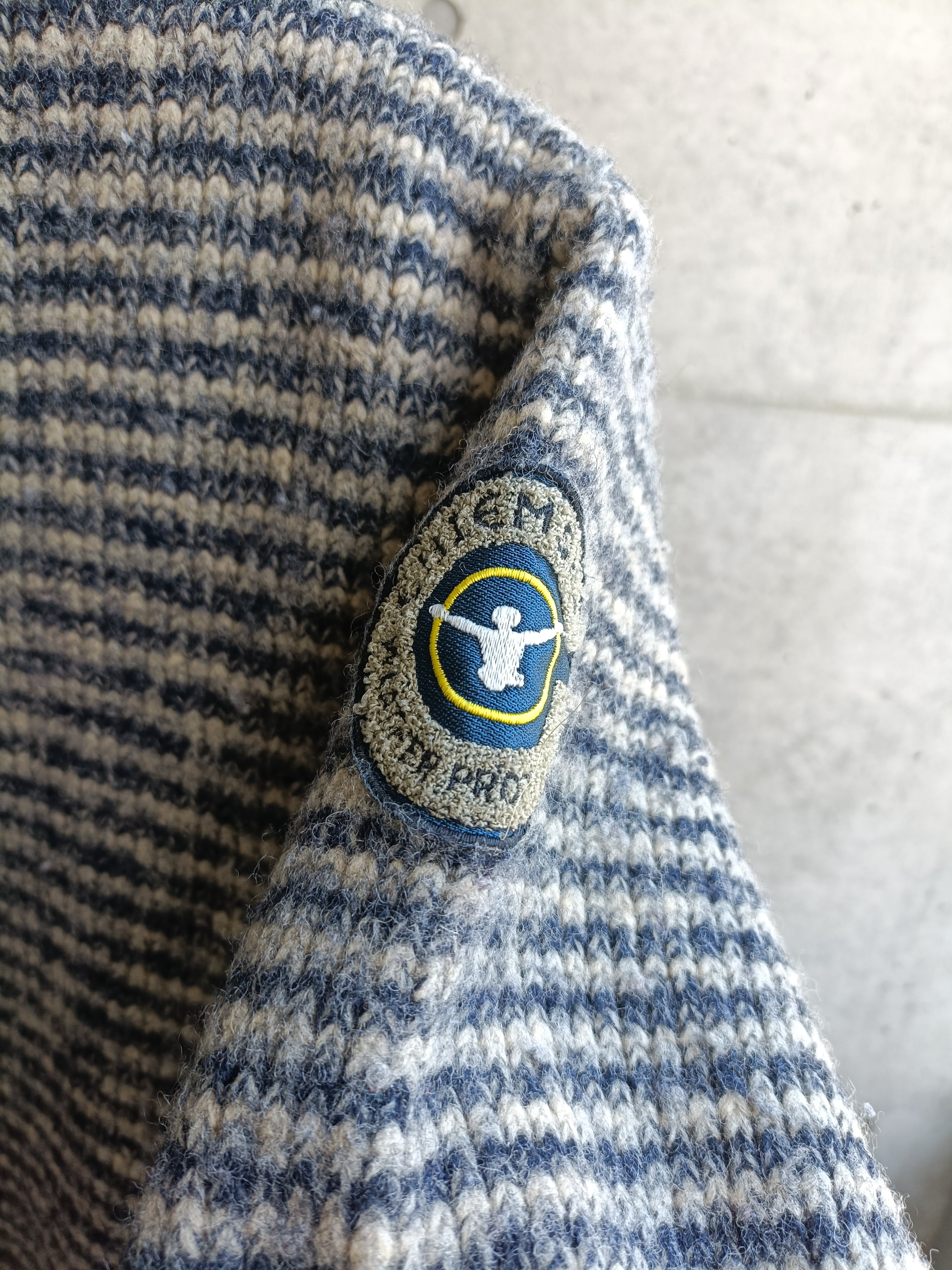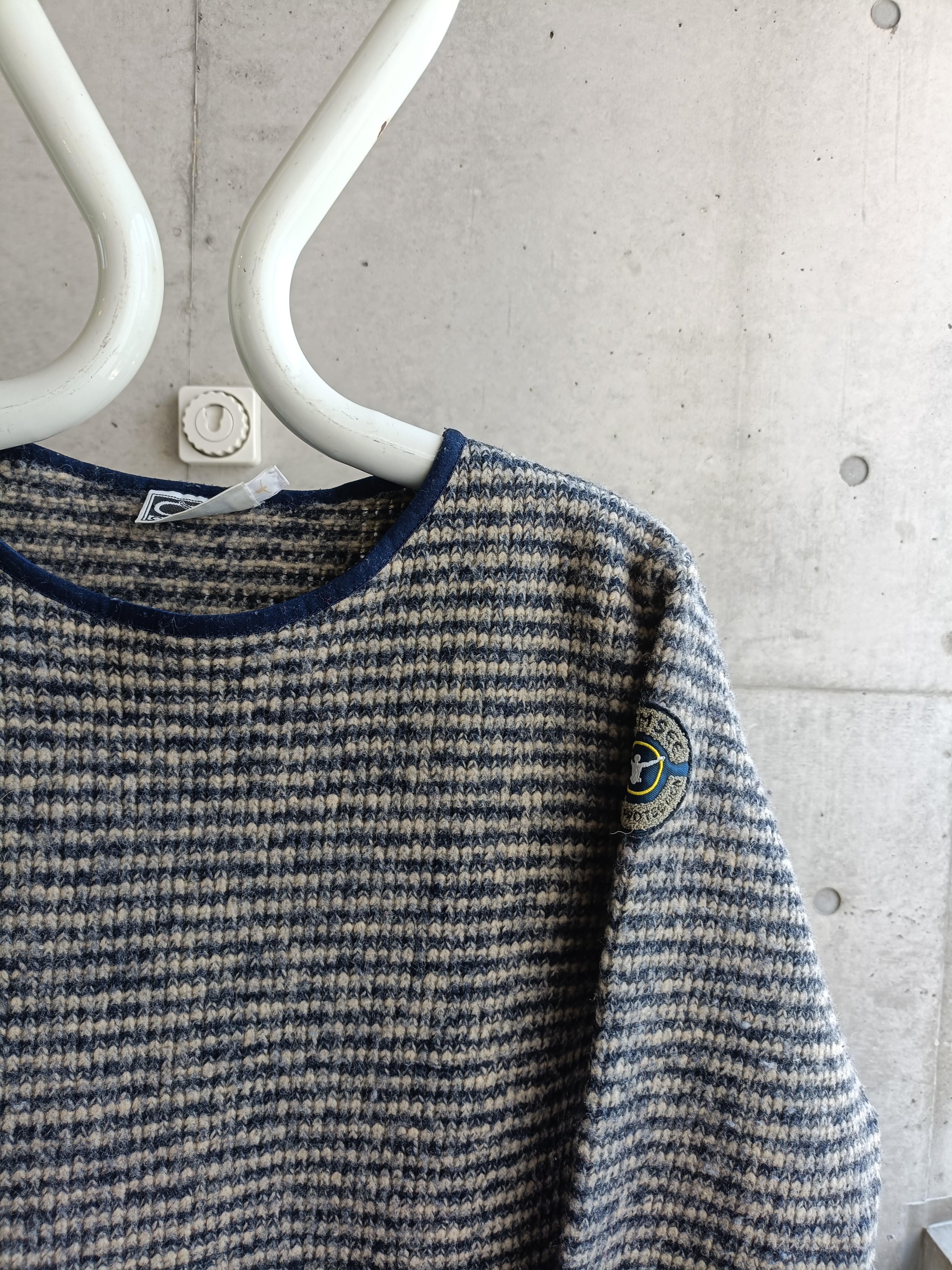 ネイビー、白のミックスウールニット。首元のパイピングやサイドがネイビーのフリース生地切替です。ニットとフリース切替という珍しいディテール。短丈で着やすいシルエットです。