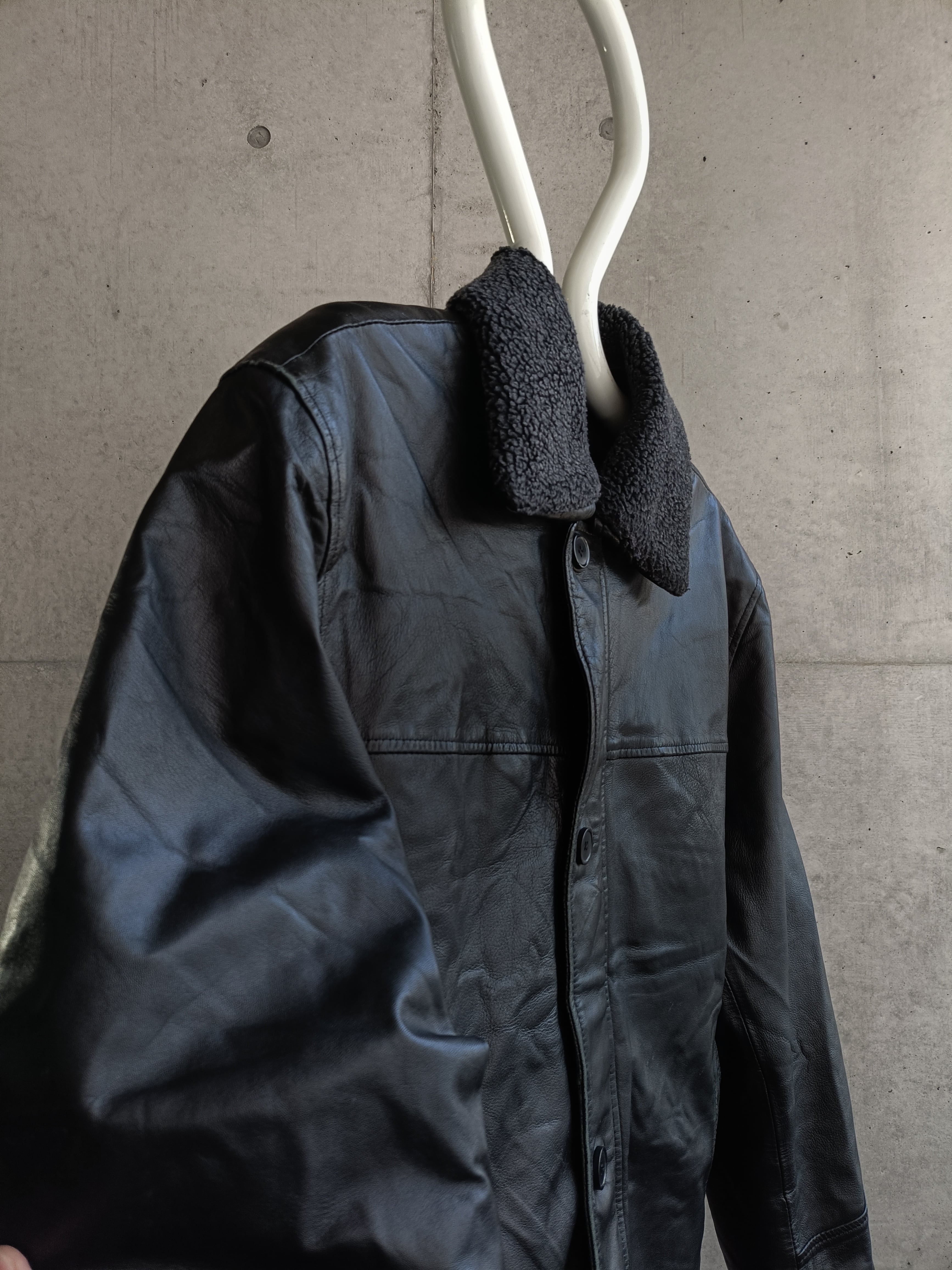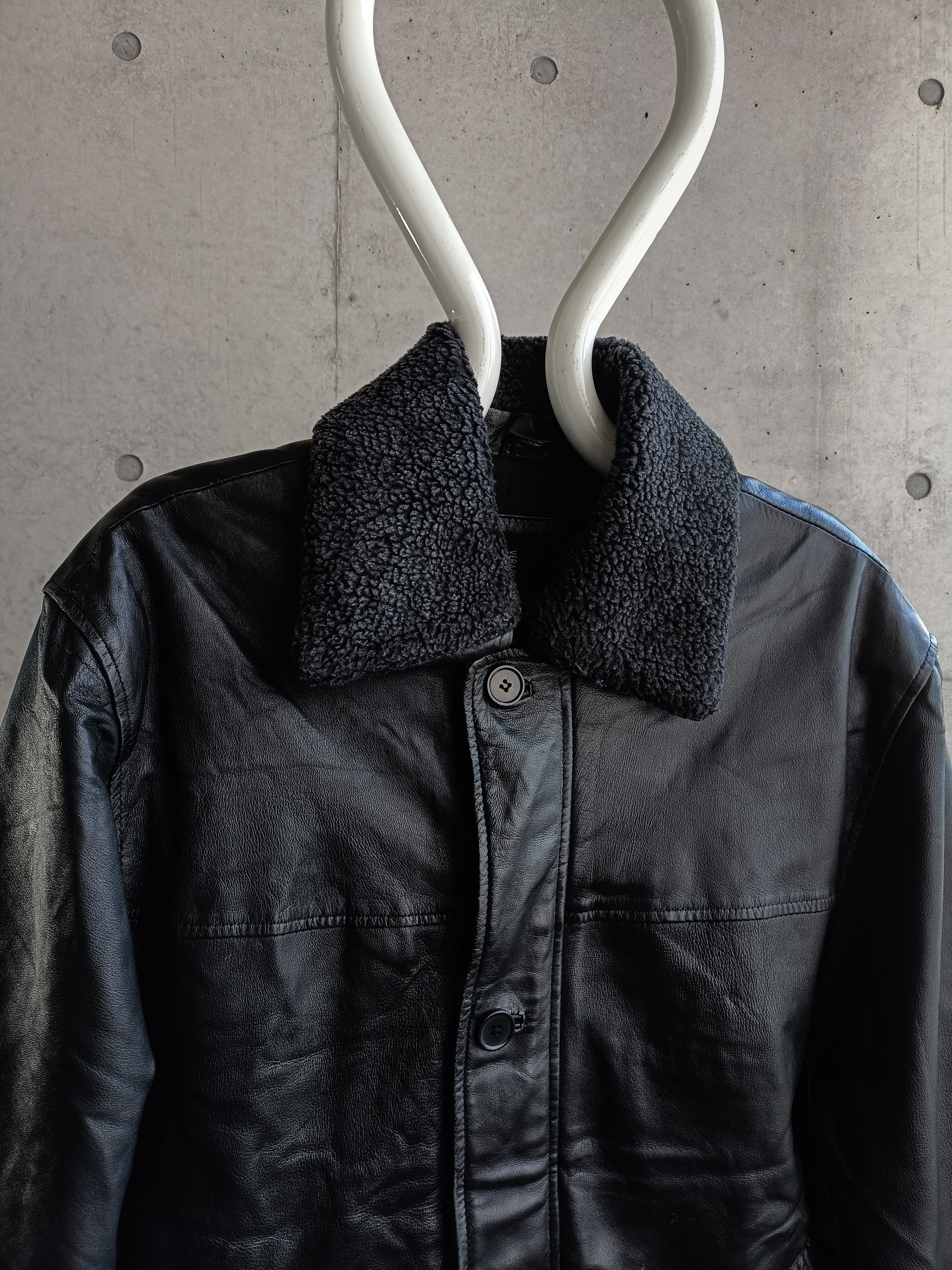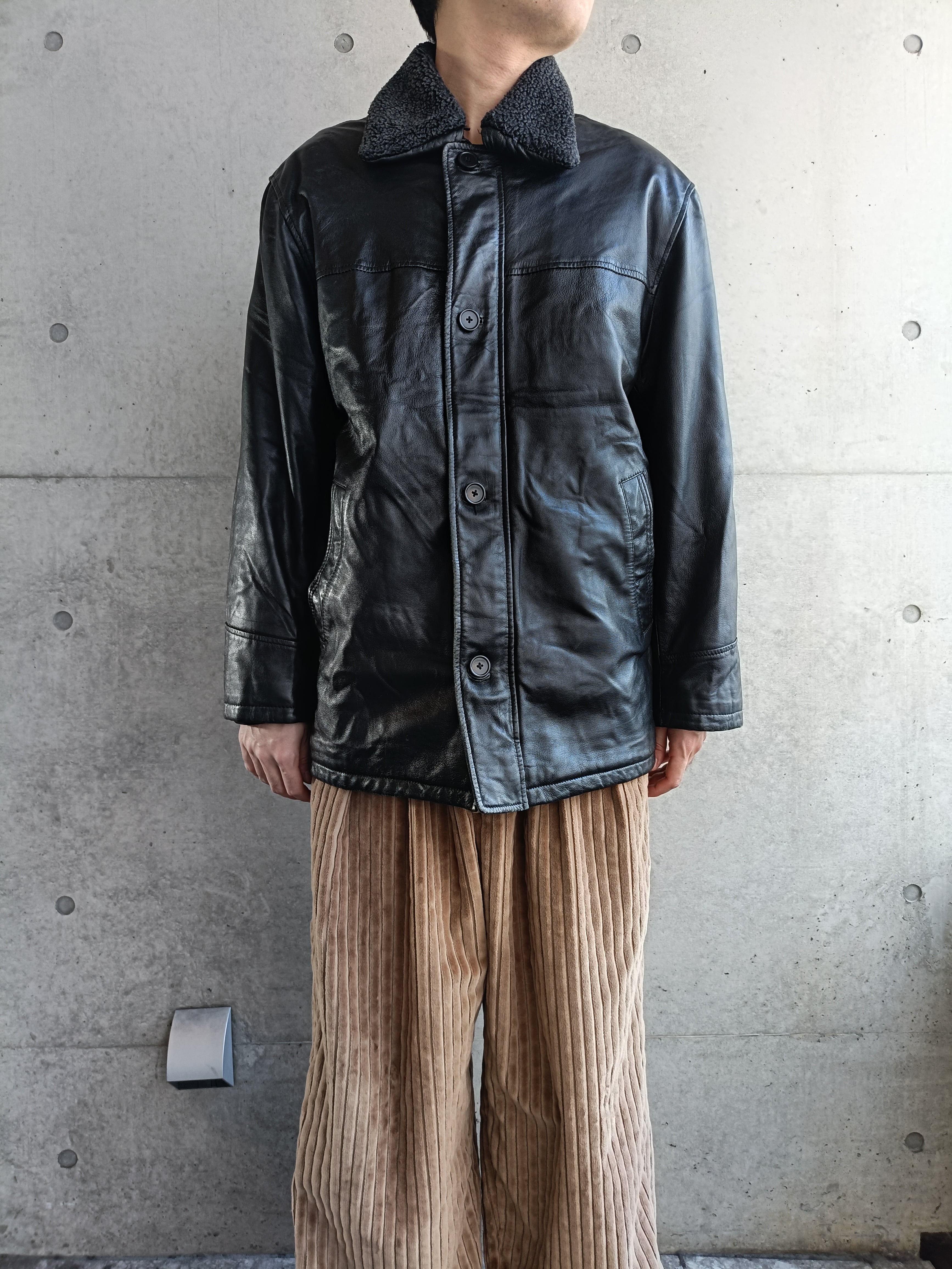 ブラックのレザーコート。襟ボア仕様。襟ボアは取り外し可能で、ノーマルな襟としても着用可能です。シルエットも綺麗で、王道な着やすい形。レザー初めての方にもオススメな一着です。