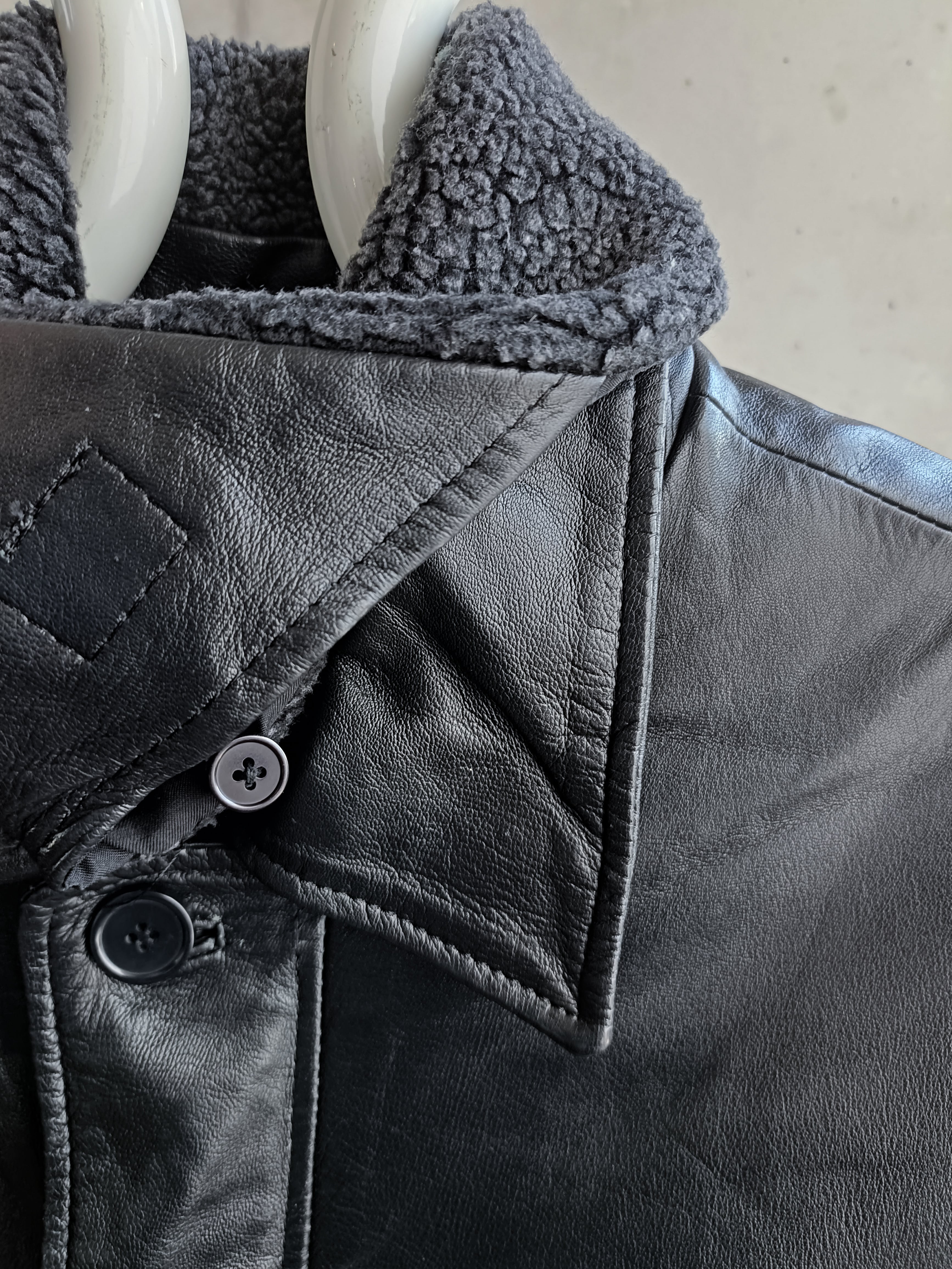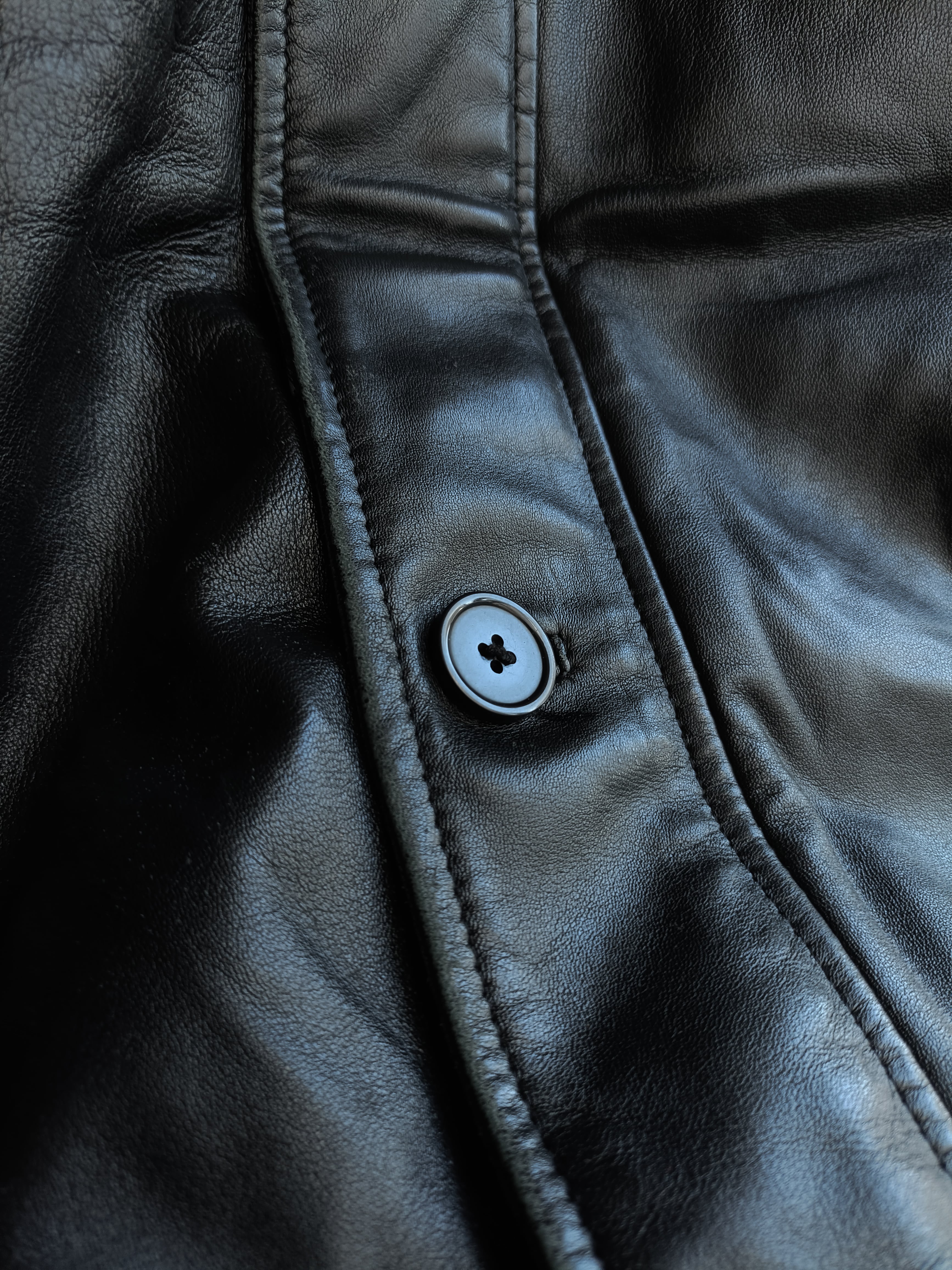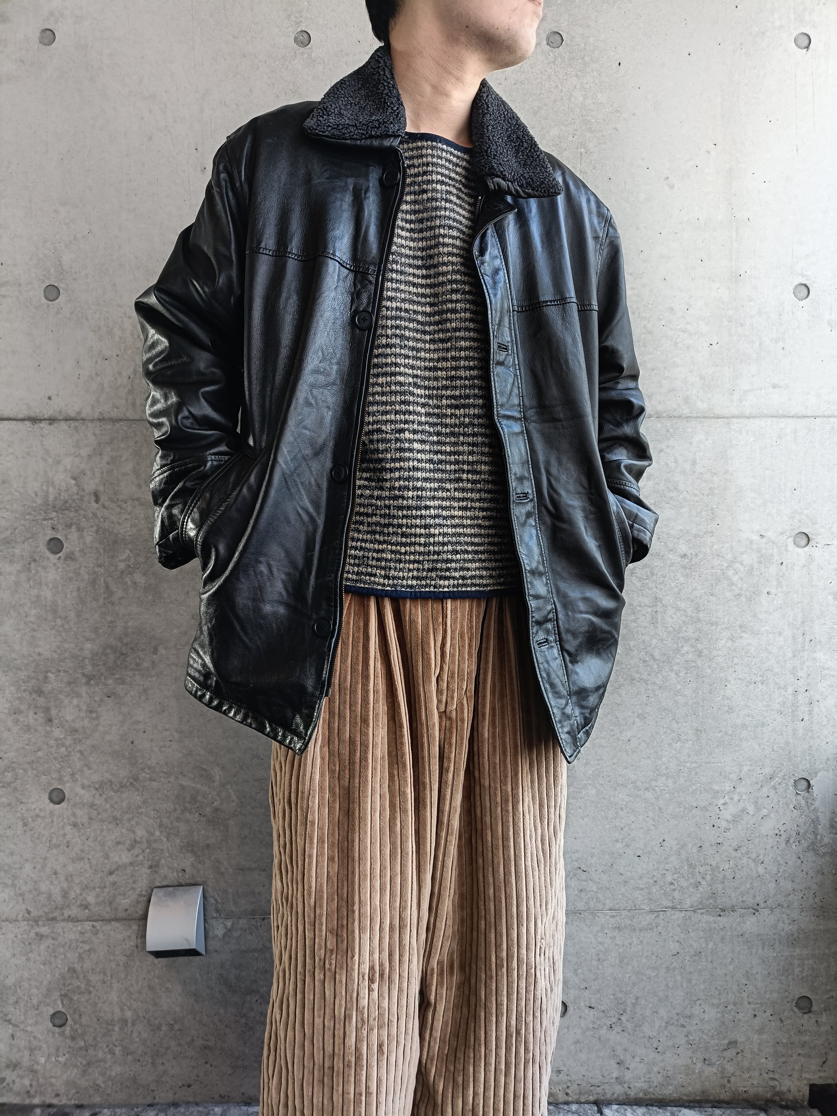 ブラックのレザーコート。襟ボア仕様。襟ボアは取り外し可能で、ノーマルな襟としても着用可能です。シルエットも綺麗で、王道な着やすい形。レザー初めての方にもオススメな一着です。