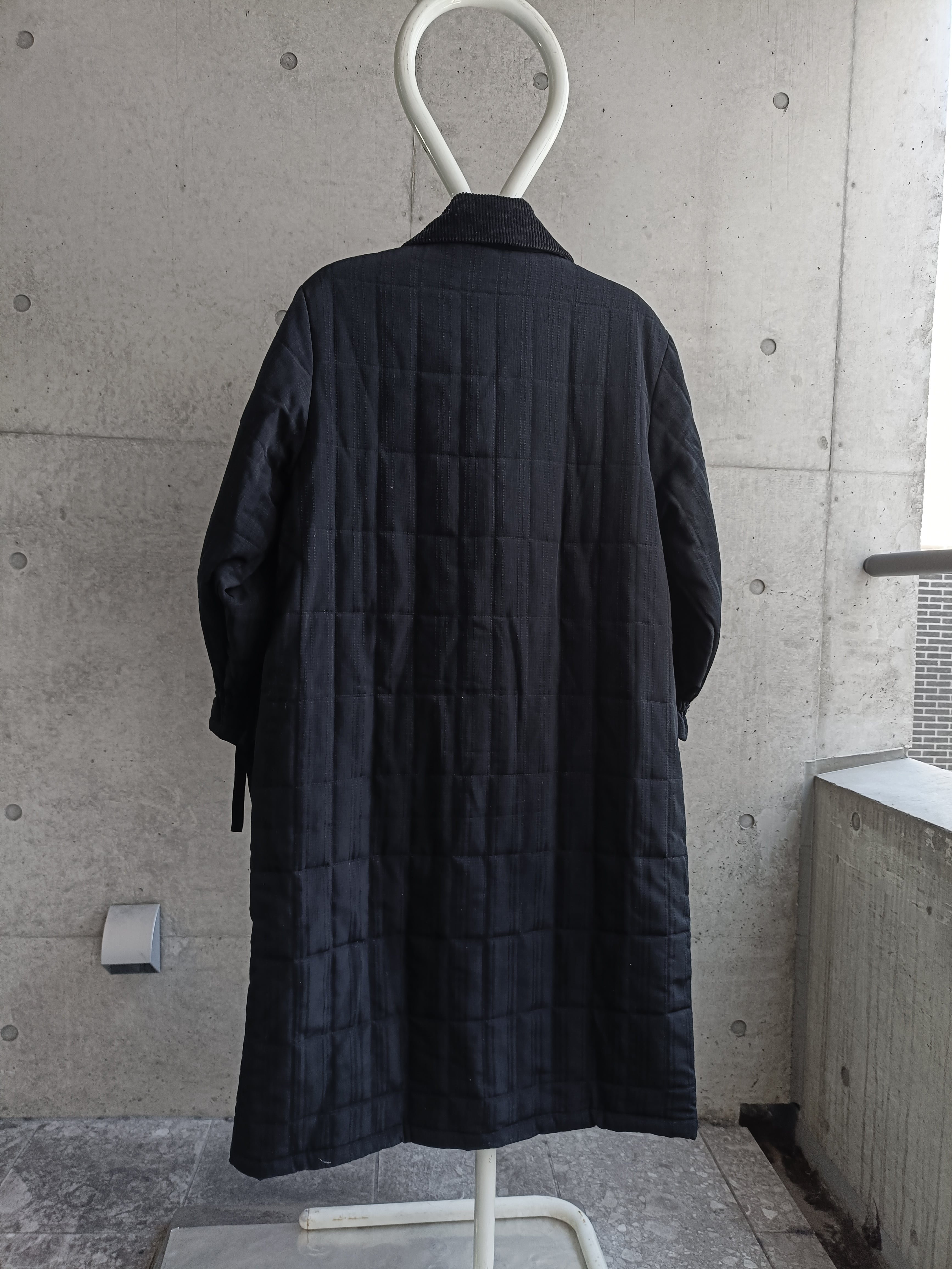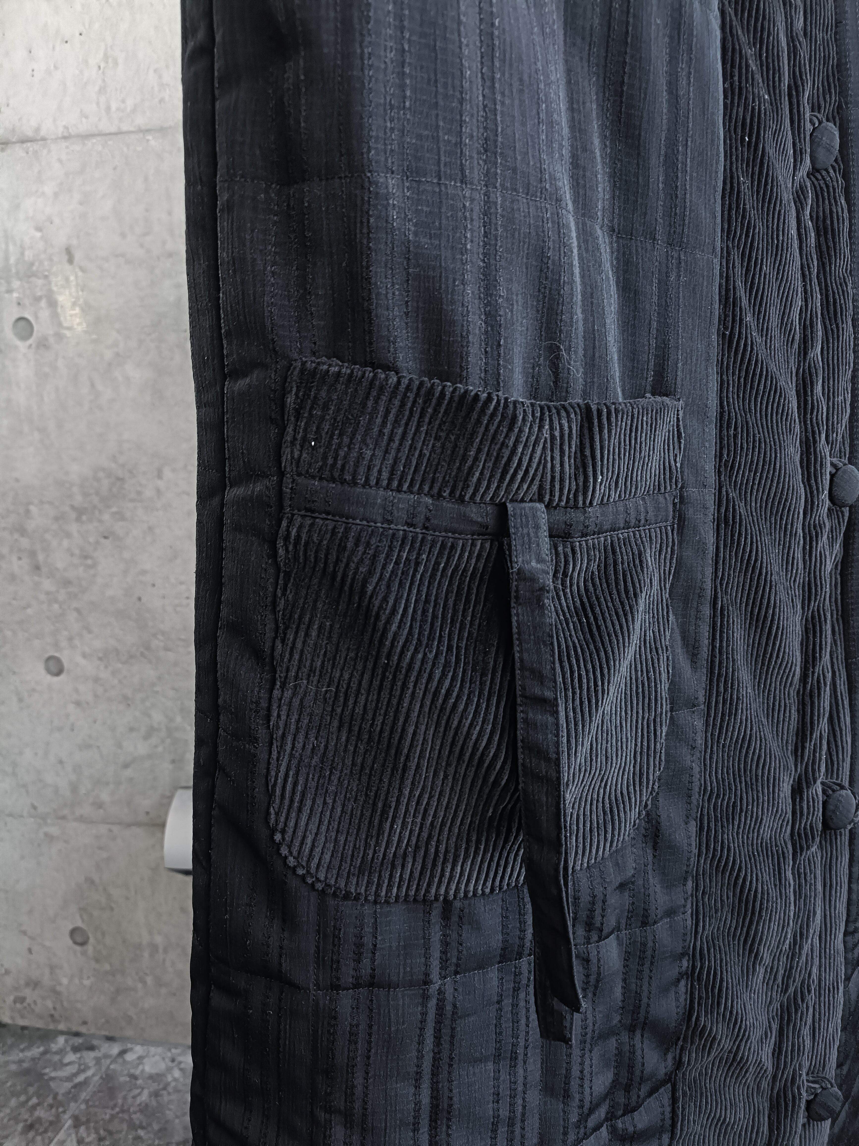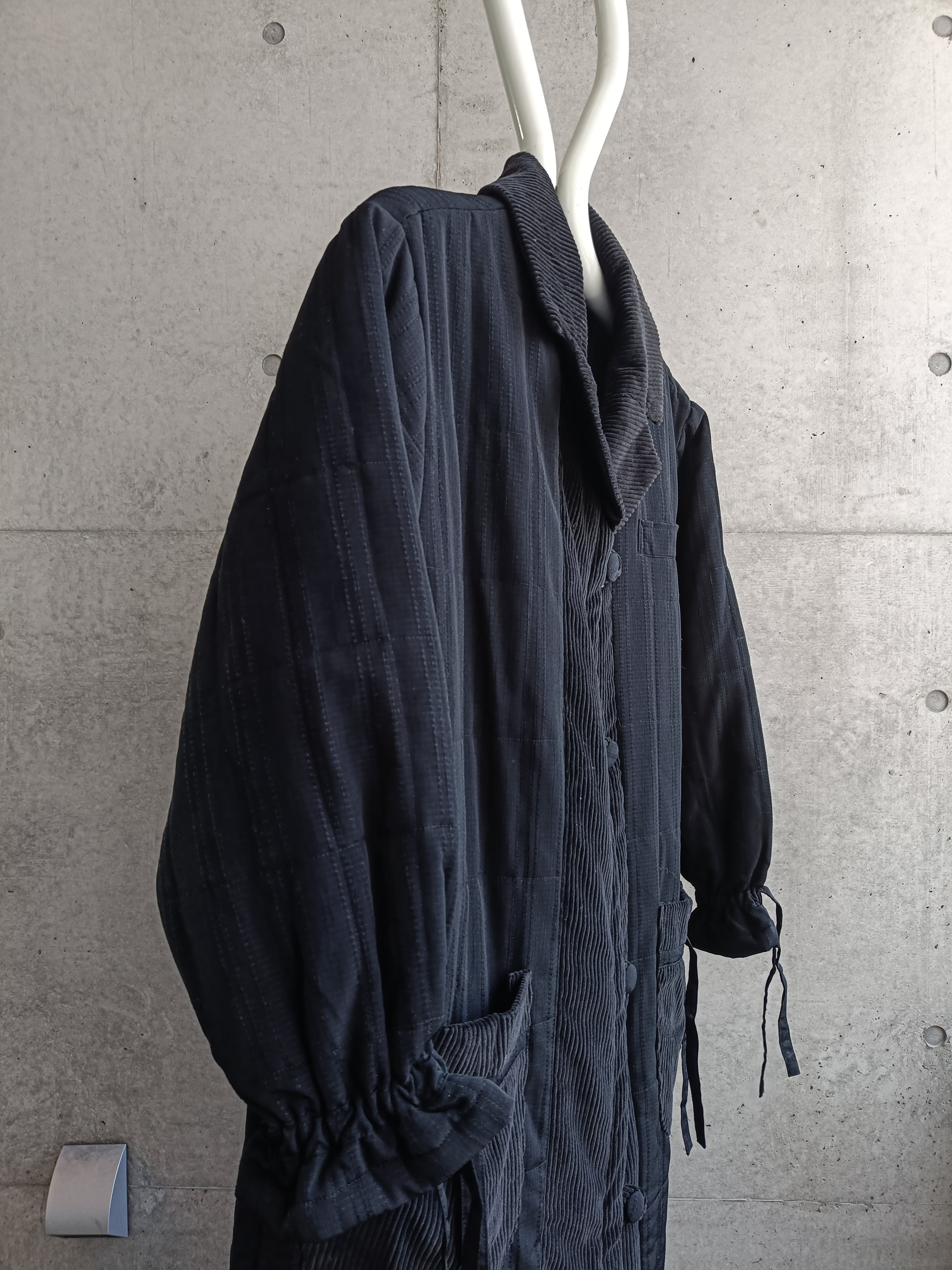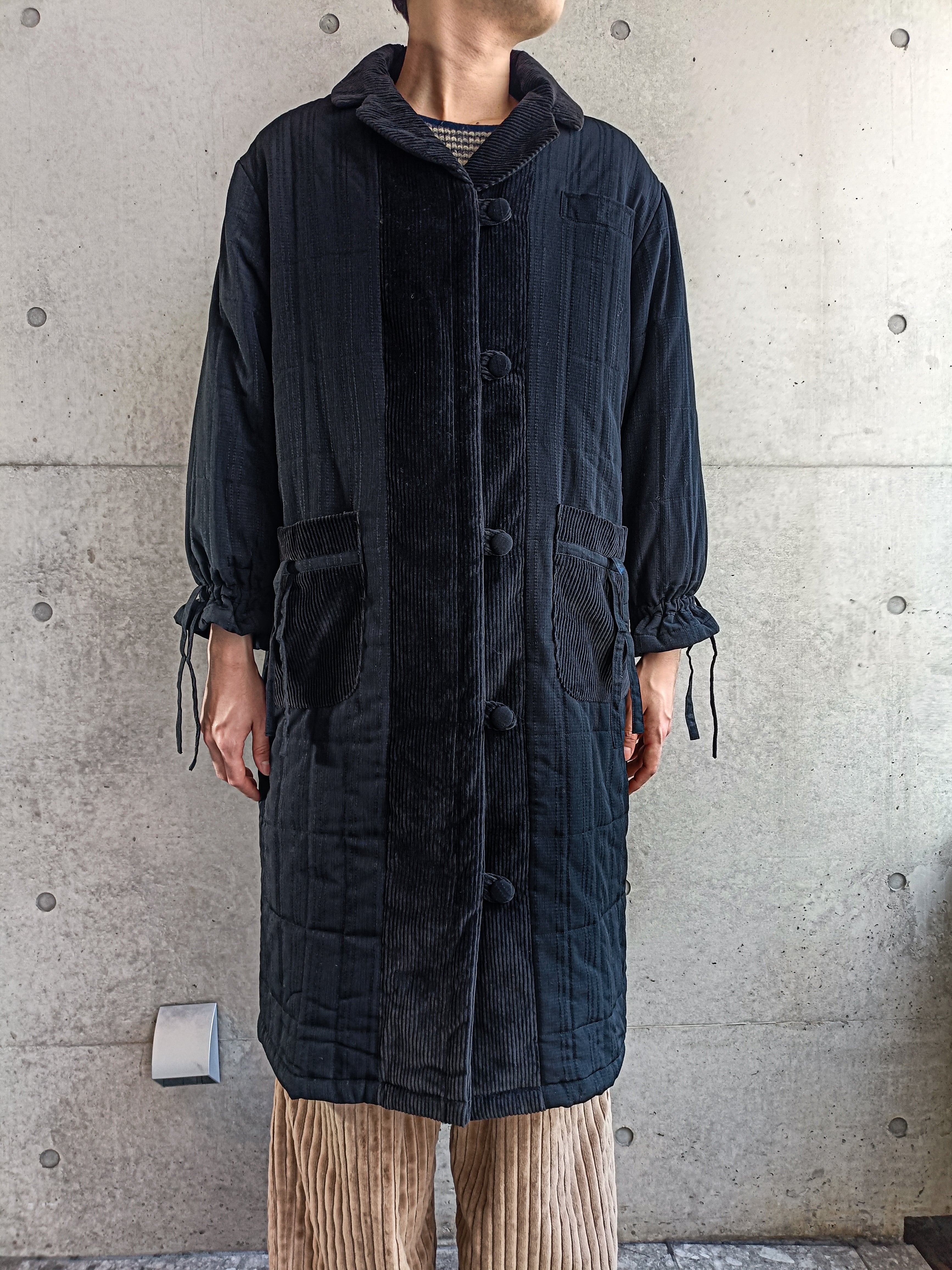 スペシャルなコートの入荷。ブラックのコーデュロイ切替コート。ダブル仕様です。袖、ポケットなどに紐が付いた見たことないデザインのコートです。シルエットも完璧。オールブラックでデザイン効いた希少な一着。中綿入り。