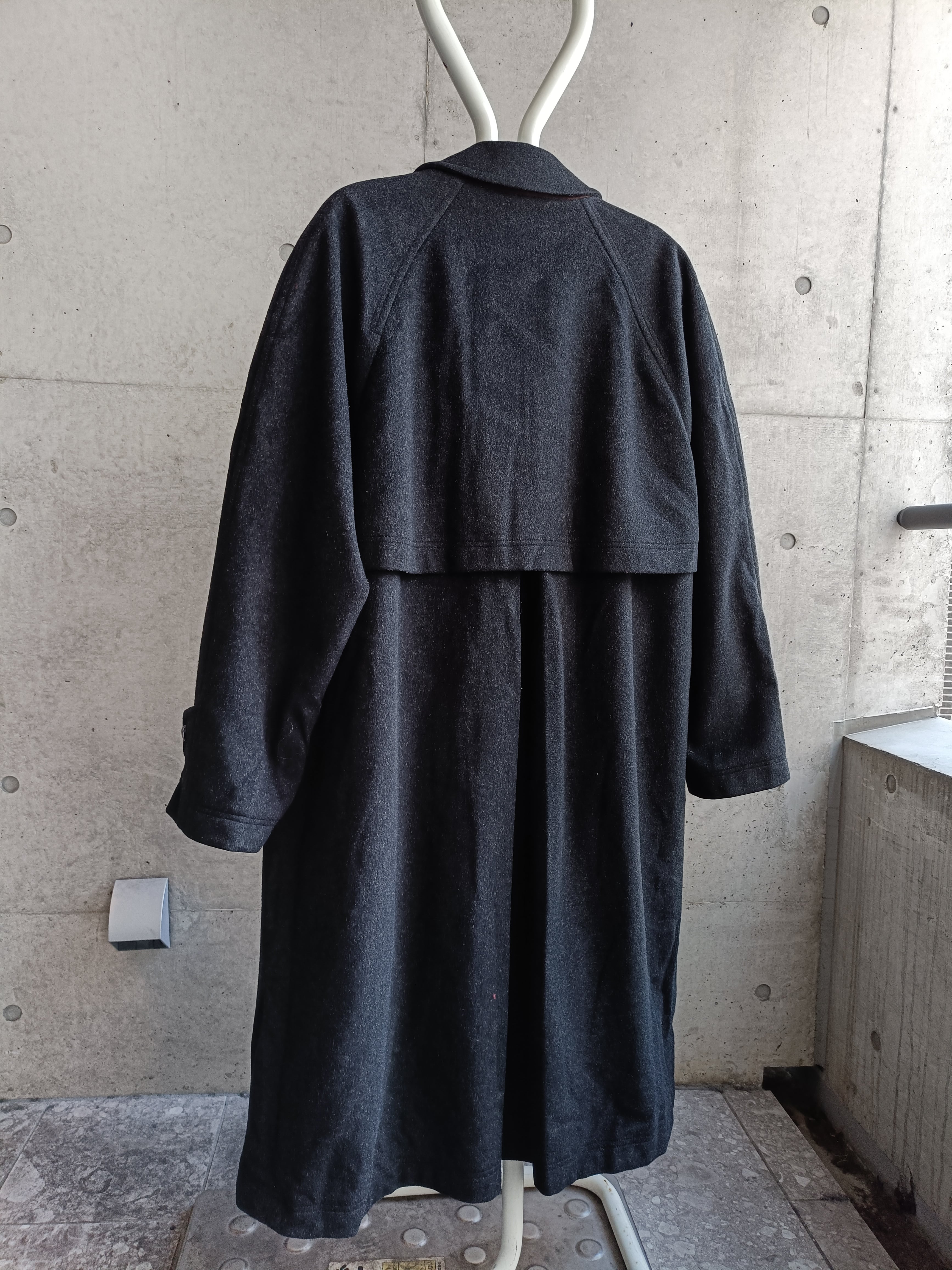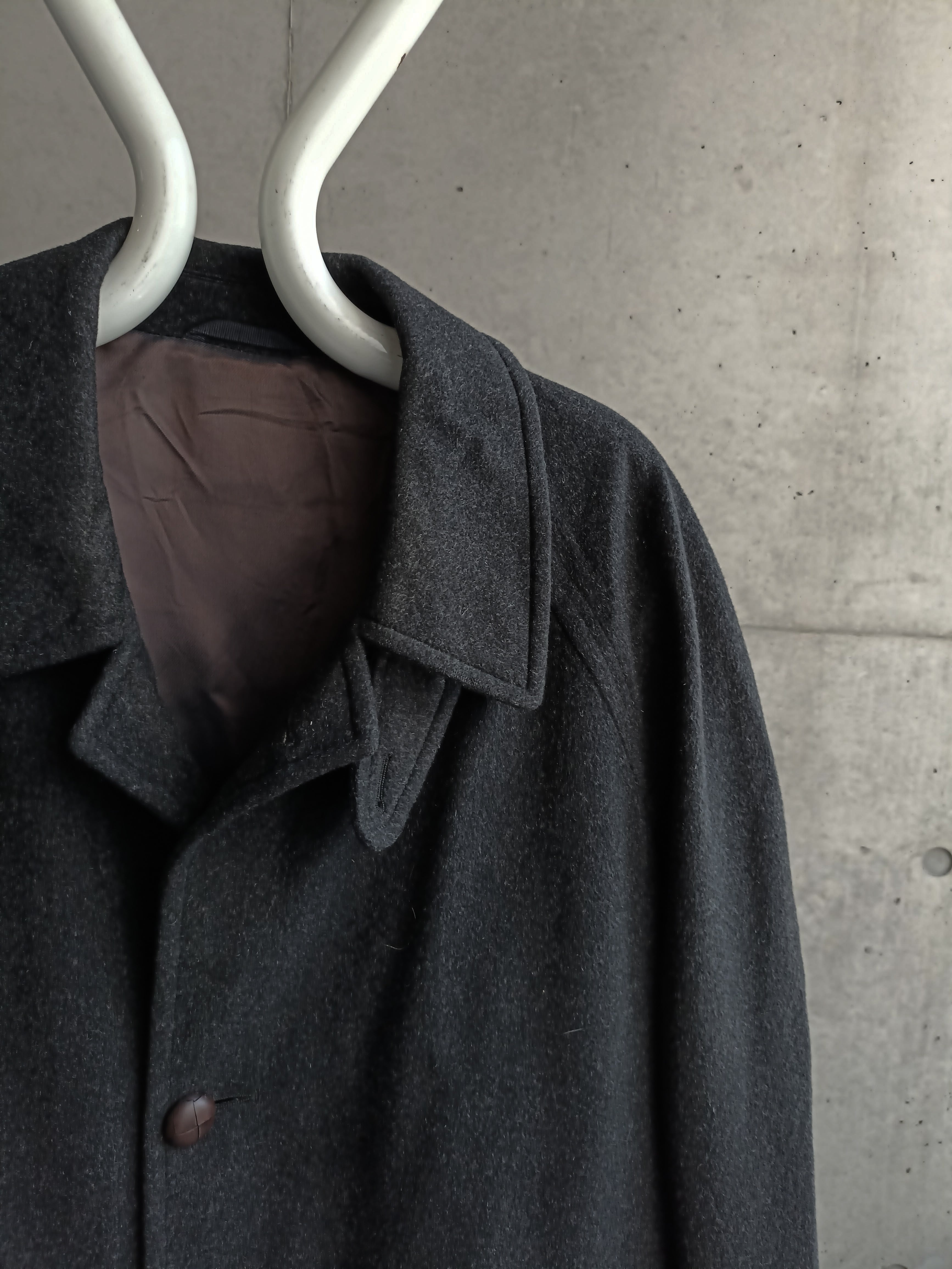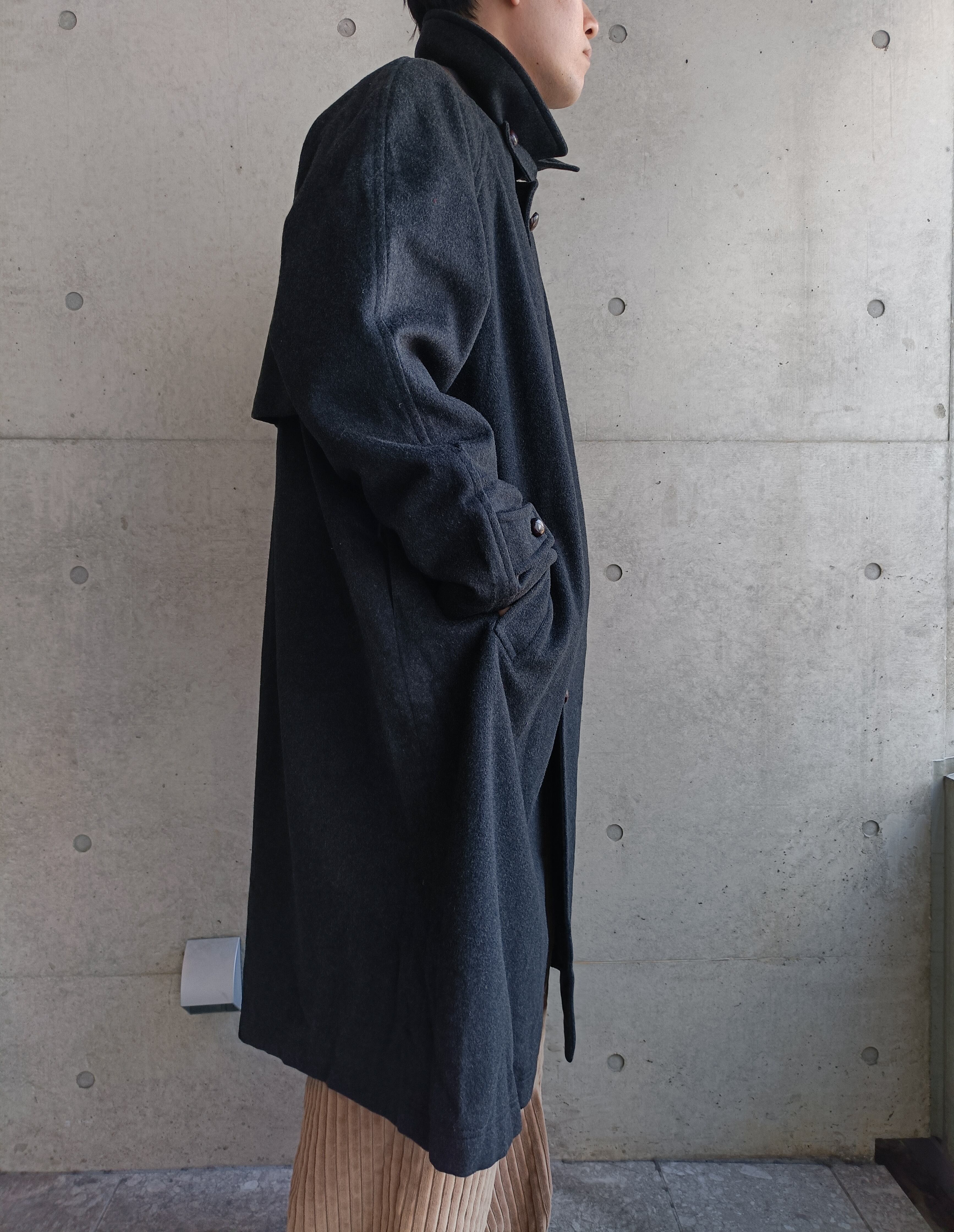 イタリア製のウールコート。過去最高峰に綺麗なシルエットのチャコールグレーのコート。ラグランでルーズシルエット。背面のヨークも抜群なディテール。チンスト付きで、襟立てても凄くカッコイイコートです。