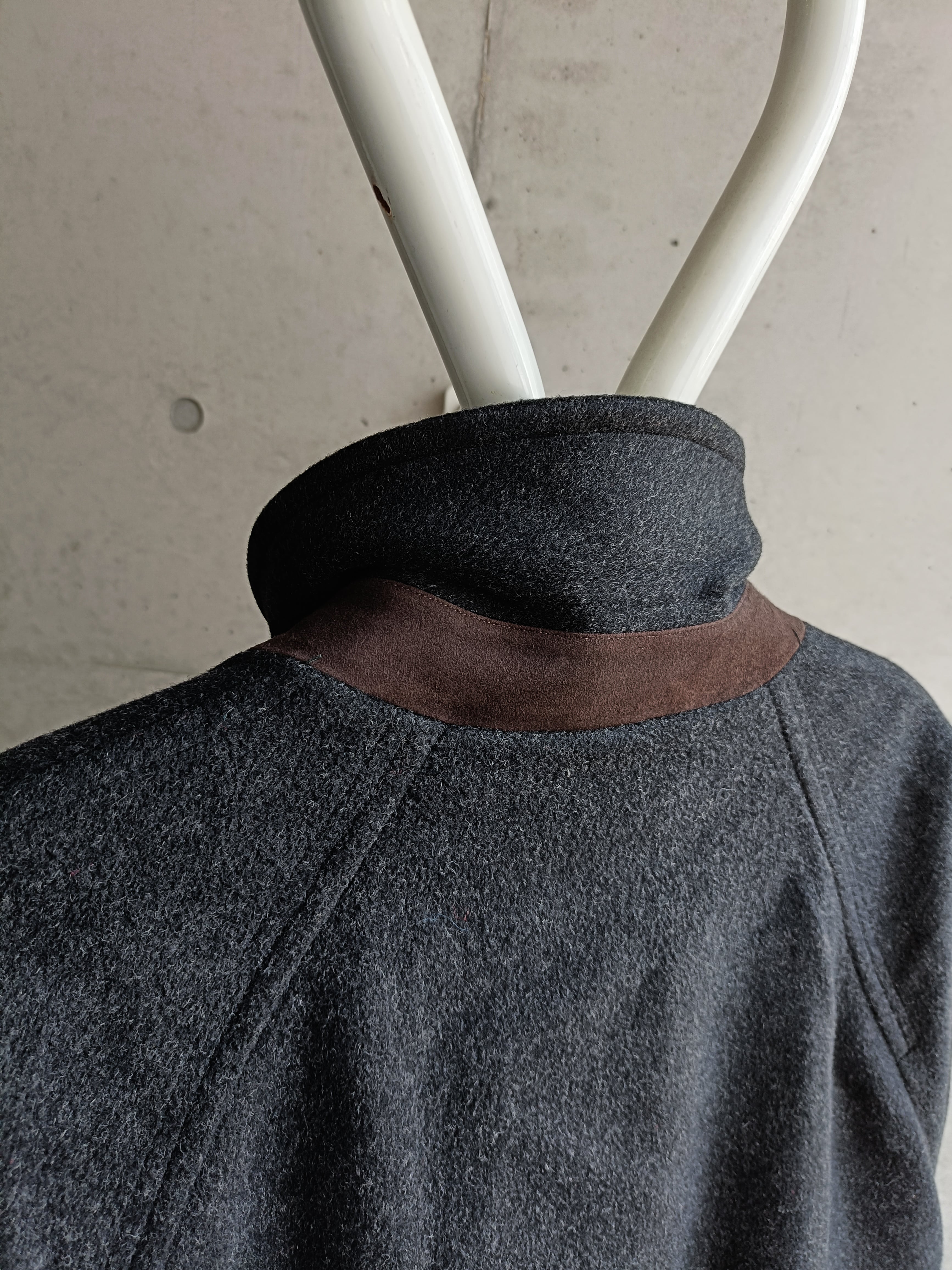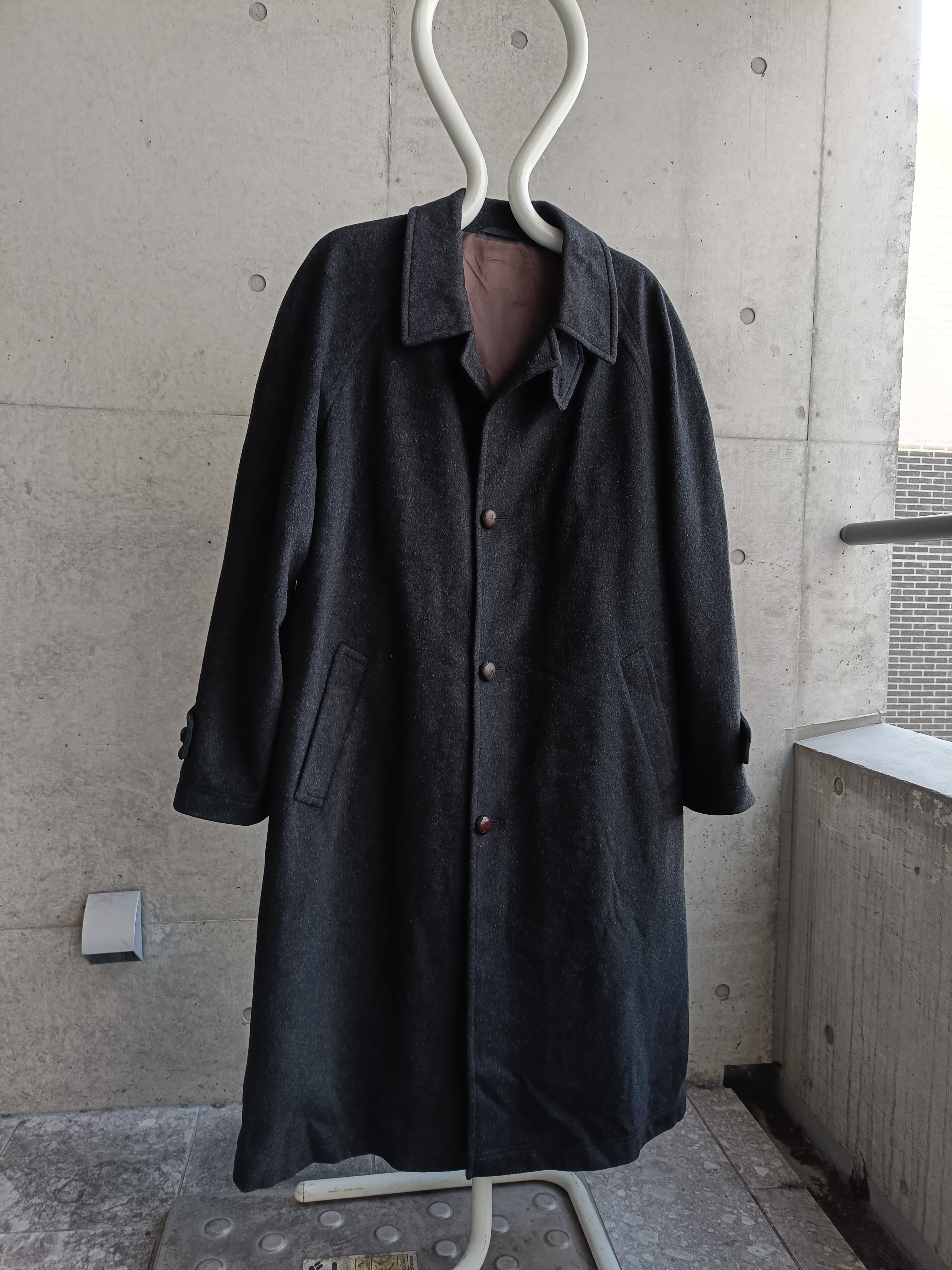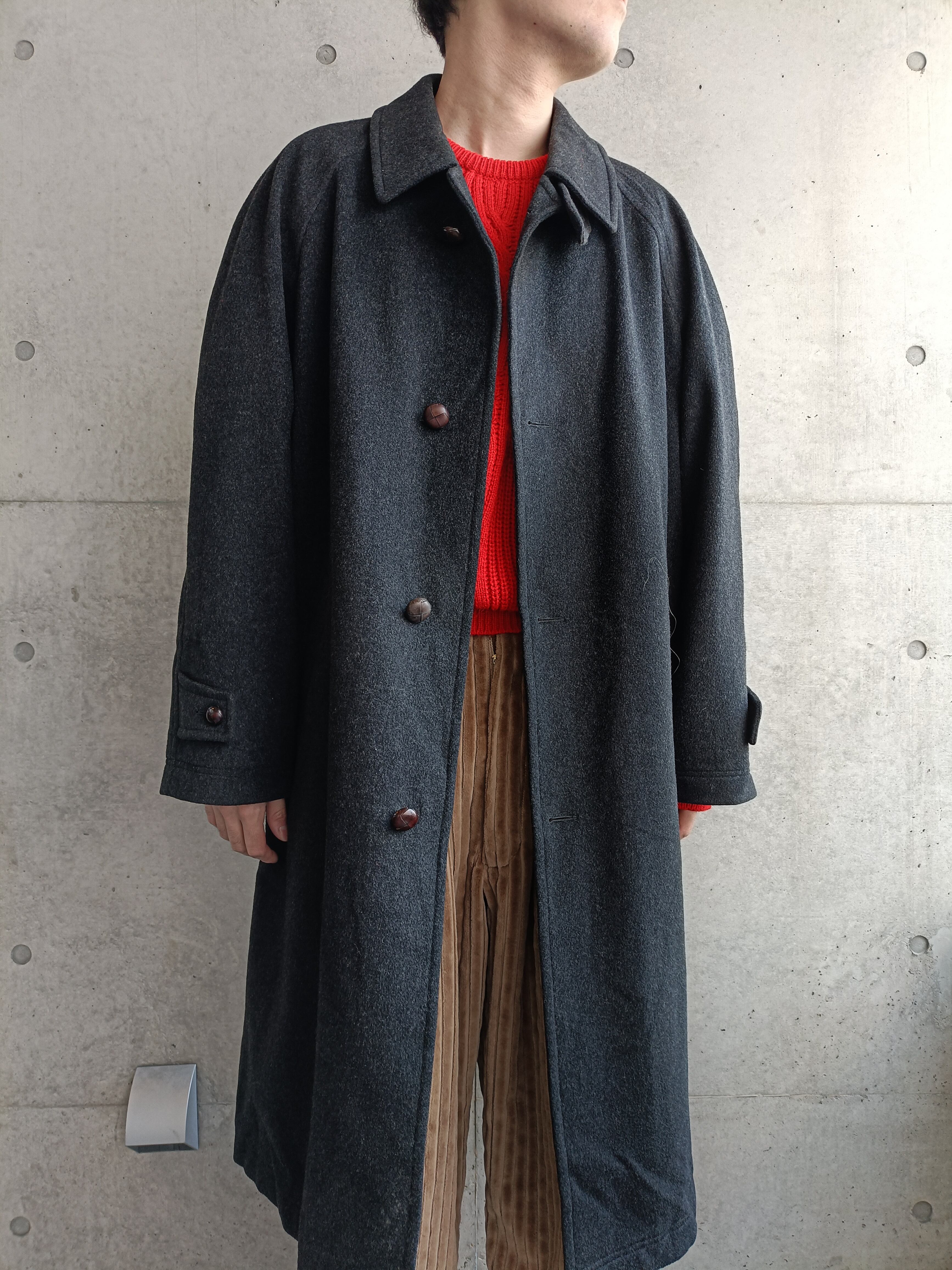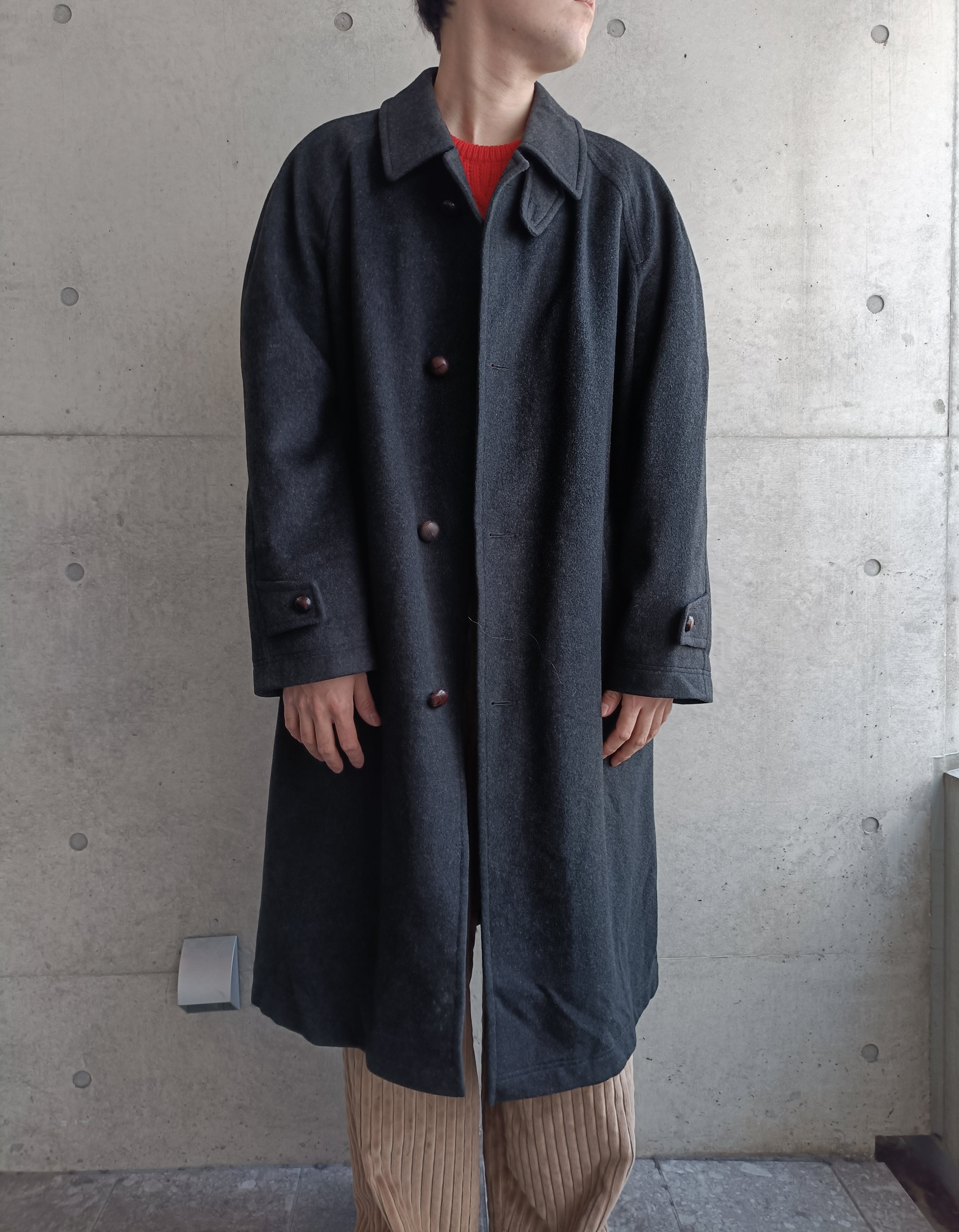 イタリア製のウールコート。過去最高峰に綺麗なシルエットのチャコールグレーのコート。ラグランでルーズシルエット。背面のヨークも抜群なディテール。チンスト付きで、襟立てても凄くカッコイイコートです。