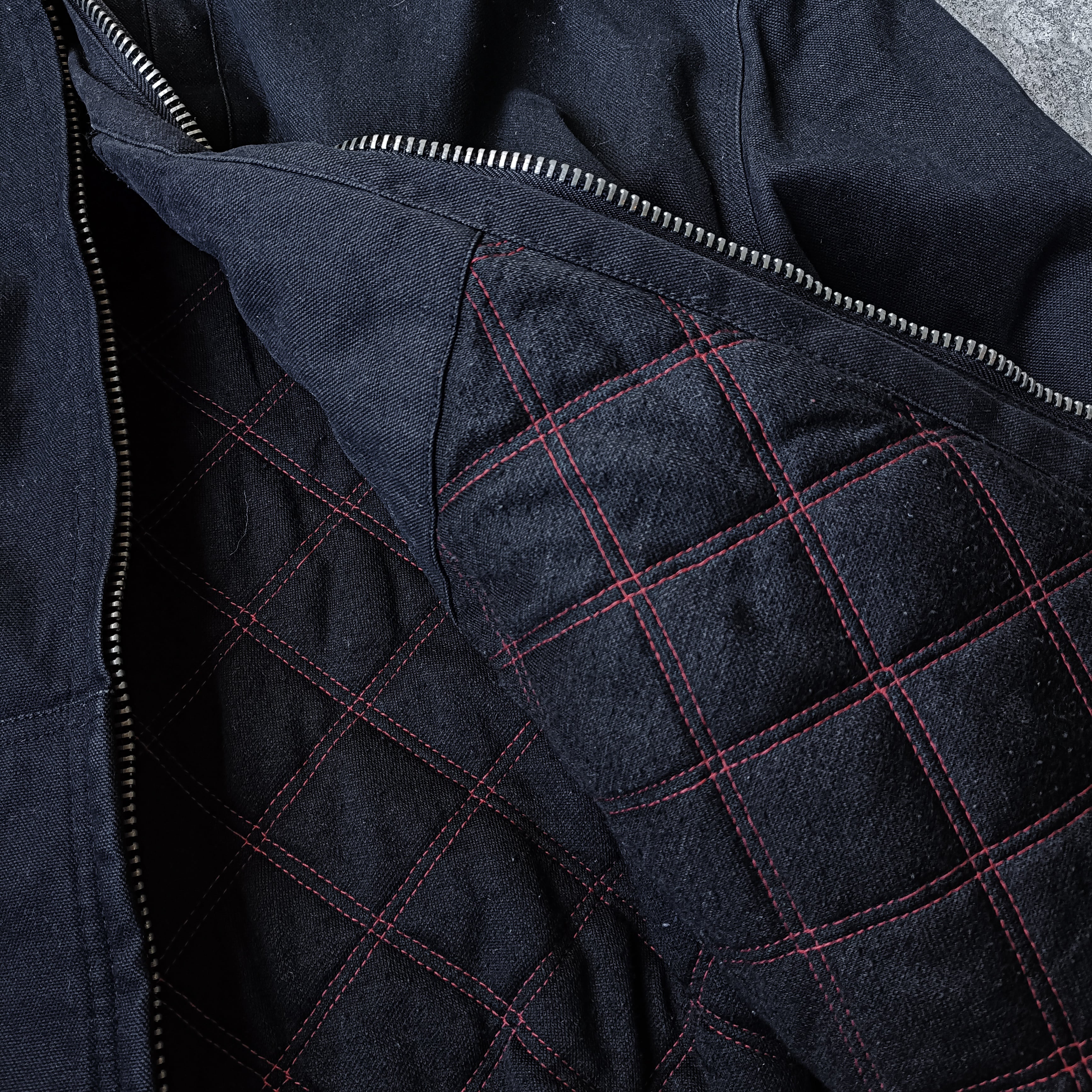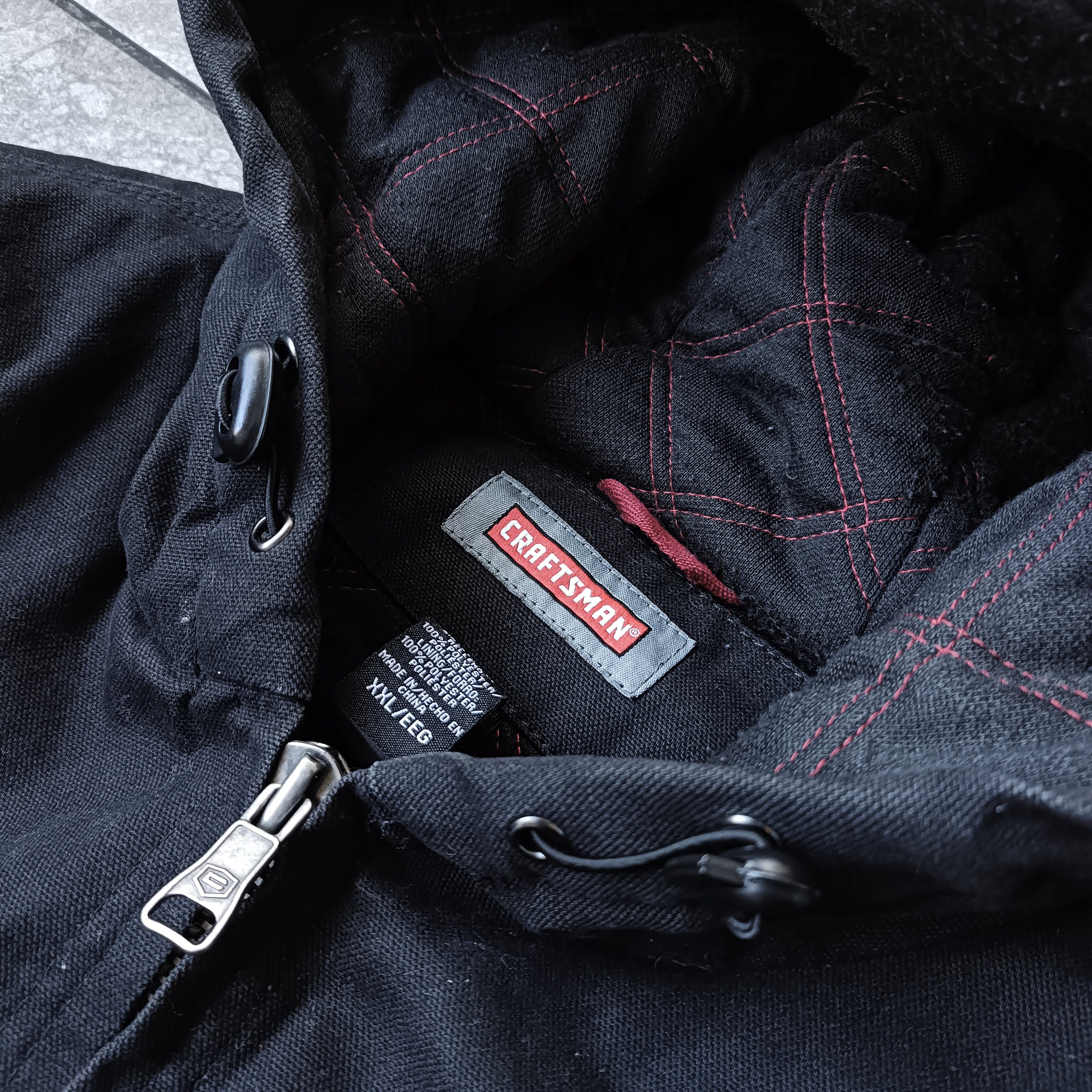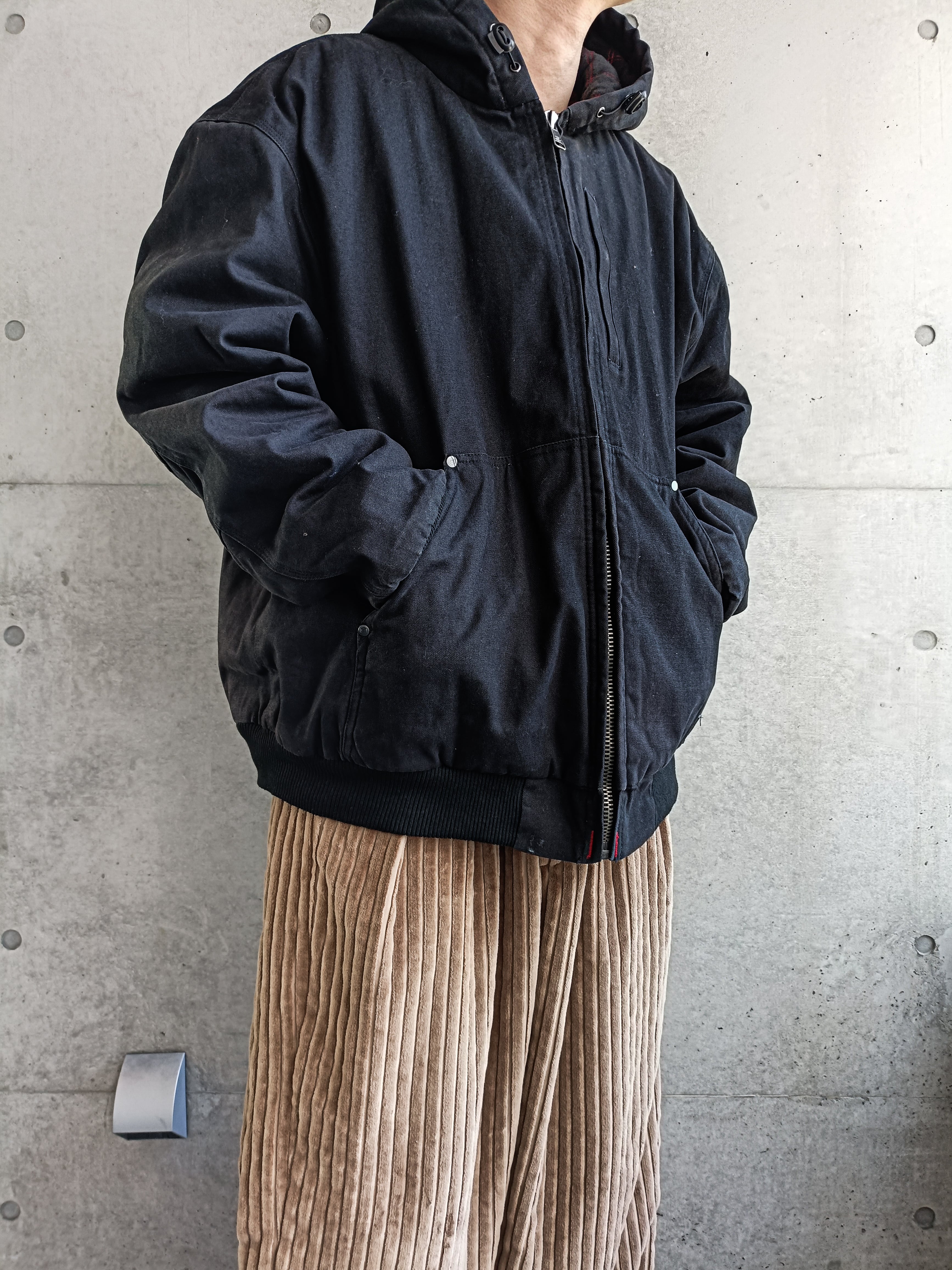 ブラックのダック生地のフーデッドジャケット。珍しい完全無地タイプです。だいたい胸にロゴなどが入ってます。ビッグシルエット。ポケットにシルバーのリベット付きでいいアクセント。フード裏地の赤ステッチも最高です。