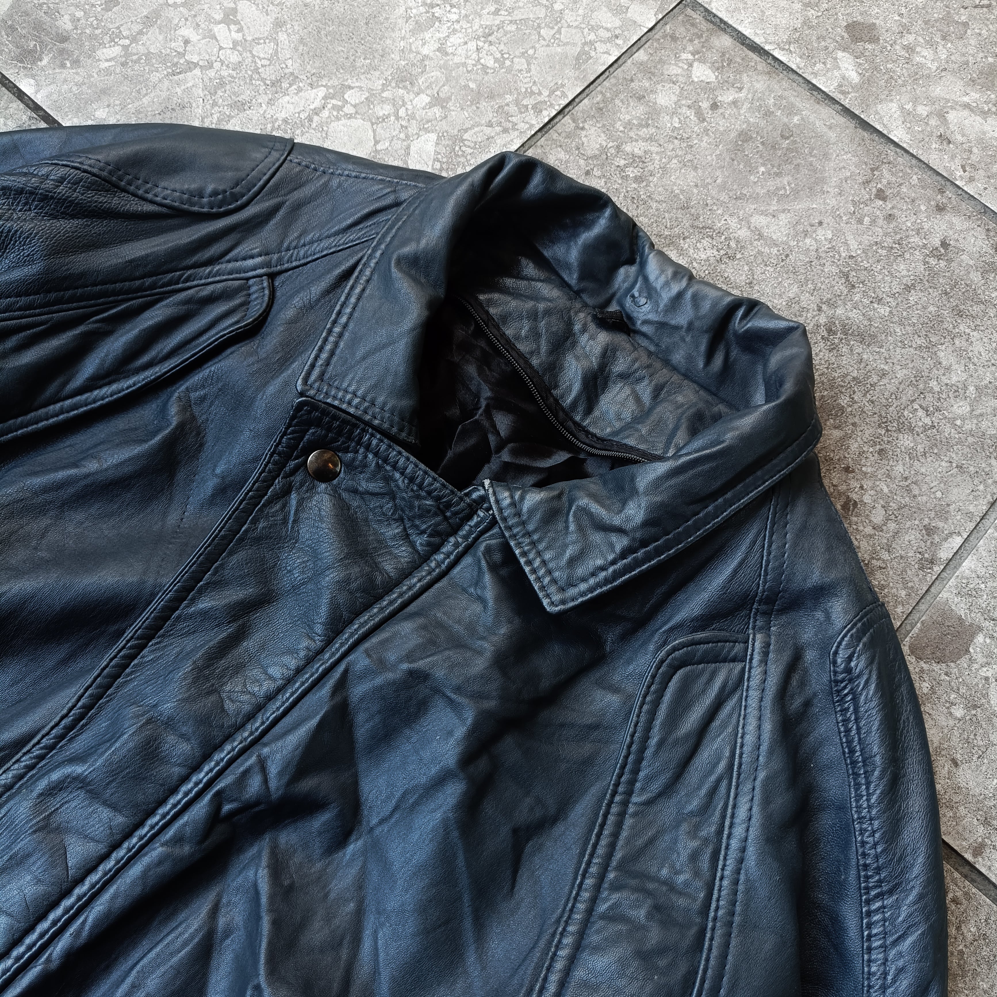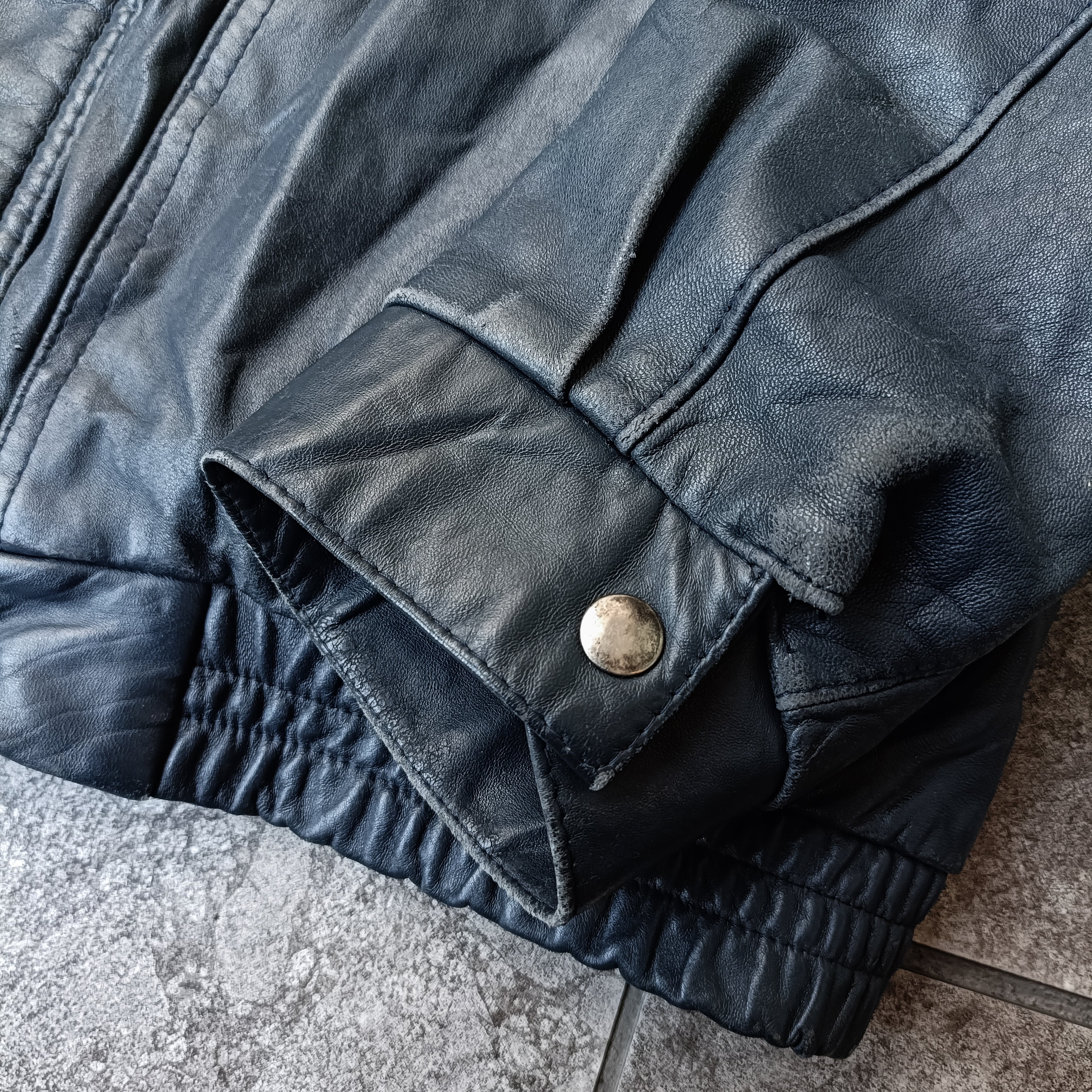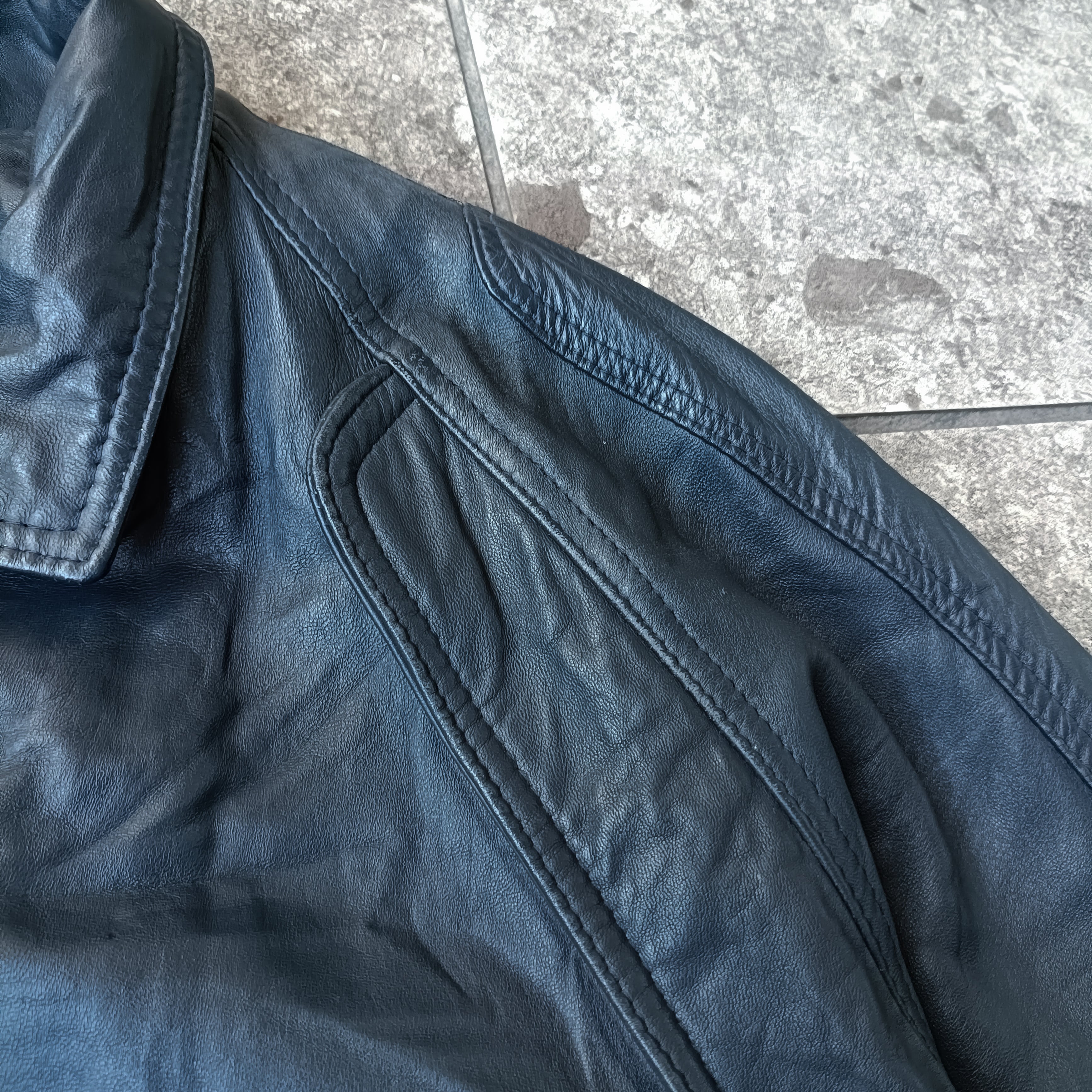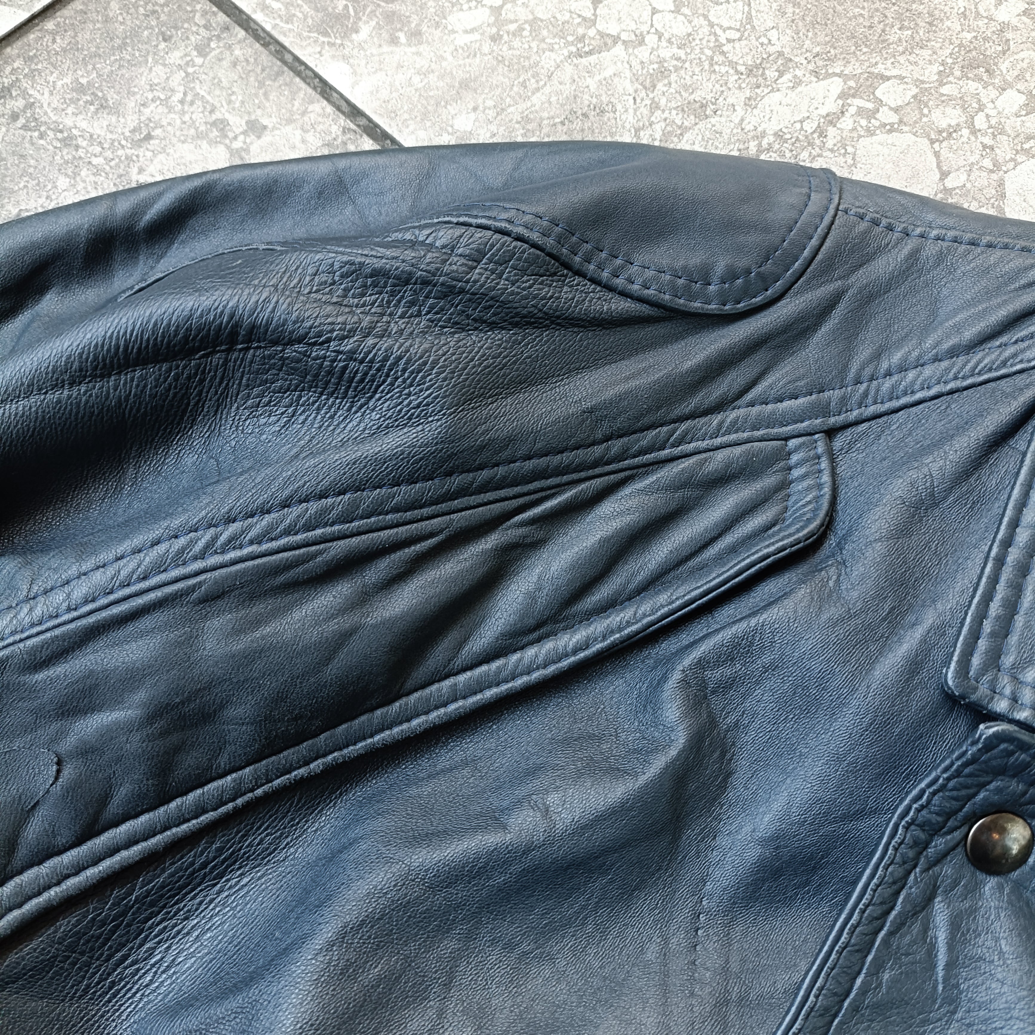 レアカラーなネイビーのレザーブルゾンの入荷です。黒よりファッション感でてオススメなネイビーレザー。街中で着てる人も殆ど見ないと思います。ラグランで、フラップのような切替になったデザイン。裾リブ効いてて好きな丈感で着用可能です。