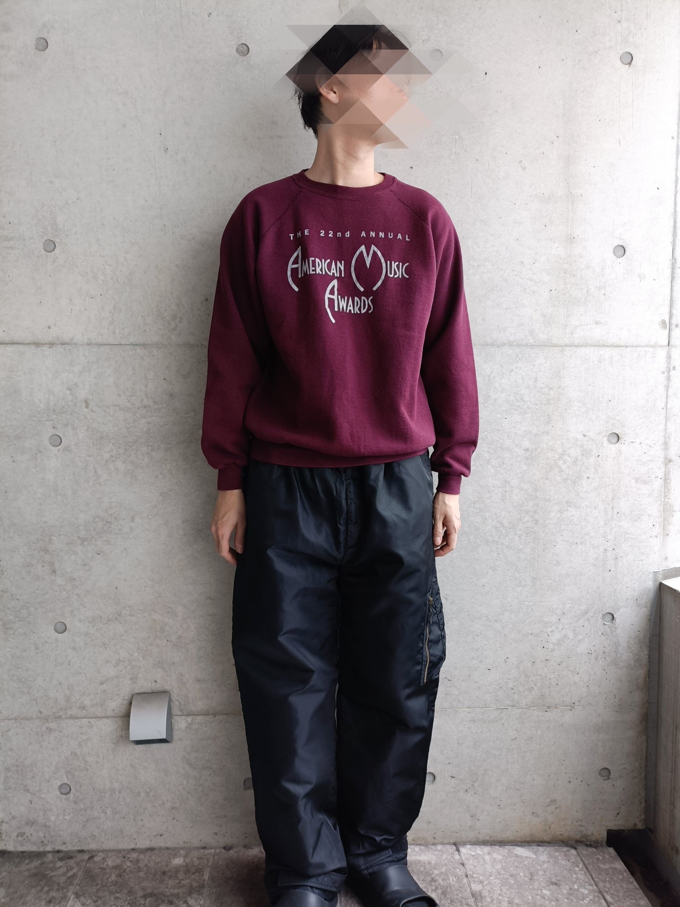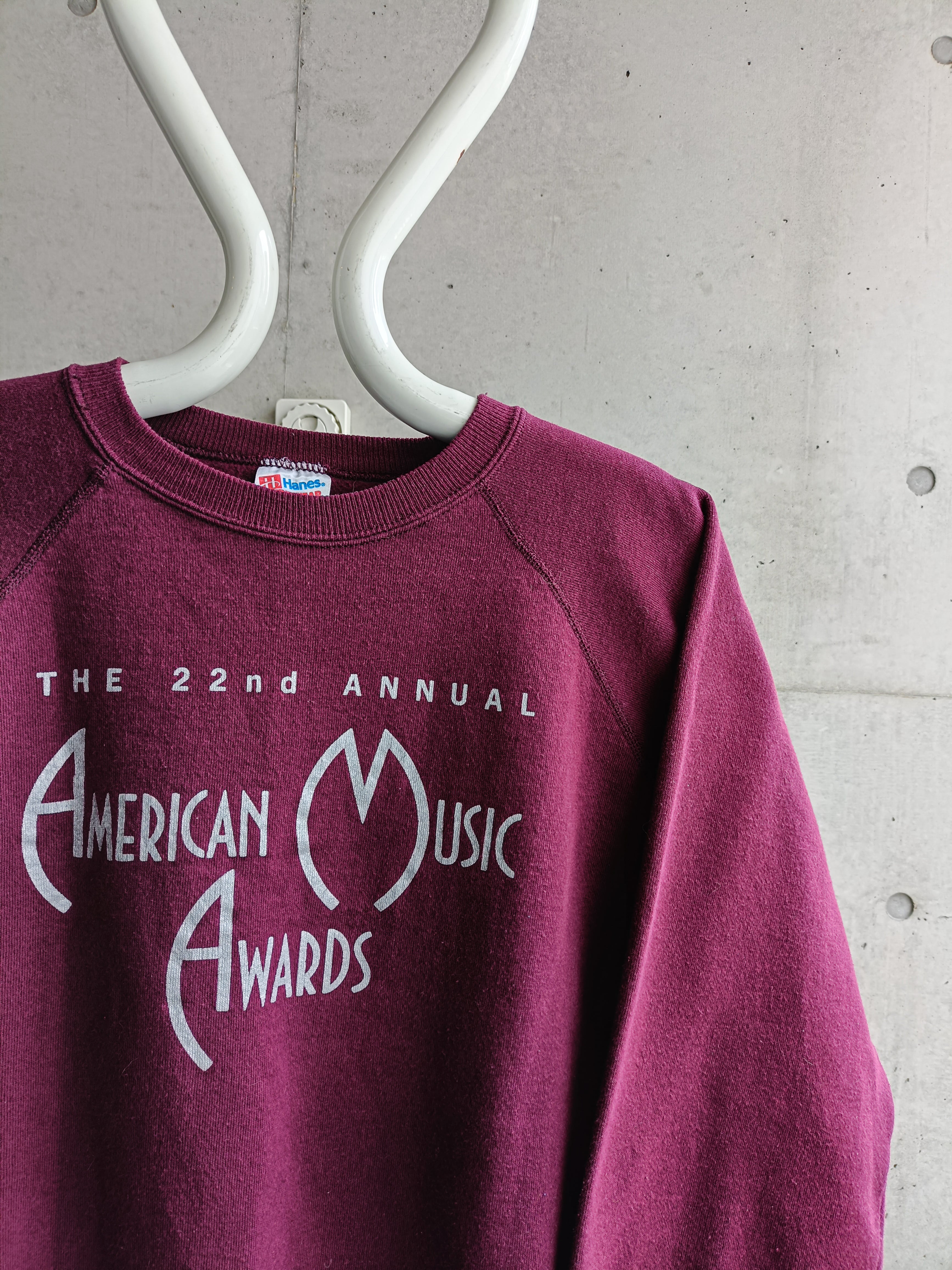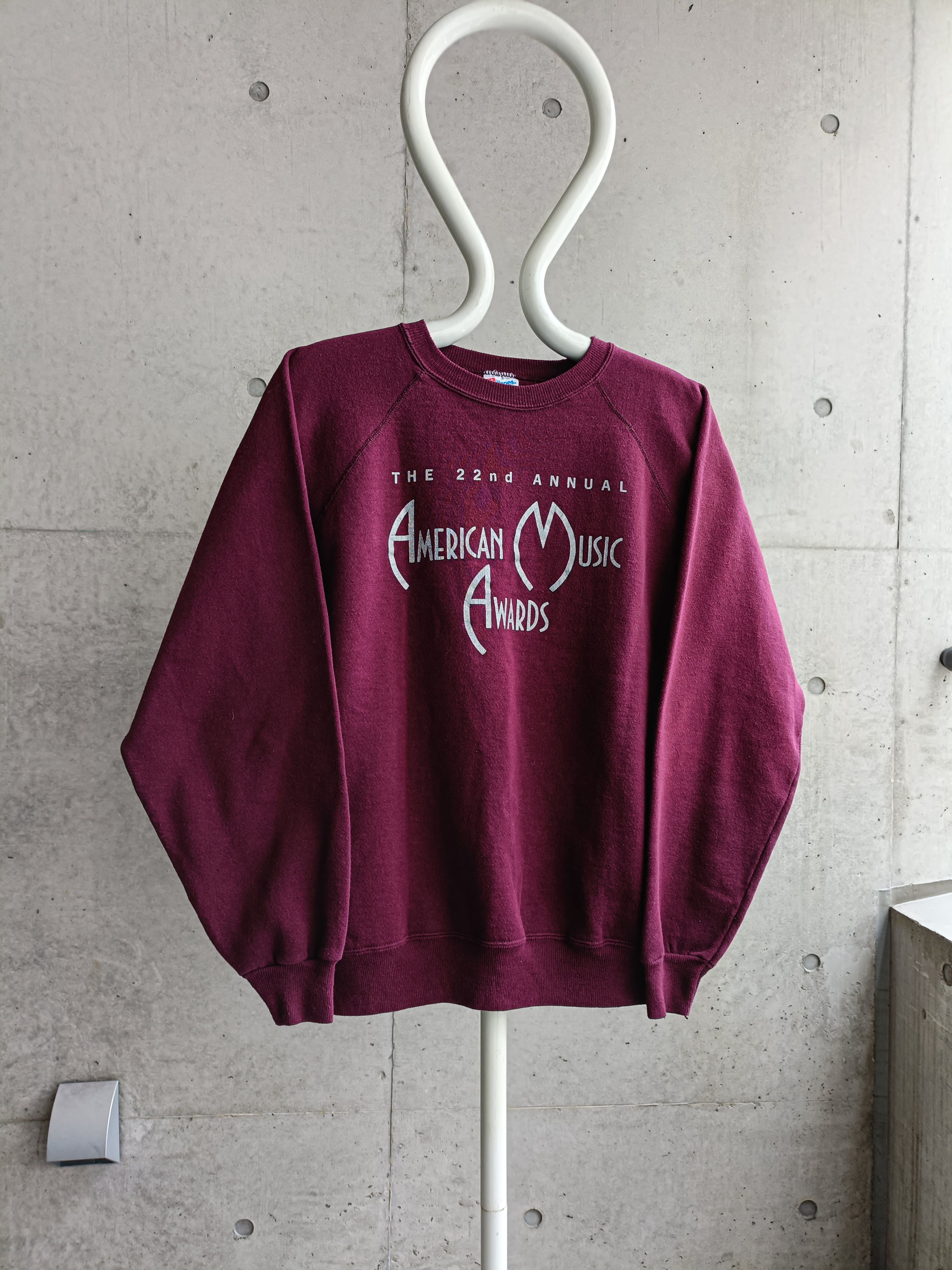 AMERICAN MUSIC AWARDのスウェット。アメリカの3大音楽授賞式に数えられる音楽賞の一つ。ワイン色にシルバーのロゴがイケてます。黒系のコートのインナーなどにもオススメなカラーのスウェットです。