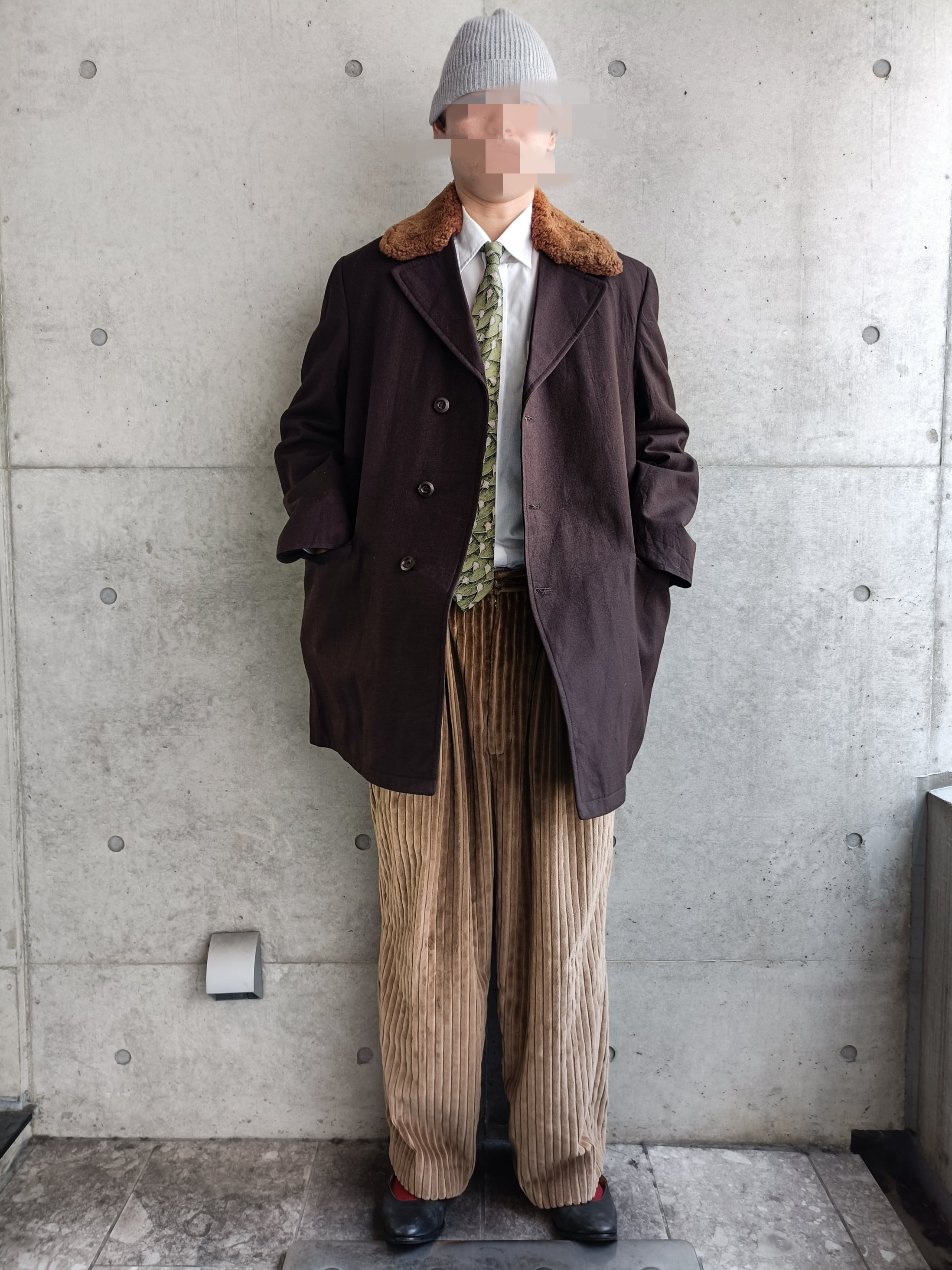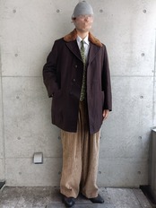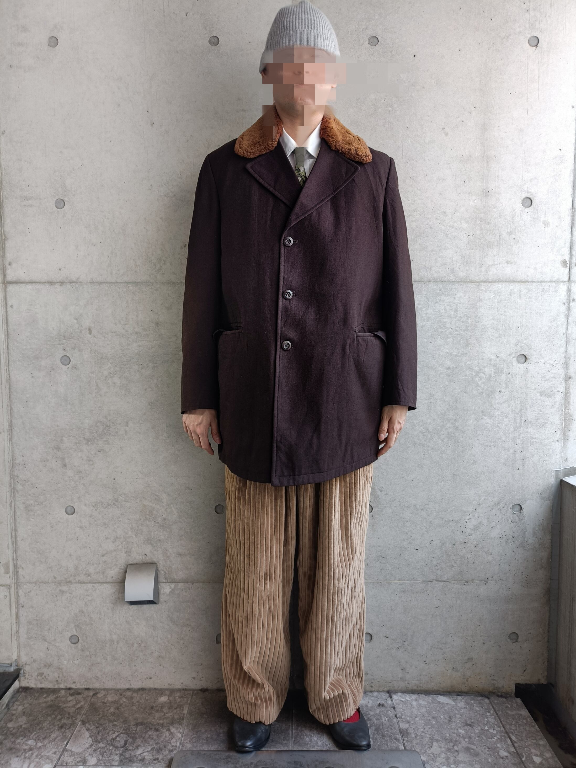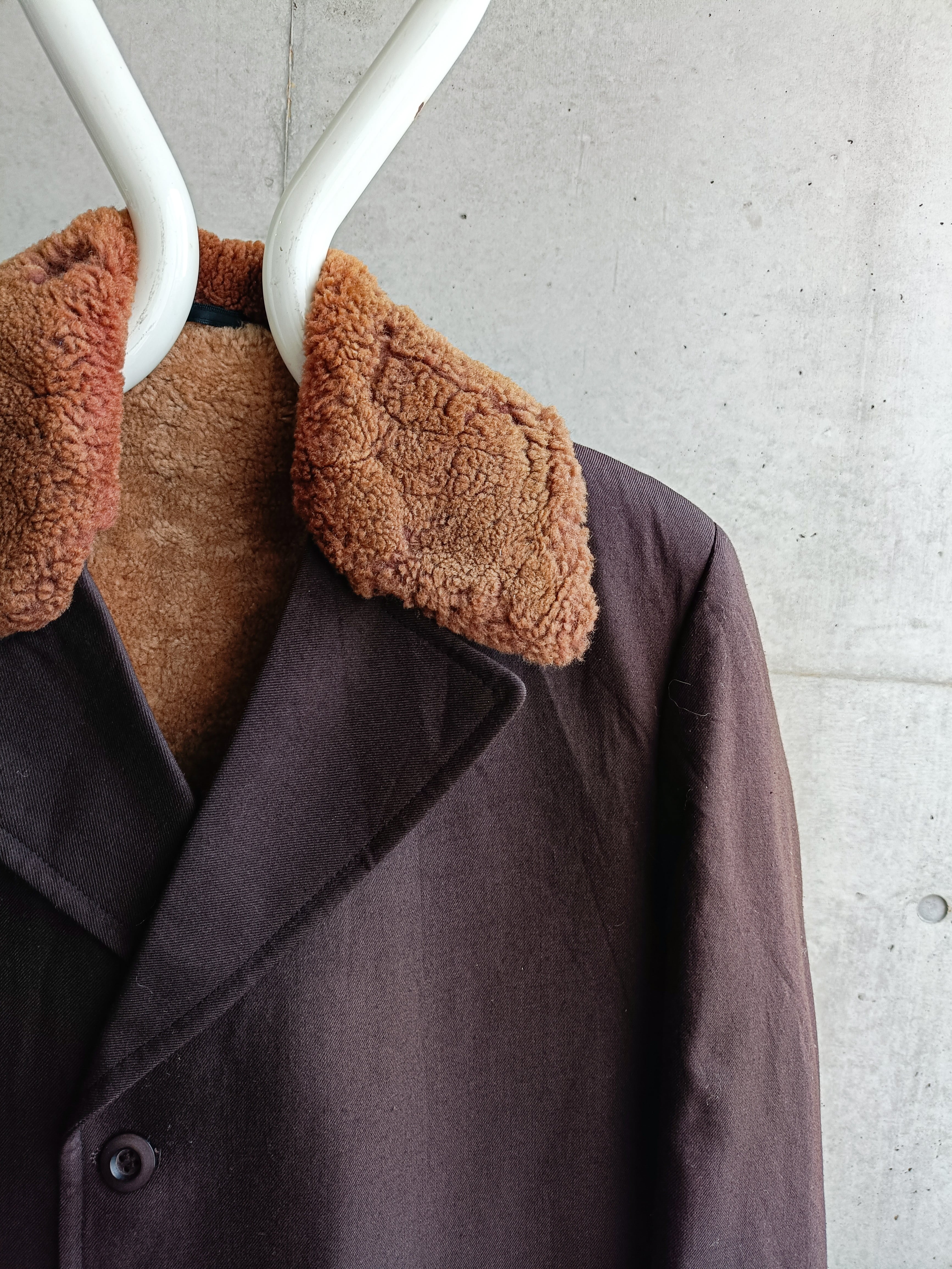 60s頃のウールサージコート。襟が肉厚ボア。襟のボアが発色よいブランドなのが珍しいです。ダブルほどじゃないですが、ボタン留めると少しフロントが交差する形。着ると凄く立体的なシルエット。ポケット裏地がヴィンテージのシャンブレー生地なのもそそられます。