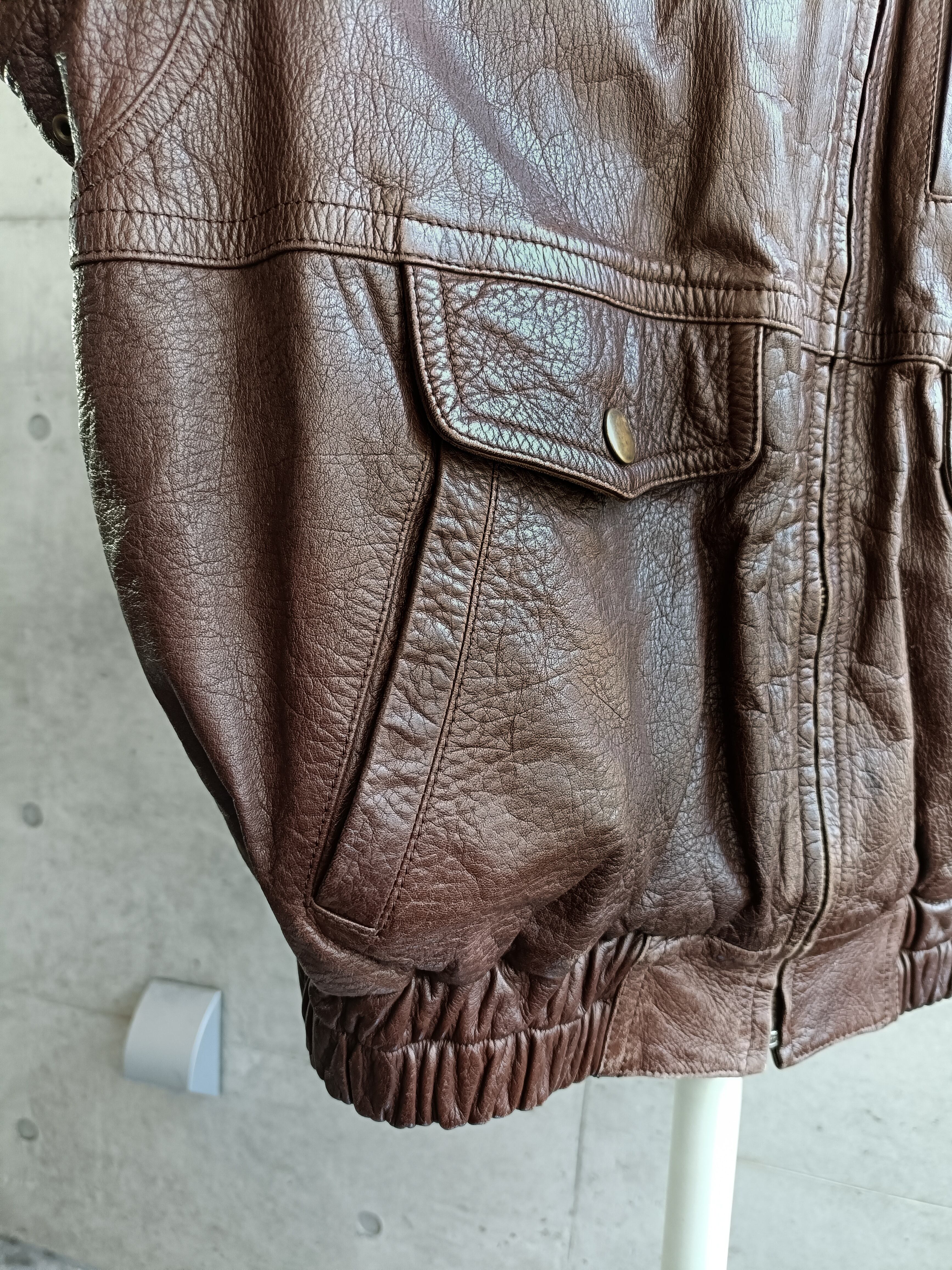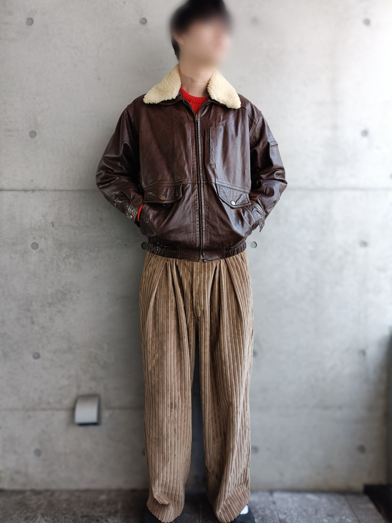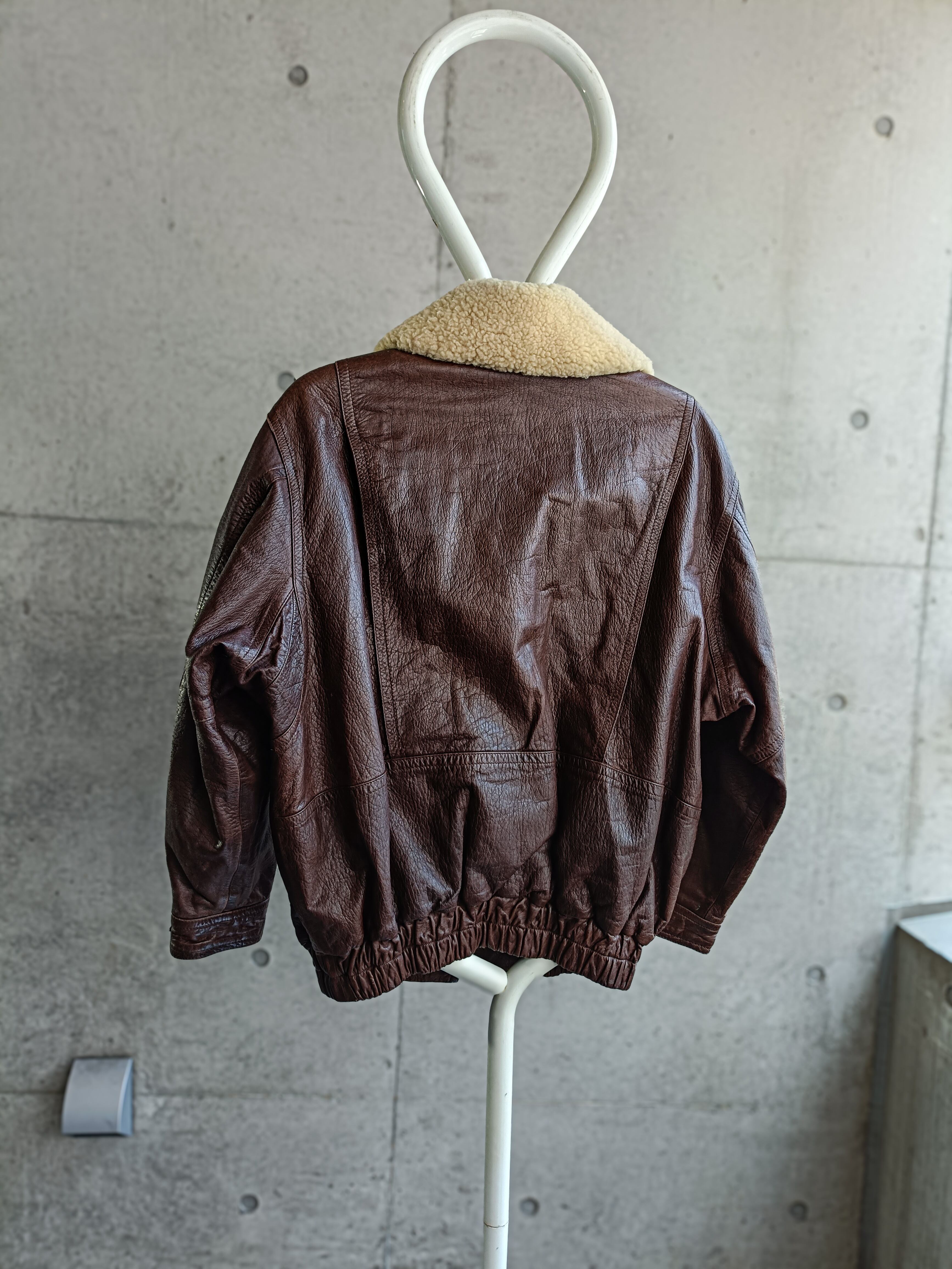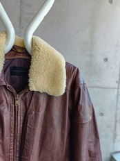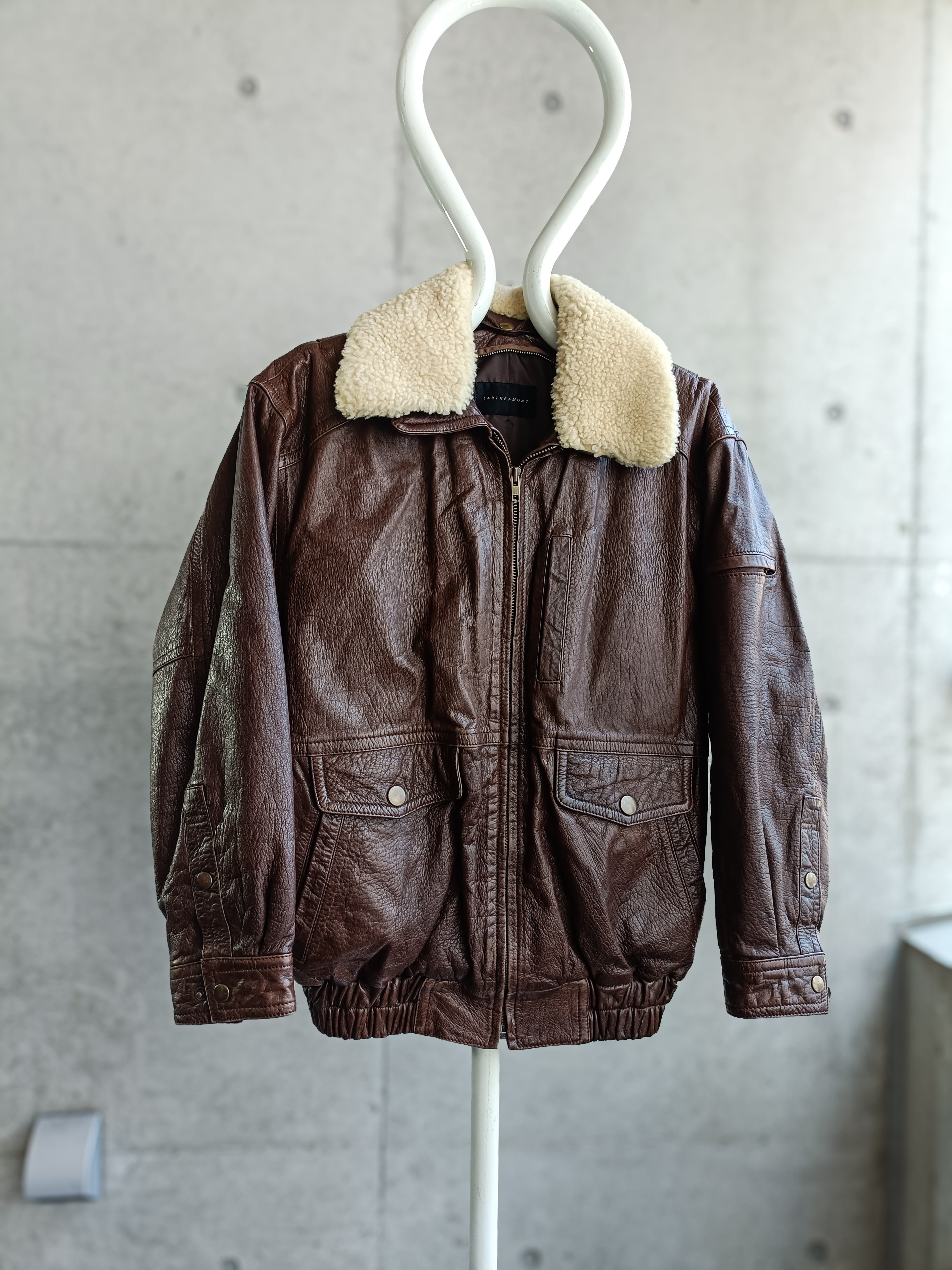 ブラウンのG-1レザーブルゾン。しっとりした質感のシボ革レザー。襟ボアは取り外し可能で普通の襟としても着用可能。Ma-1のように前たてにフラップが付いてるのが凄く好きなディテール。