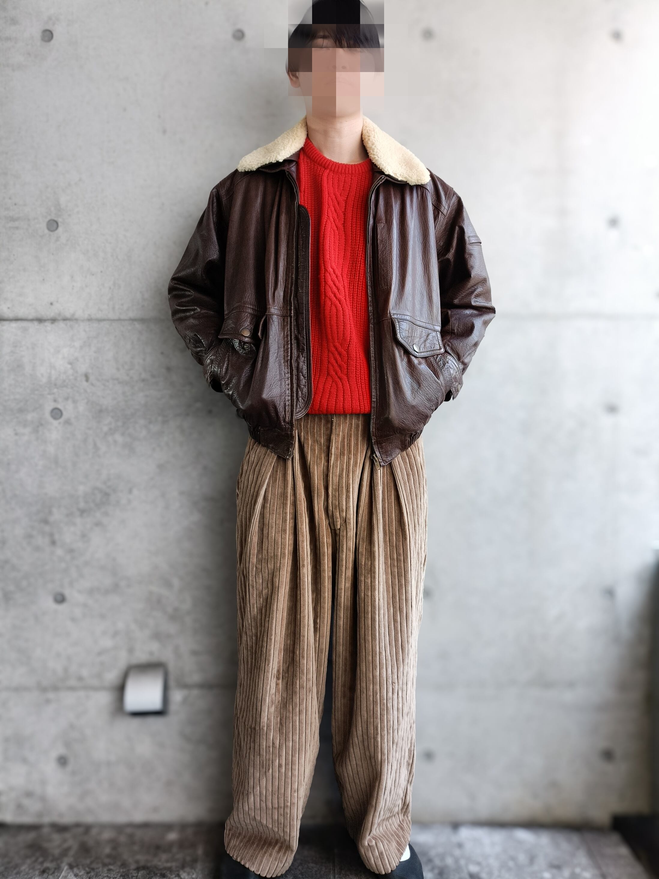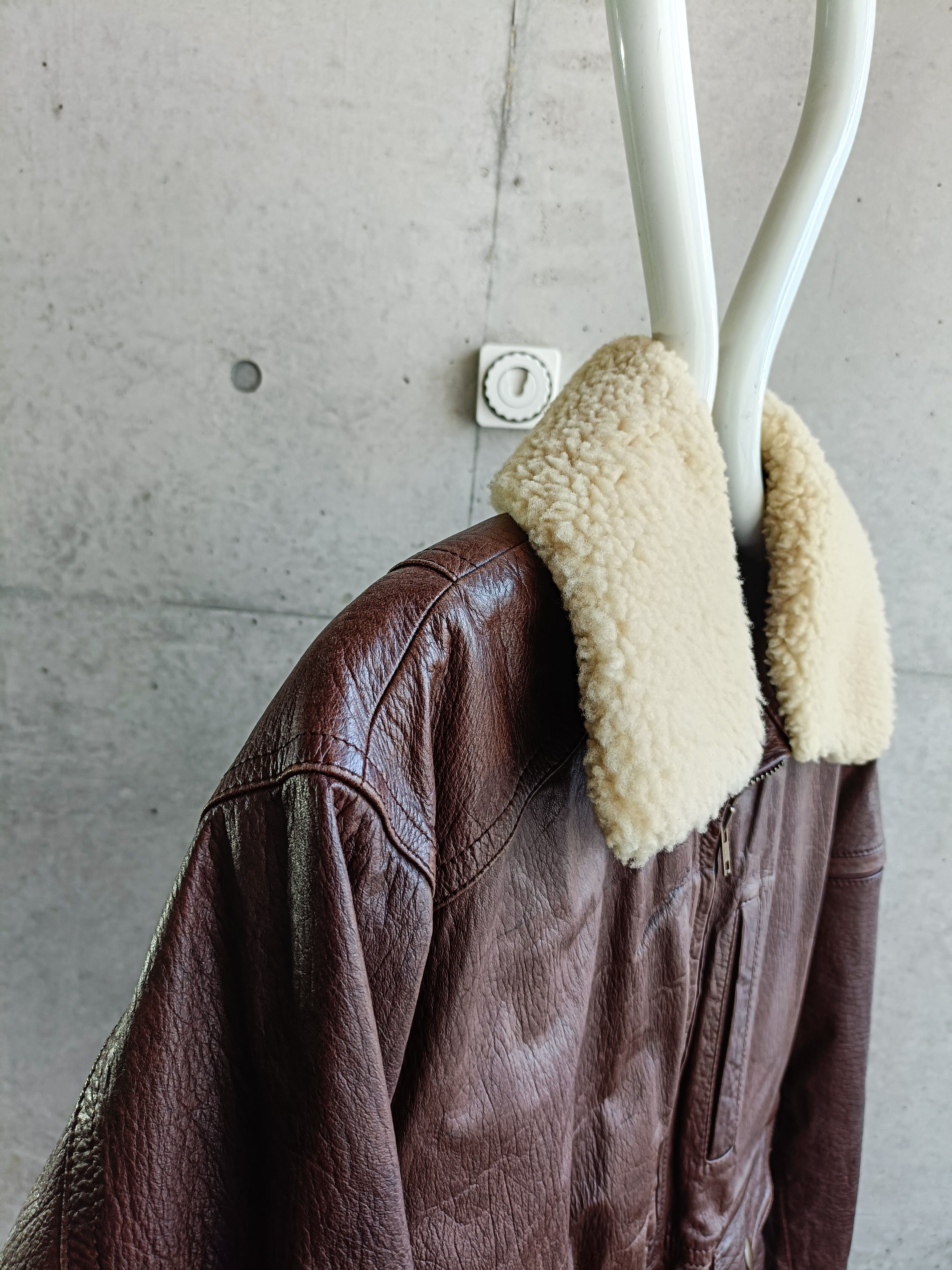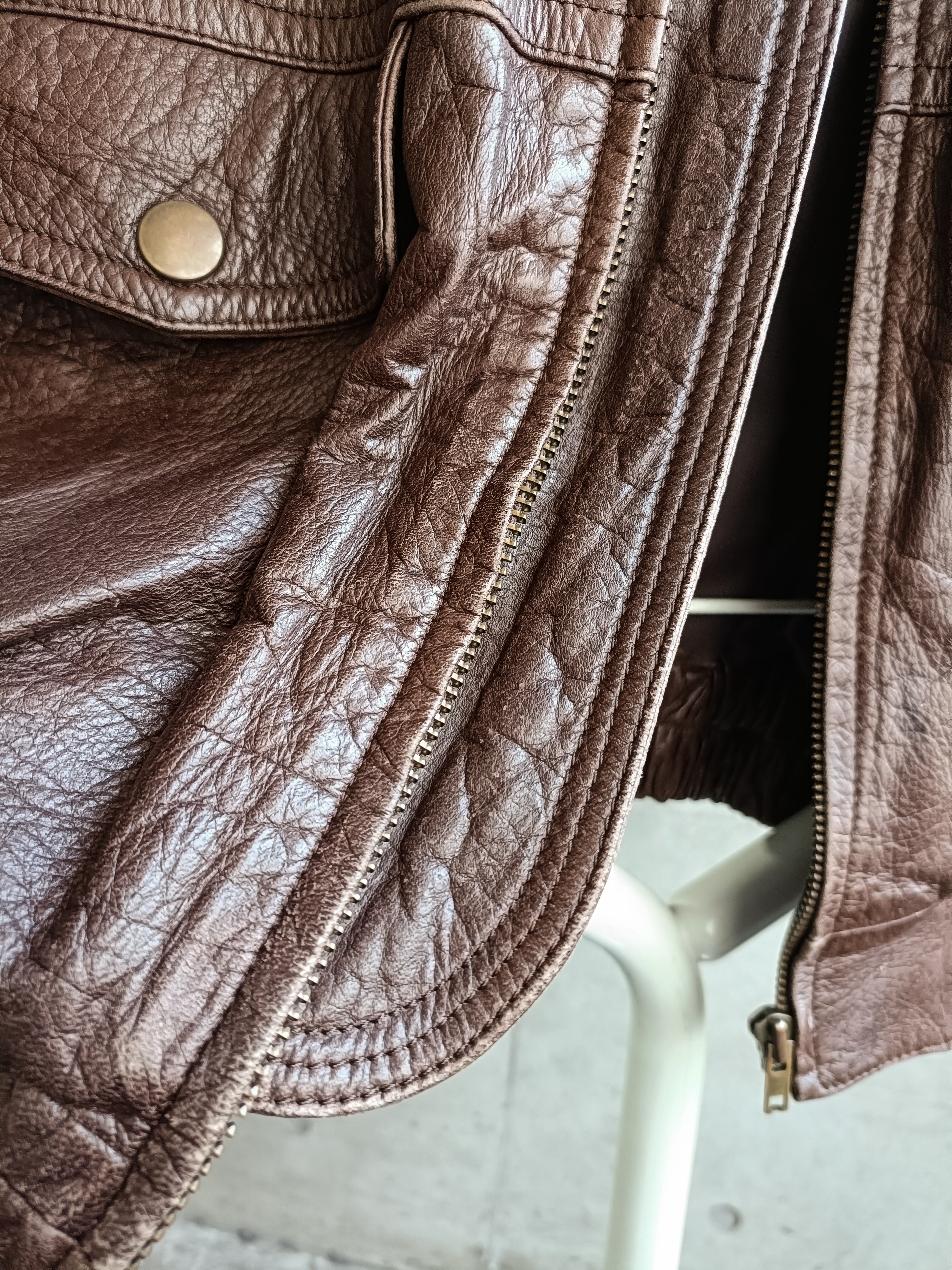 ブラウンのG-1レザーブルゾン。しっとりした質感のシボ革レザー。襟ボアは取り外し可能で普通の襟としても着用可能。Ma-1のように前たてにフラップが付いてるのが凄く好きなディテール。