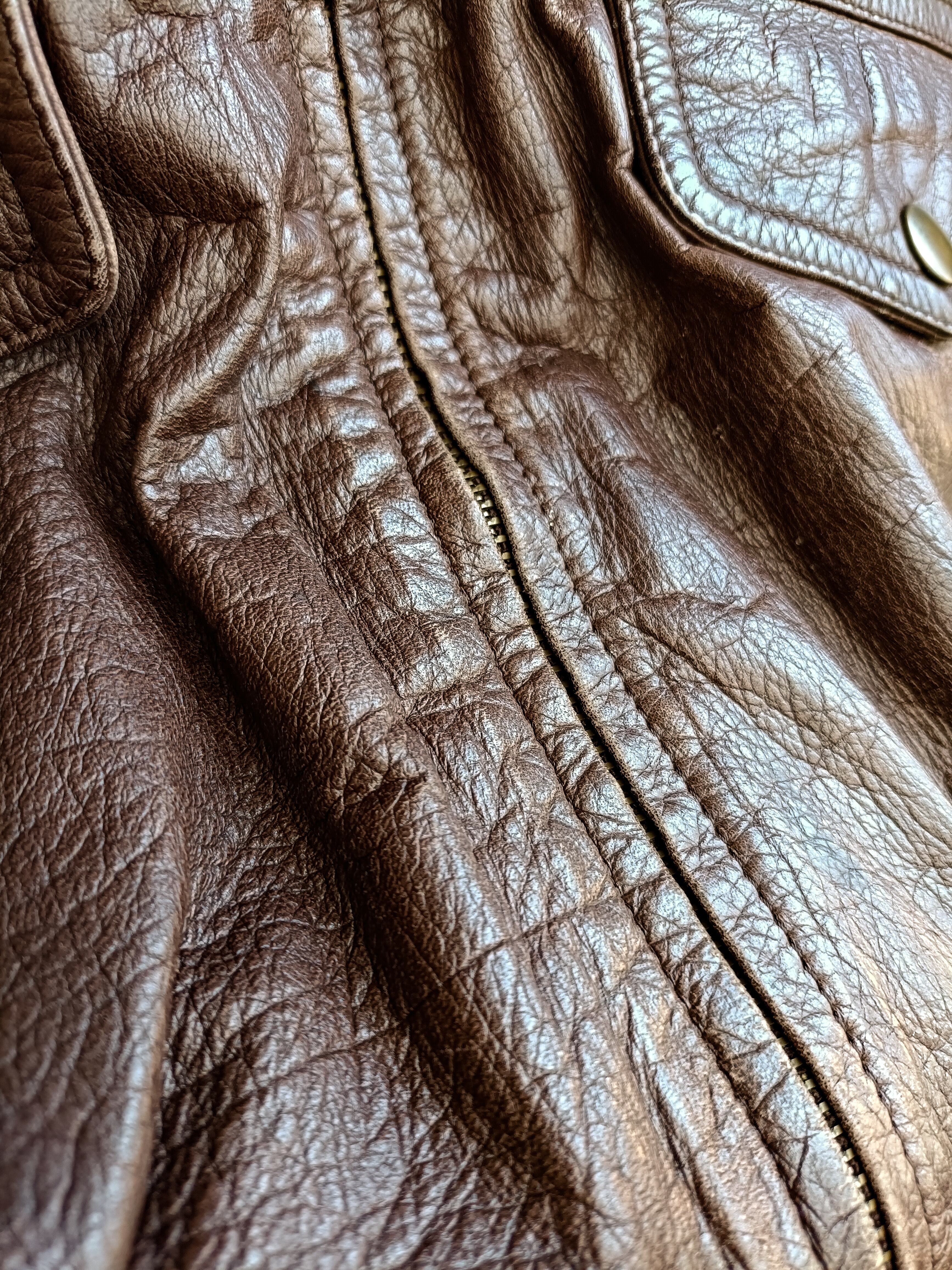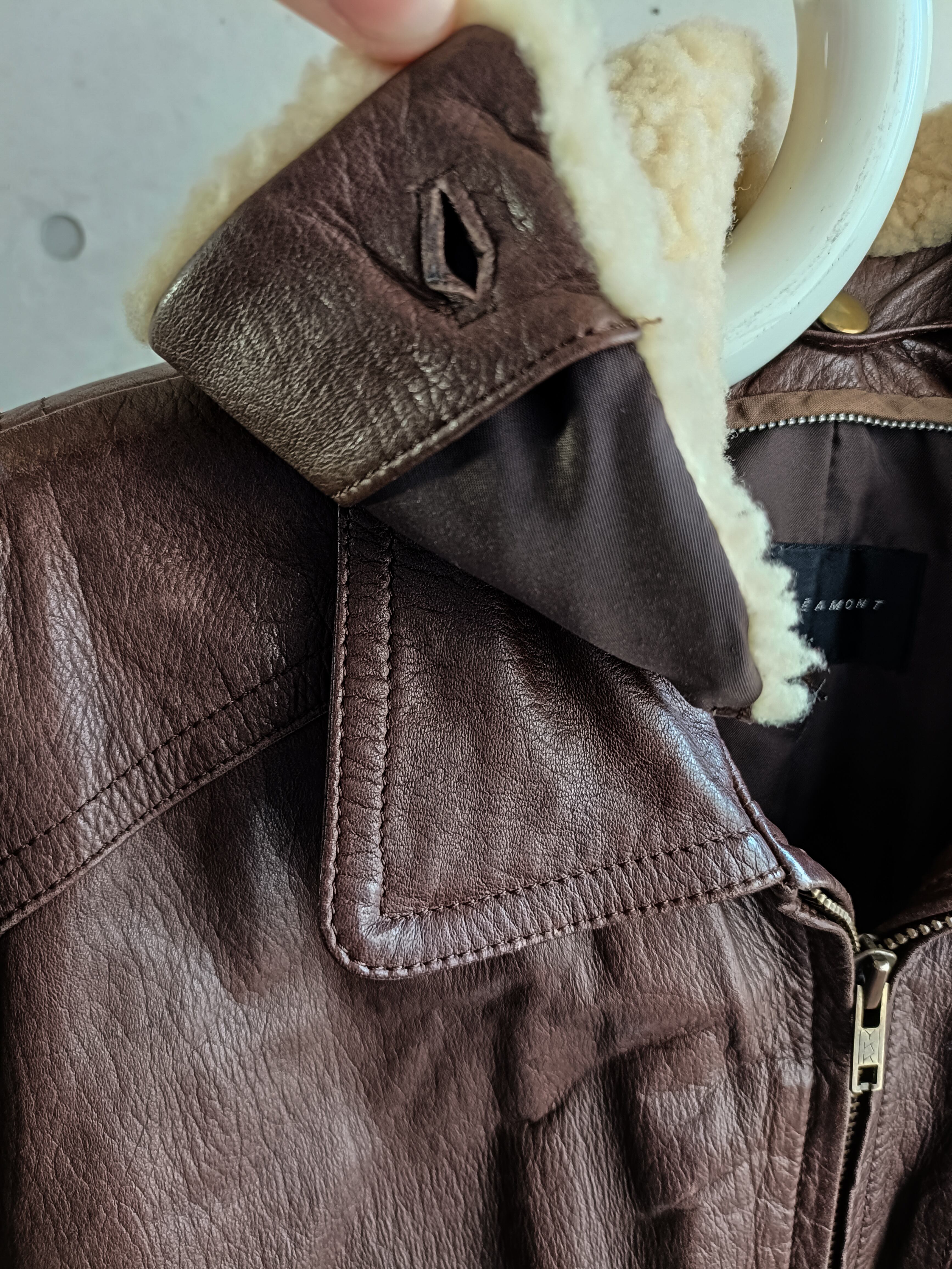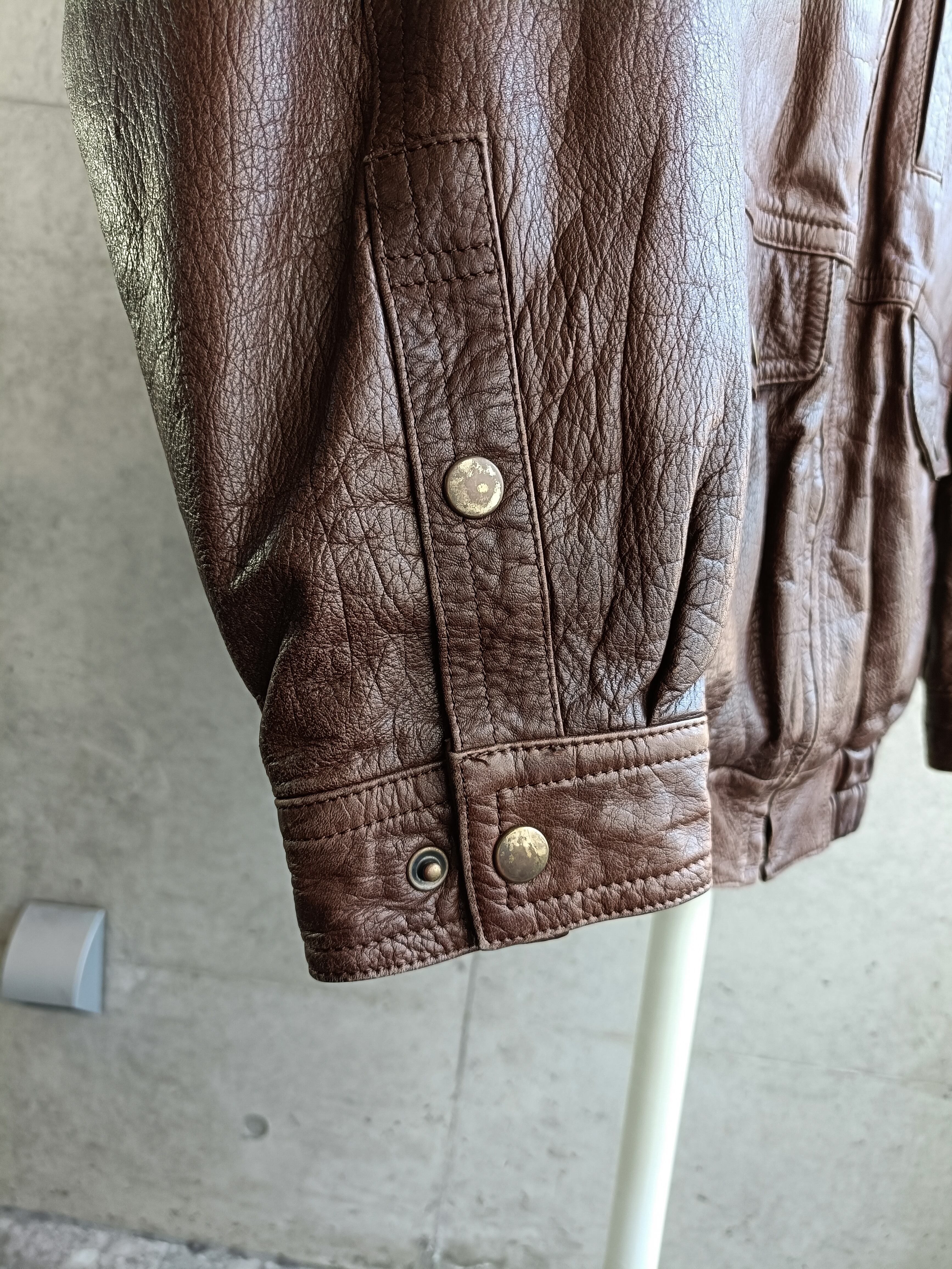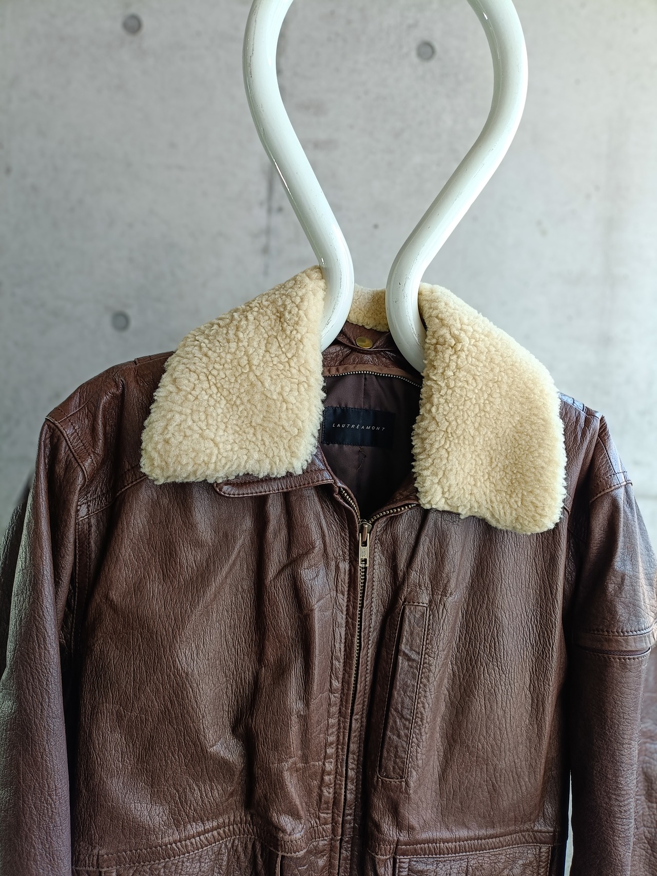 ブラウンのG-1レザーブルゾン。しっとりした質感のシボ革レザー。襟ボアは取り外し可能で普通の襟としても着用可能。Ma-1のように前たてにフラップが付いてるのが凄く好きなディテール。