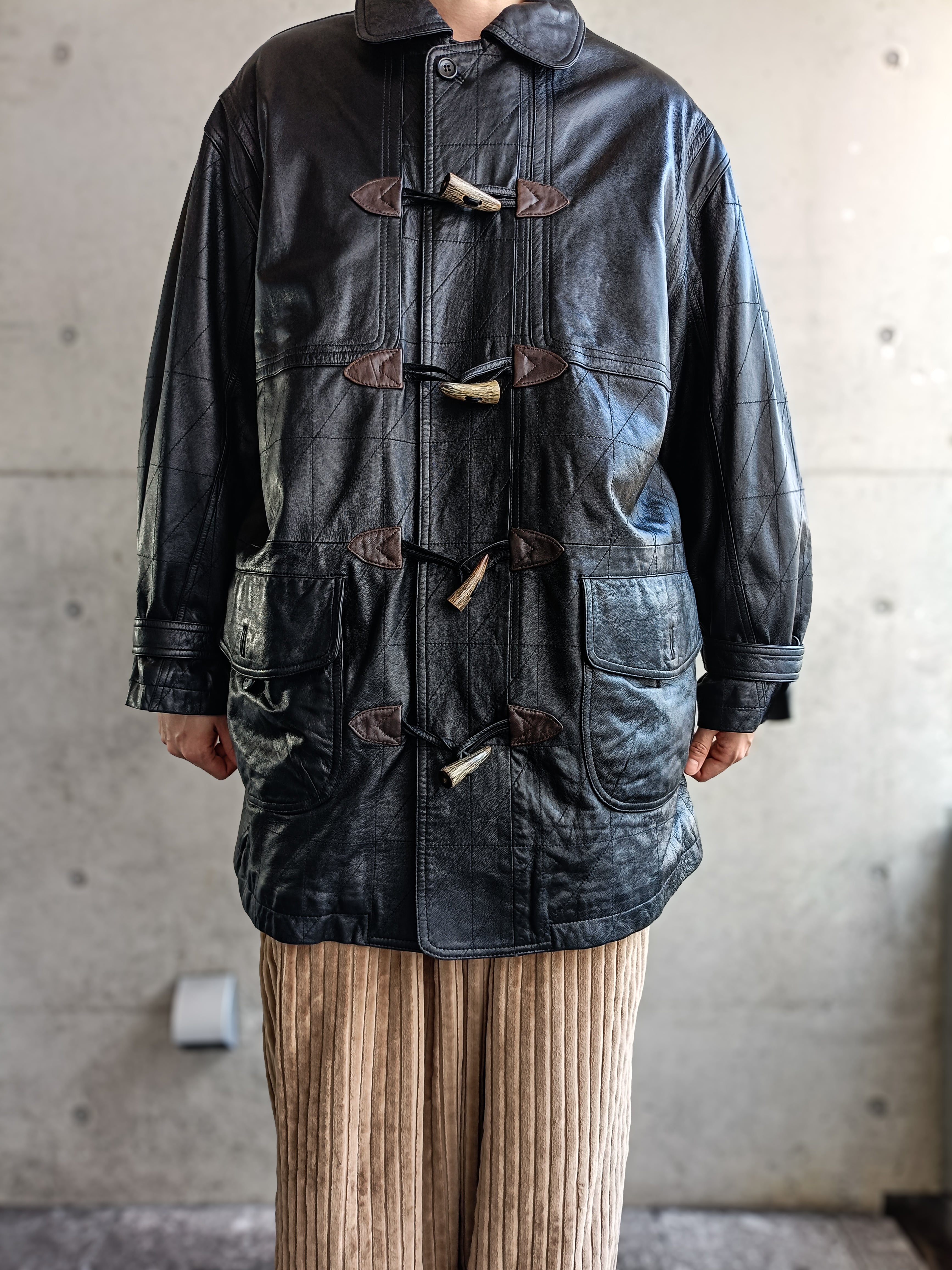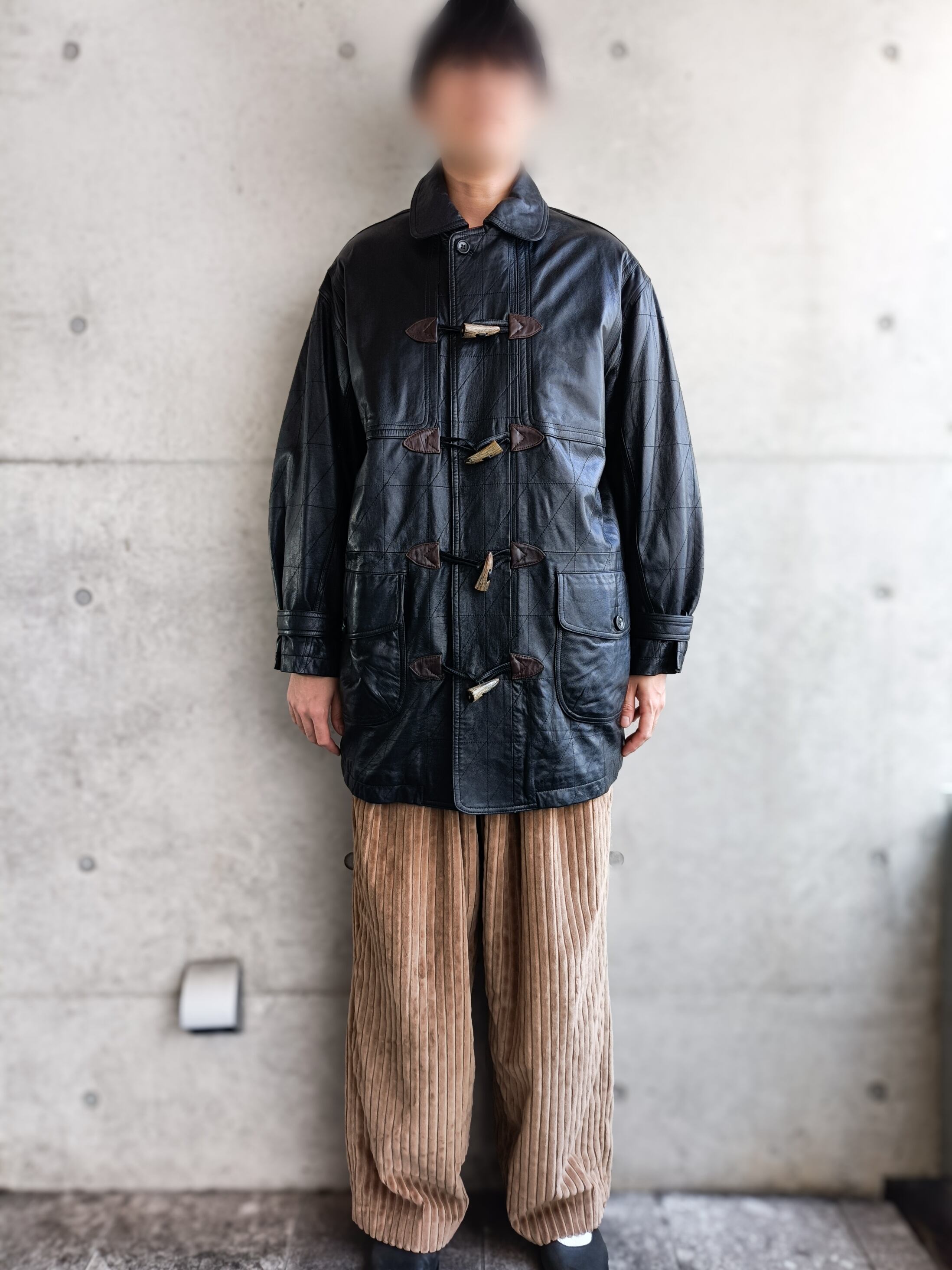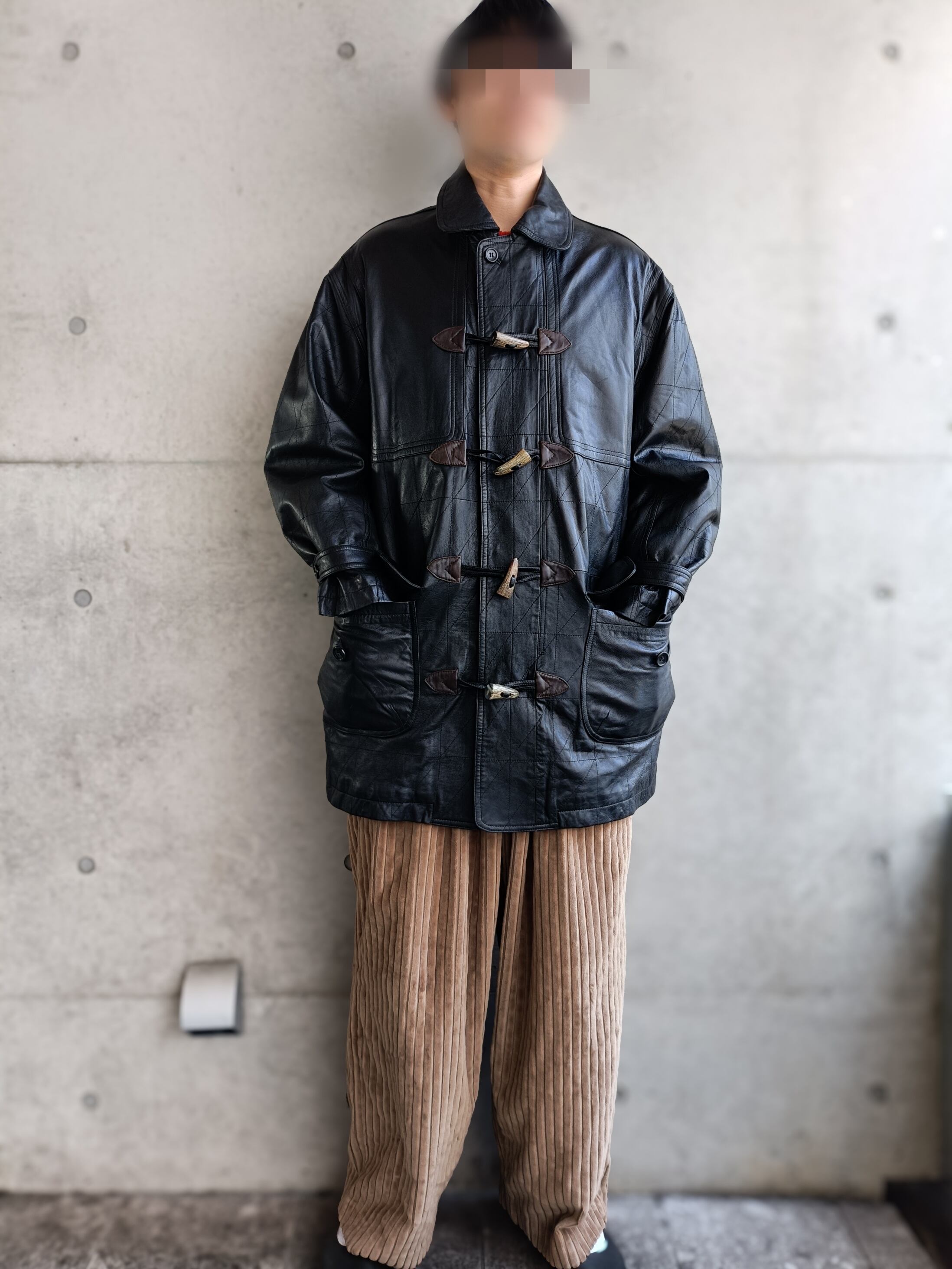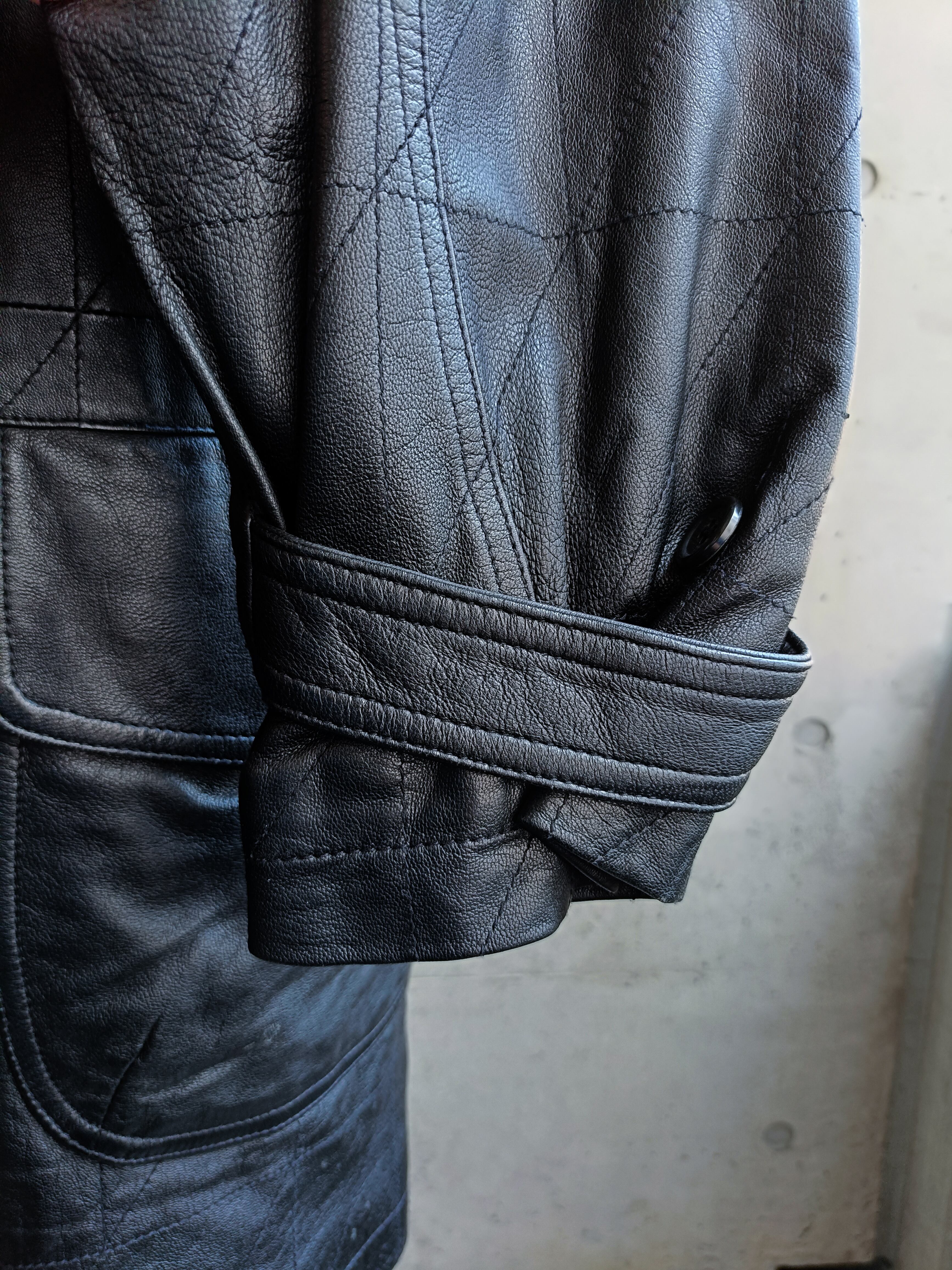 ブラックのレザーダッフルコートの入荷です。モチモチな薄いラムレザー。ジップはririジップです。袖ベルトで袖に溜まりができるのもポイント。裏地は中綿入りです。