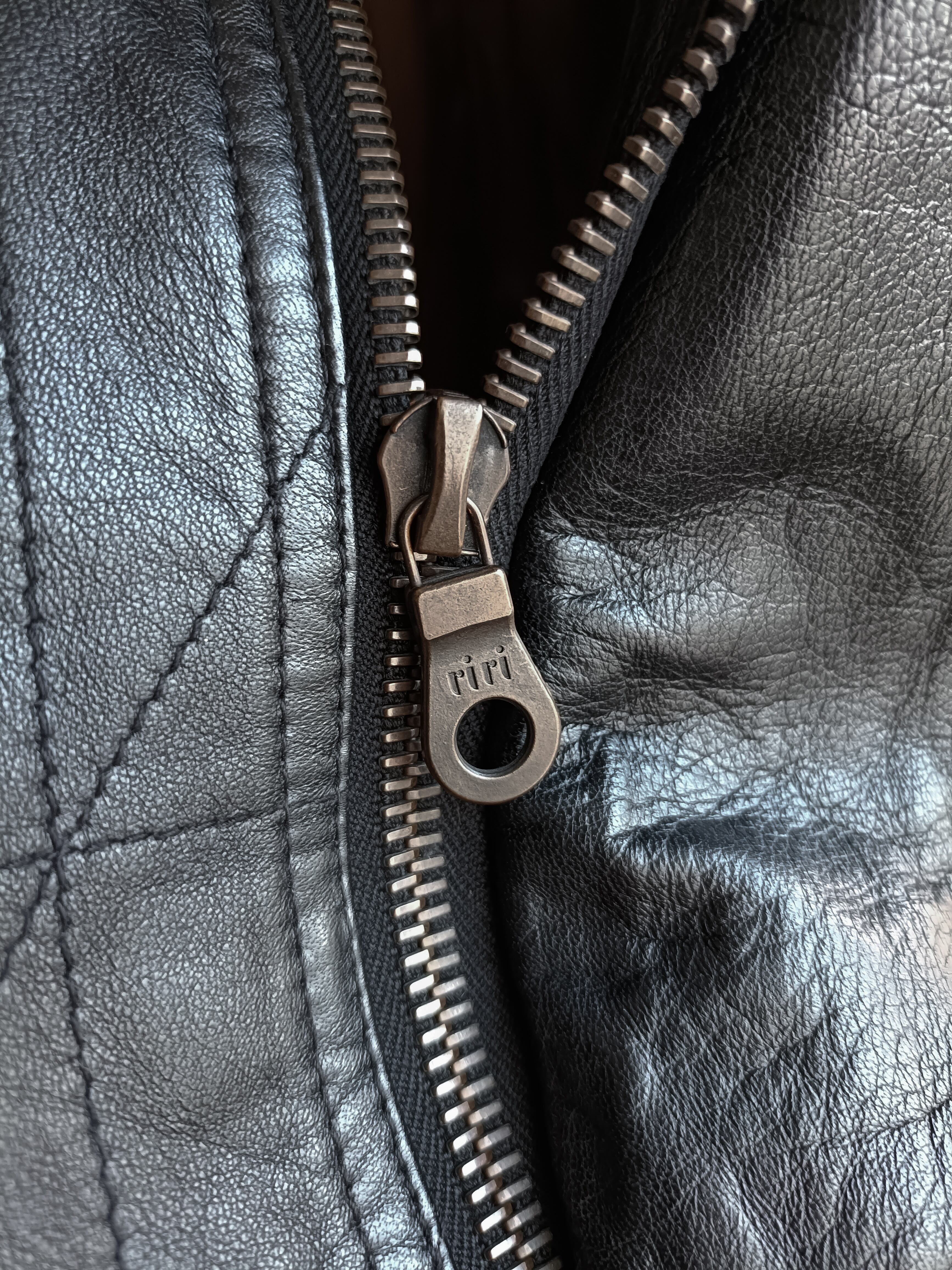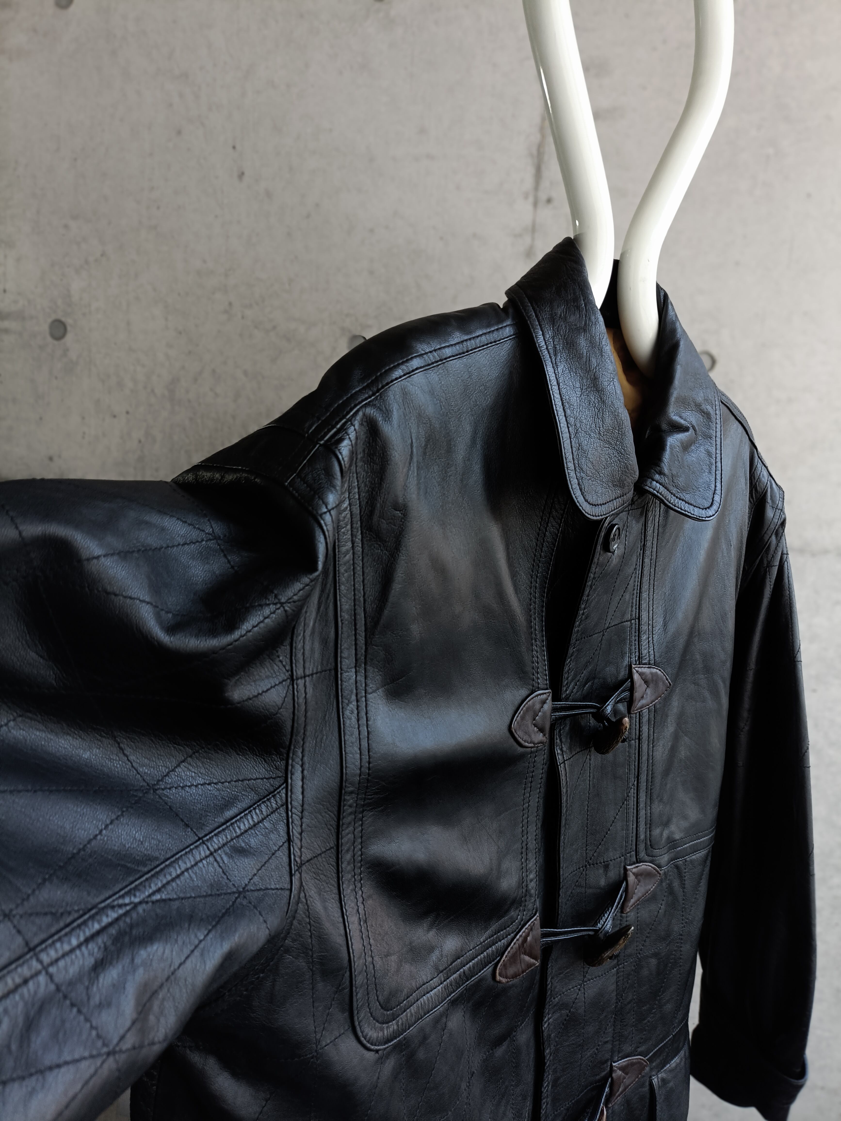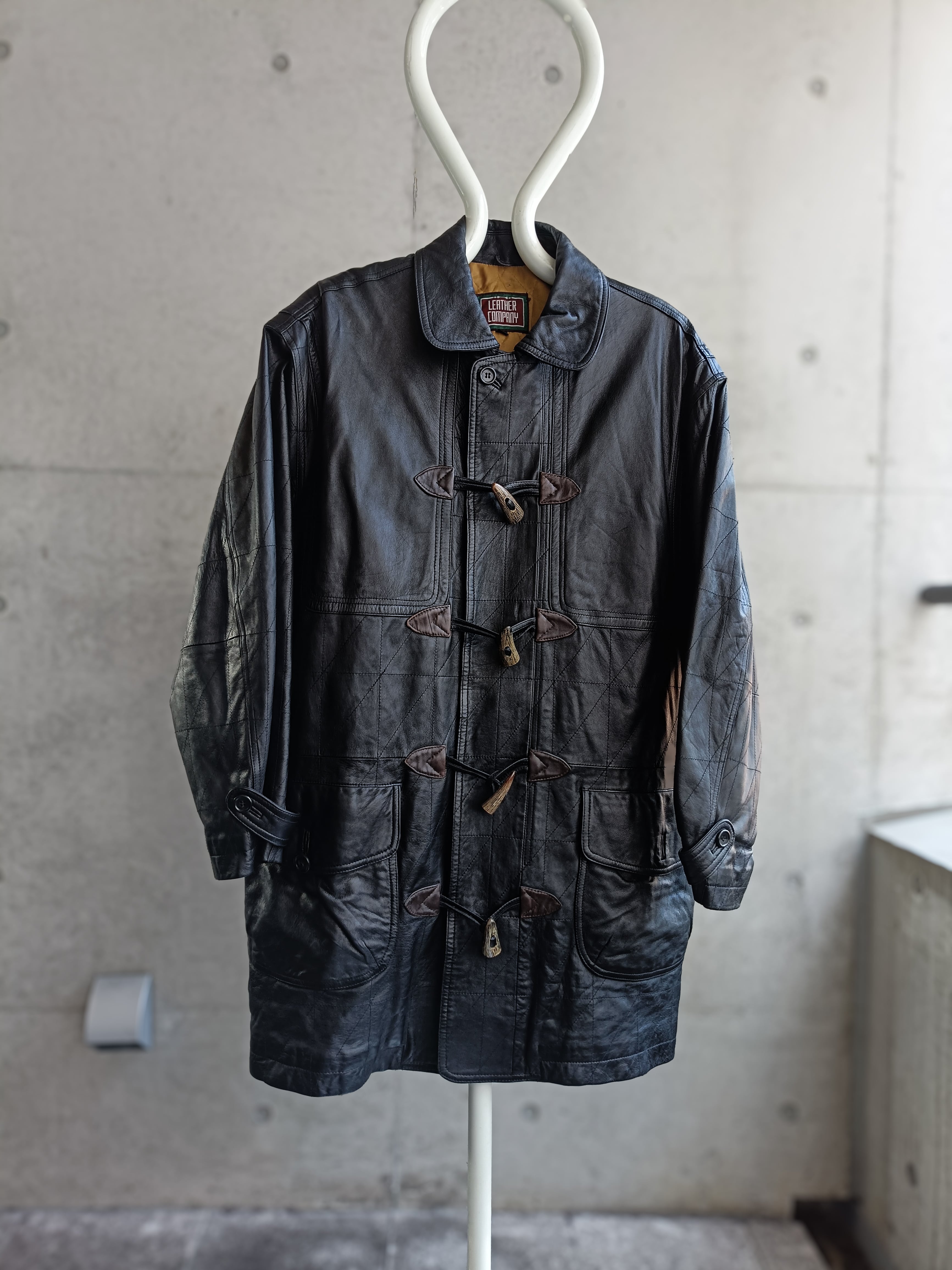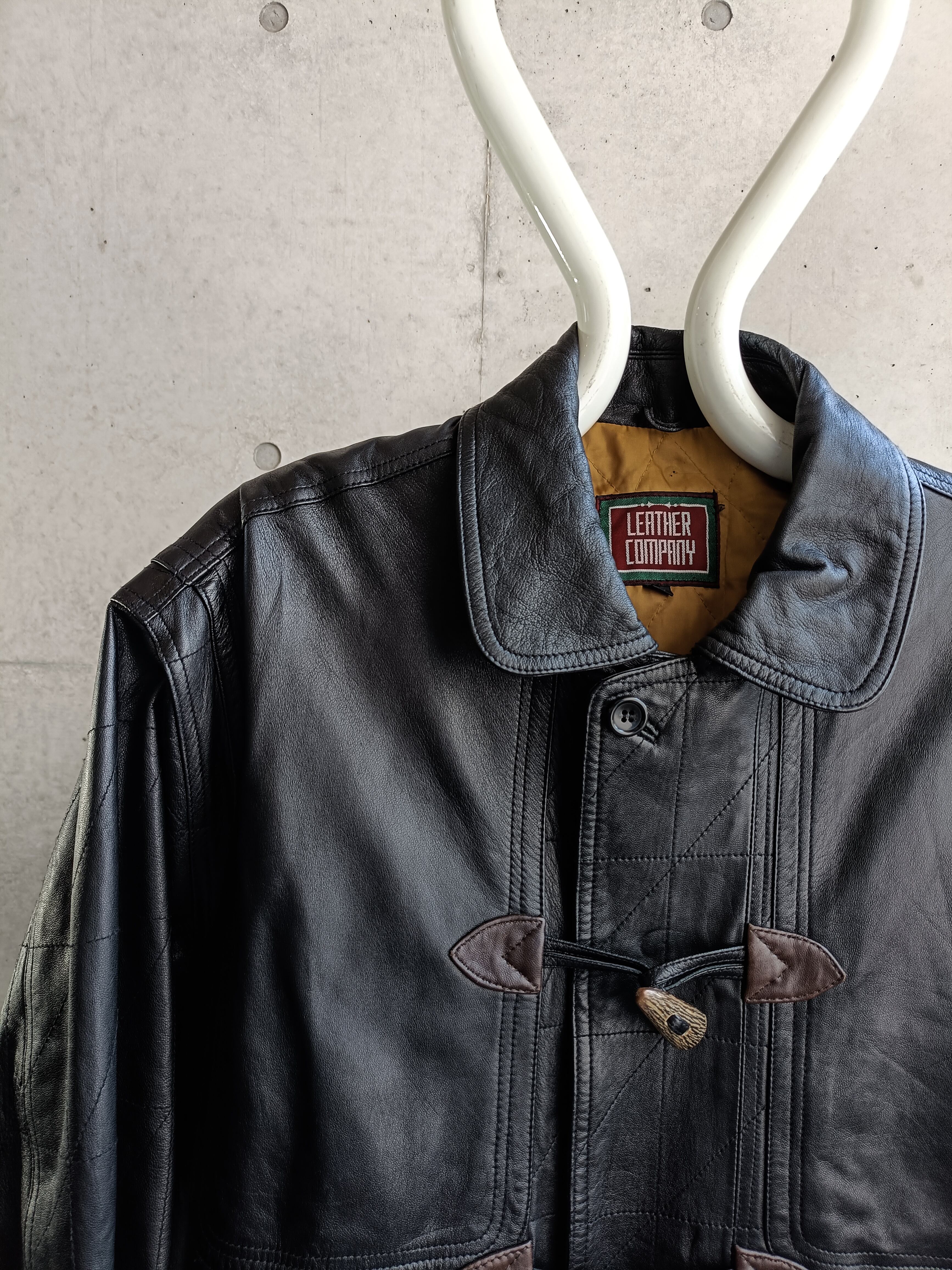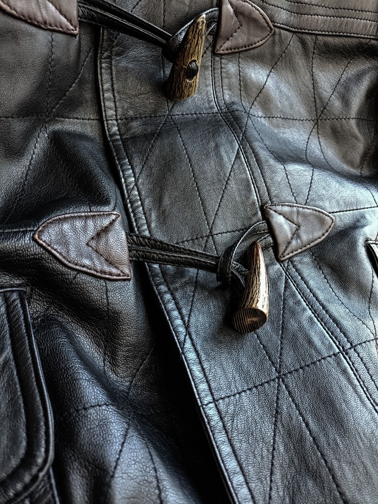 ブラックのレザーダッフルコートの入荷です。モチモチな薄いラムレザー。ジップはririジップです。袖ベルトで袖に溜まりができるのもポイント。裏地は中綿入りです。