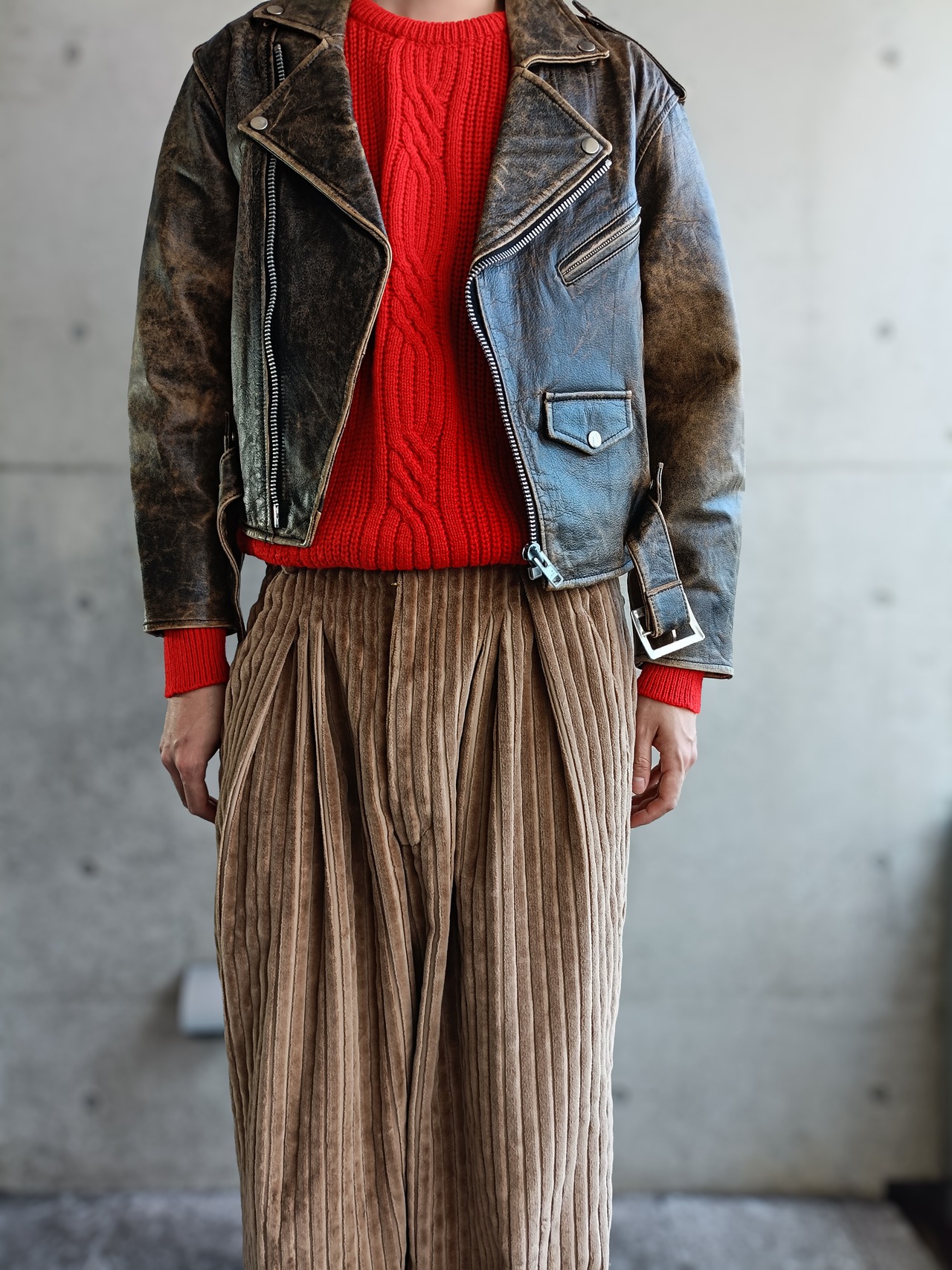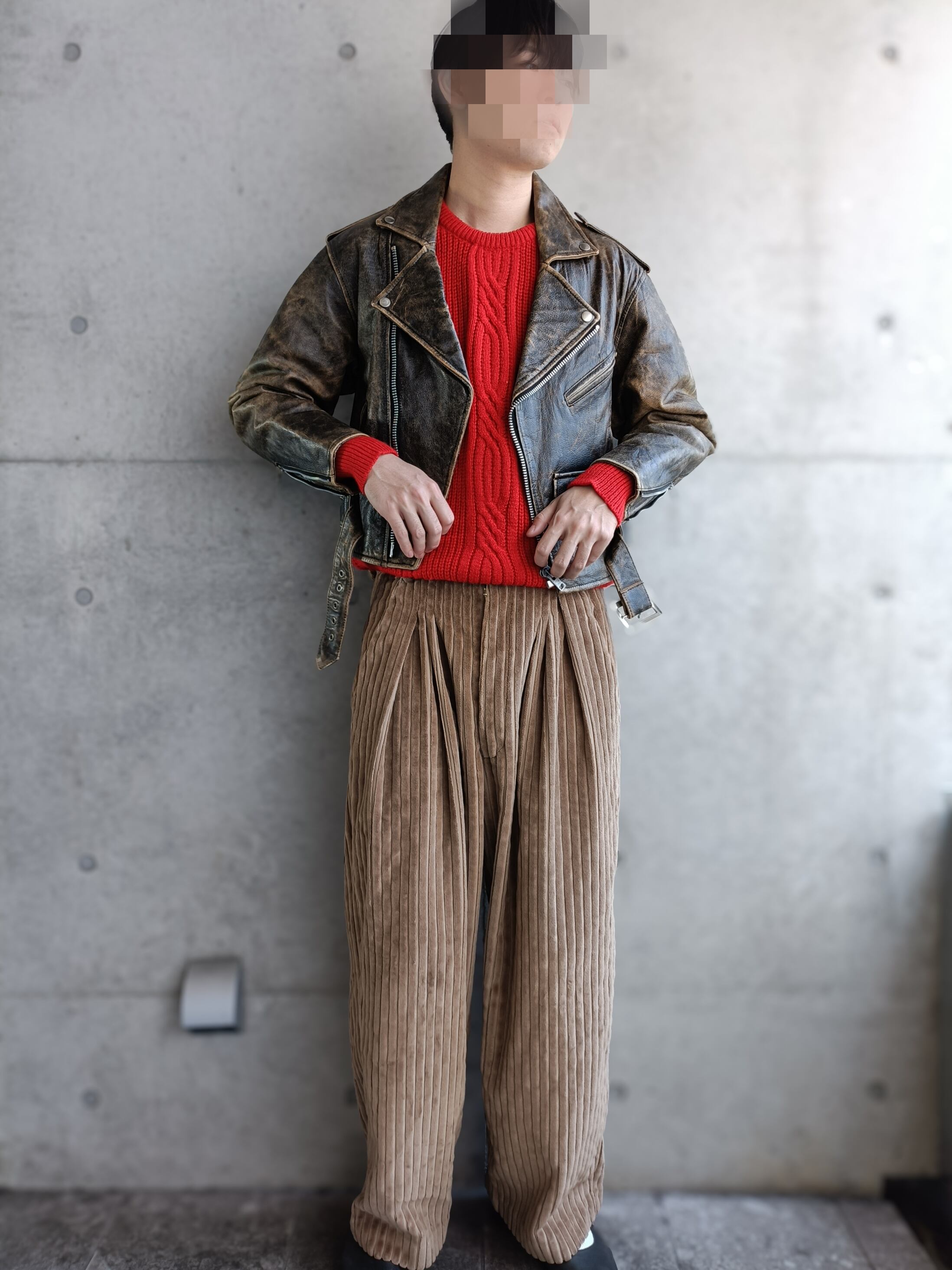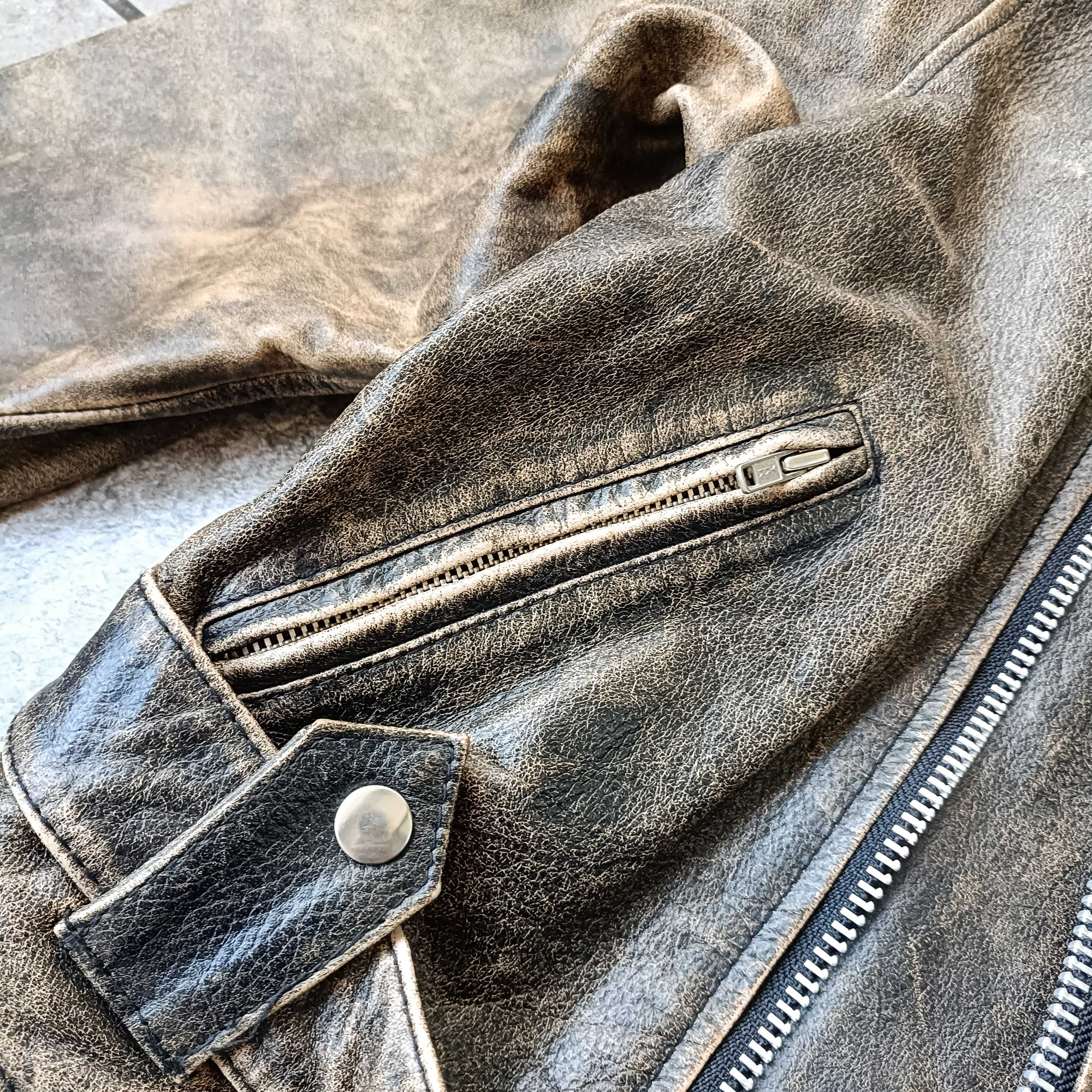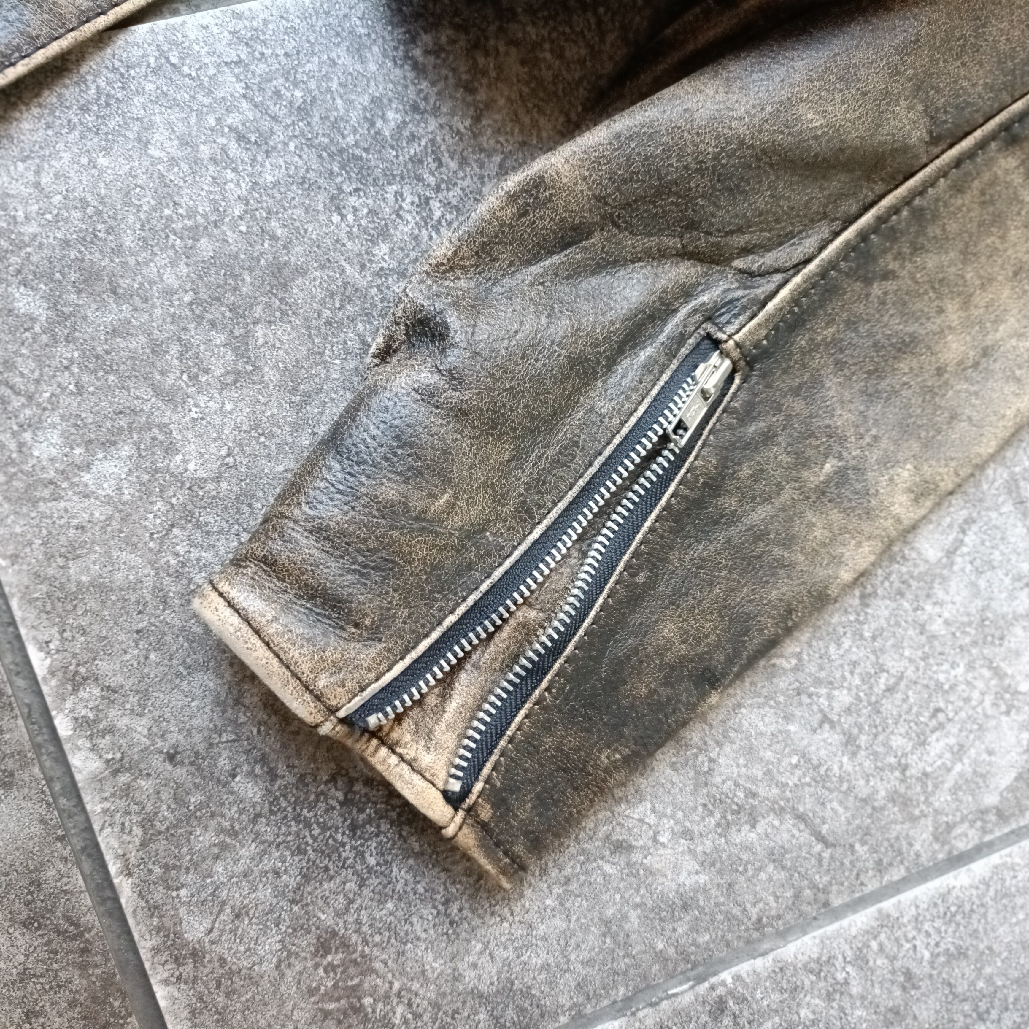 ダメージ加工されたレザーライダースブルゾンの入荷です。久しぶりにダメージレザーでライダース型見つかりました。状態も極上。しっかりニットの上からも着れるアームホールの物のみ厳選してます。170cm代の方にオススメなサイズ感です。