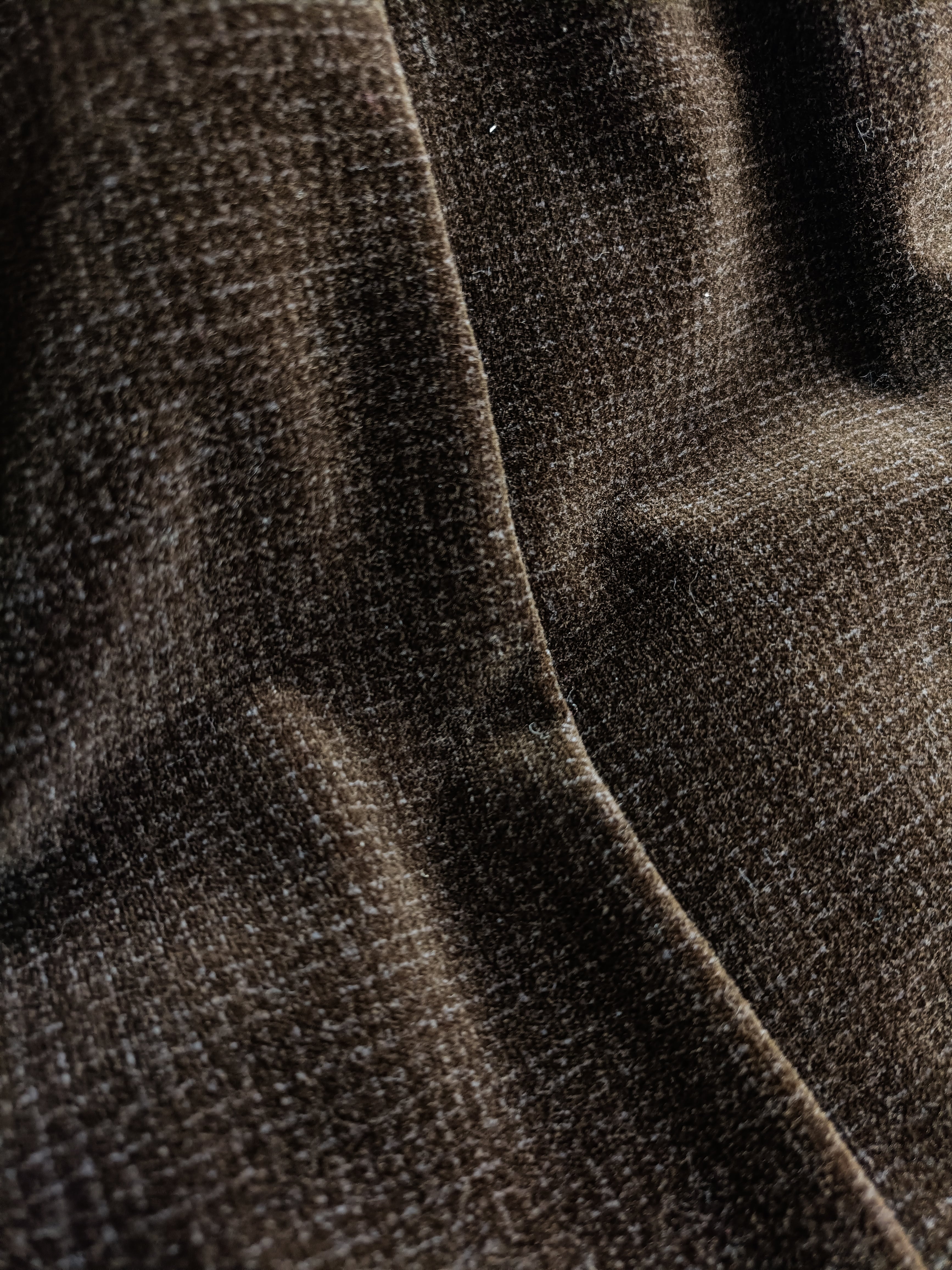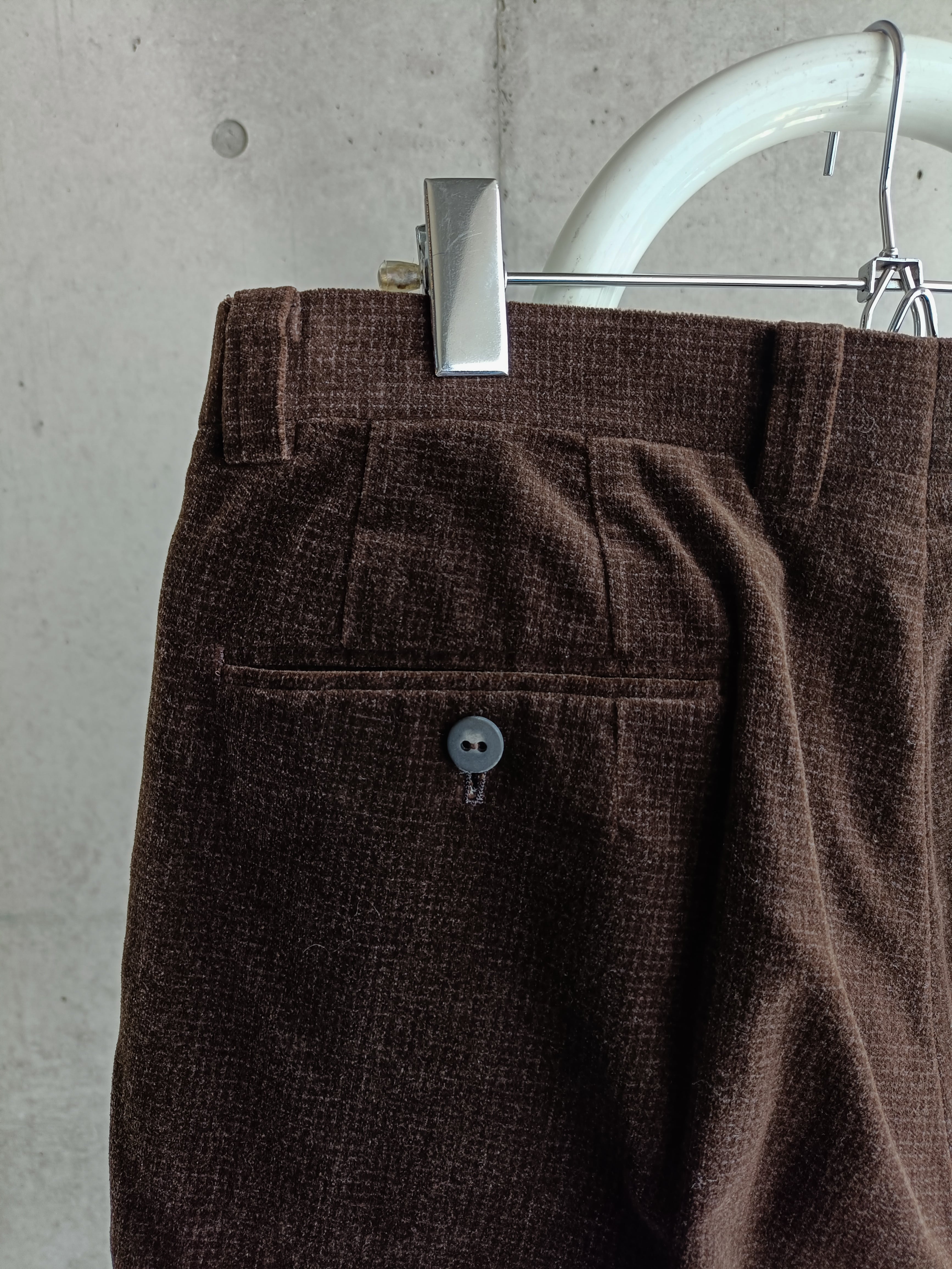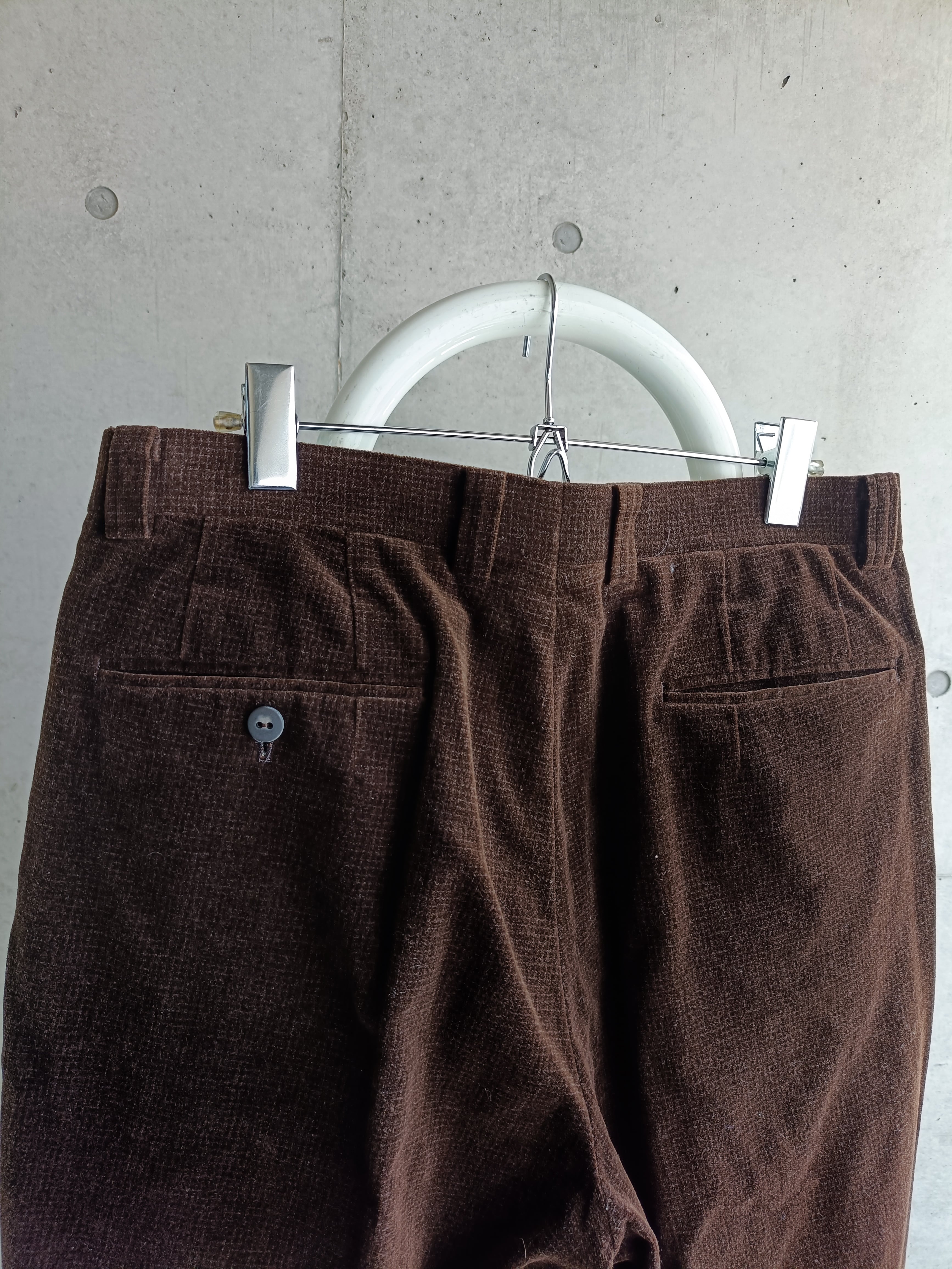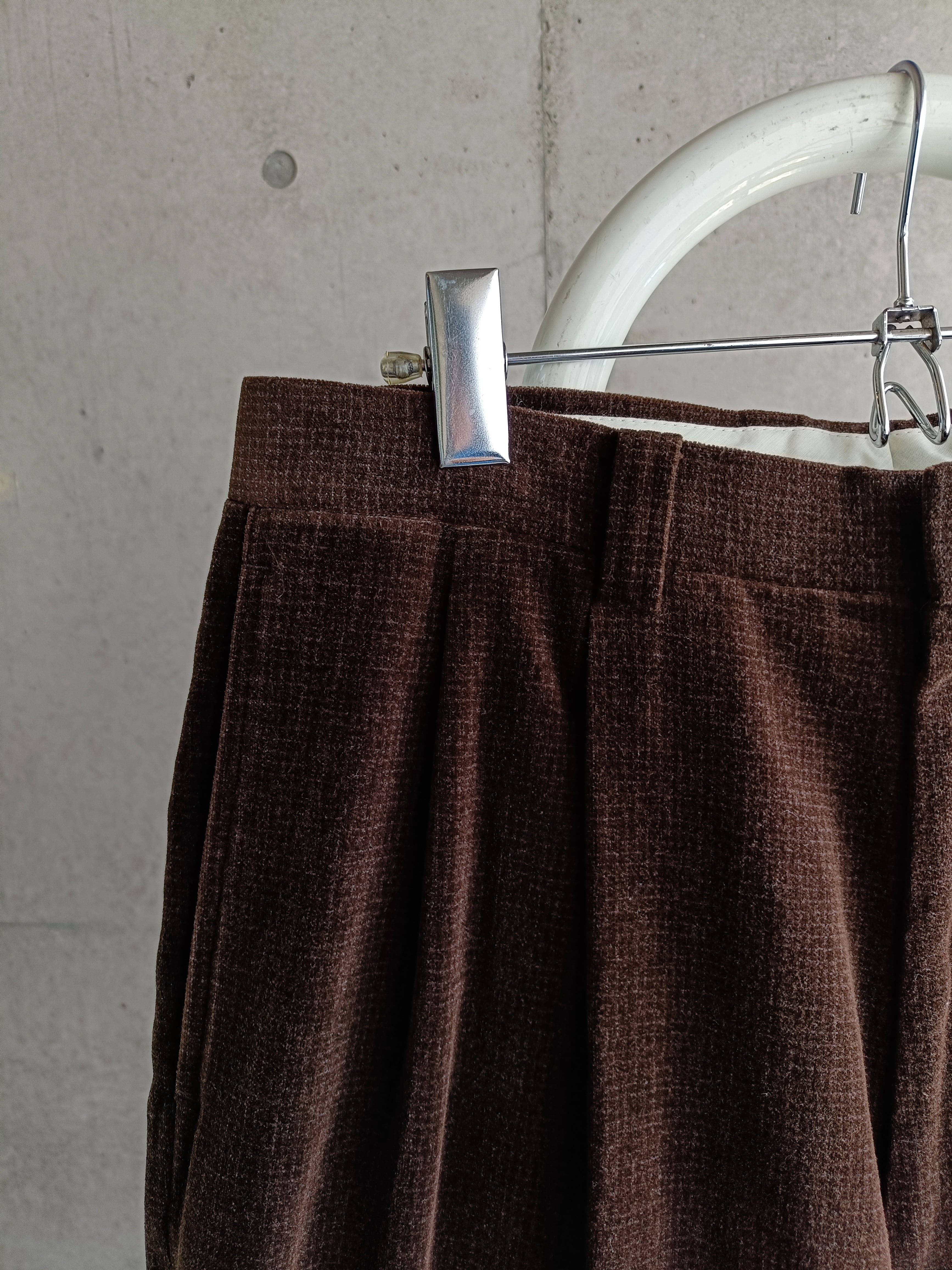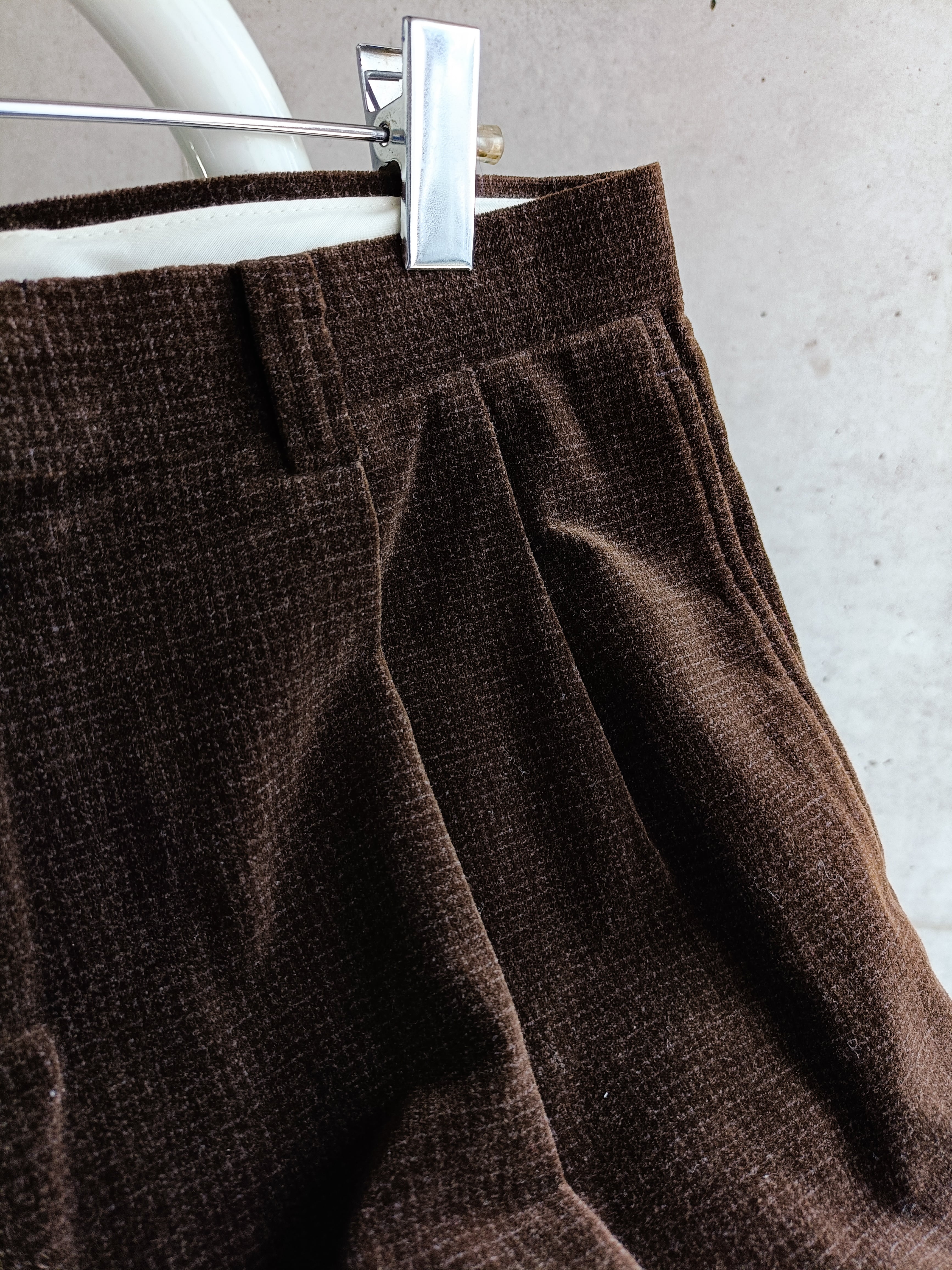 スペシャル。希少なブラウンのベルベットスラックスの入荷です。よく見ると格子のような模様が薄く入った生地。2タックでワイドシルエット。小柄なメンズ向けサイズです。
