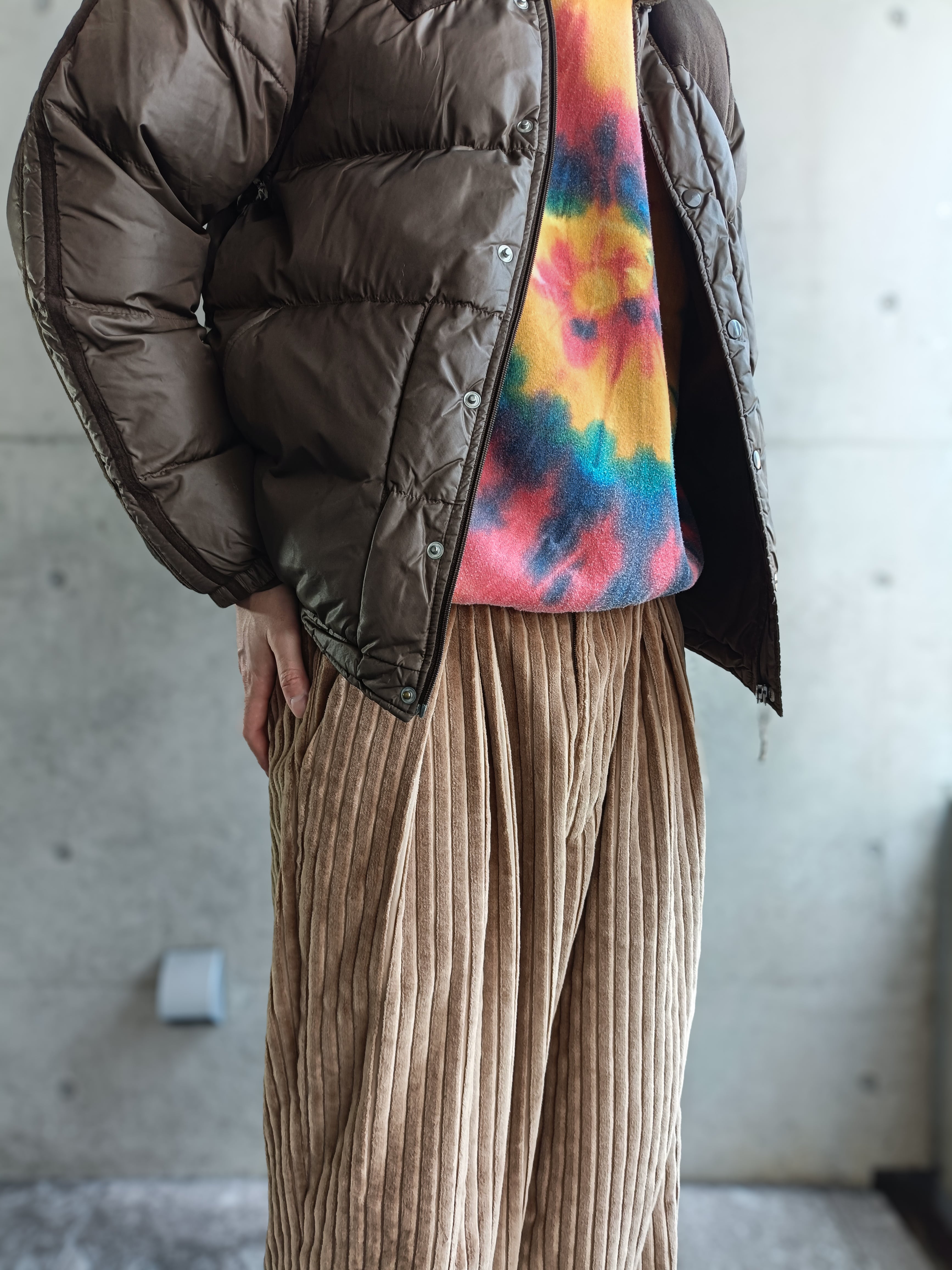 モカブラウン色のダウンジャケット。マイクロスウェードが切替になったデザイン。ダウンで気の利いたデザインの洋服は皆無です。アームもマイクロスウェードのライン入り。短丈シルエットです。