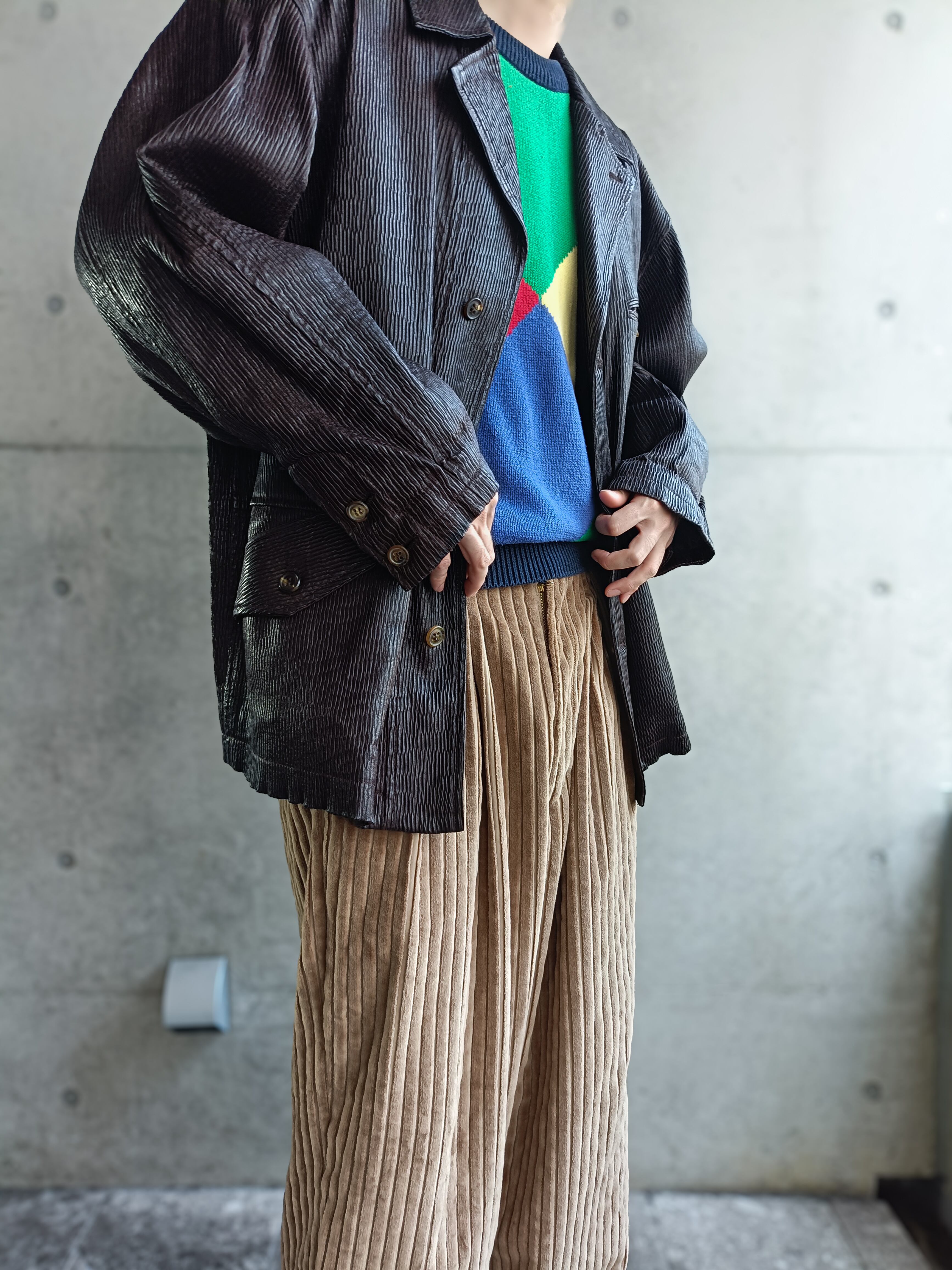 今季当店イチオシのクレイジーカラーのコットンニット。スタイリングベースでめちゃくちゃ使えるクレイジーカラーのニット。レザー系とも凄く相性良いです。裾、襟、袖はネイビーなので着ると纏った印象です。