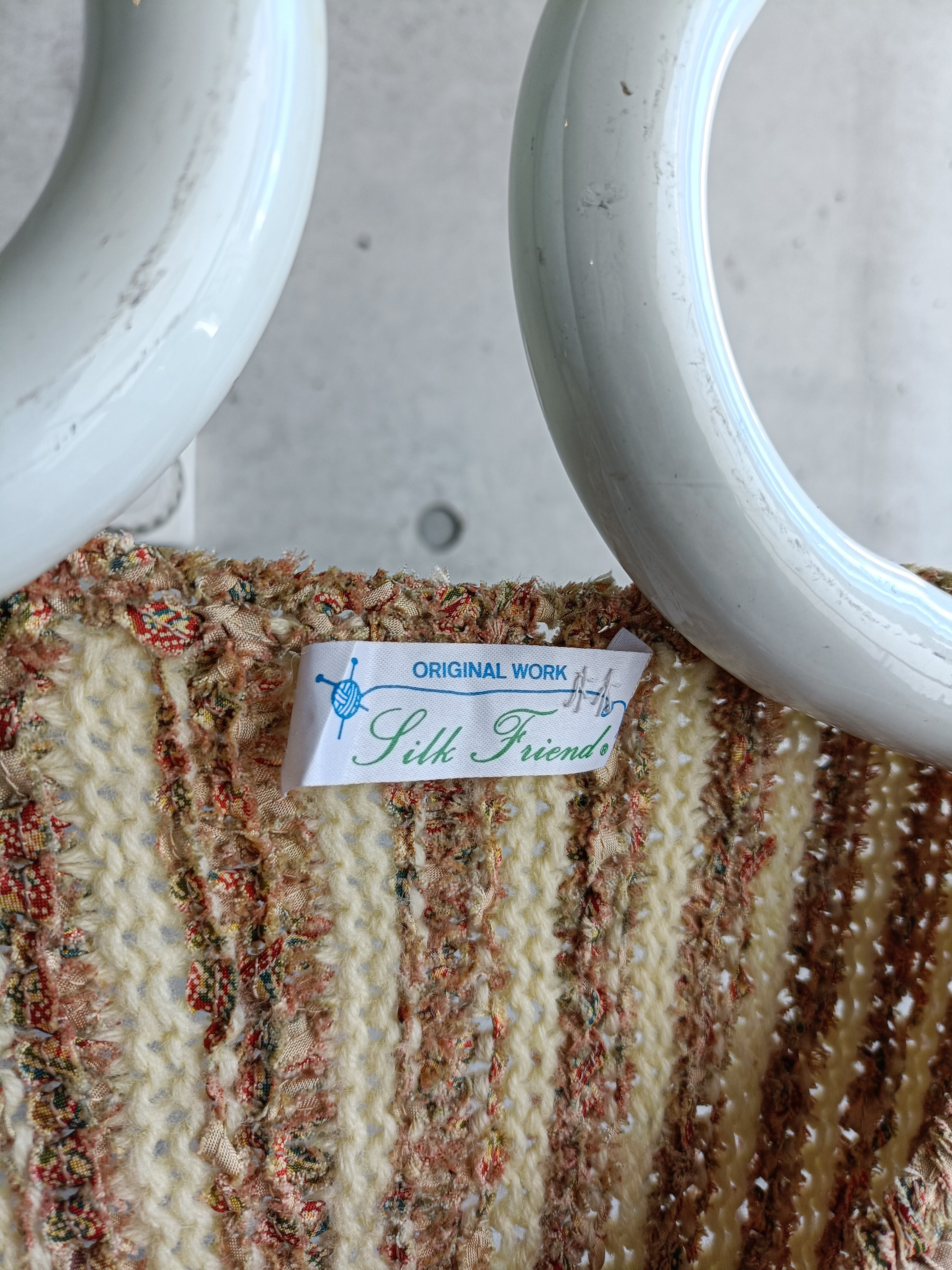 クリーム色ベースのミックスウールカーディガン。大きめなリブ編みのような編み方です。ノーカラー型で着回ししやすい形です。小柄なメンズ、レディース向けサイズ。