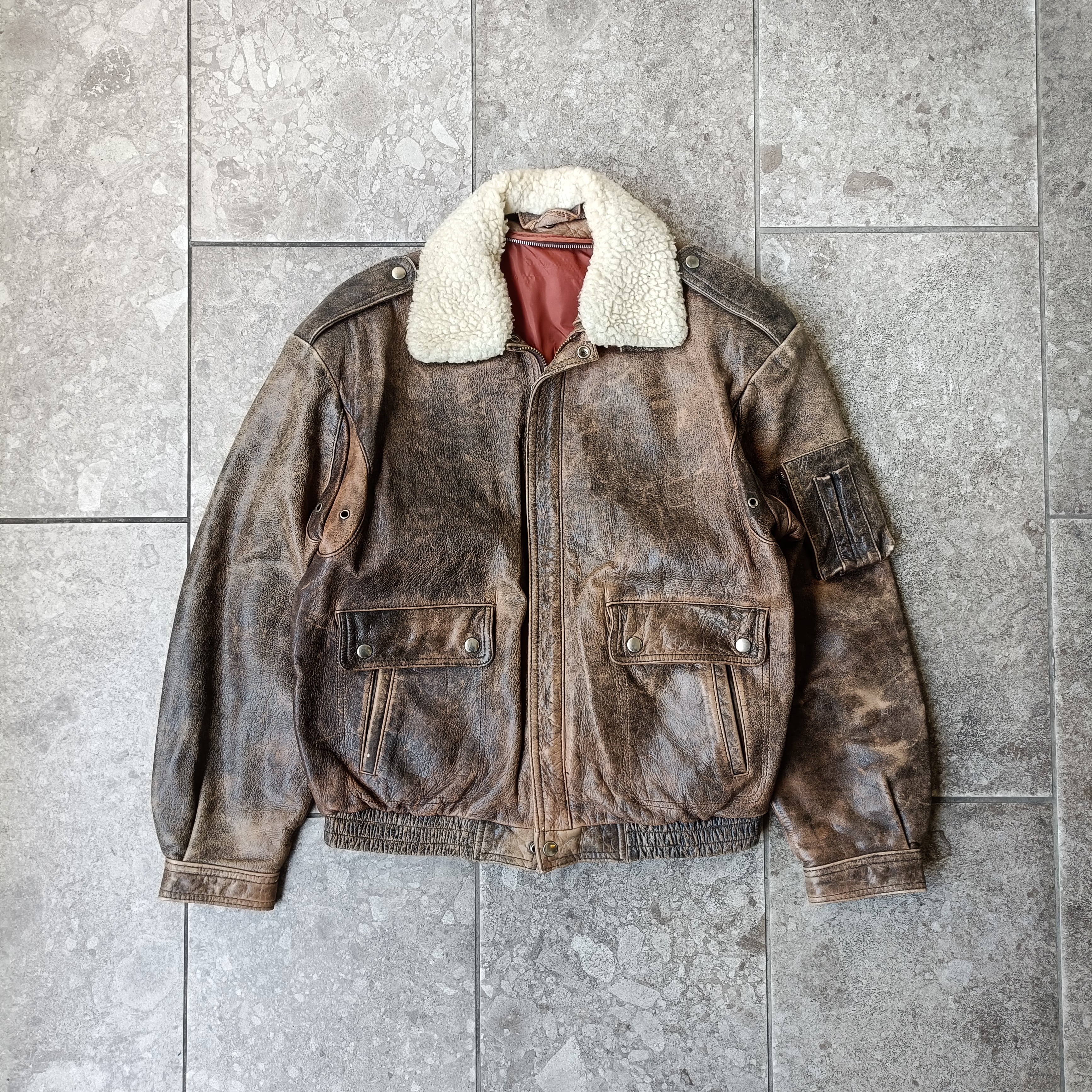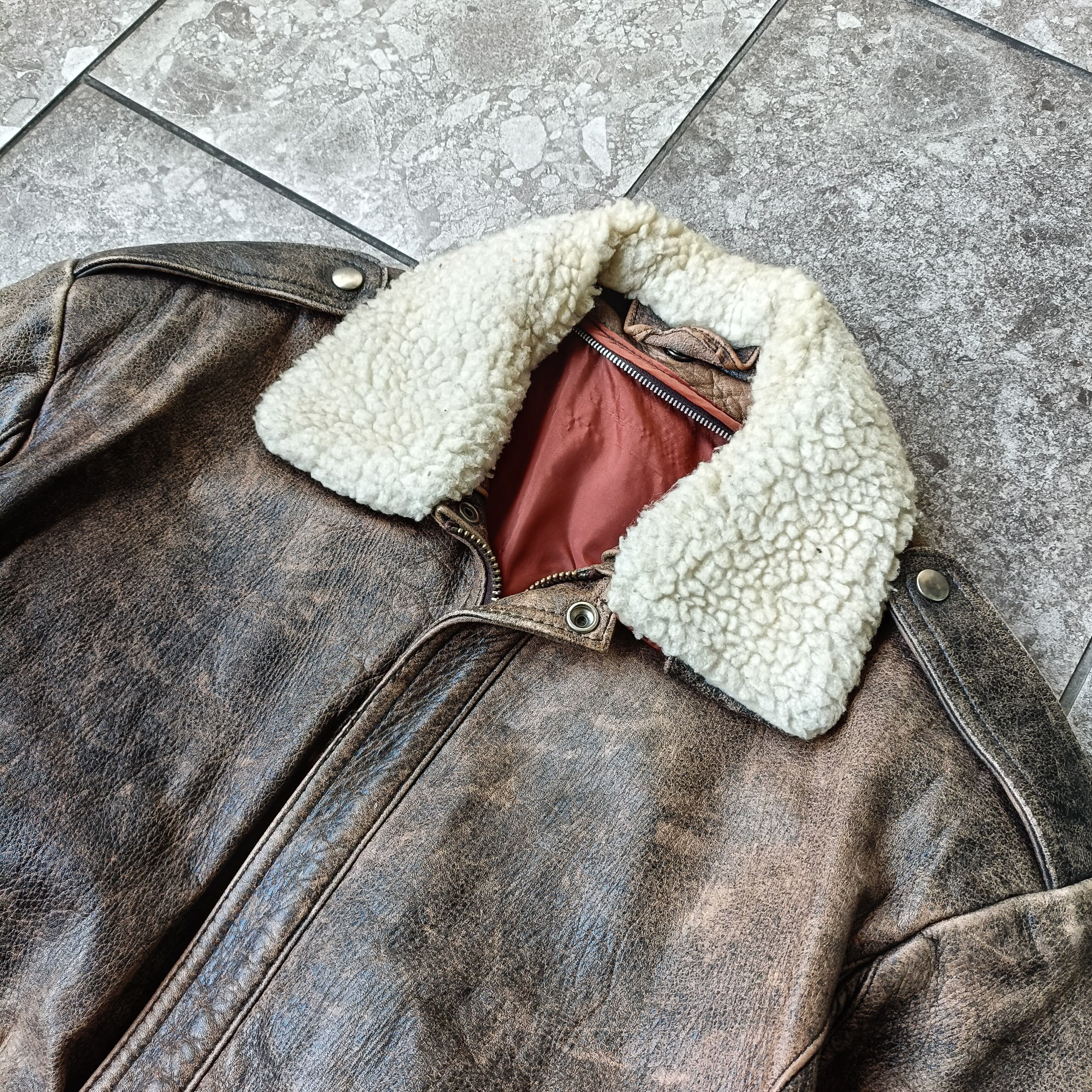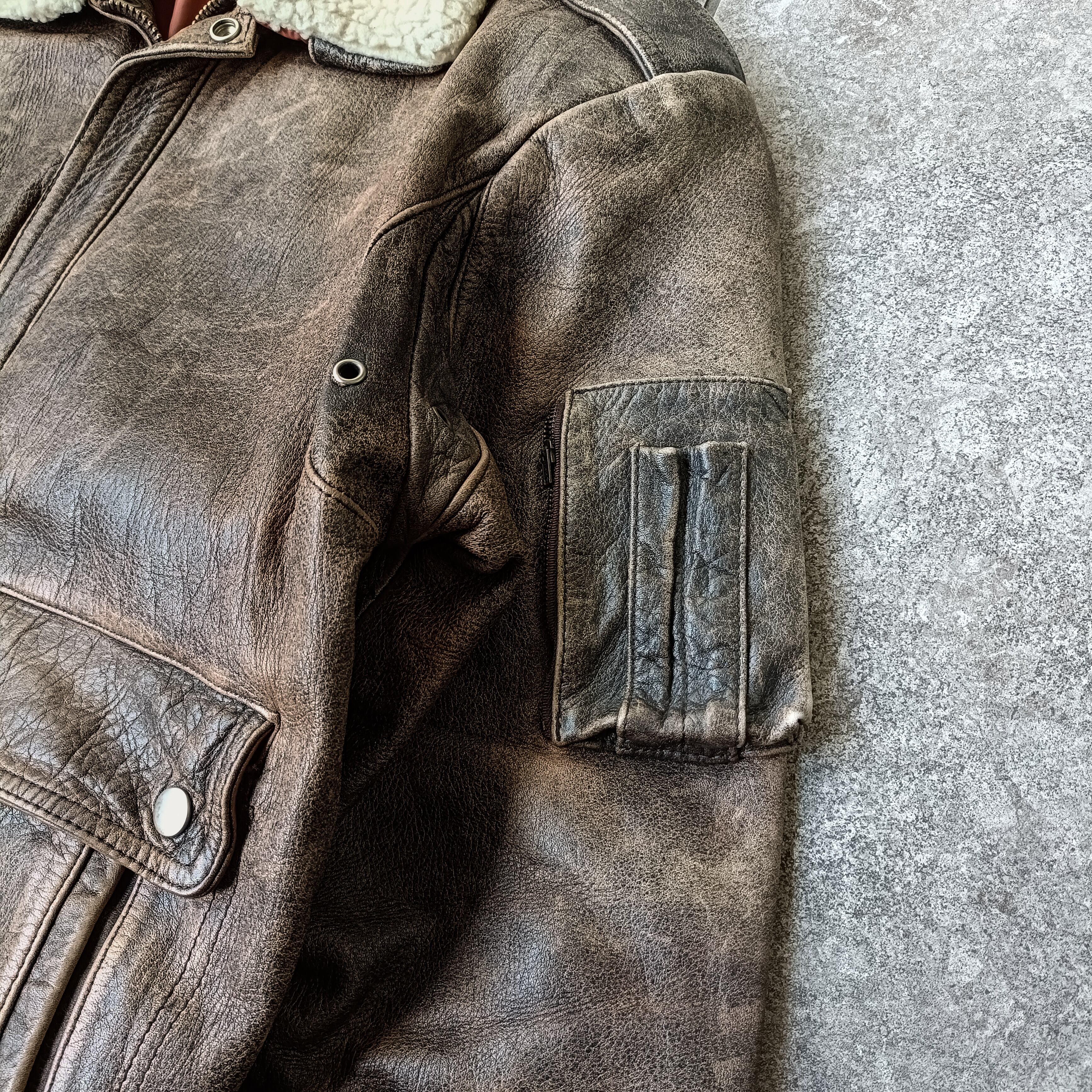 ダメージ加工されたレザーのG-1ブルゾンの入荷です。袖はフライト仕様のポケット付き。襟ボアは取り外し可能です。シルエットも完璧な一着。