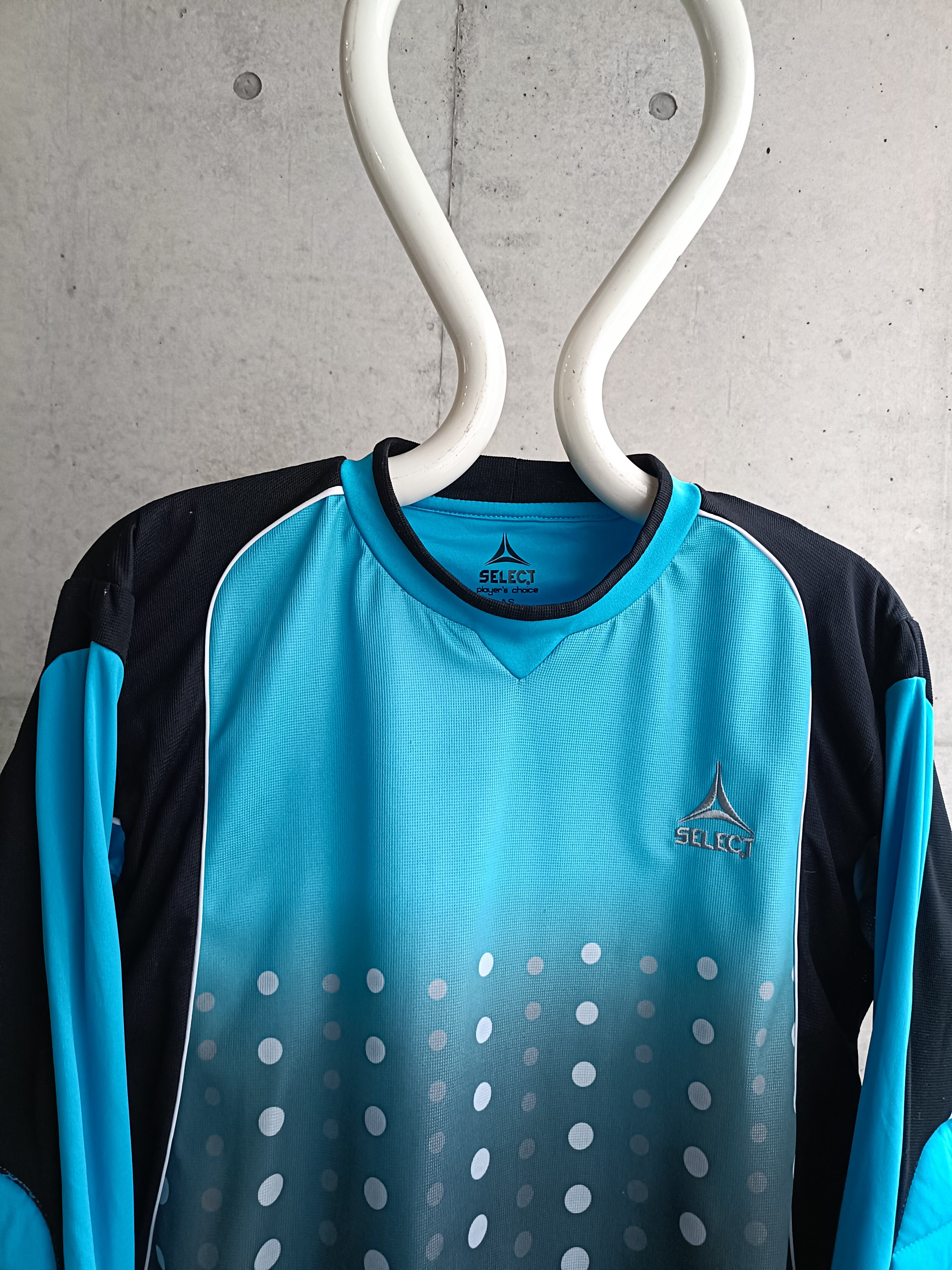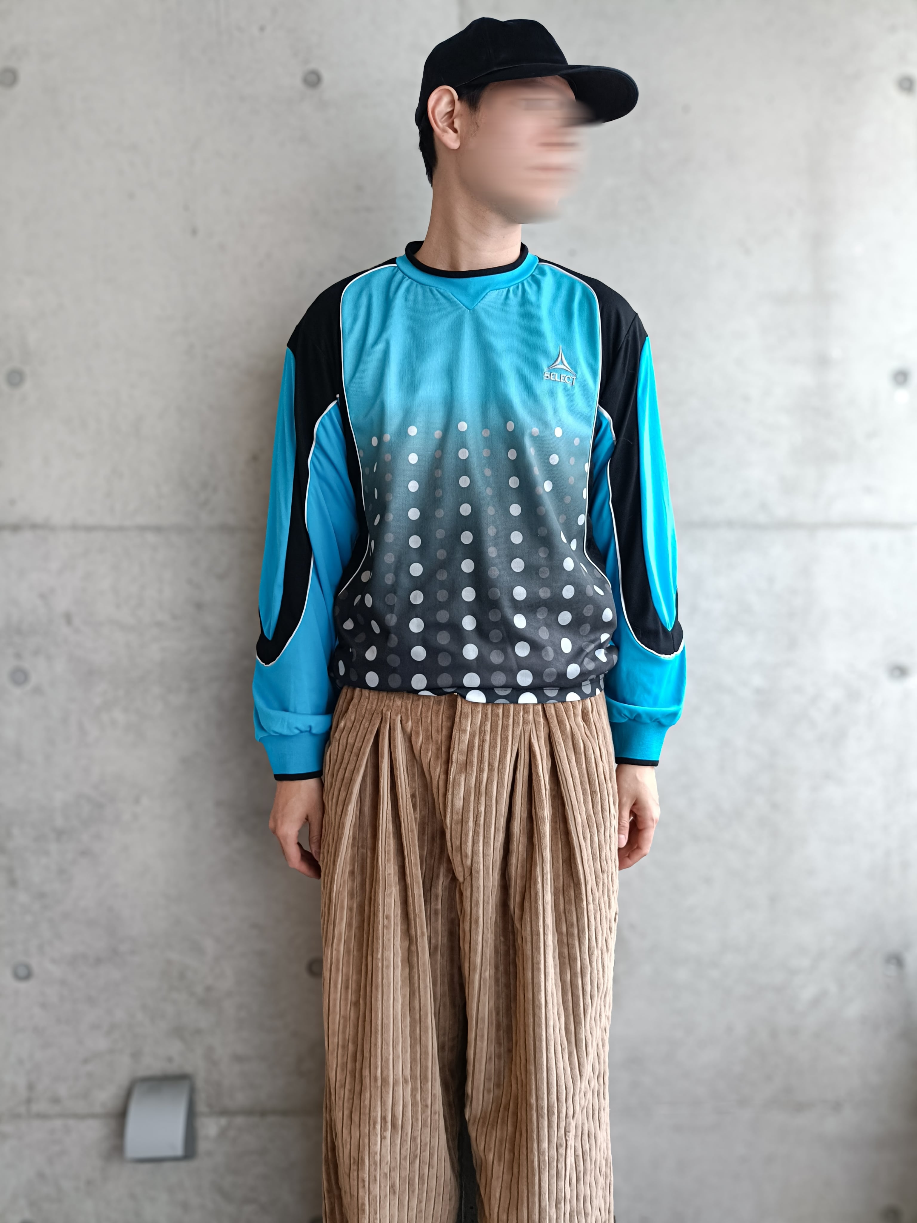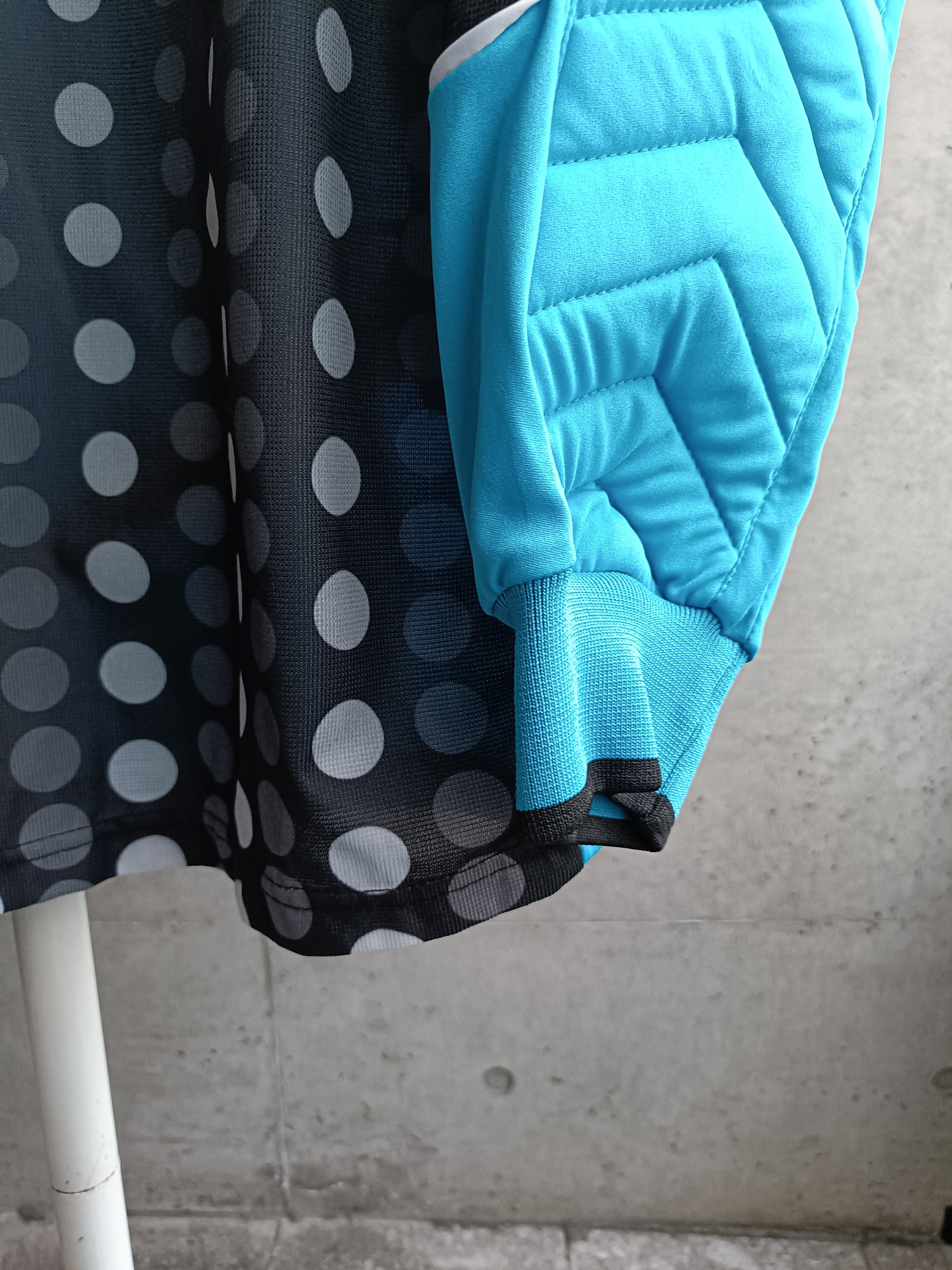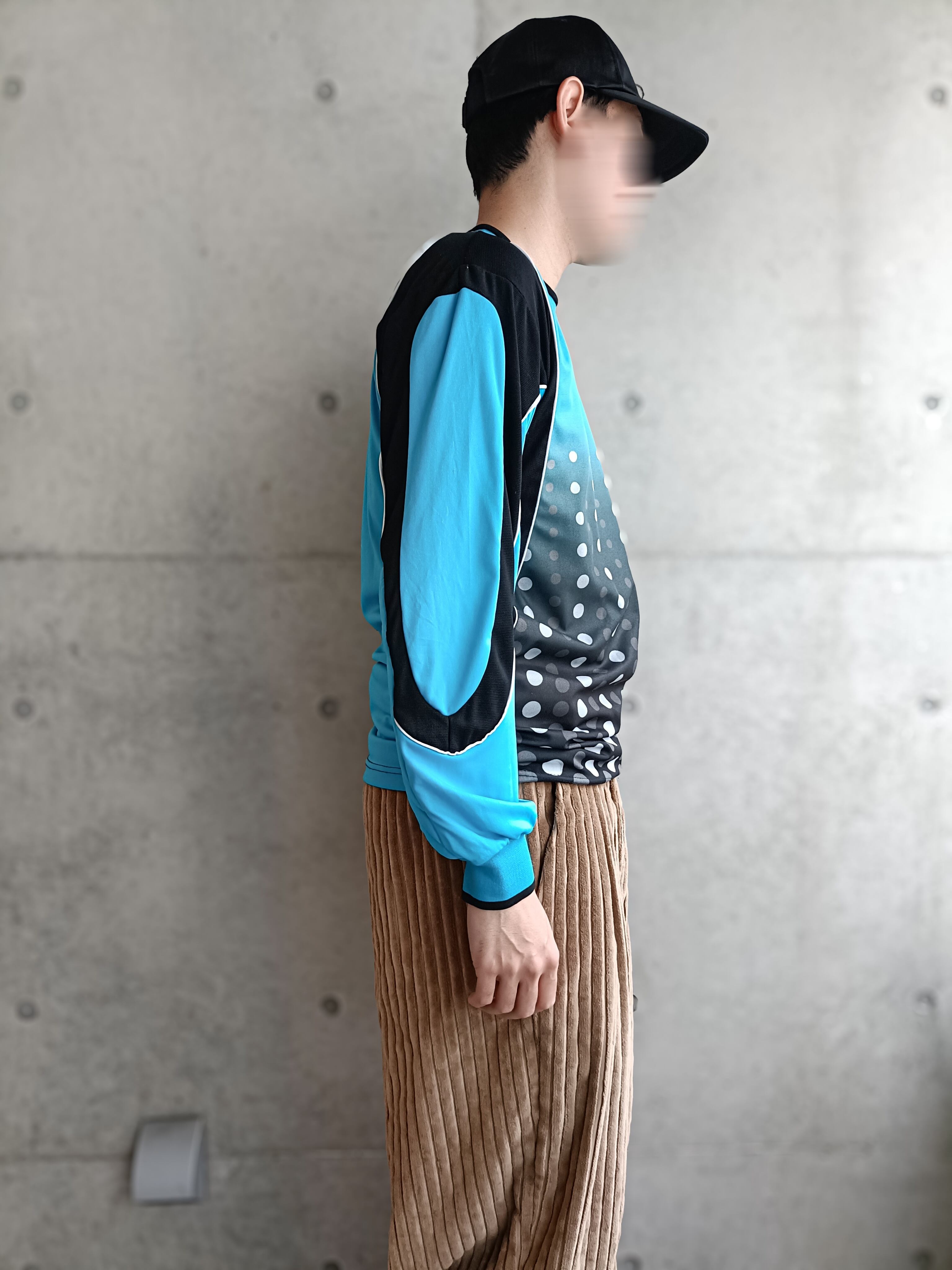 ターコイズカラーにドットのグラデーション柄のサイクリングシャツ。横から見るとアームがO型の切替。スタイリングの幅広がるサイクリングシャツです。リアルにサイクリングで使われたダメージが背面にあるのもいいです。