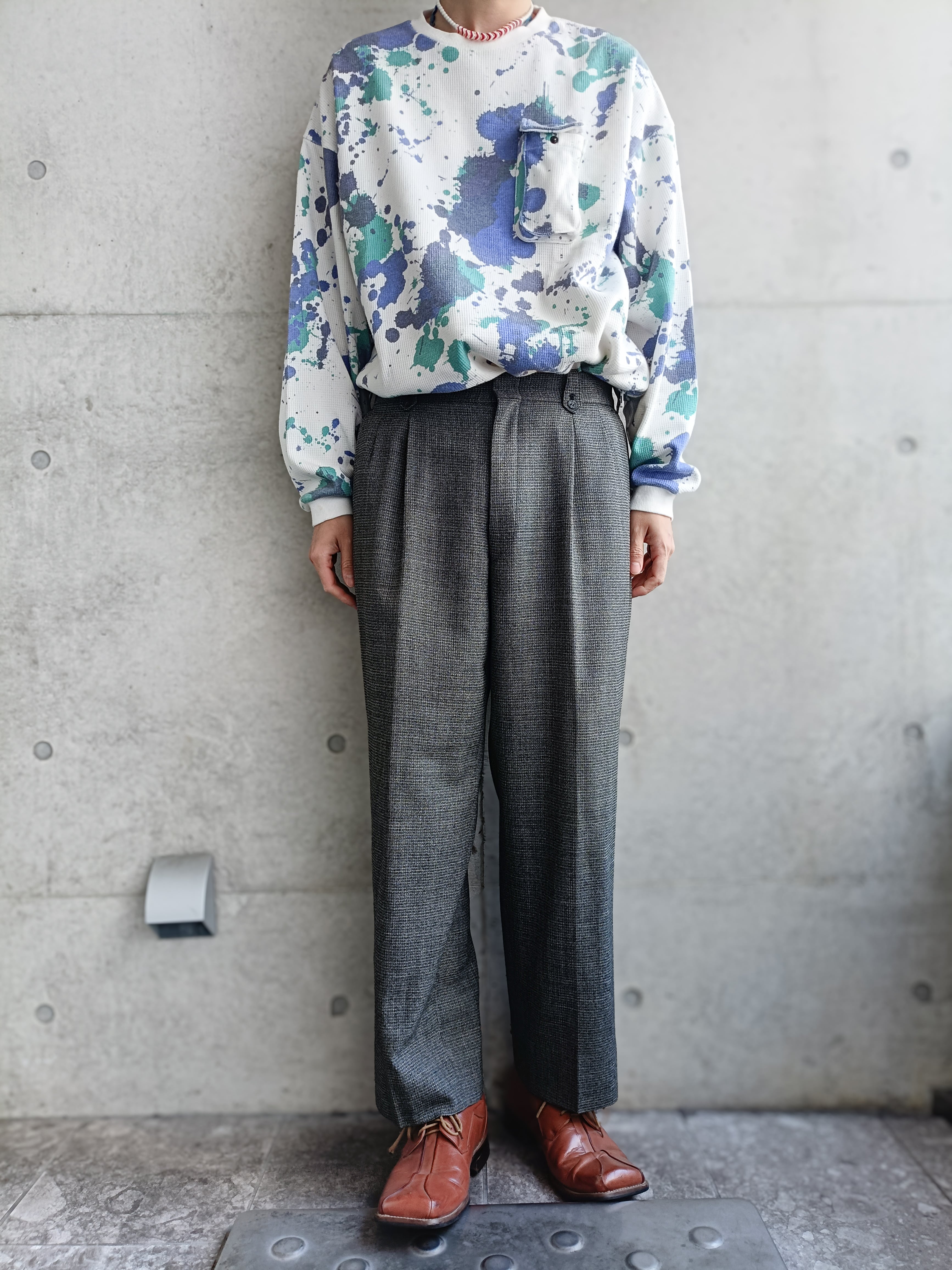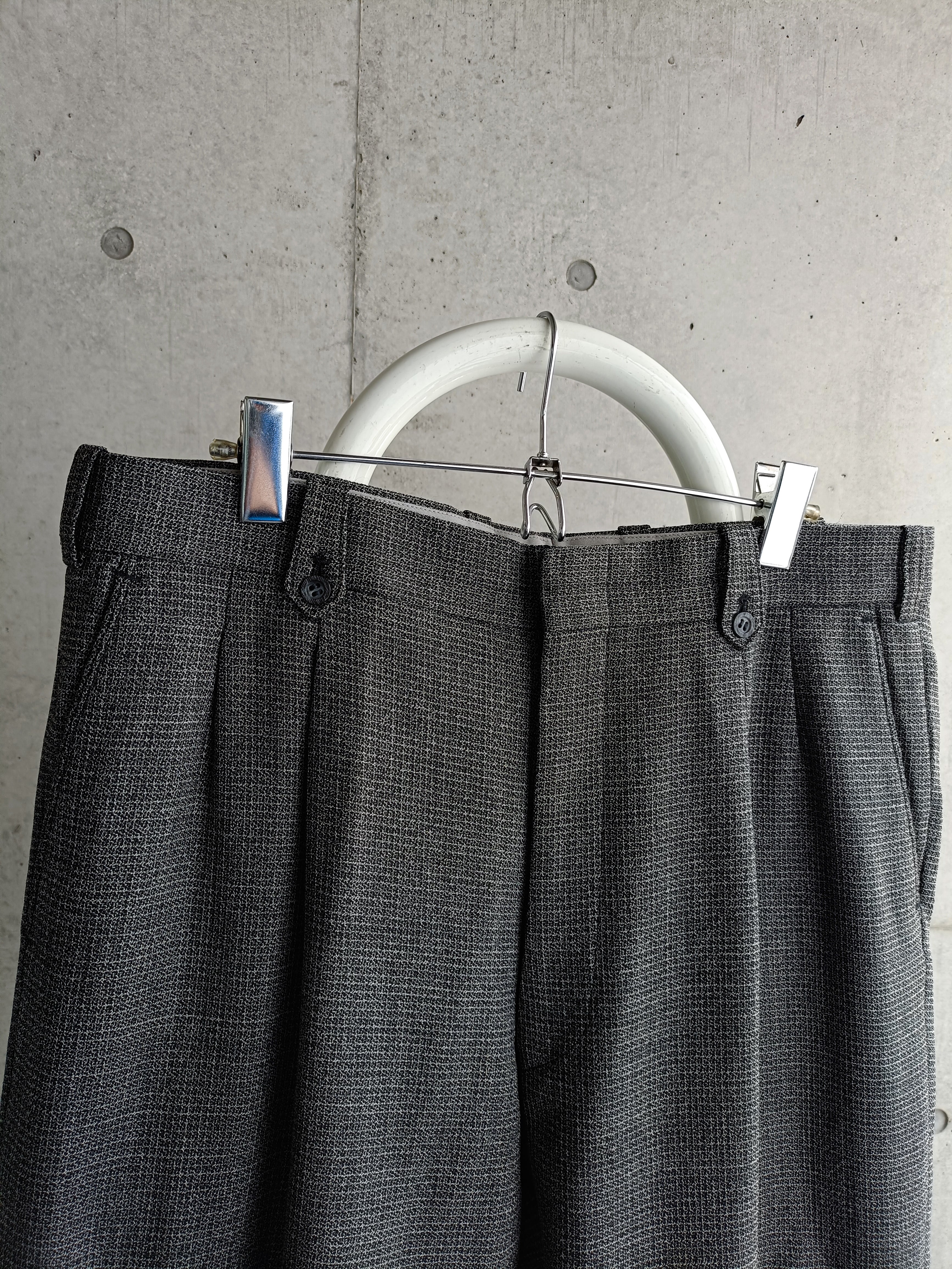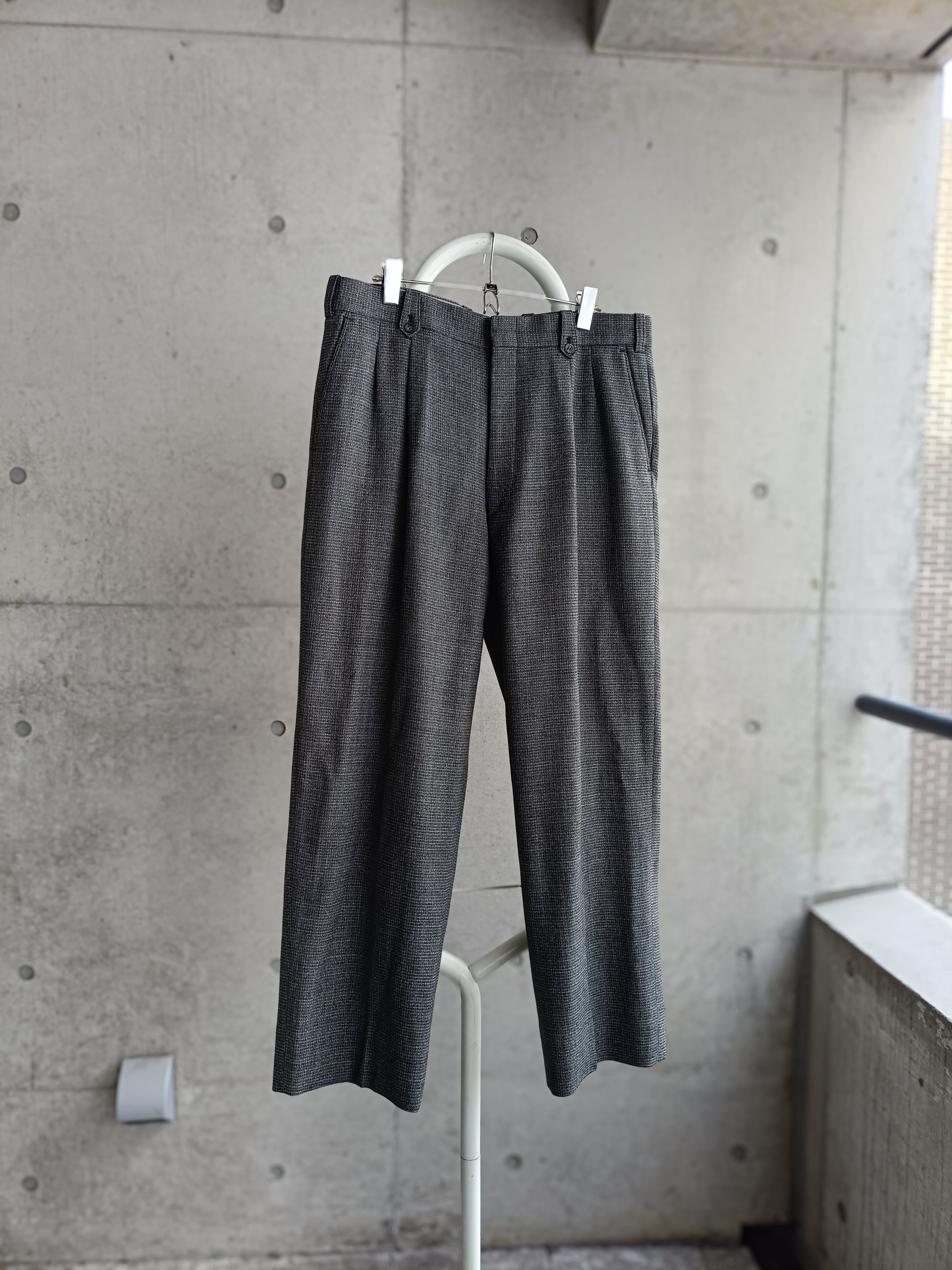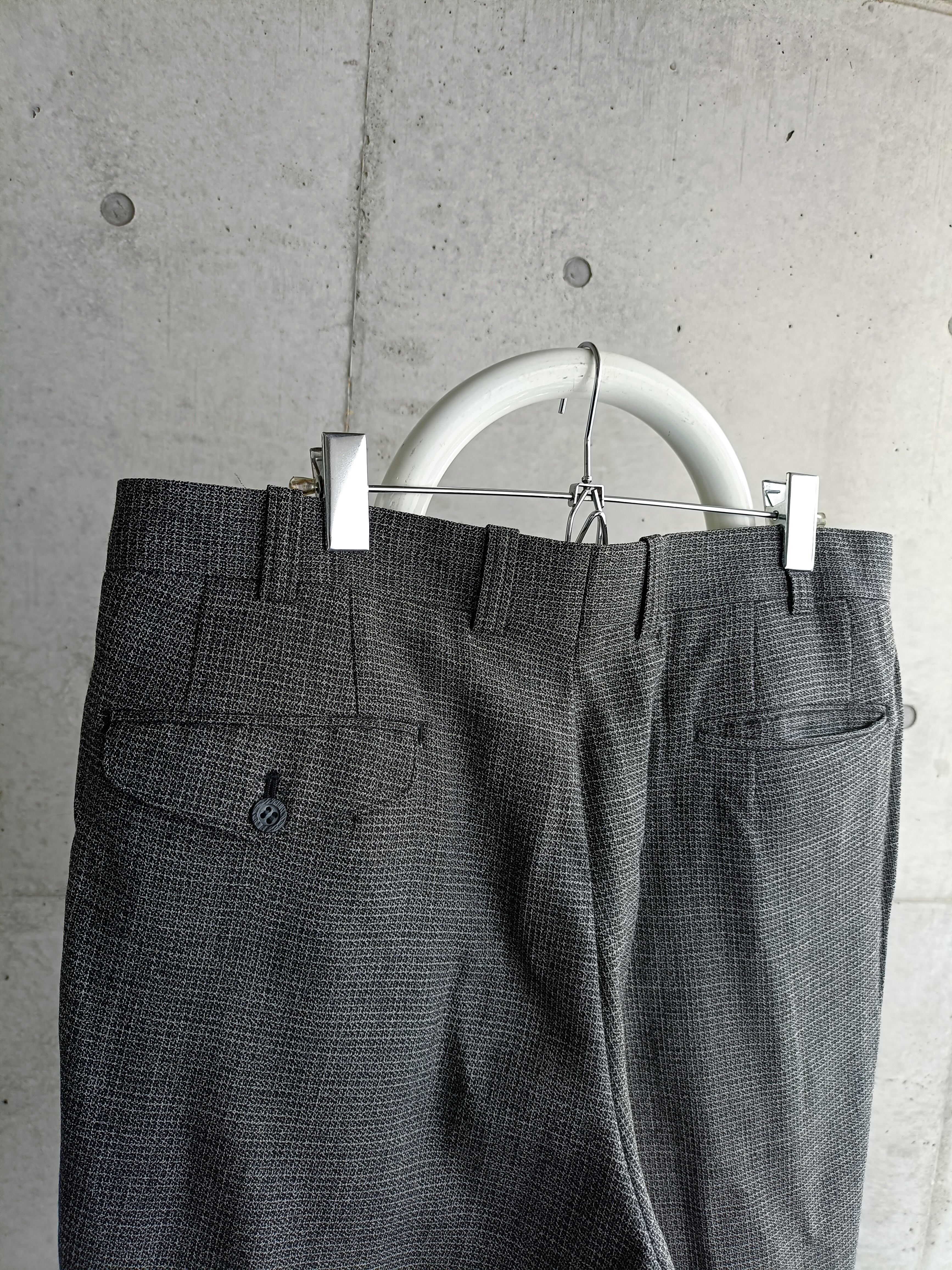 グレーとブラックの荒い織りのローゲージスラックス。通気性良くて、夏も履ける生地です。ボタン仕様のベルトループ。使い易いストレートシルエットです。