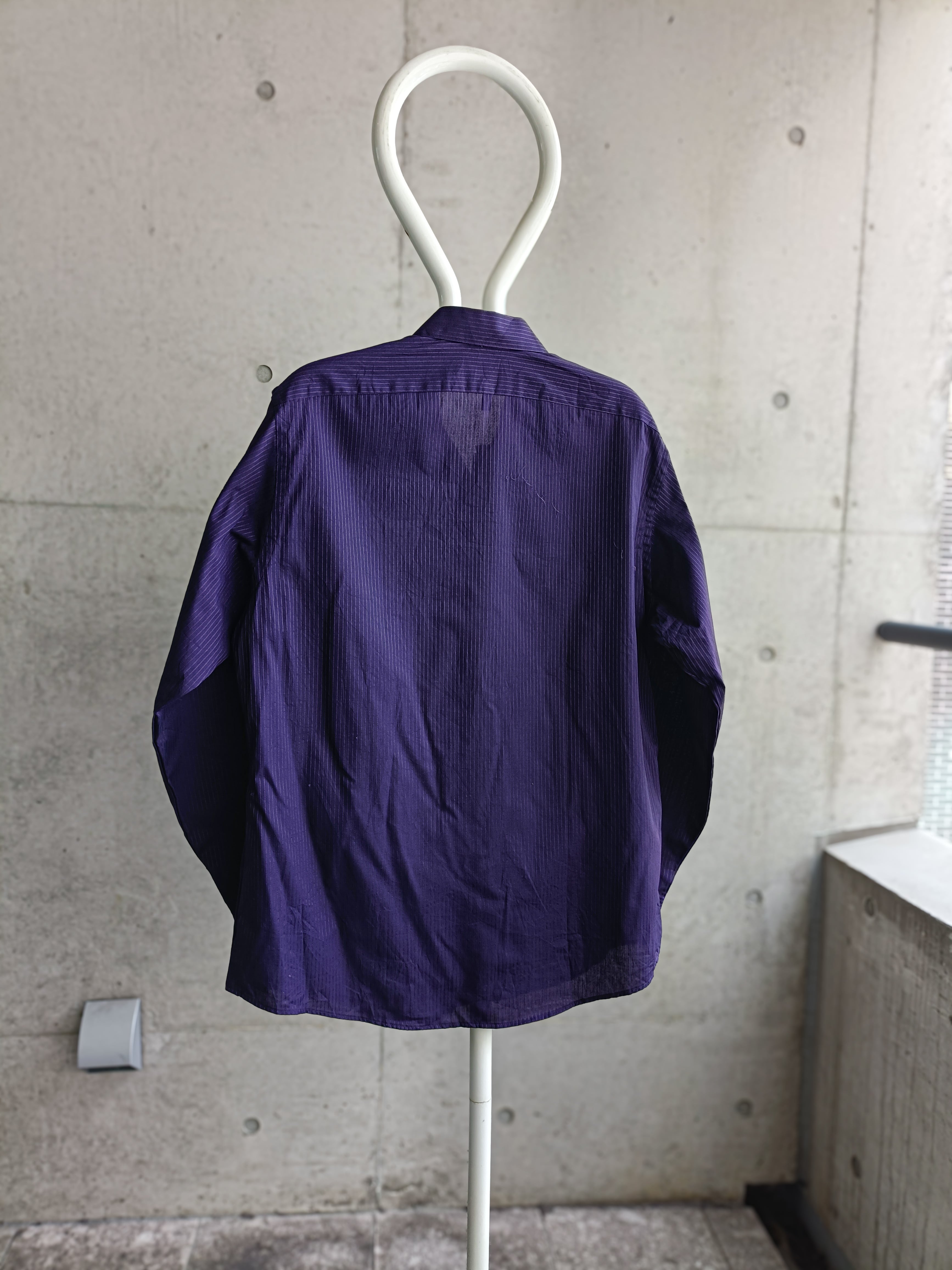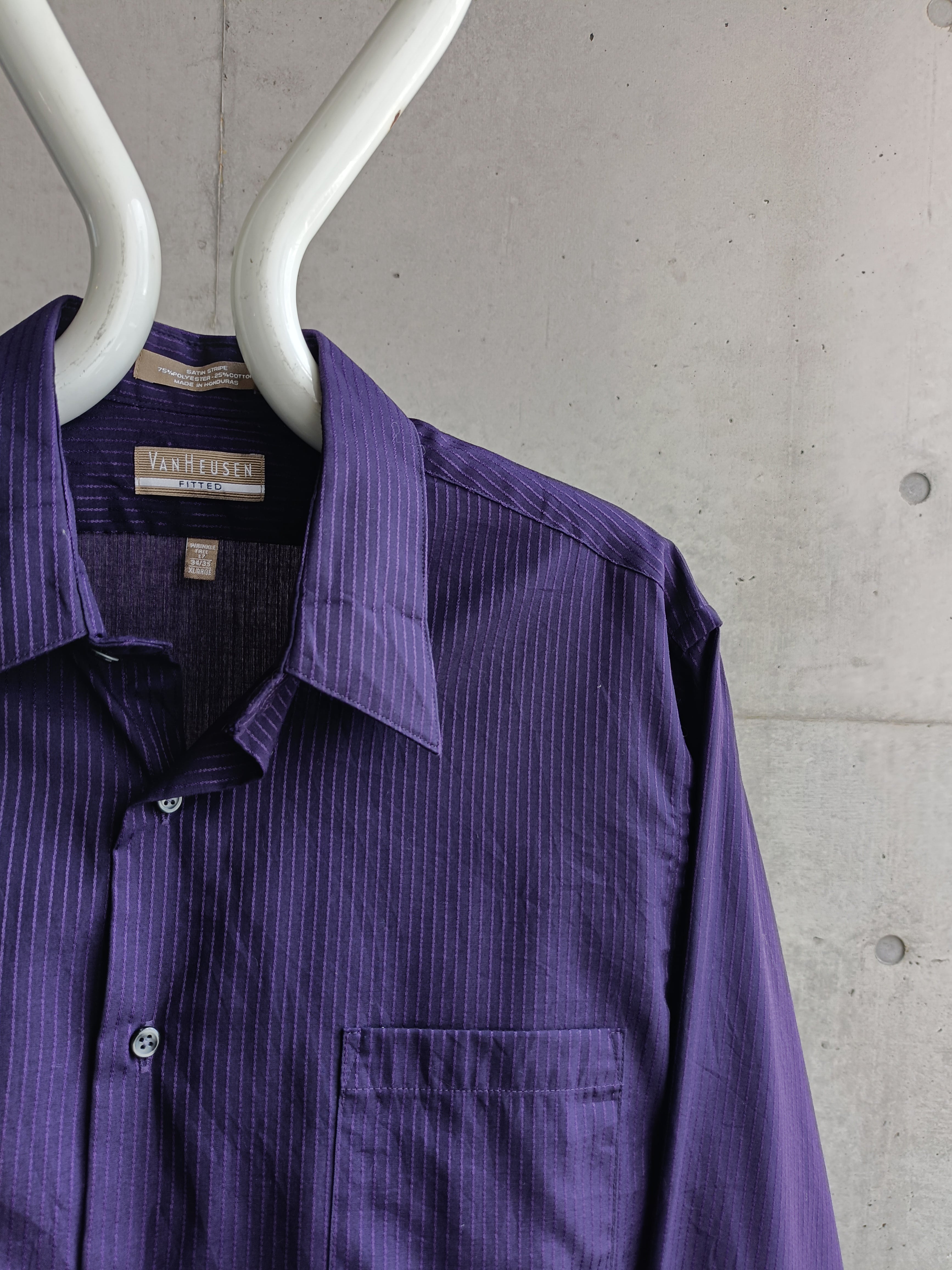 Van Heusenのシャツ。暗いパープルカラーのストライプ。サテン織りのストライプ生地。シワの付きにくい生地なのもいいです。