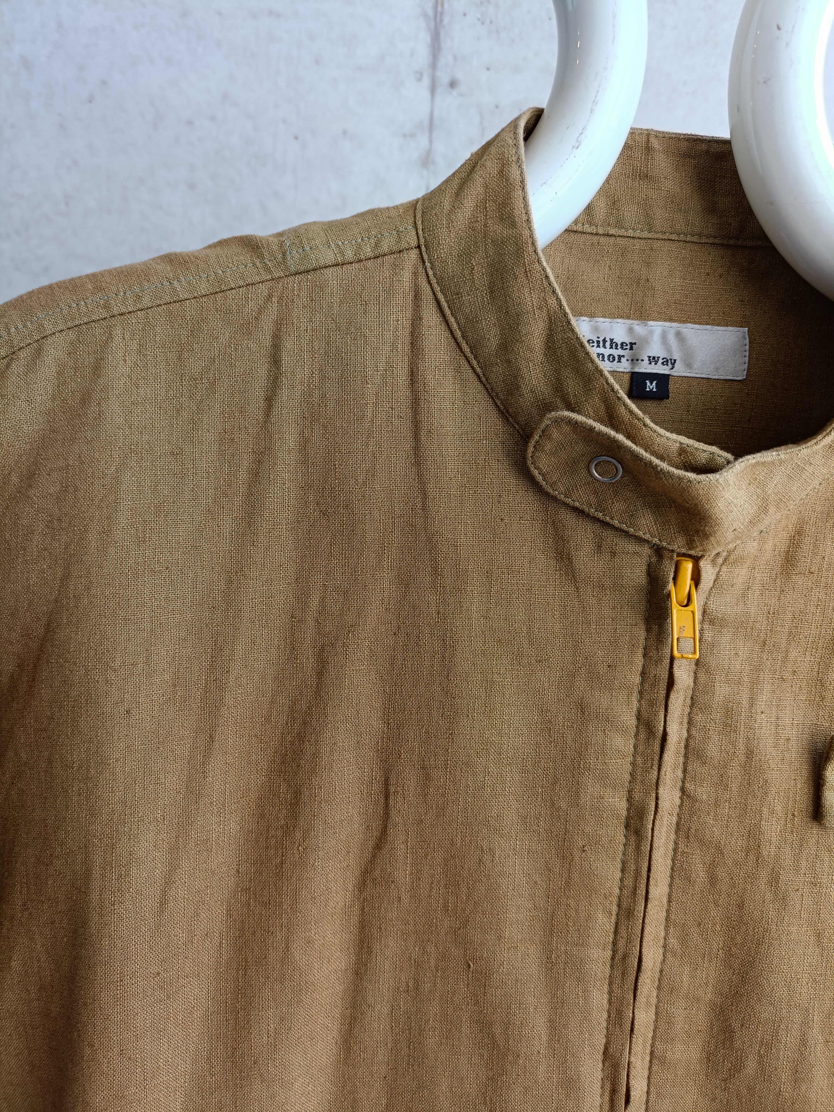 超スペシャル。ブラウンのリネンシャツ。片側のみの立体的なDポケット。袖はイエローのジップ仕様。こんなリネンシャツ見たことないです。