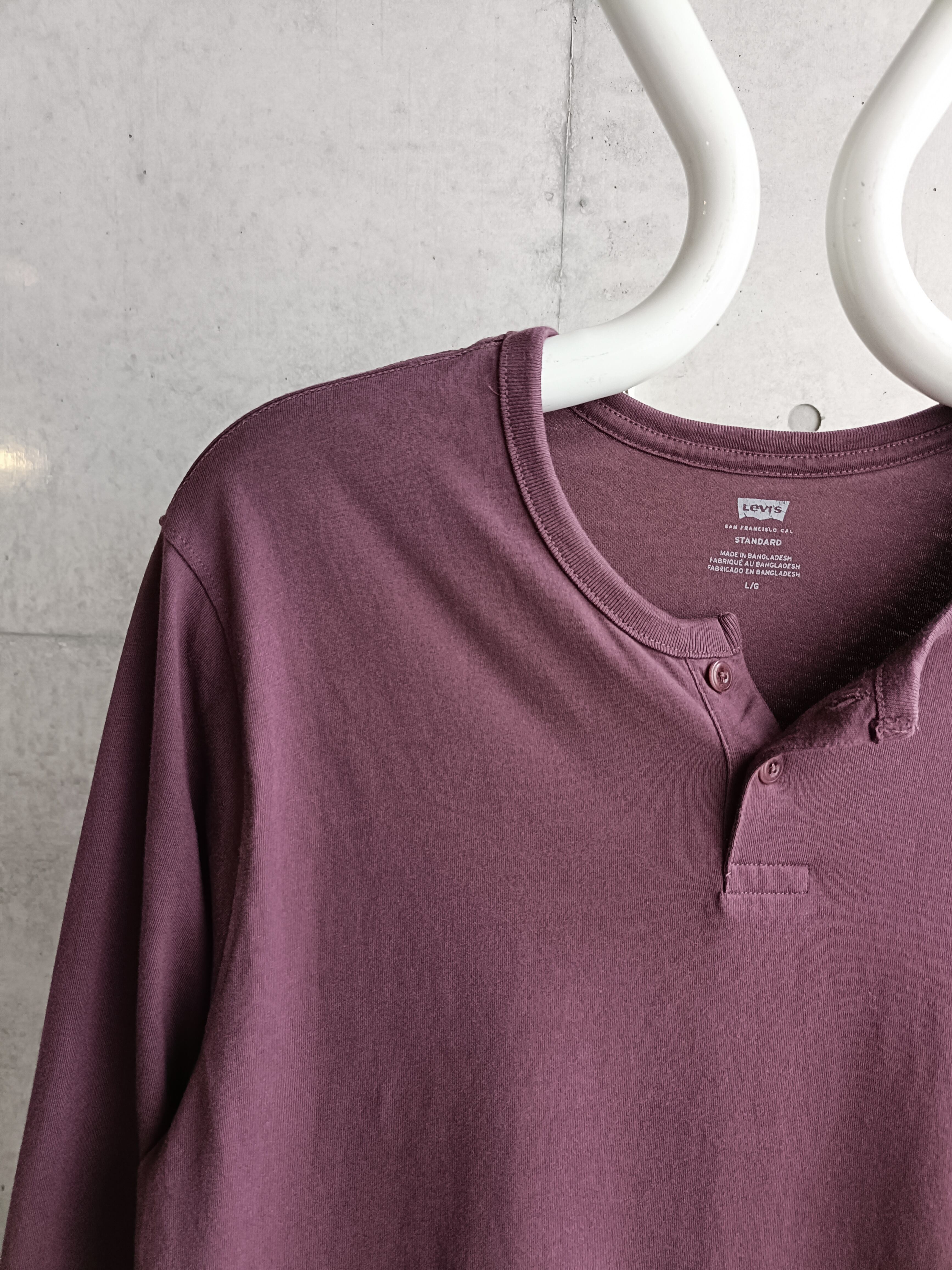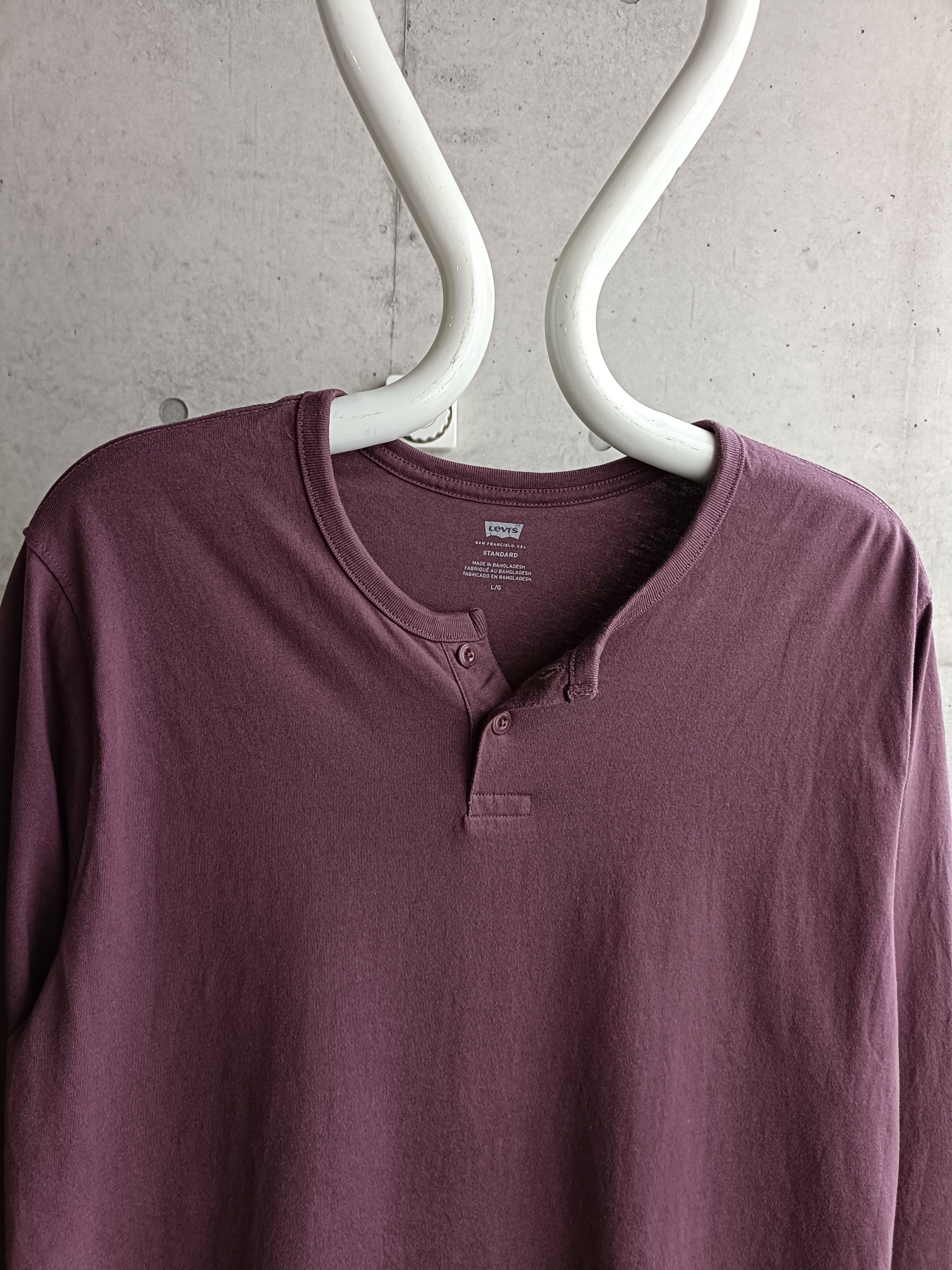 リーバイスのヘンリーネックロンT。スモーキーパープル。とろみのある生地で着心地抜群です。春夏に重ね着、レイヤードで活躍してくれる色味。