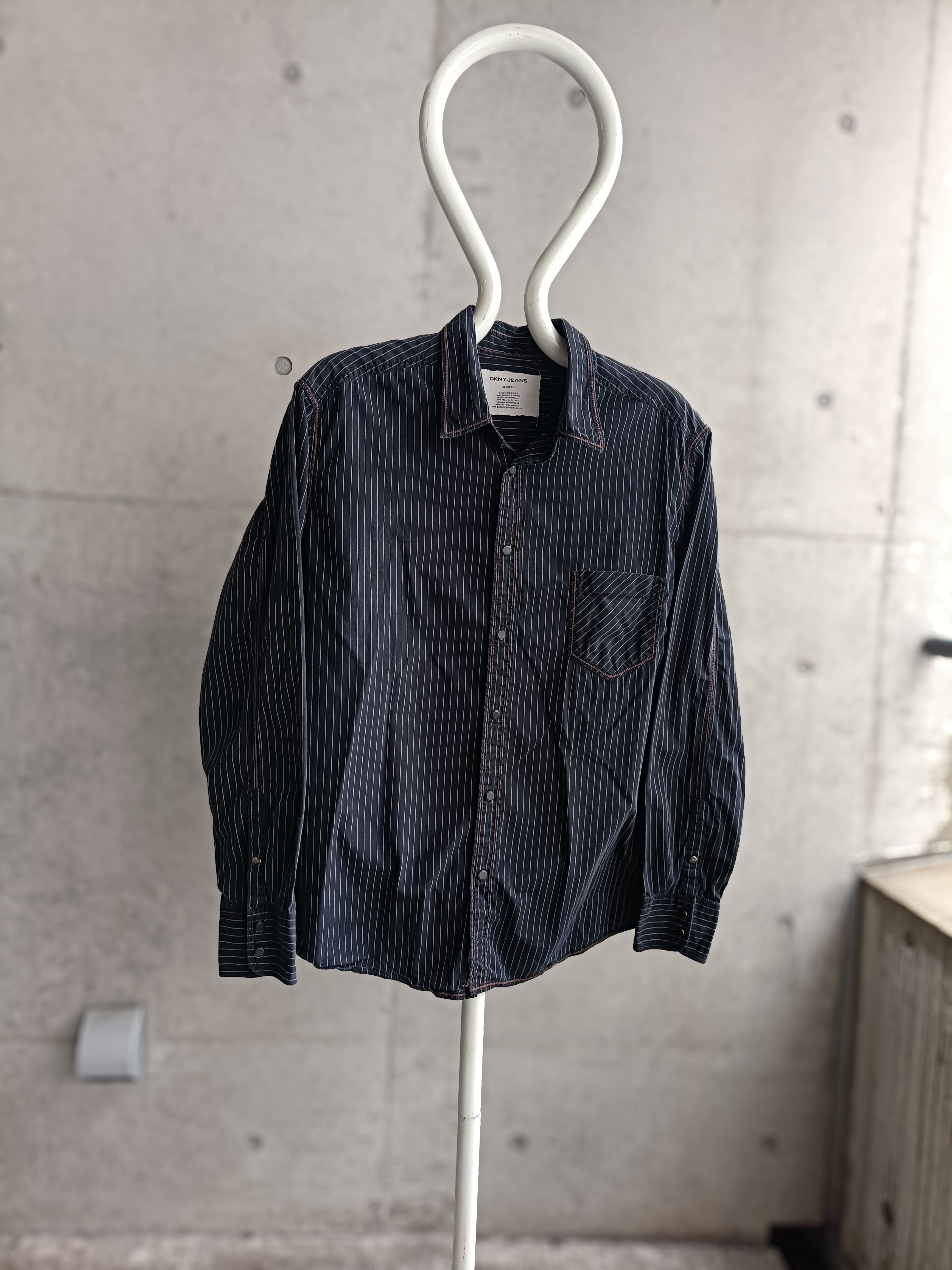 DKNYのストライプシャツ。襟、前たて、ポケットなどにブラウンのチェーンステッチが施されたデザイン。背面も抽象的なデザインがチェーンステッチで描かれてます。DKNYらしい一工夫されたストライプシャツです。