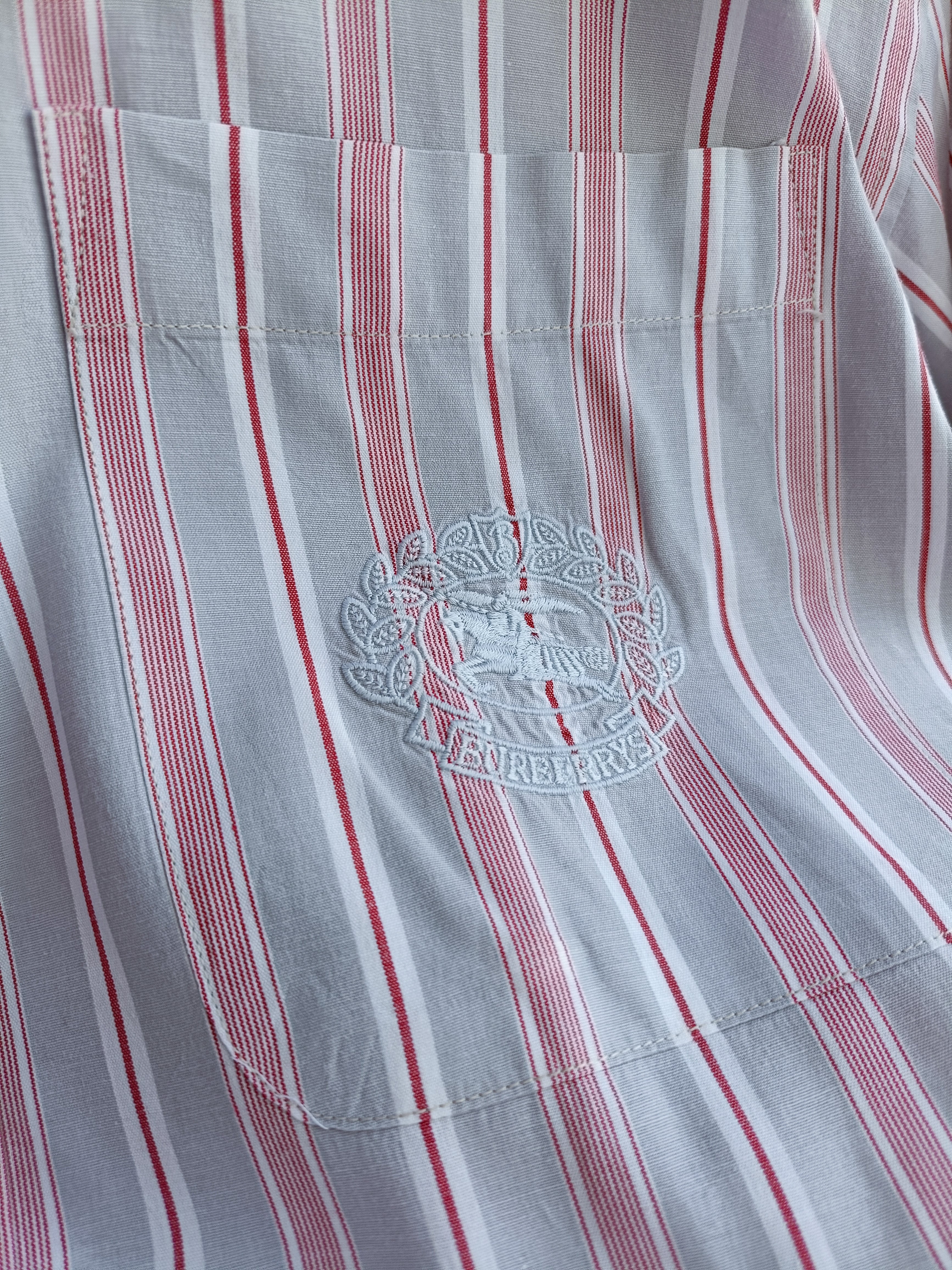 BURBERRYのストライプシャツ。珍しい赤系のストライプで、超デカロゴ刺繍。182cmメンズが着てジャストなサイズ。170cm前後の方が緩く着れるサイズ感。