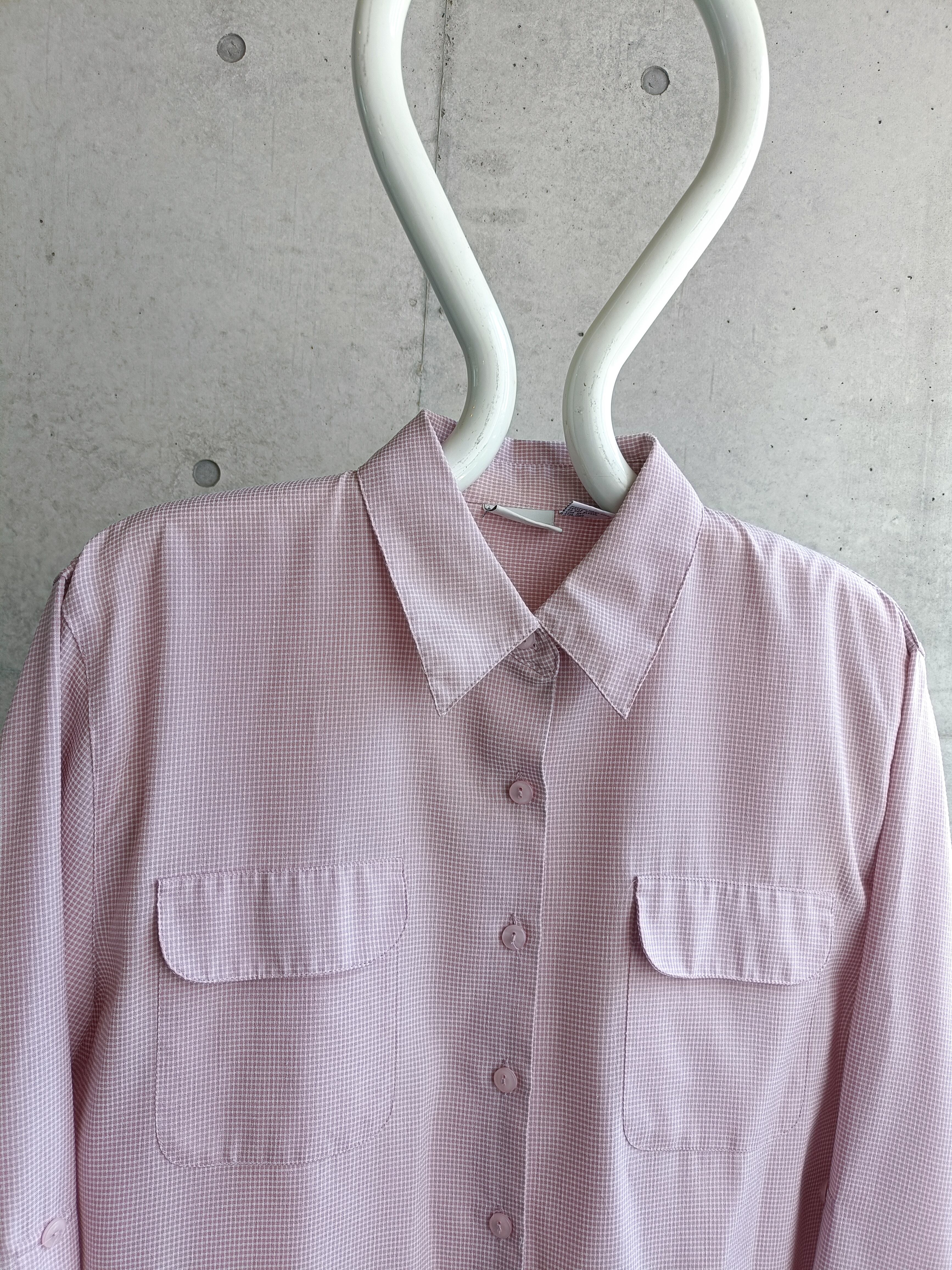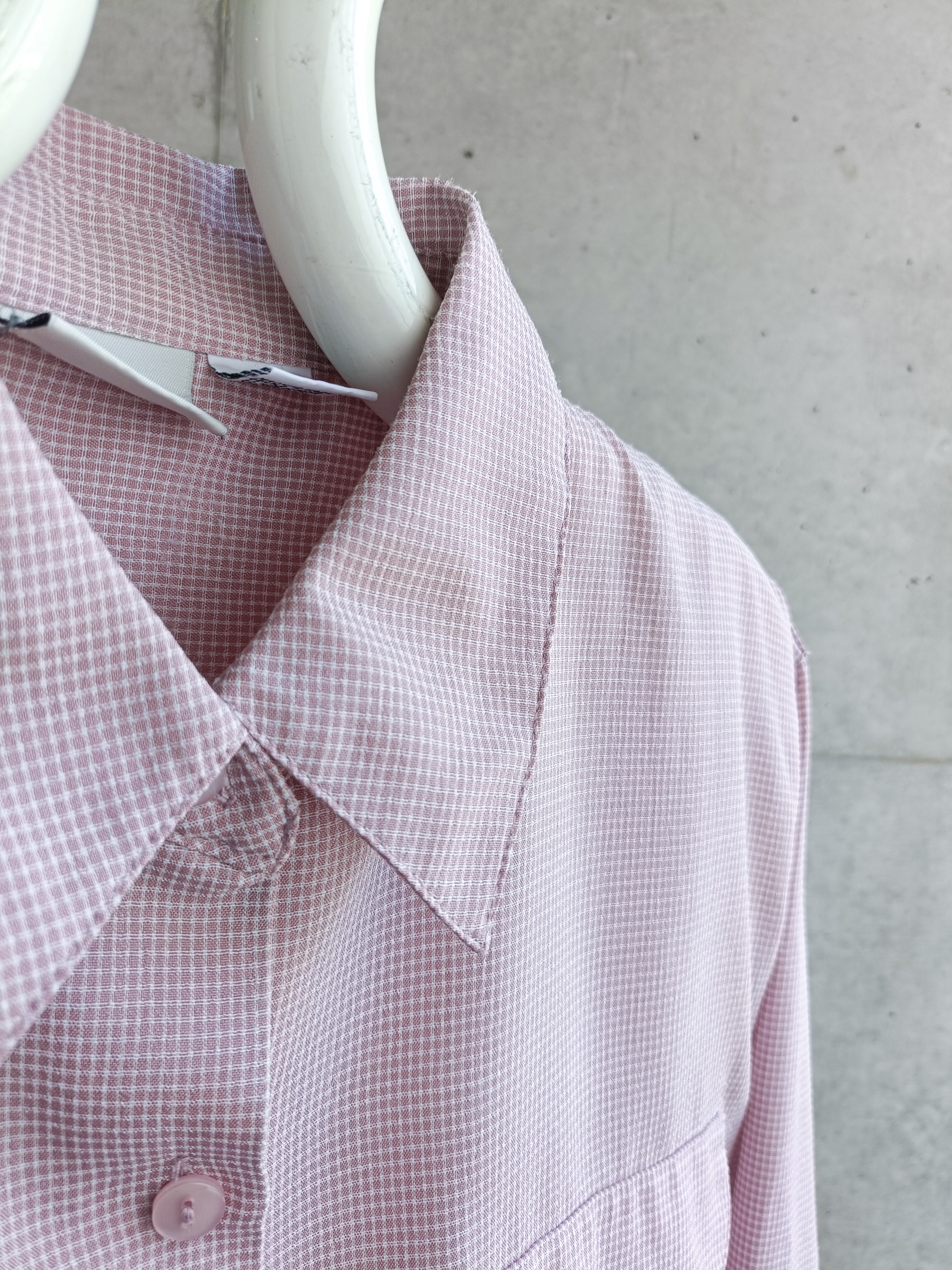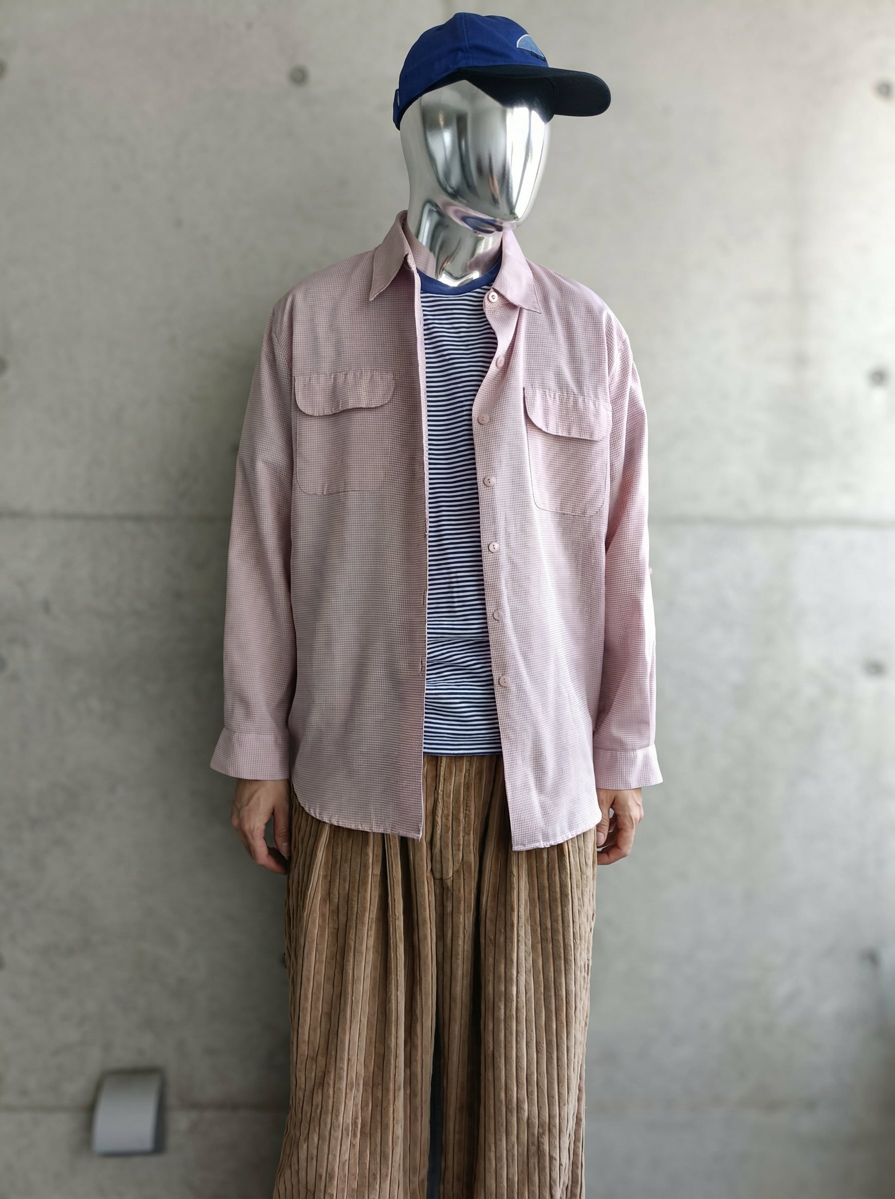 当店毎年イチオシのピンク色のシャツ。細かいチェックで、スモーキーピンク色。両胸フラップ仕様。レーヨン混でドレープのある生地です。色や素材に注意したら、ボーダーにチェック合わせて柄×柄にしても違和感なく着れます。