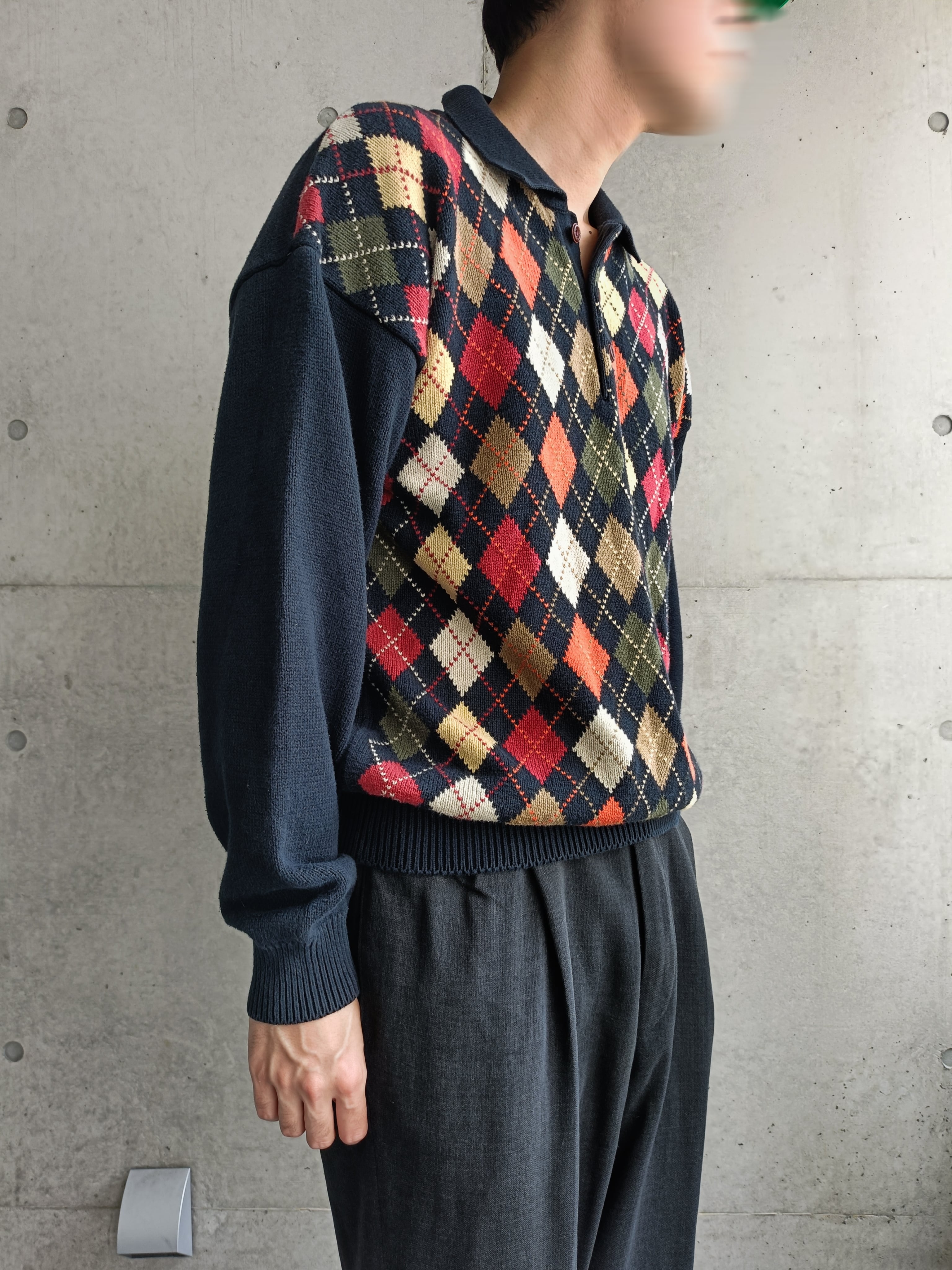 スペシャルなニットポロ。うちらしいマルチカラーのアーガイルニットポロ。ベースはブラック。コットンで柔らかいです。デニムジャケットにも、ライトアウターにも合います。