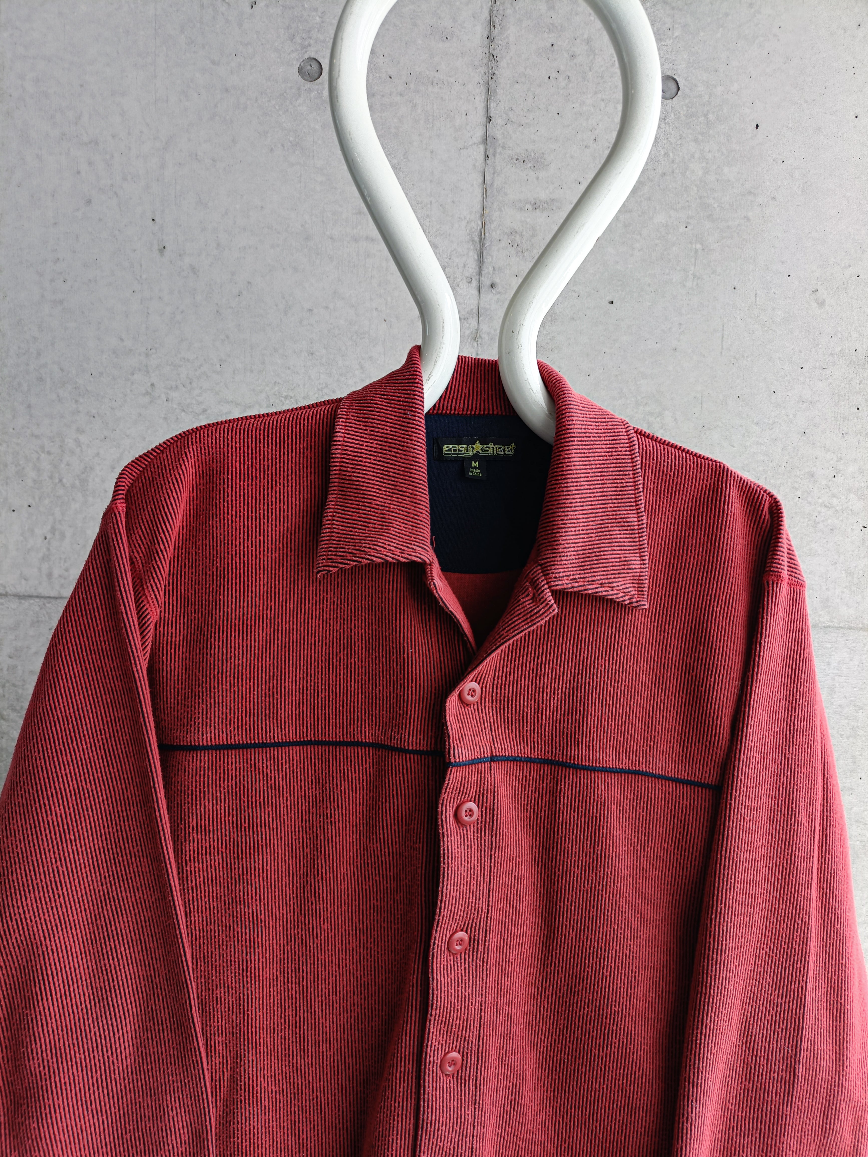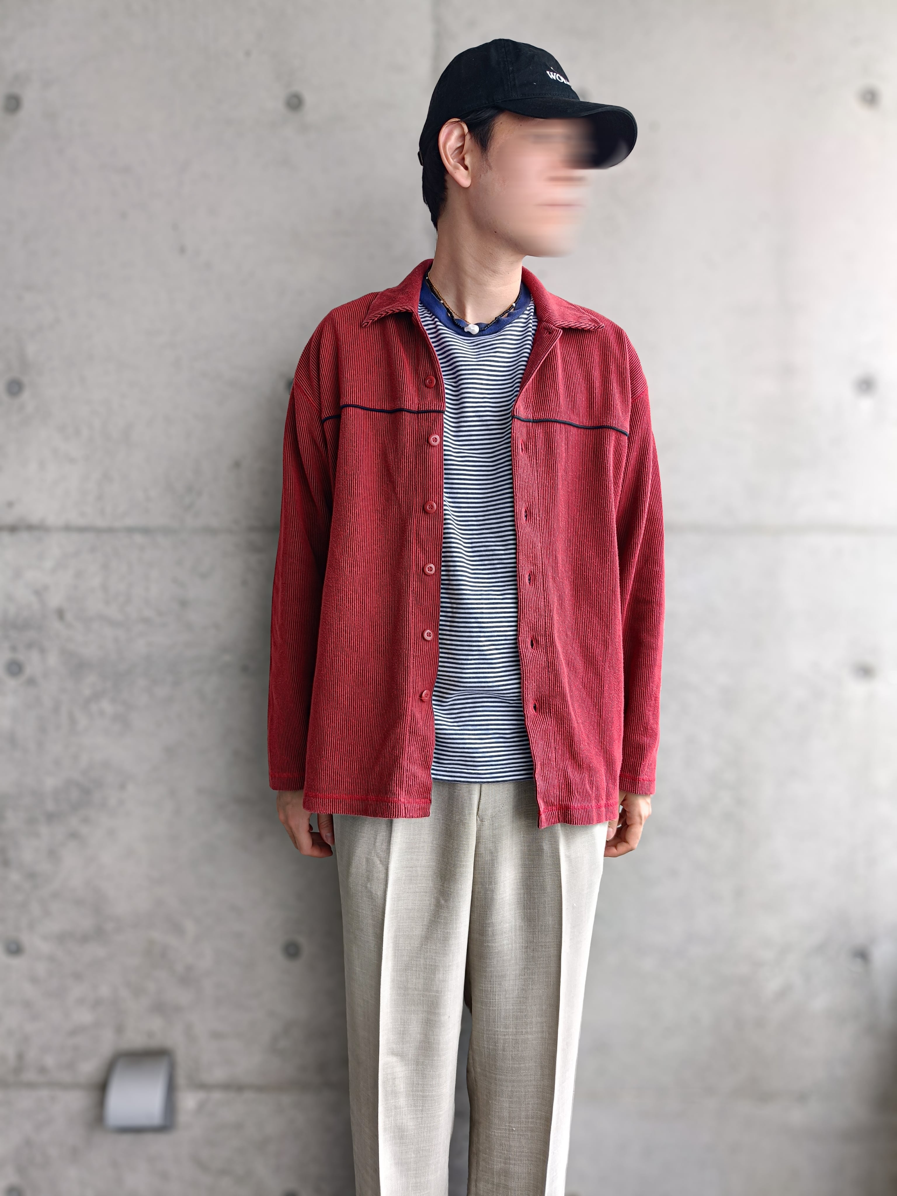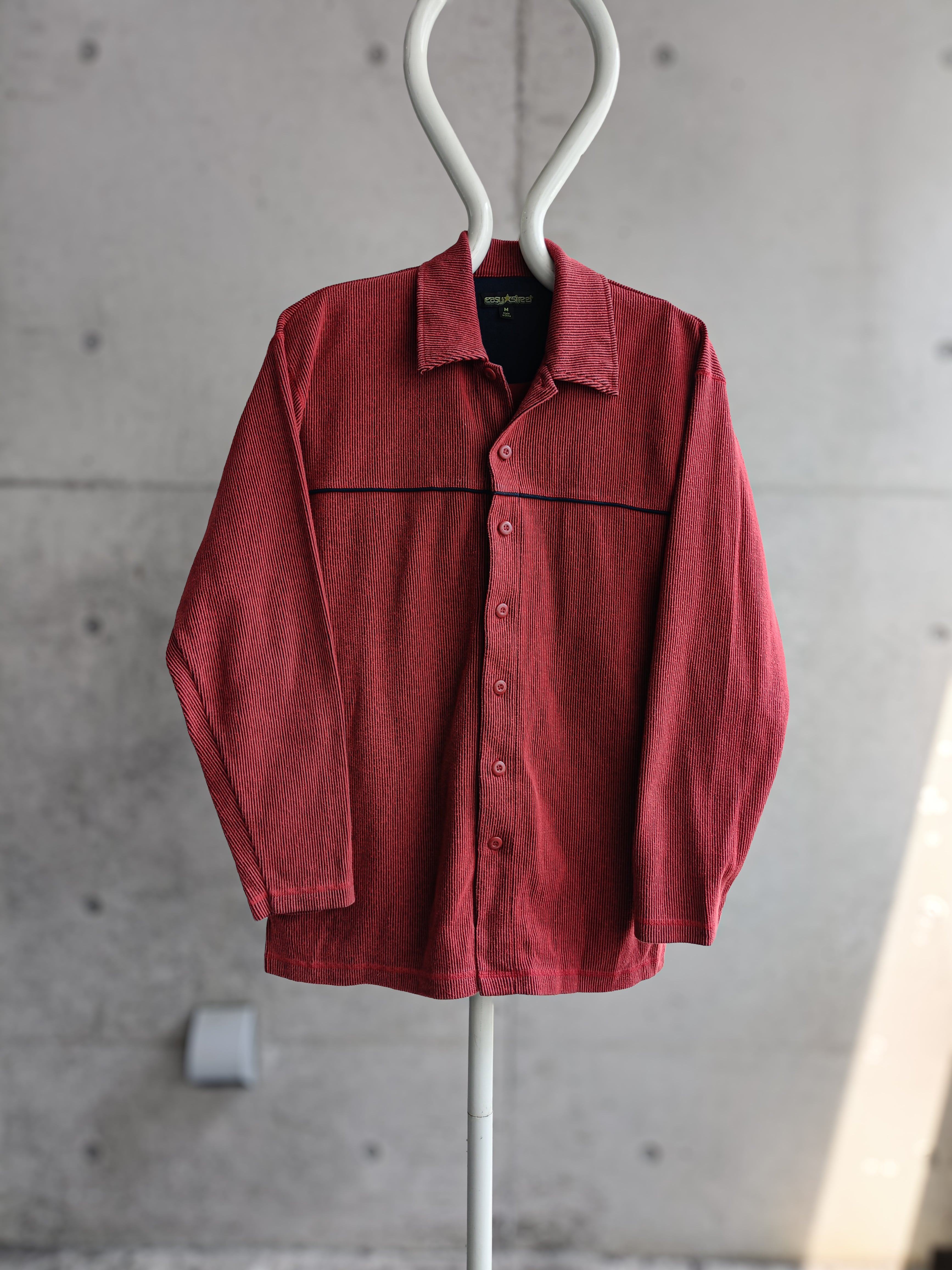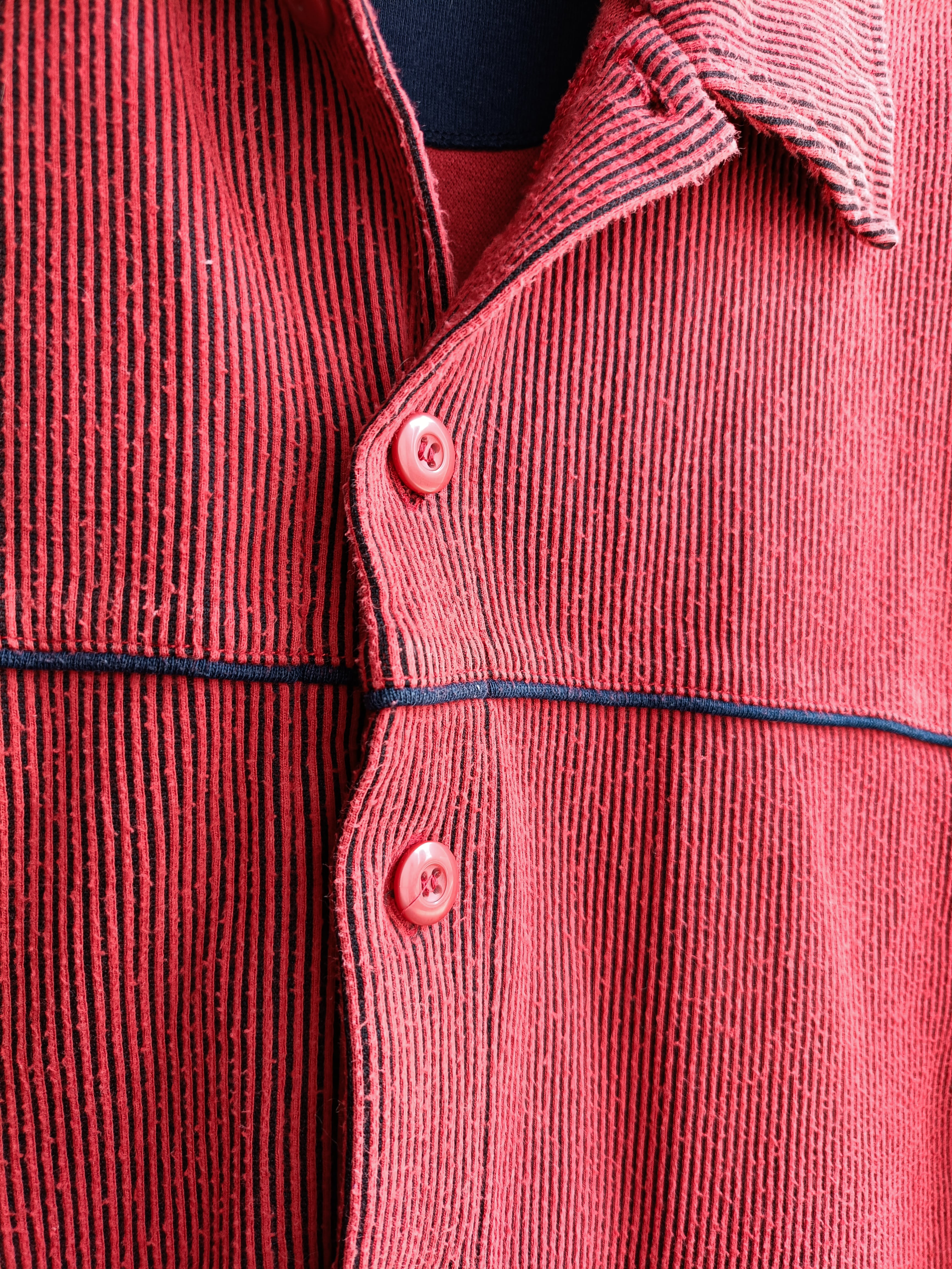 くすんだ赤のリブシャツ。うちらしい生地に拘ったシャツ。リブ生地で、凹部分がブラックです。この生地でシャツを作る遊び心が好きです。