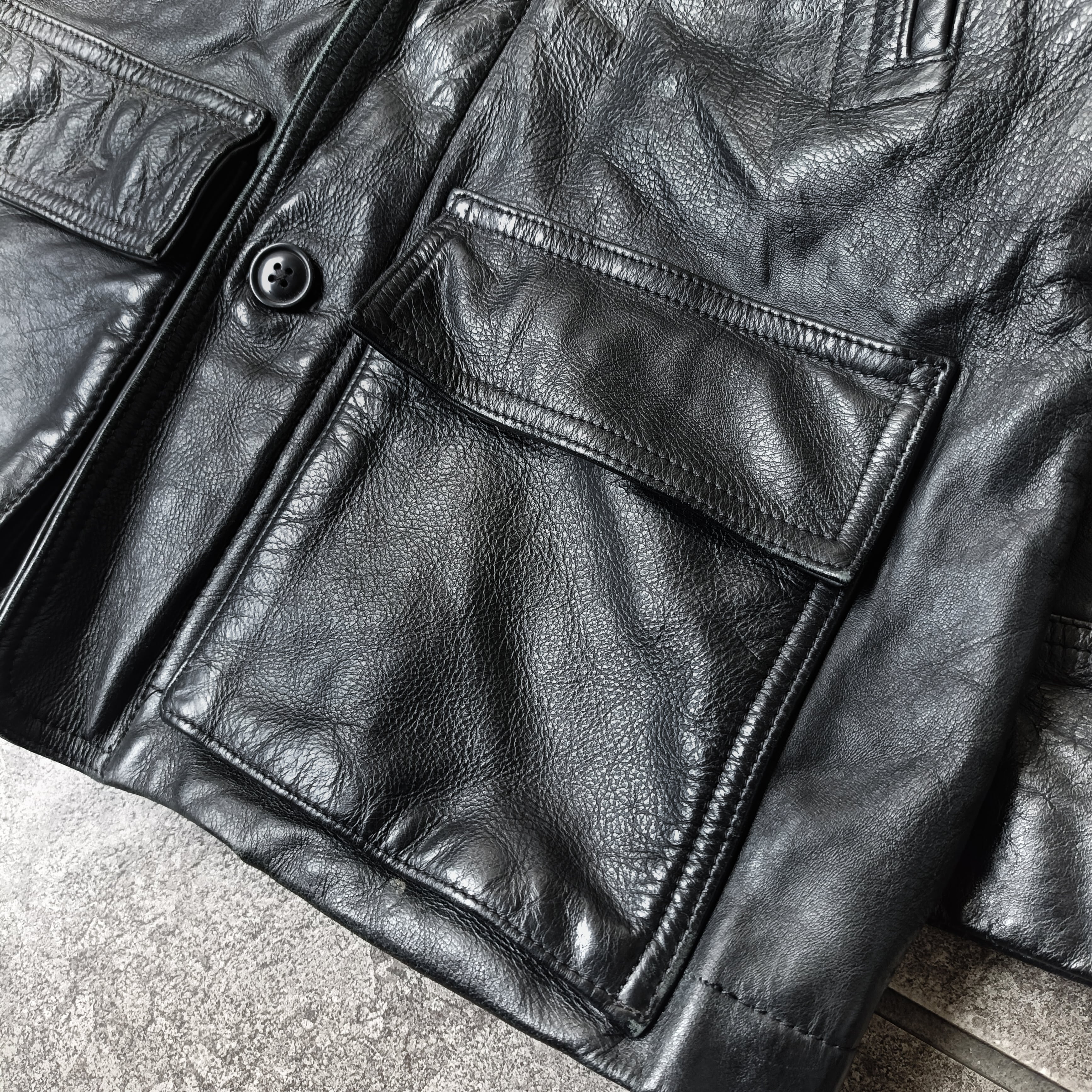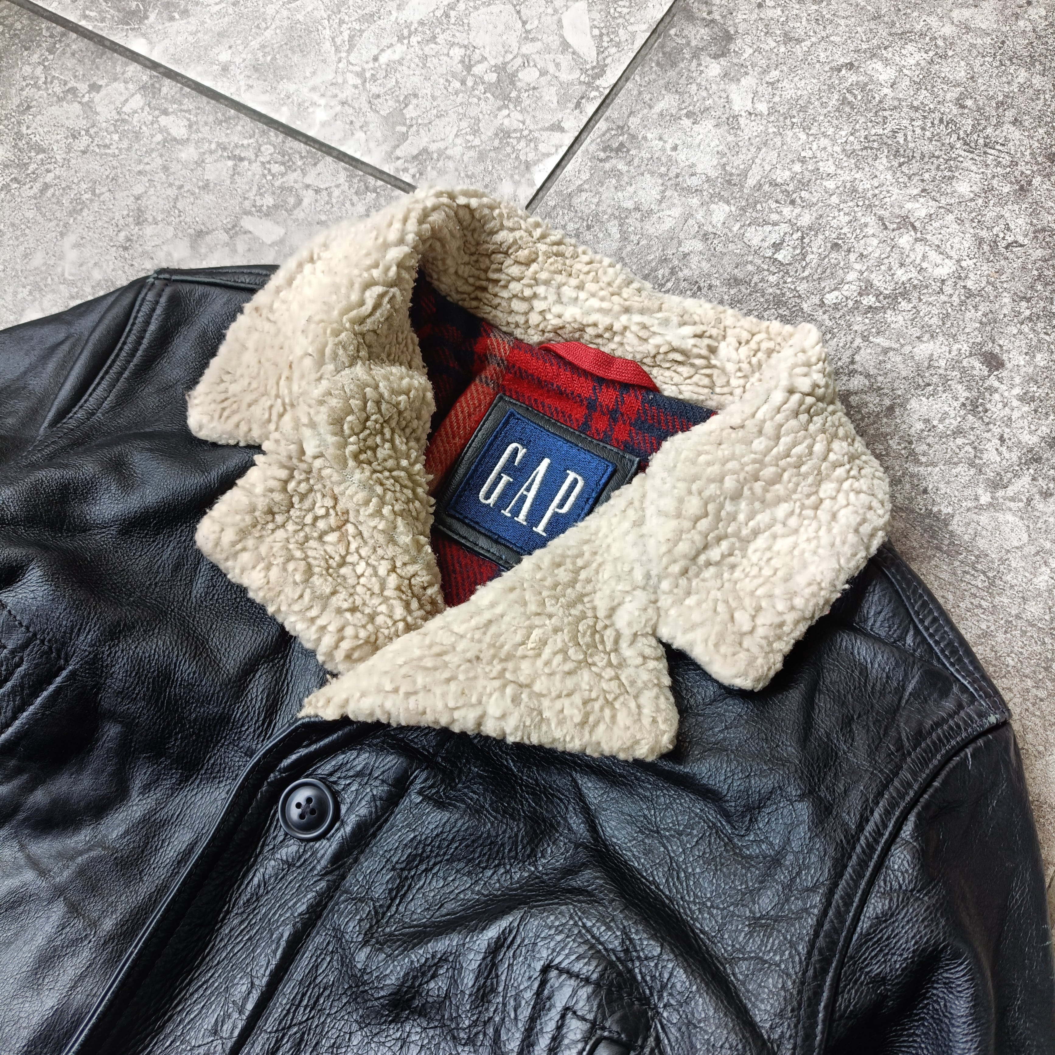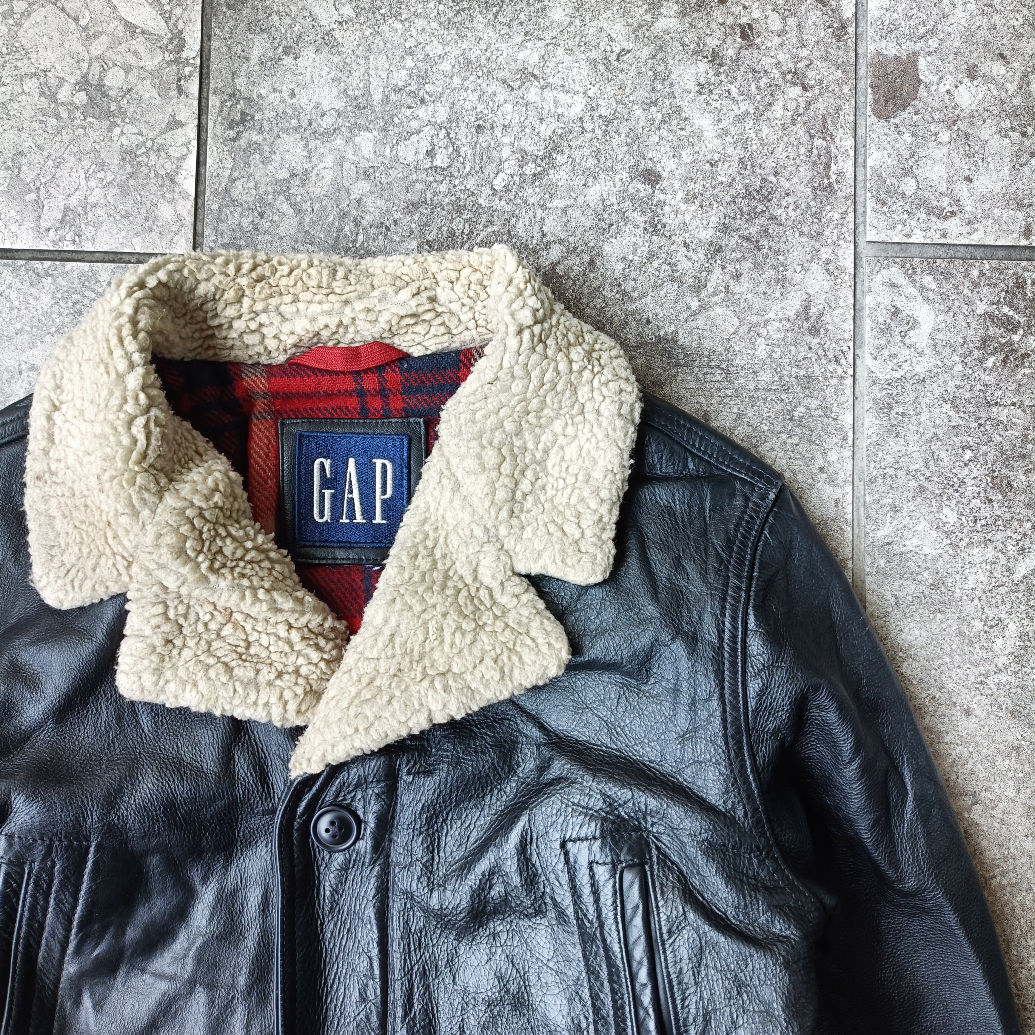 オールドGAPのブラックレザーブルゾン。襟ボア仕様。裾にポケット付き。革質も良好で完璧。小柄なメンズ、レディース向けサイズです。