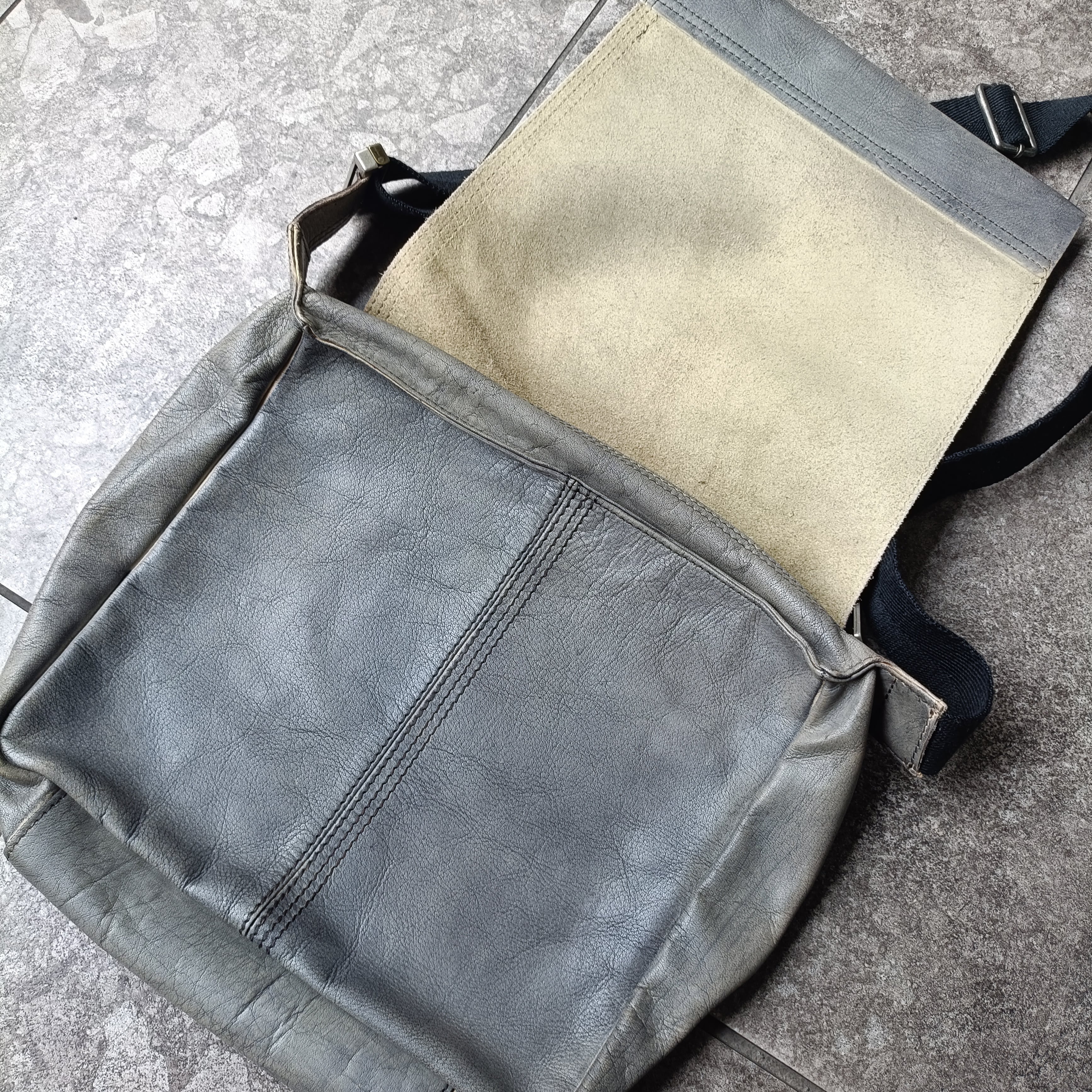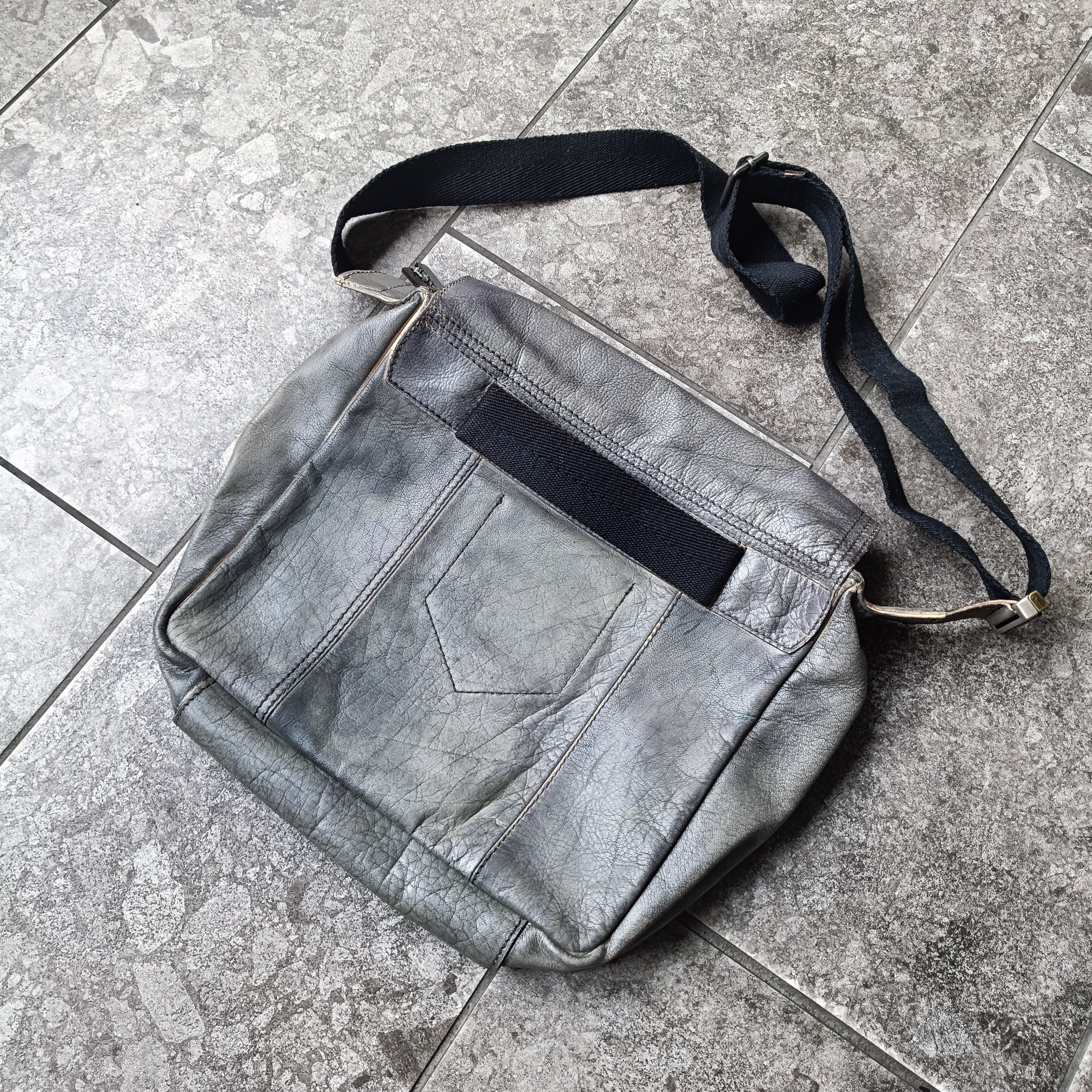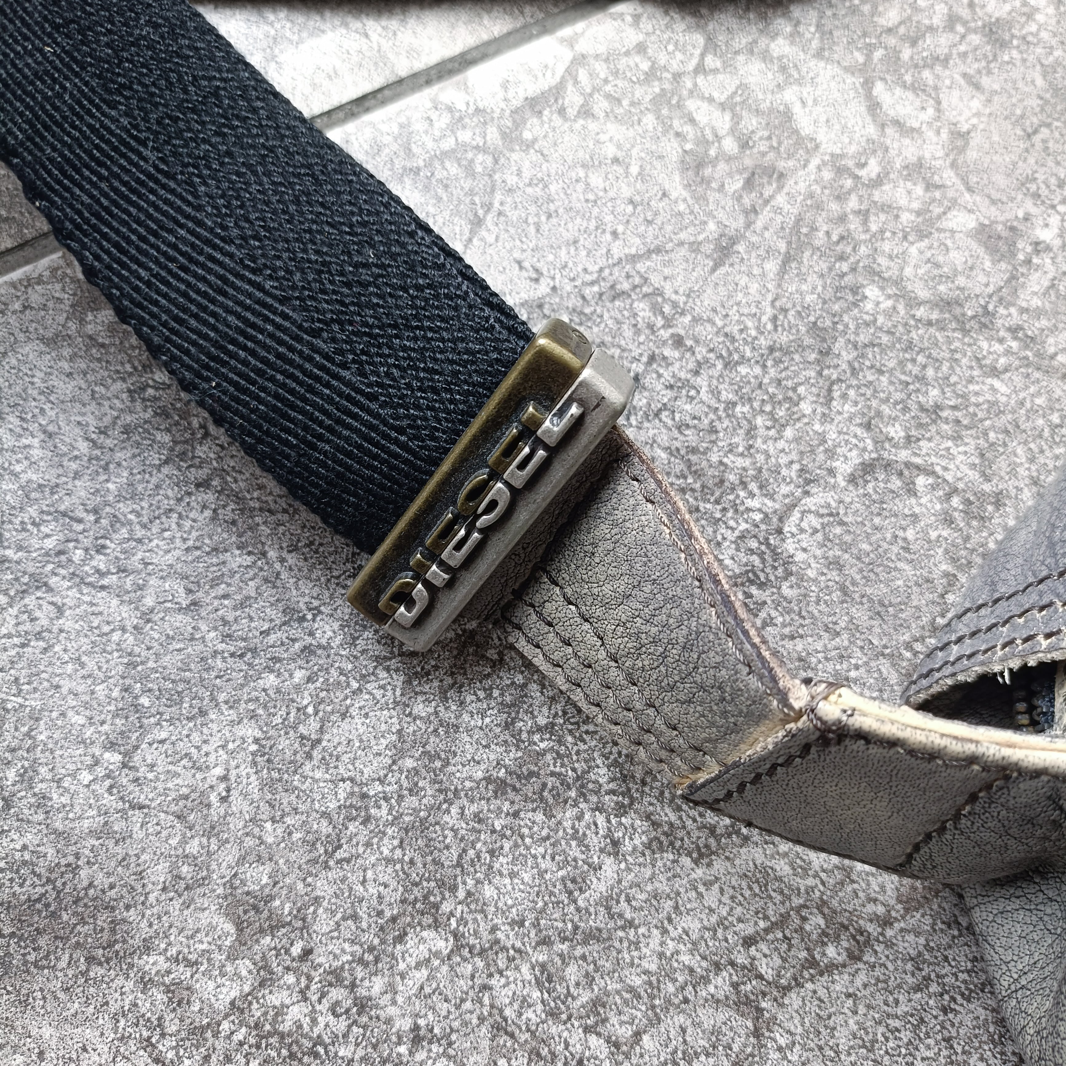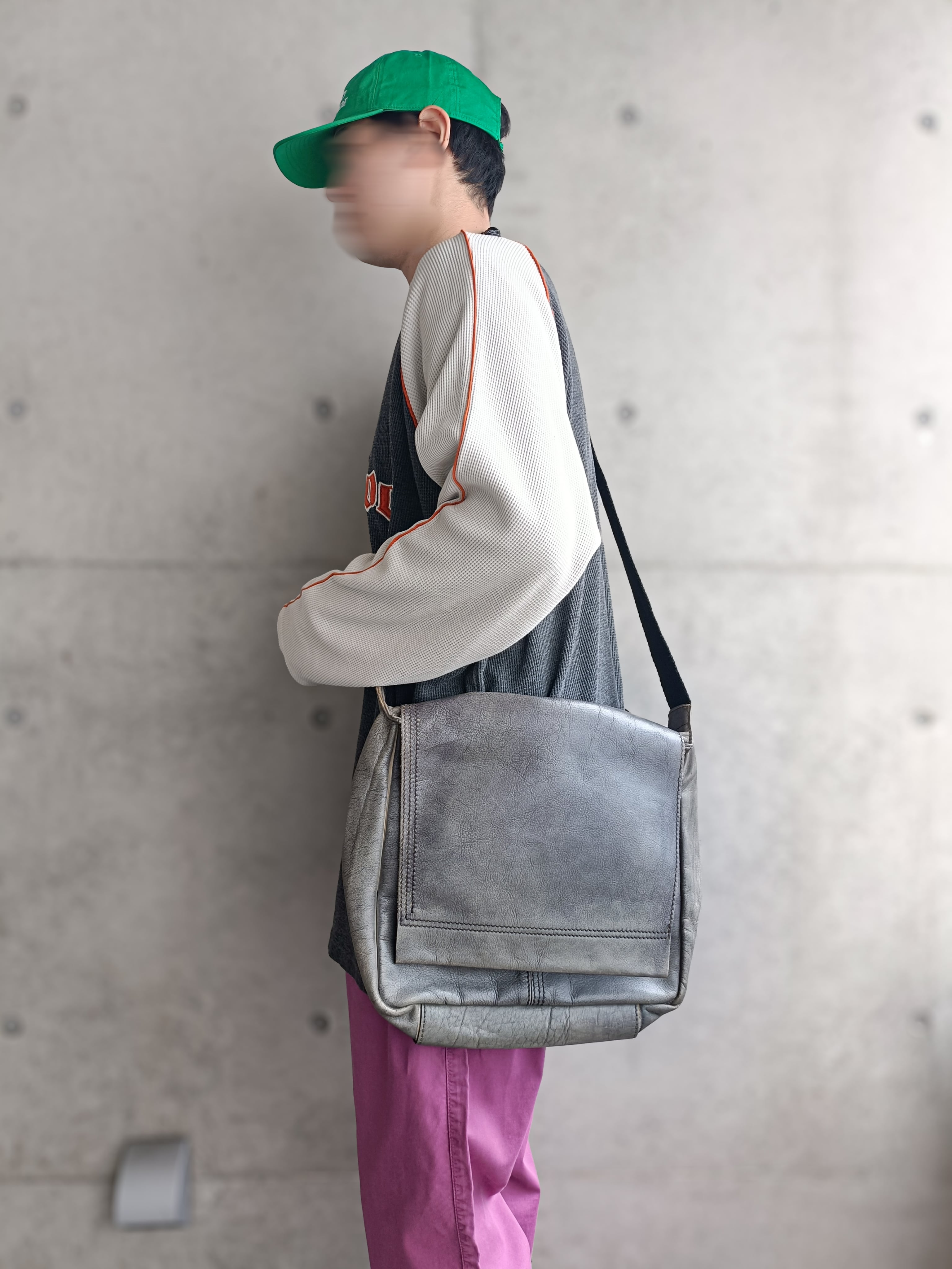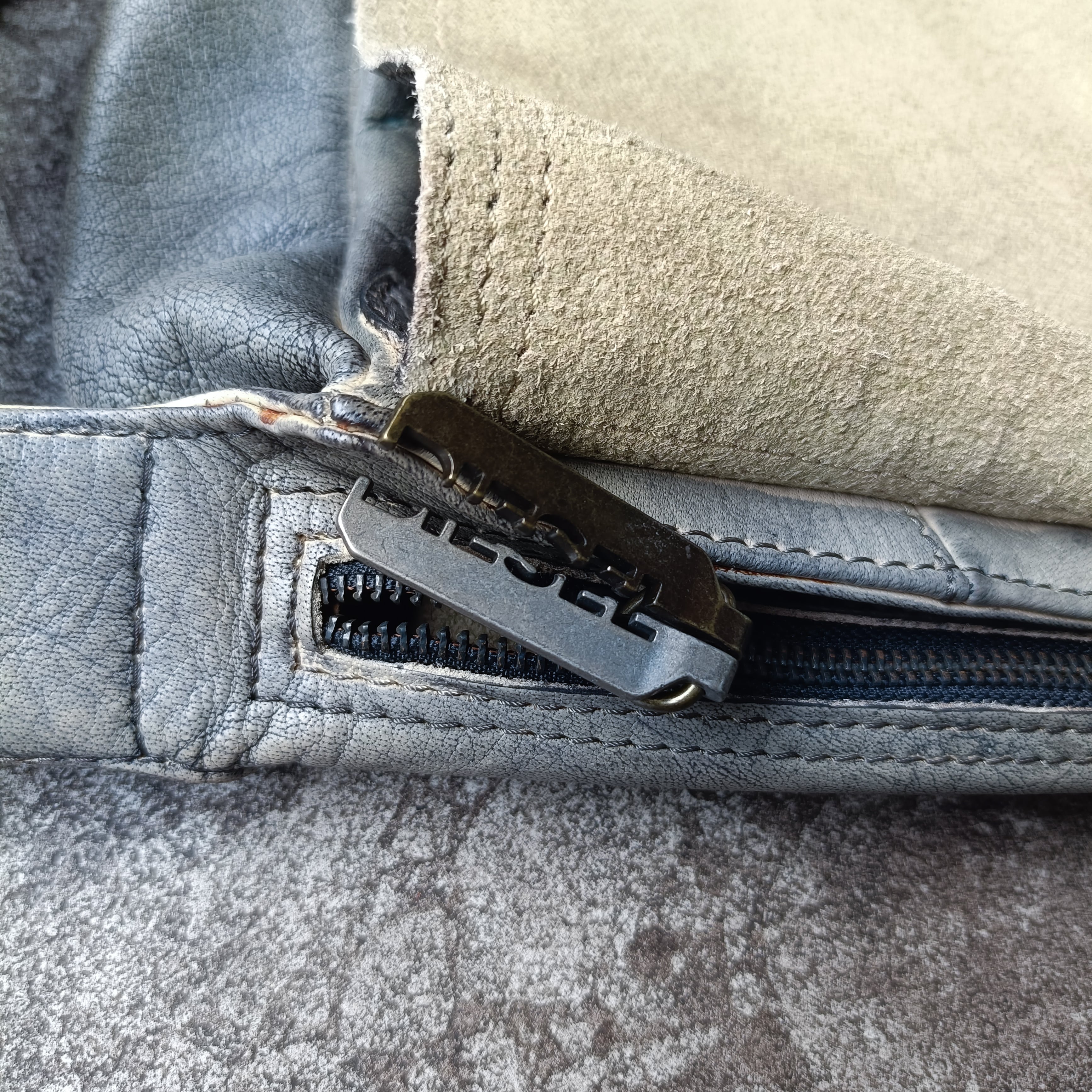 超スペシャル。DIESEL得意のダメージ加工されたブルーのレザーショルダー。こんなかっこいいレザー見たことないです。ヴィンテージデニムのような美しい色落ち加工。ジップもロゴが割れたようなギミック。中の状態からして、殆ど使用されてないミントコンディション。