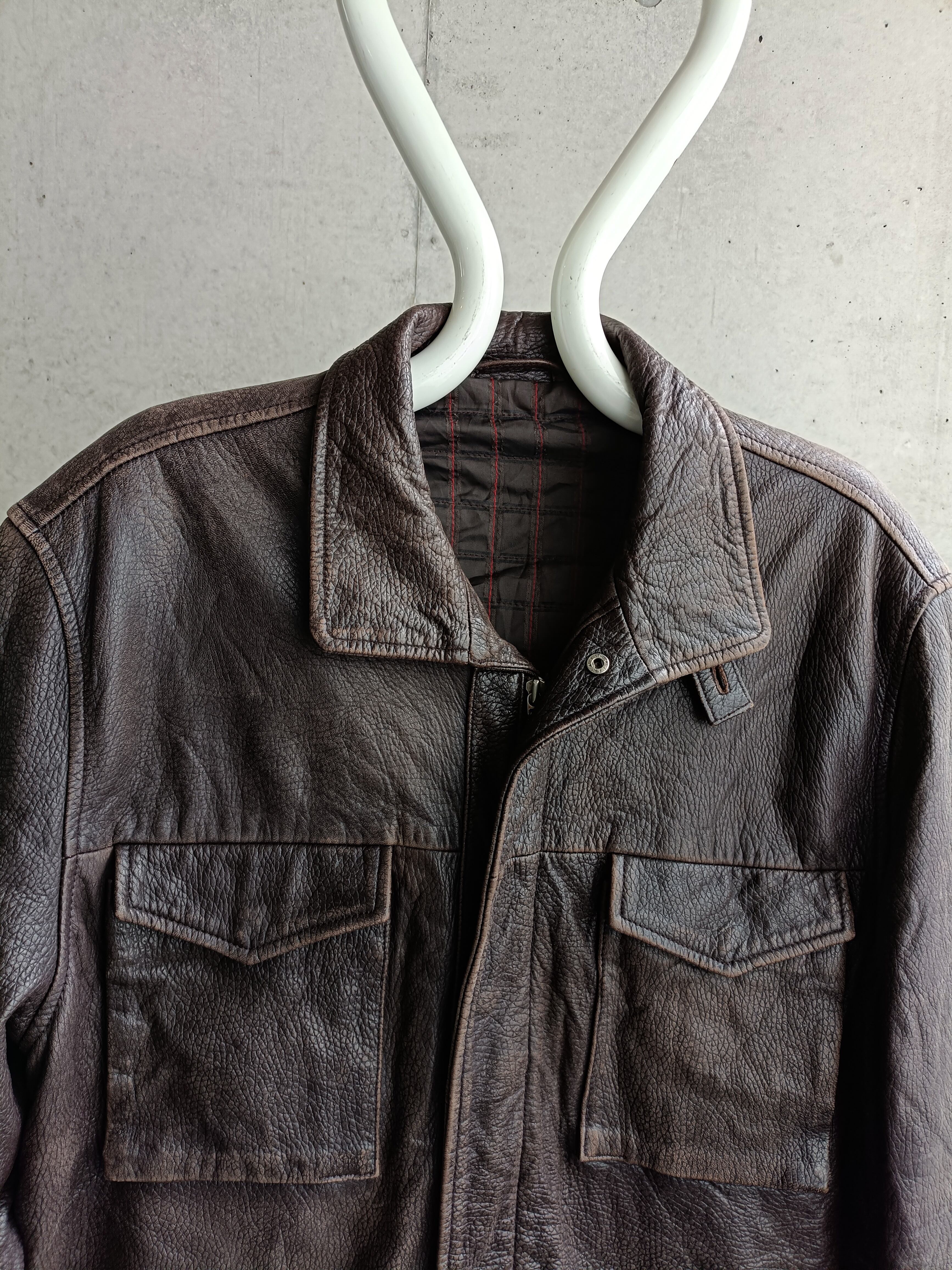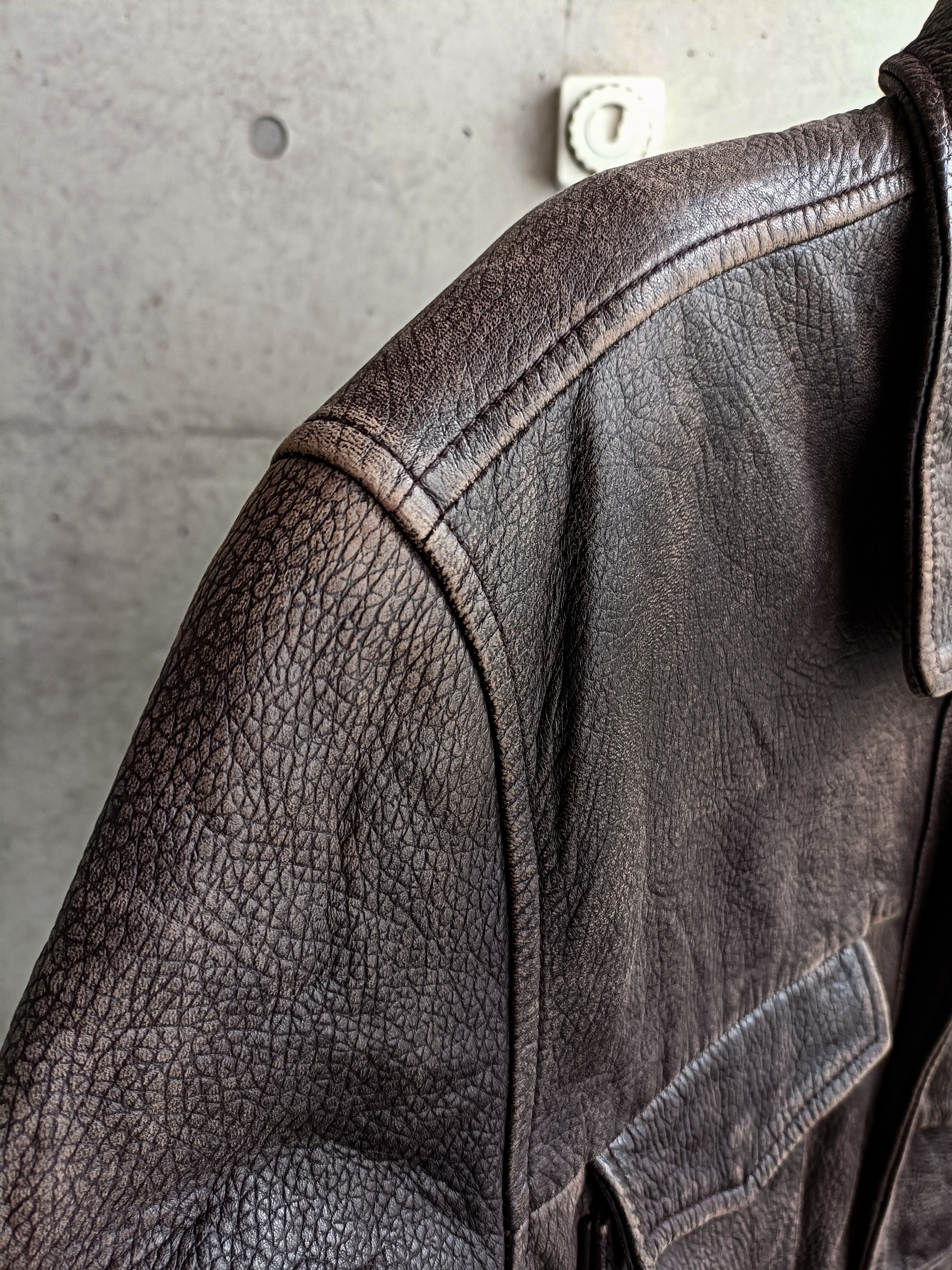 ブラウンのシボ革レザーコート。ミリタリーのファティーグジャケットをレザーで落とし込んだような形。ウエストにドローコード付きで、絞るのも凄くオススメです。凄く滑らかで上質な革質。