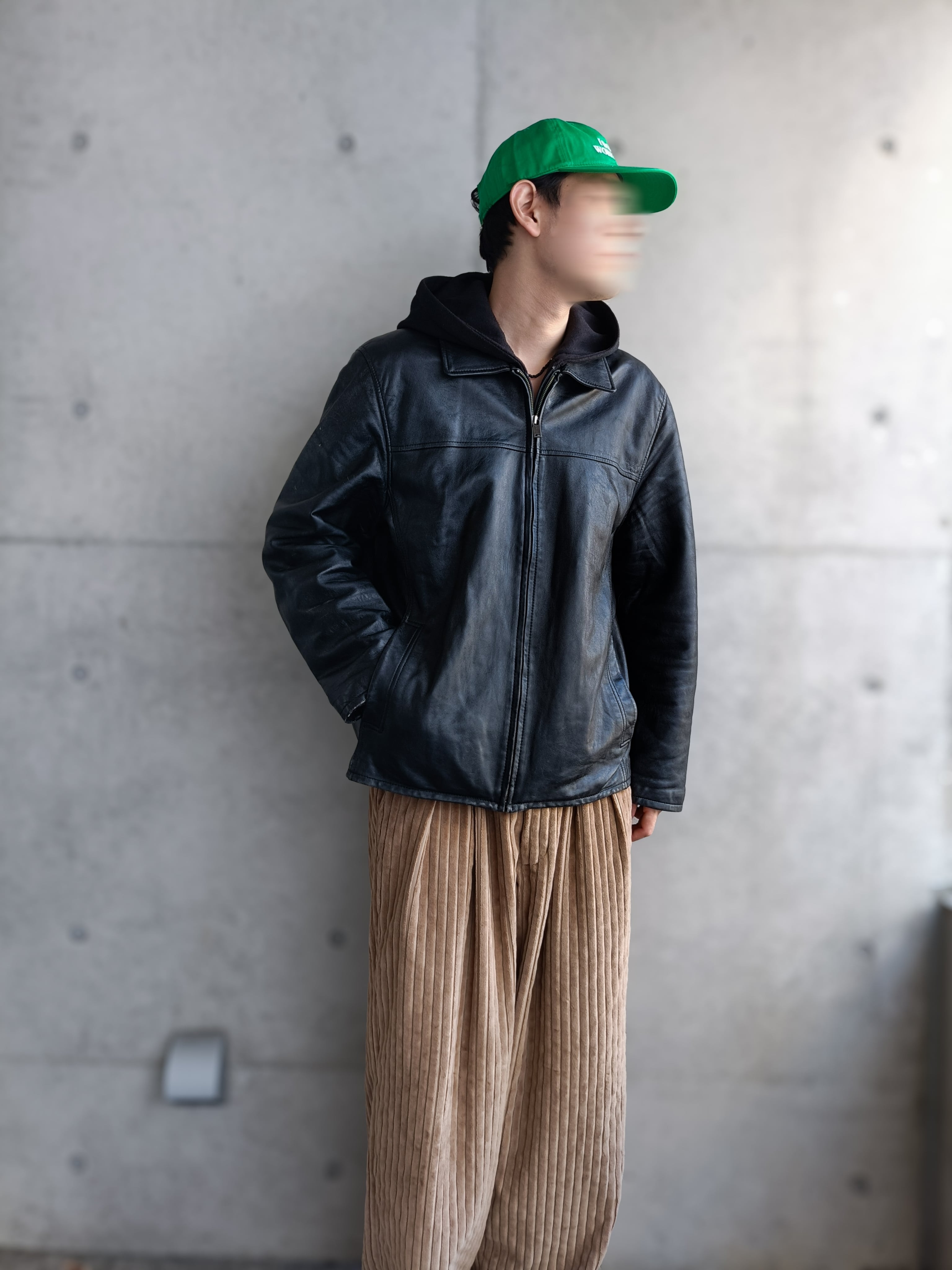スペシャル。GUESSのレザーブルゾン。取り外し可能なフーディー付き仕様。シンプルなドリズラー型のブルゾンとしても着用可能。着てみるとめちゃくちゃ綺麗なシルエットです。