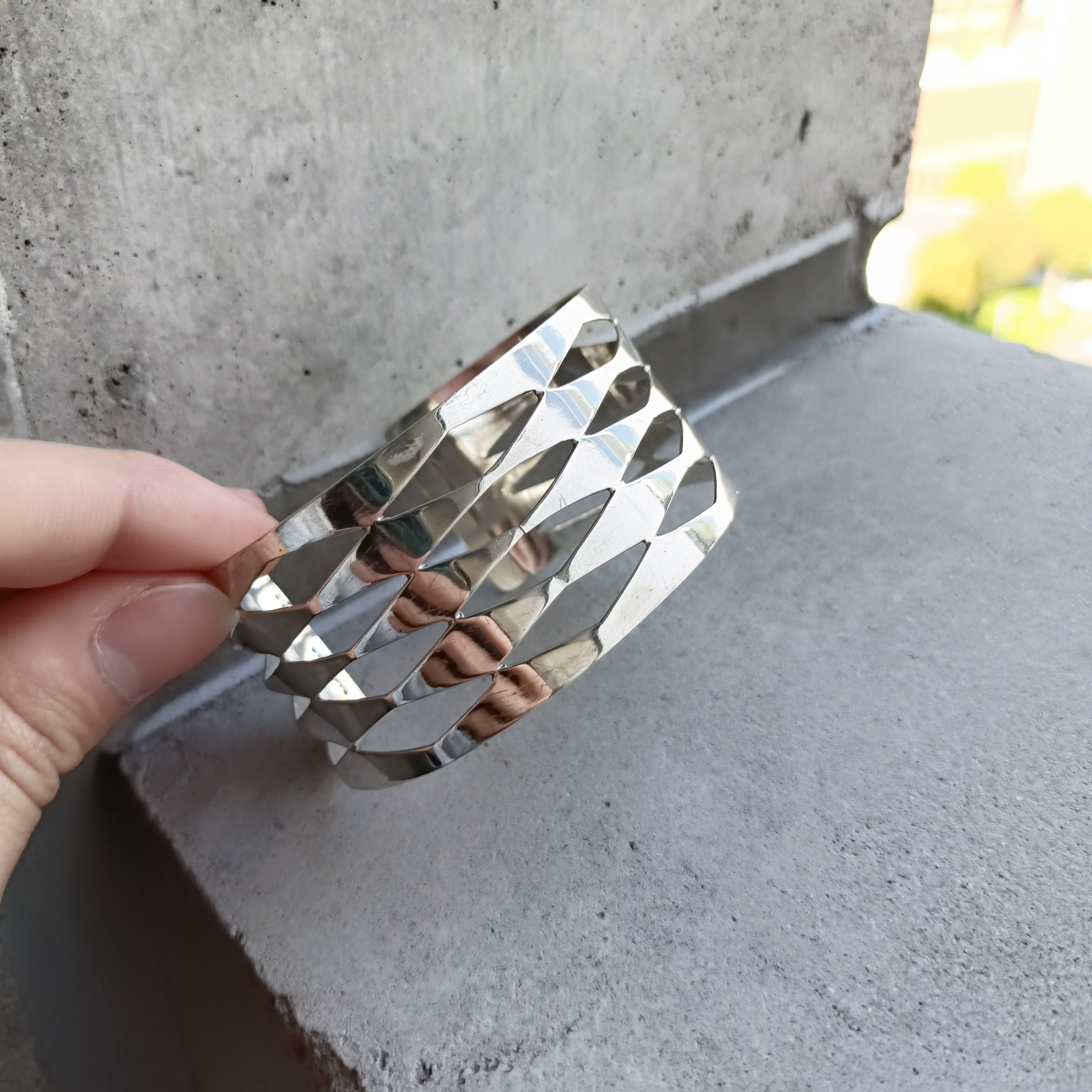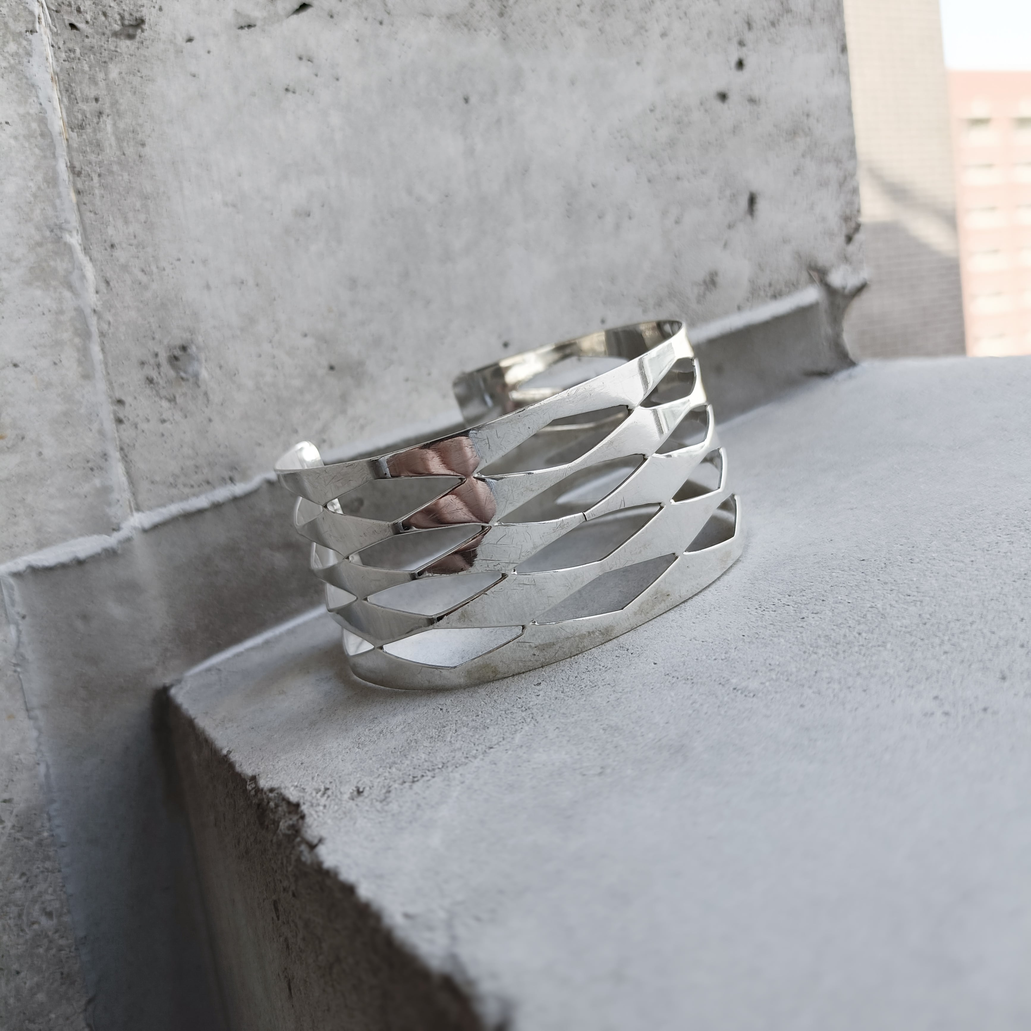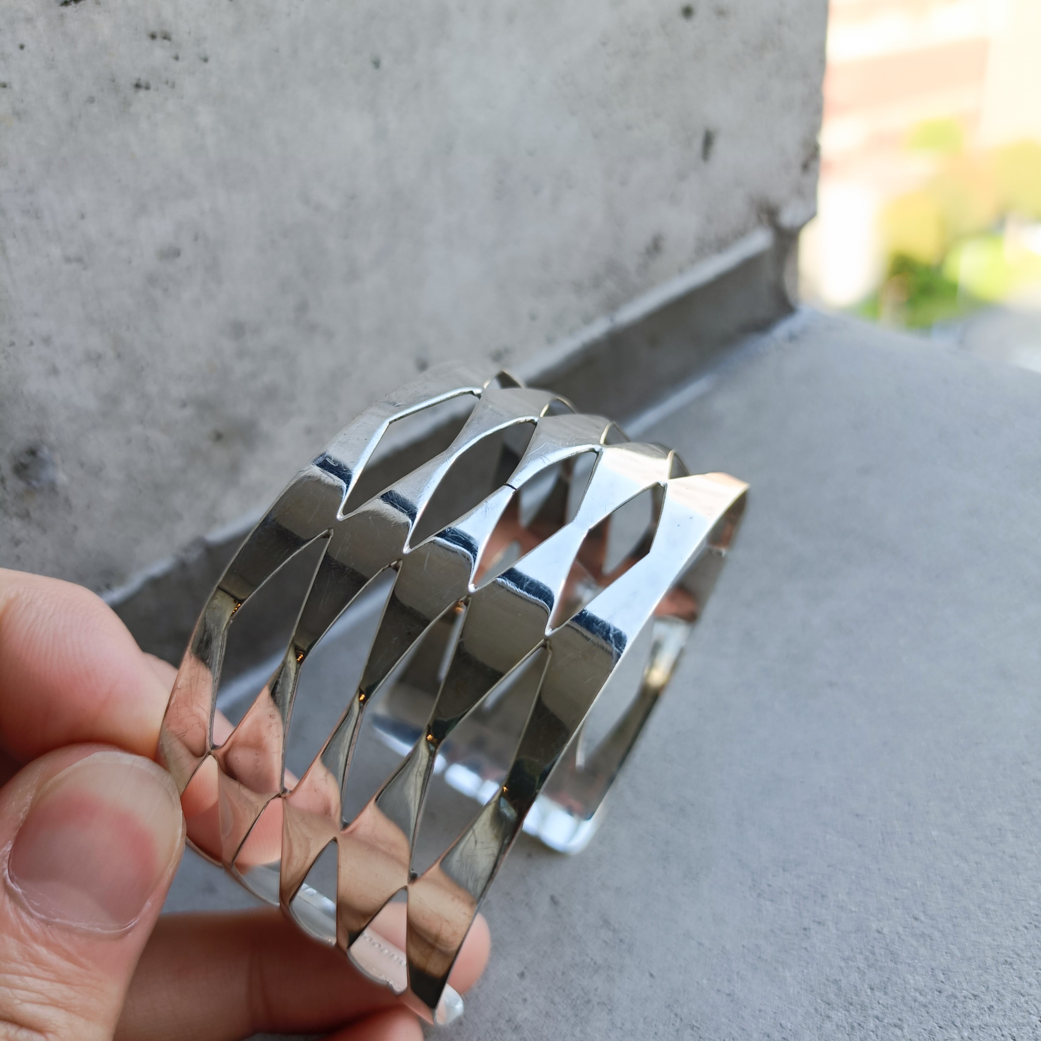 超スペシャル。フランスよりシルバー925のバングルの入荷。ダイヤパターンの幾何学模様が特徴的なデザイン。恐らくカンボジアで作られた物。丁度よいボリューム感で、手元に良いアクセントになってくれます。