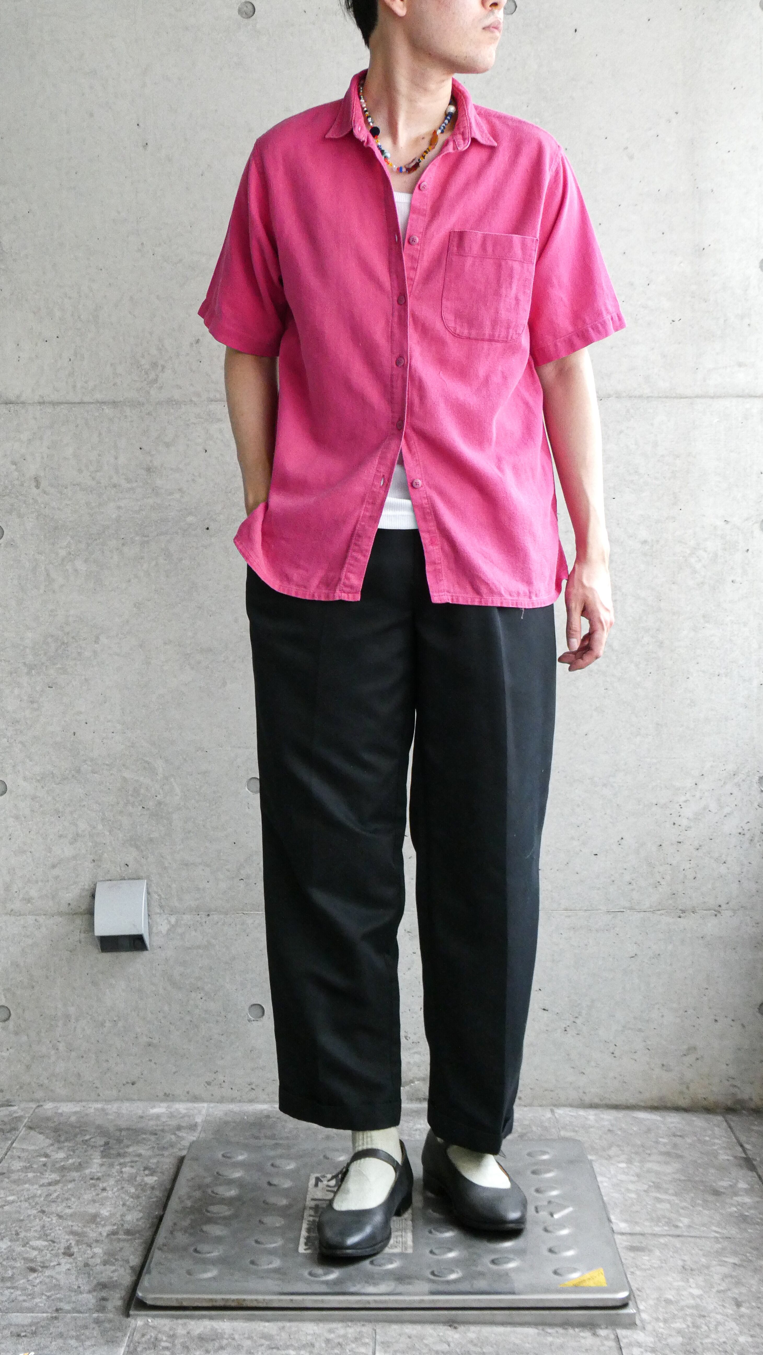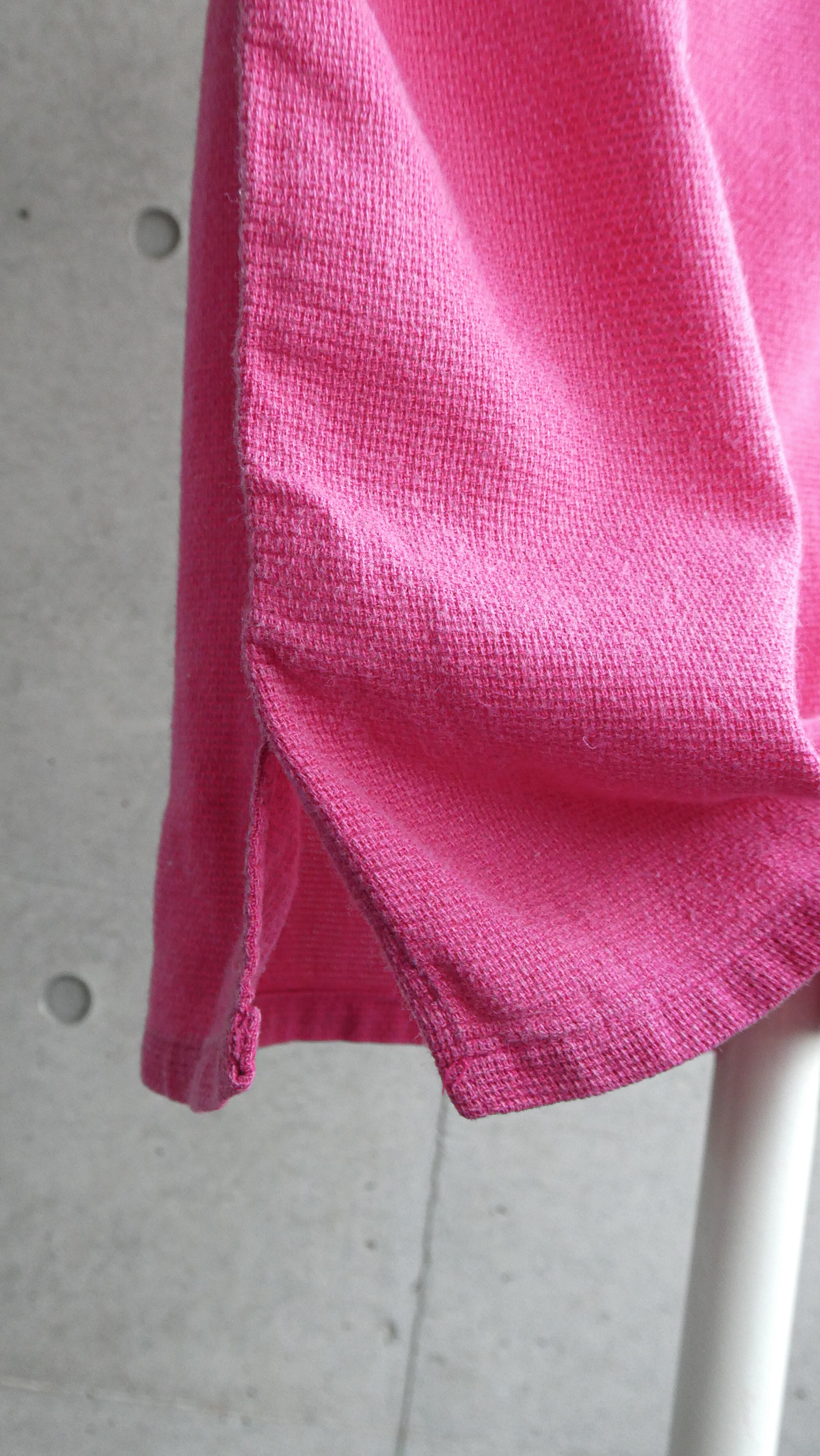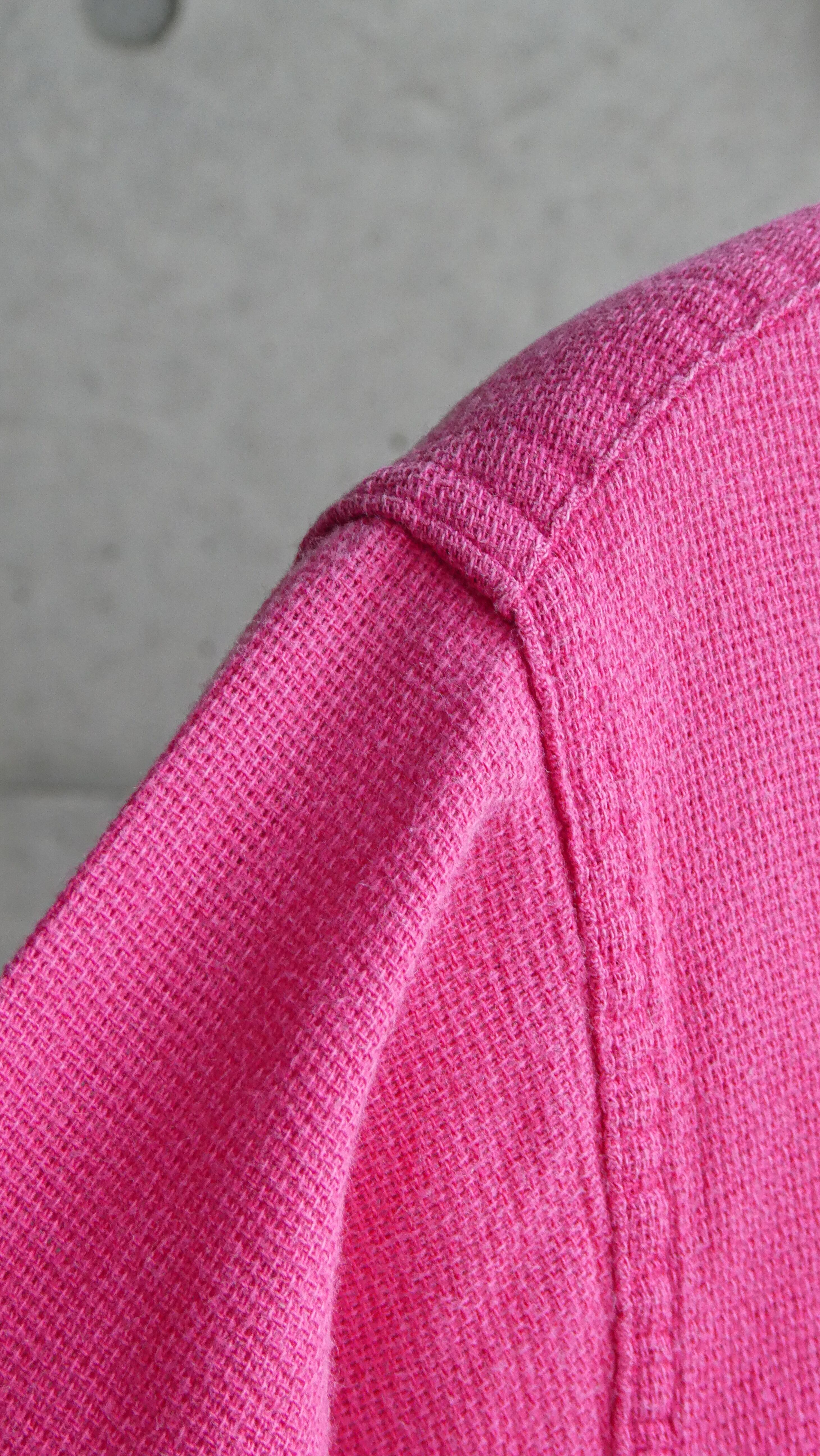 ガーゼのようなメッシュ生地。ピンクなのに案外すんなり着れるのはこの生地のおかげです。襟元、裾から白をチラ見せするのもオススメな着方です。