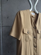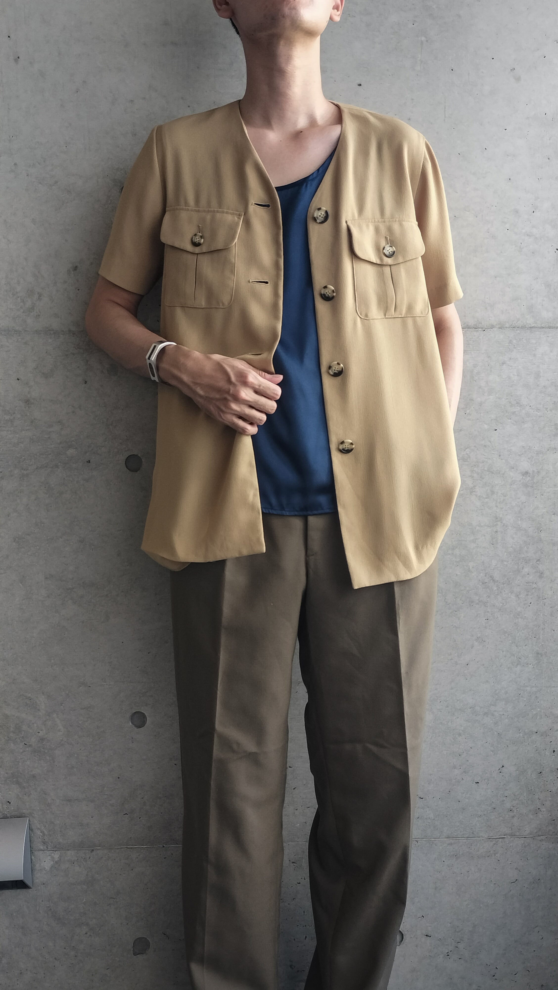 ダークマスタードカラーのシャツ。ノーカラーっていうのも洒落てます。フラップポケット。サイドに大きなスリット入り。一癖、二癖ある良質古着です。