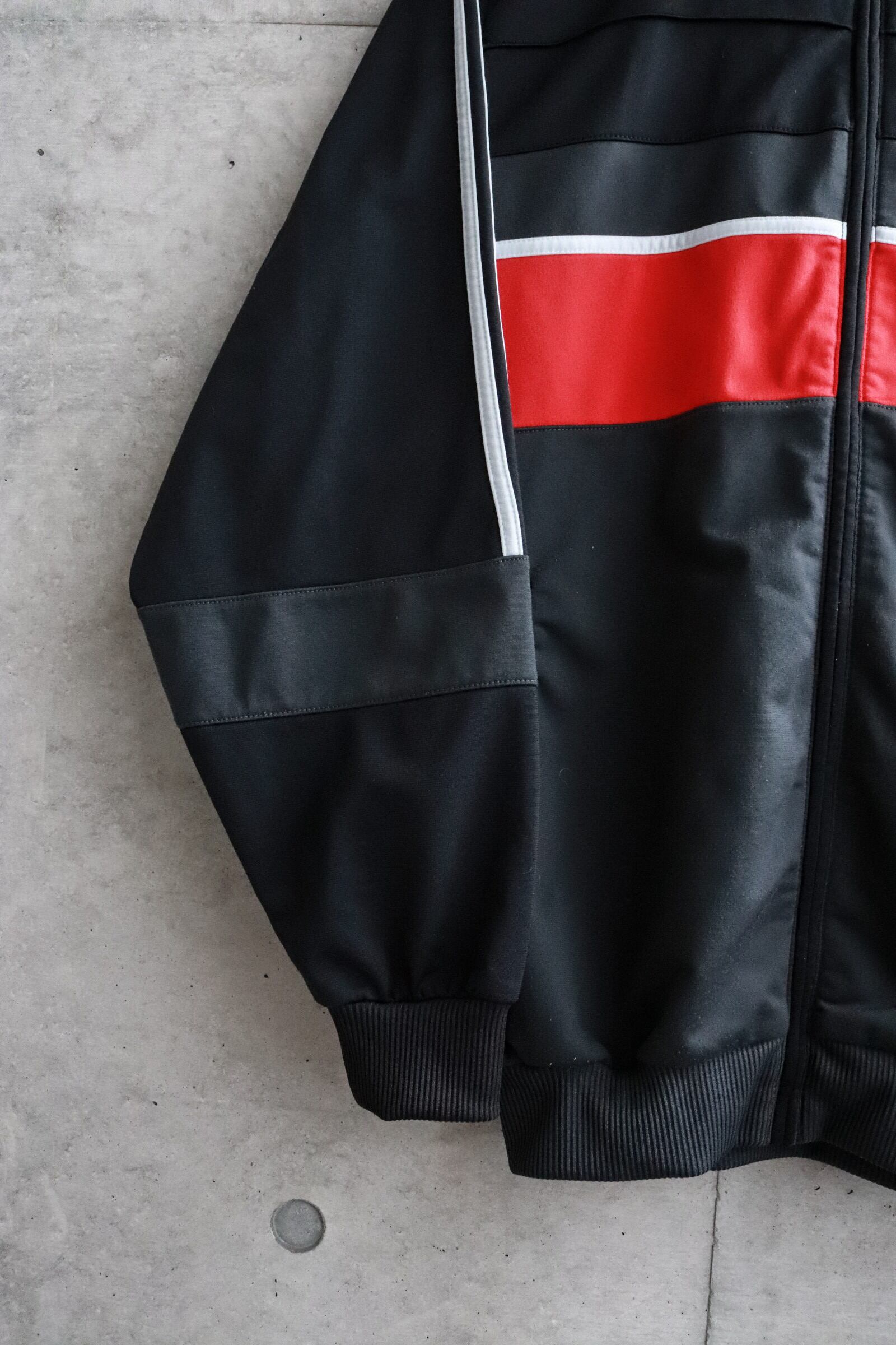 adidasのトラックジャージ。ブラック、グレー、レッドの配色。袖の溜まりが出来るいいシルエット。袖には3本ライン。アームの細かい切替が個人的にポイント高いです。やはりハイネックで着れるのは着回し抜群です。