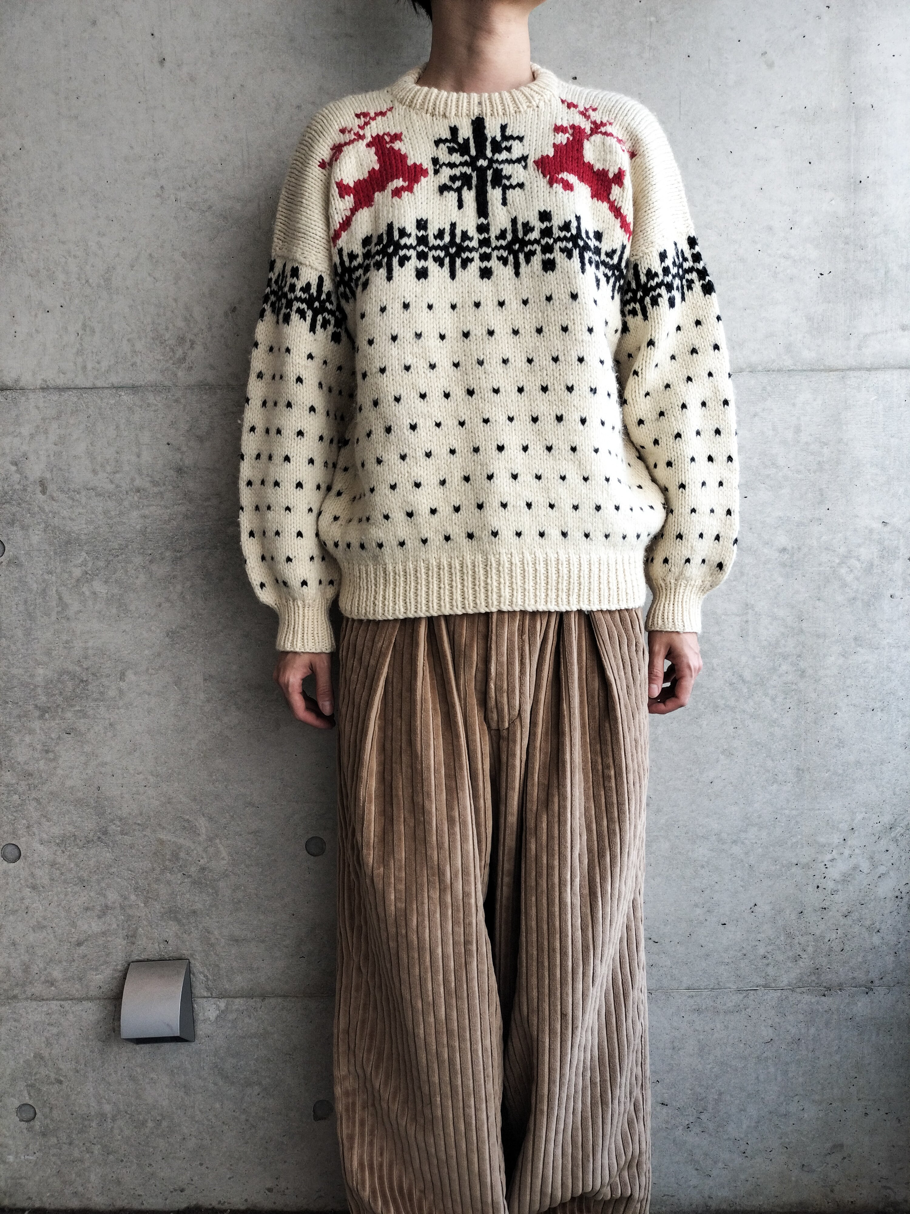 スコットランド製ニット。ノルディックパターンのハンドニット。鹿柄、バーズアイ。アームは極太。身頃と袖のバーズアイの上下の向きが違うのがポイントです。