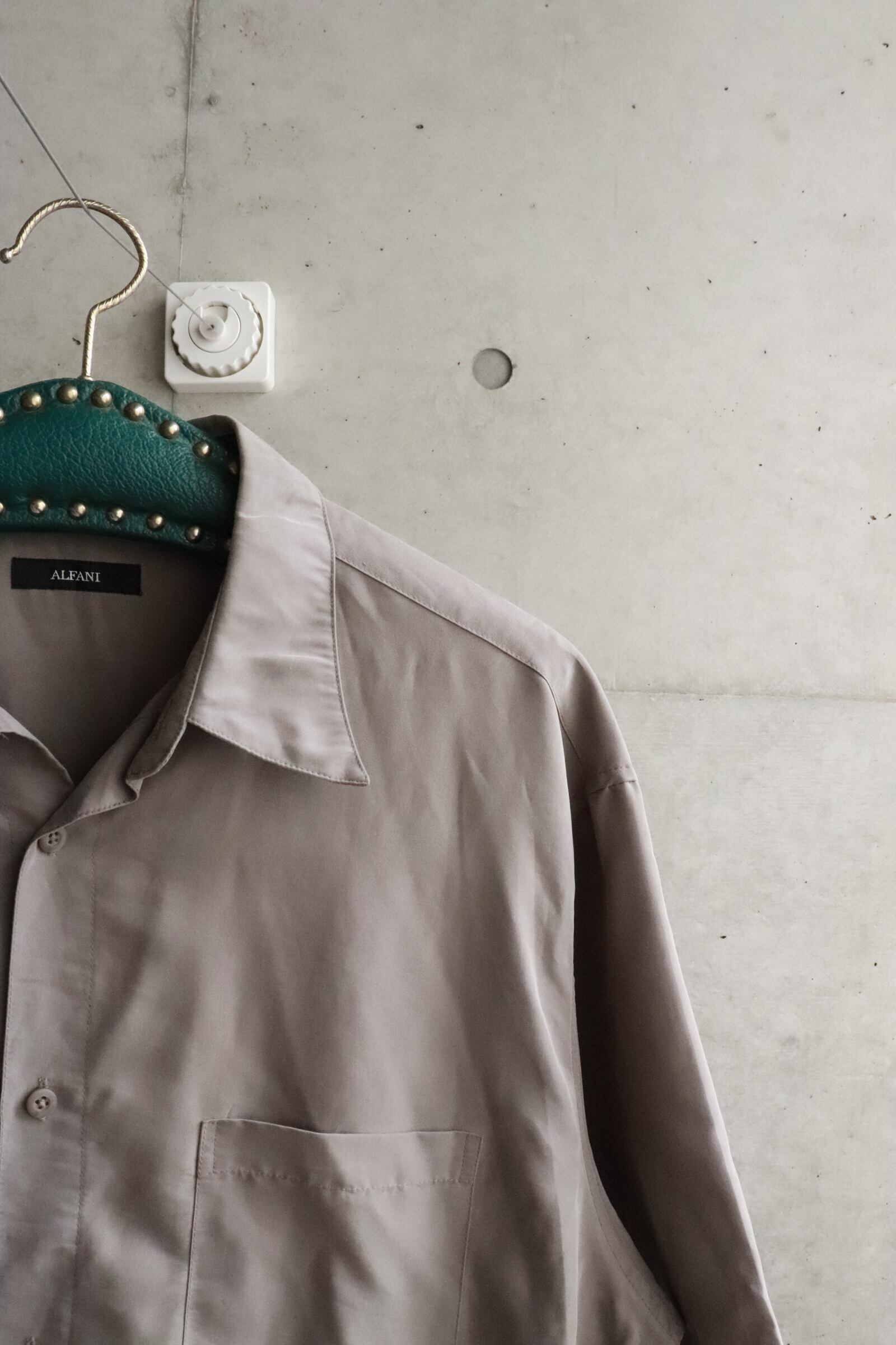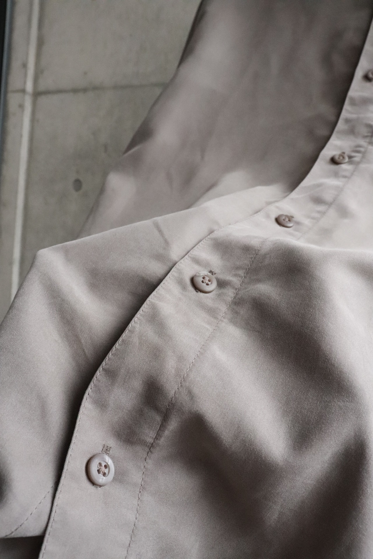 コンクリートグレーのピーチスキンシャツ。半袖であまり見ない生地です。少し緩めに着れるサイズ感です。嬉しいサイドスリット入りです。