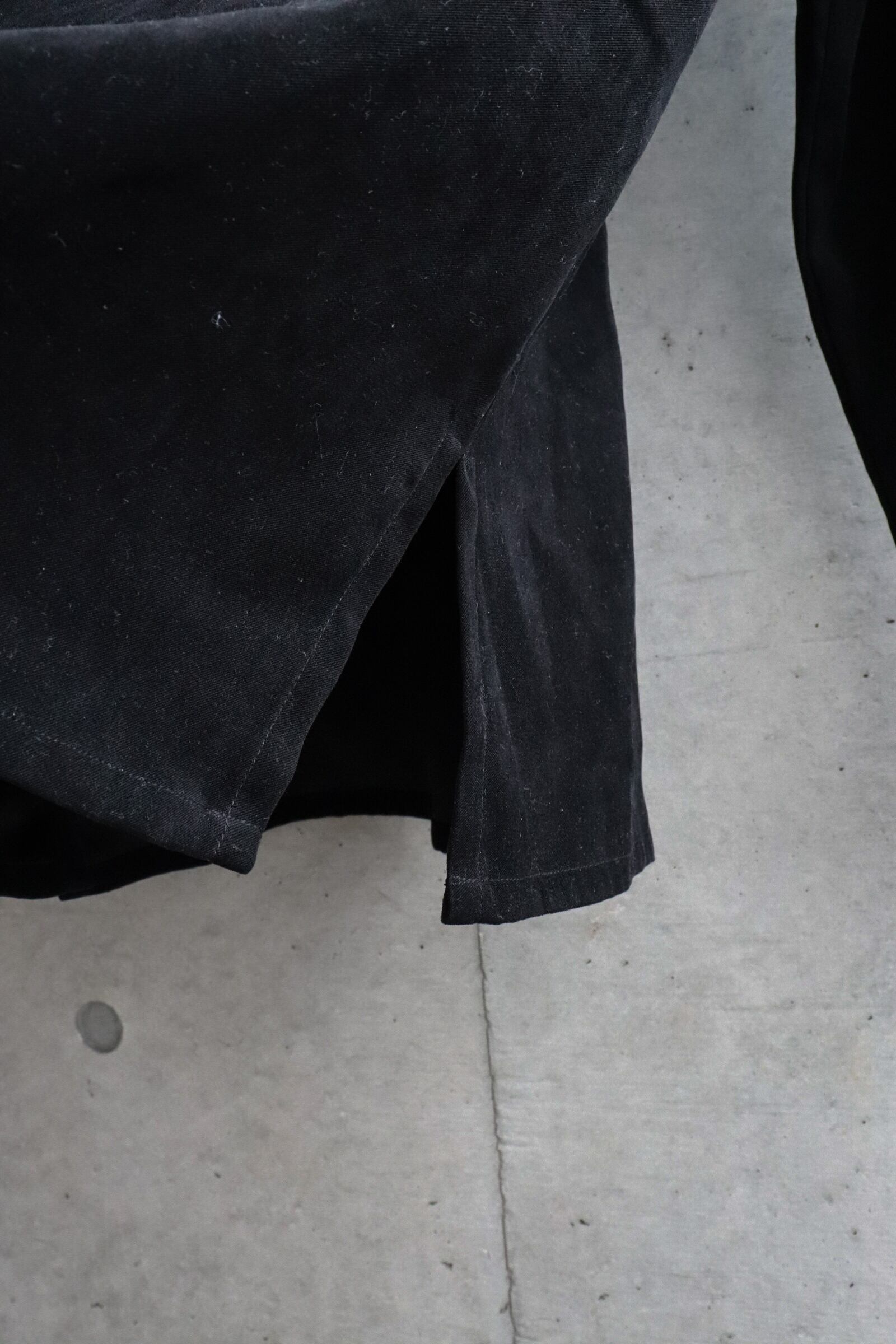 ブラックのベルベット調シャツ。ベロアより数がグンッと少ないベルベットシャツ。非常に高級感ある雰囲気と光沢感です。サイドに深めのスリット入りなのもいいです。